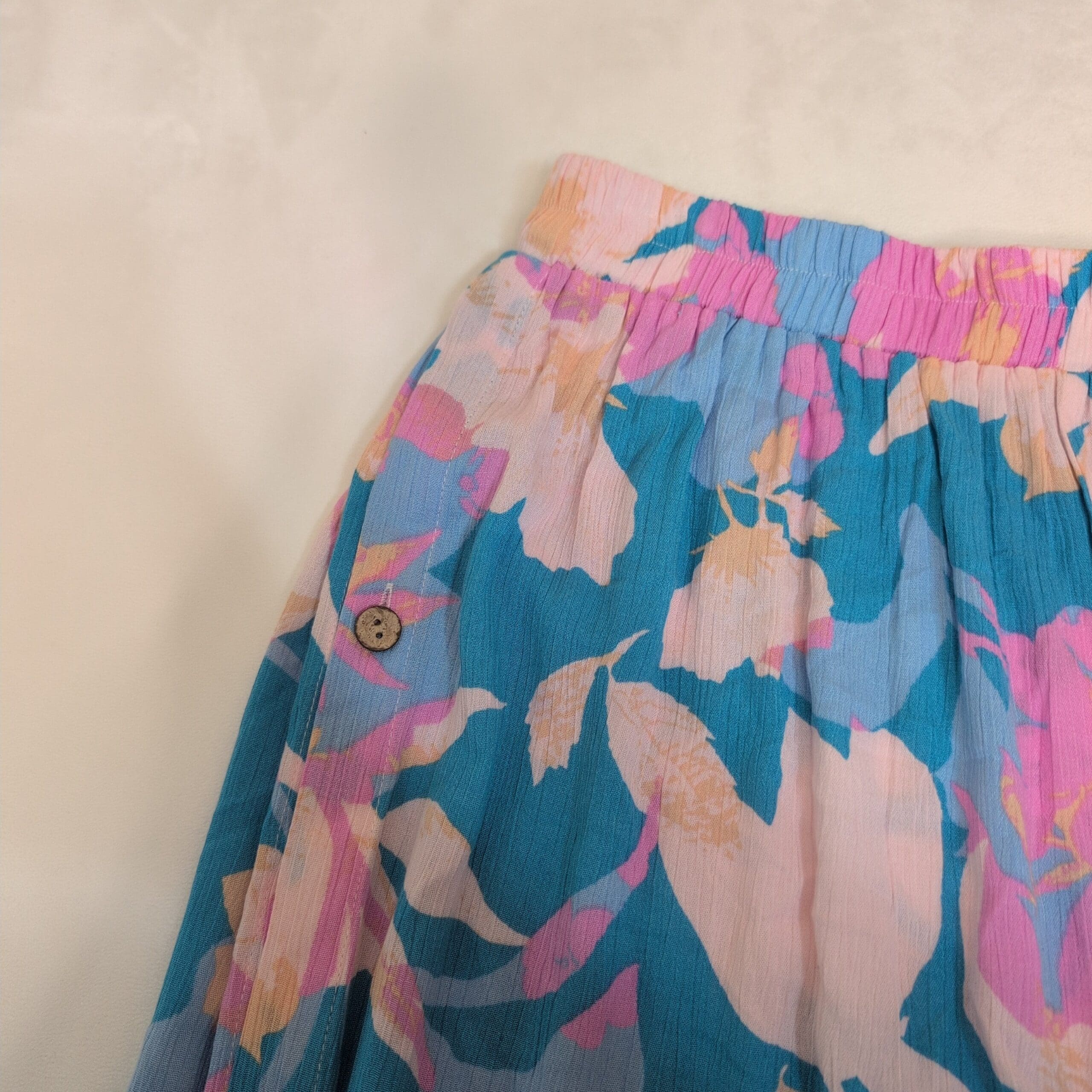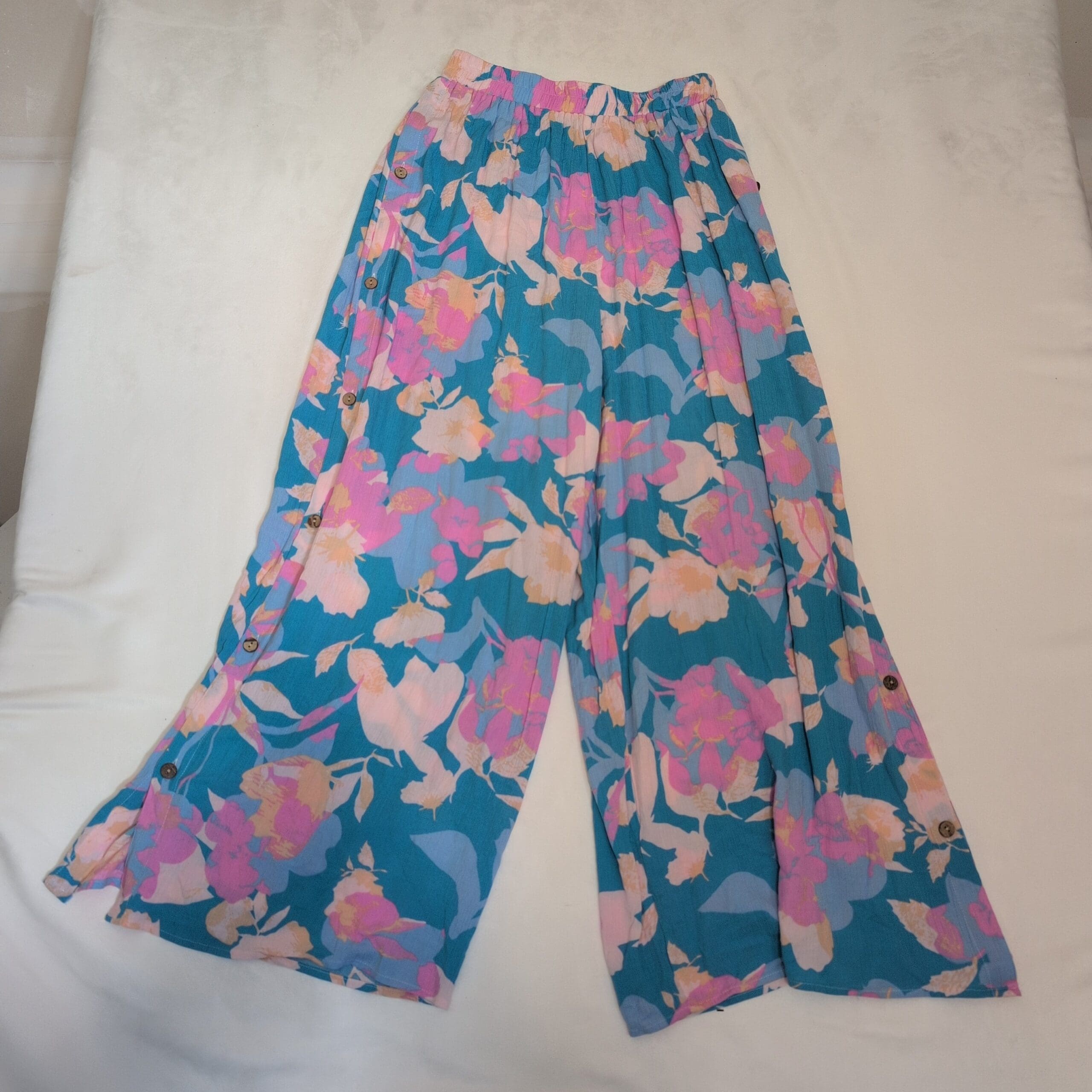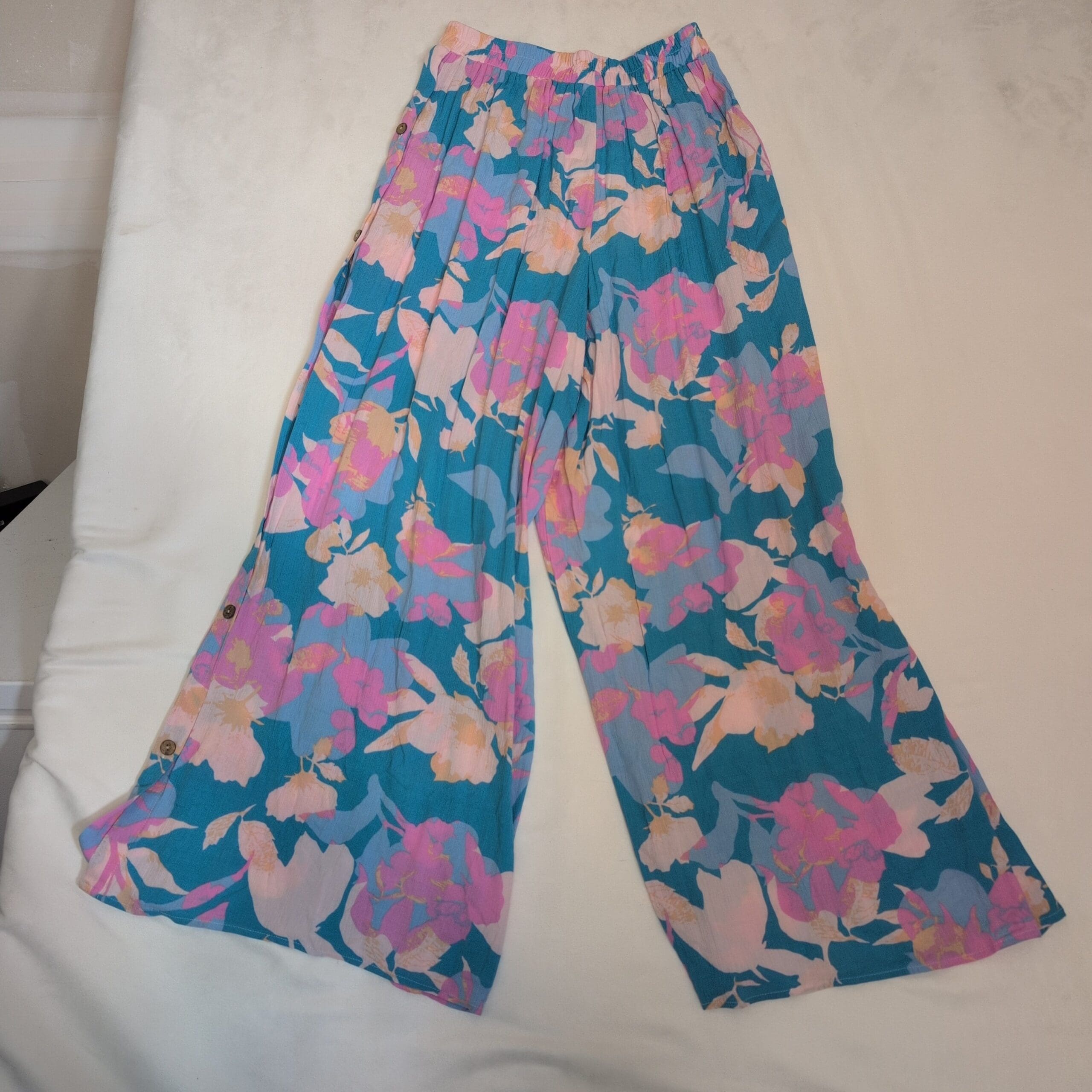 Features: Elastic waistband for comfortable fit, full wide-leg silhouette, decorative side button details as shown in photos. Lightweight, flowy drape great for spring and summer. Matching kimono available at time of listing.