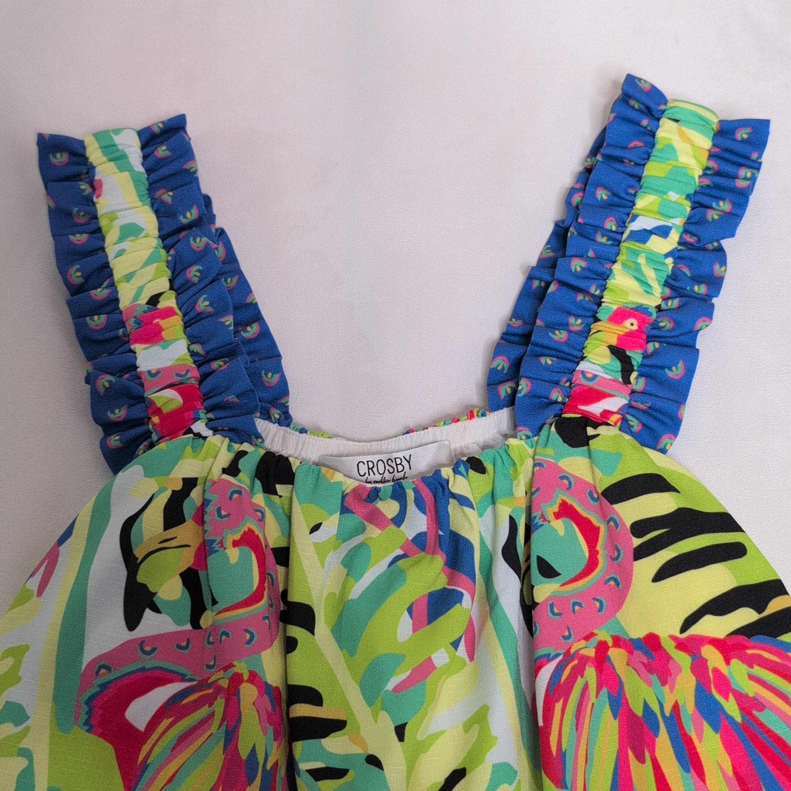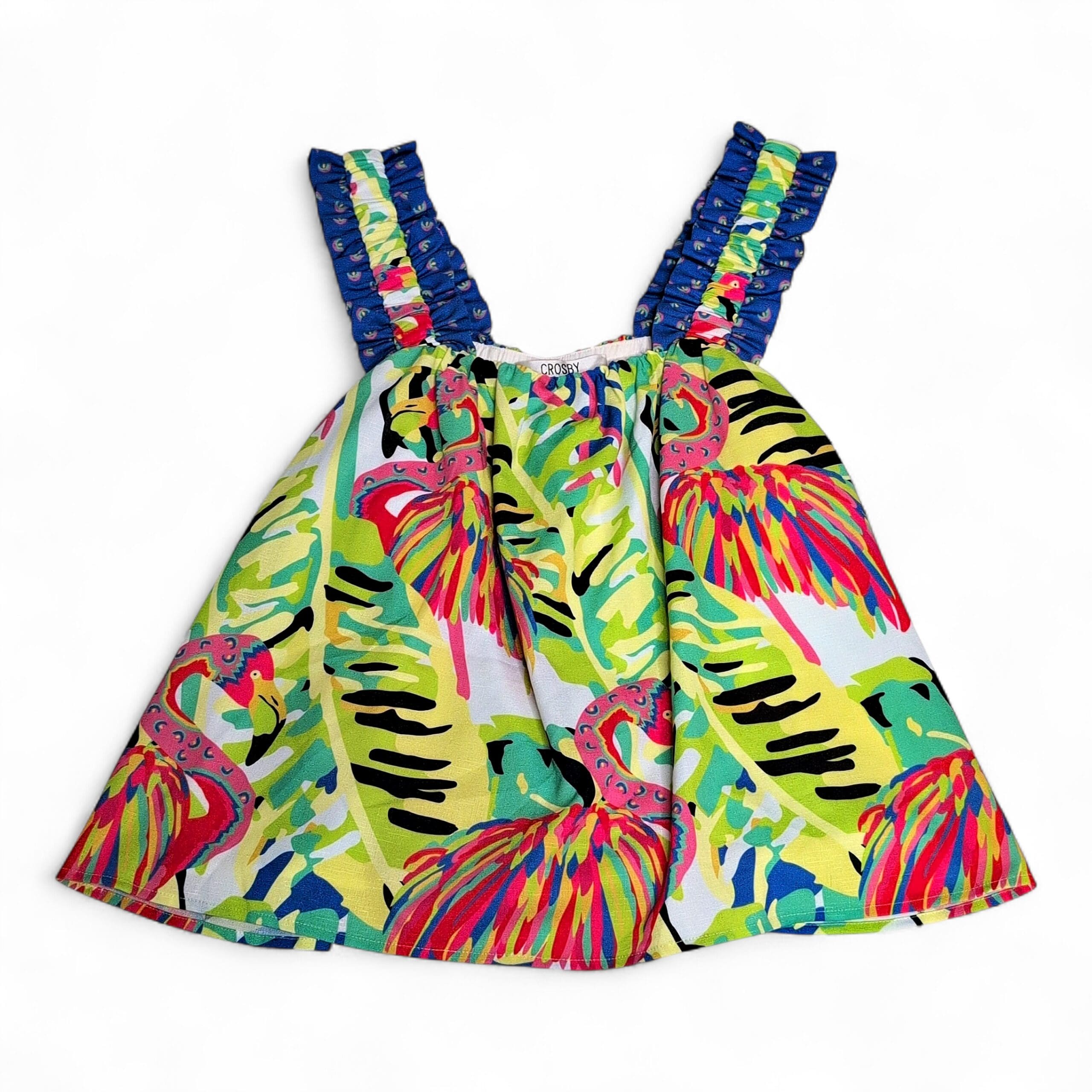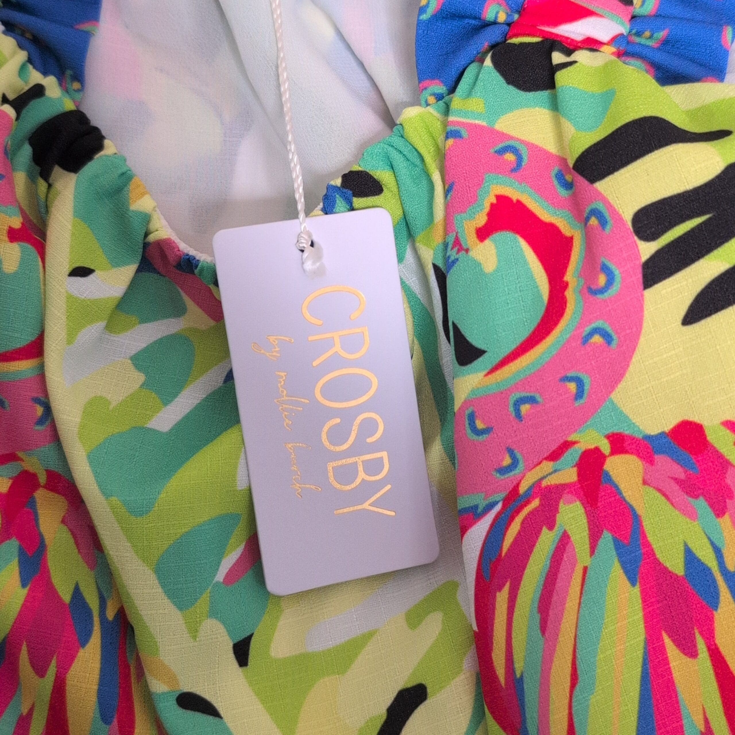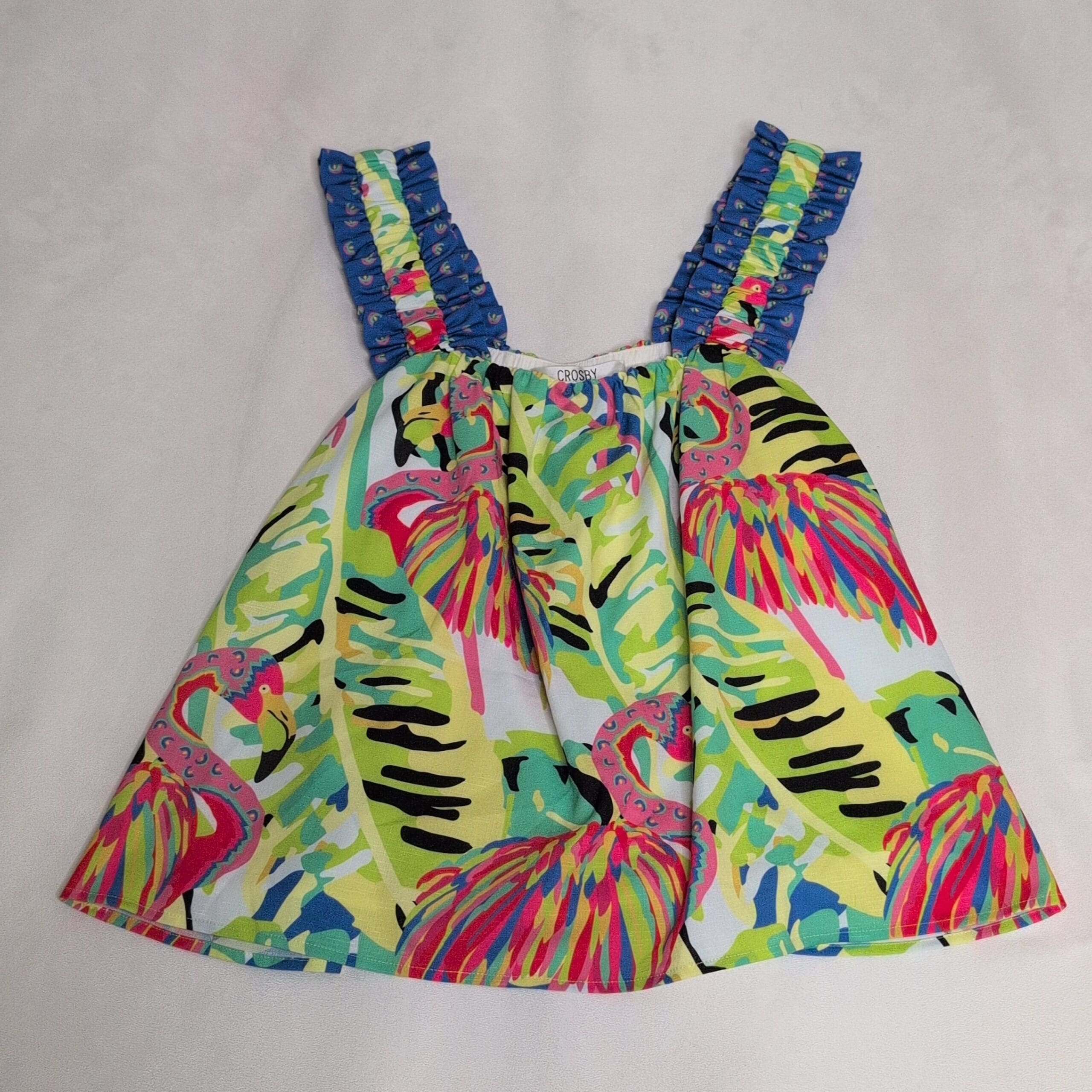 New with tags Crosby women’s blouse in size L. Vibrant purple-based tropical flamingo print with multicolor accents. Features ruffled elastic straps, an elasticized neckline, and a breezy A-line silhouette—perfect for summer, resort, or vacation styling. NWT (new with tags); original MSRP $152.