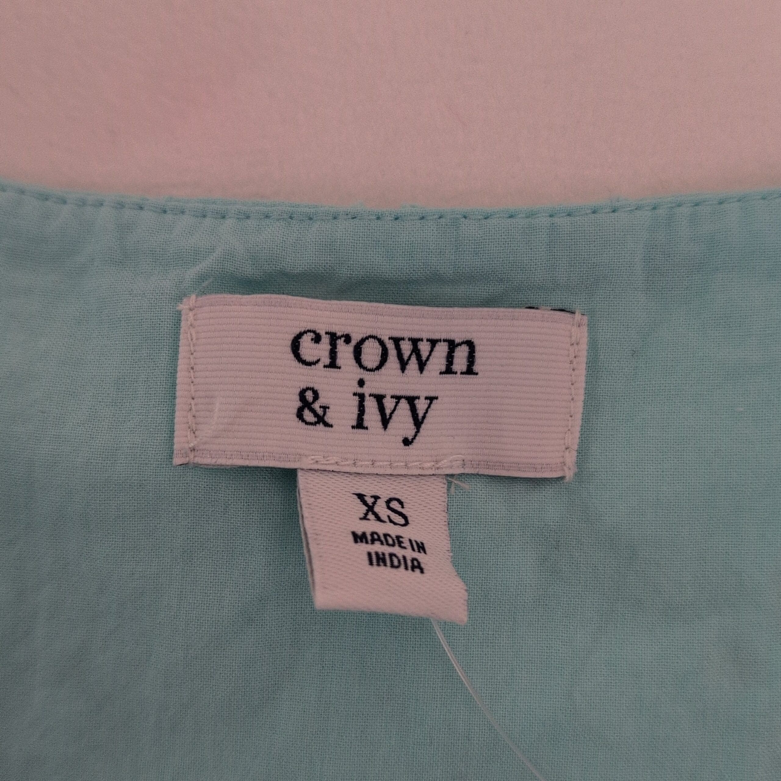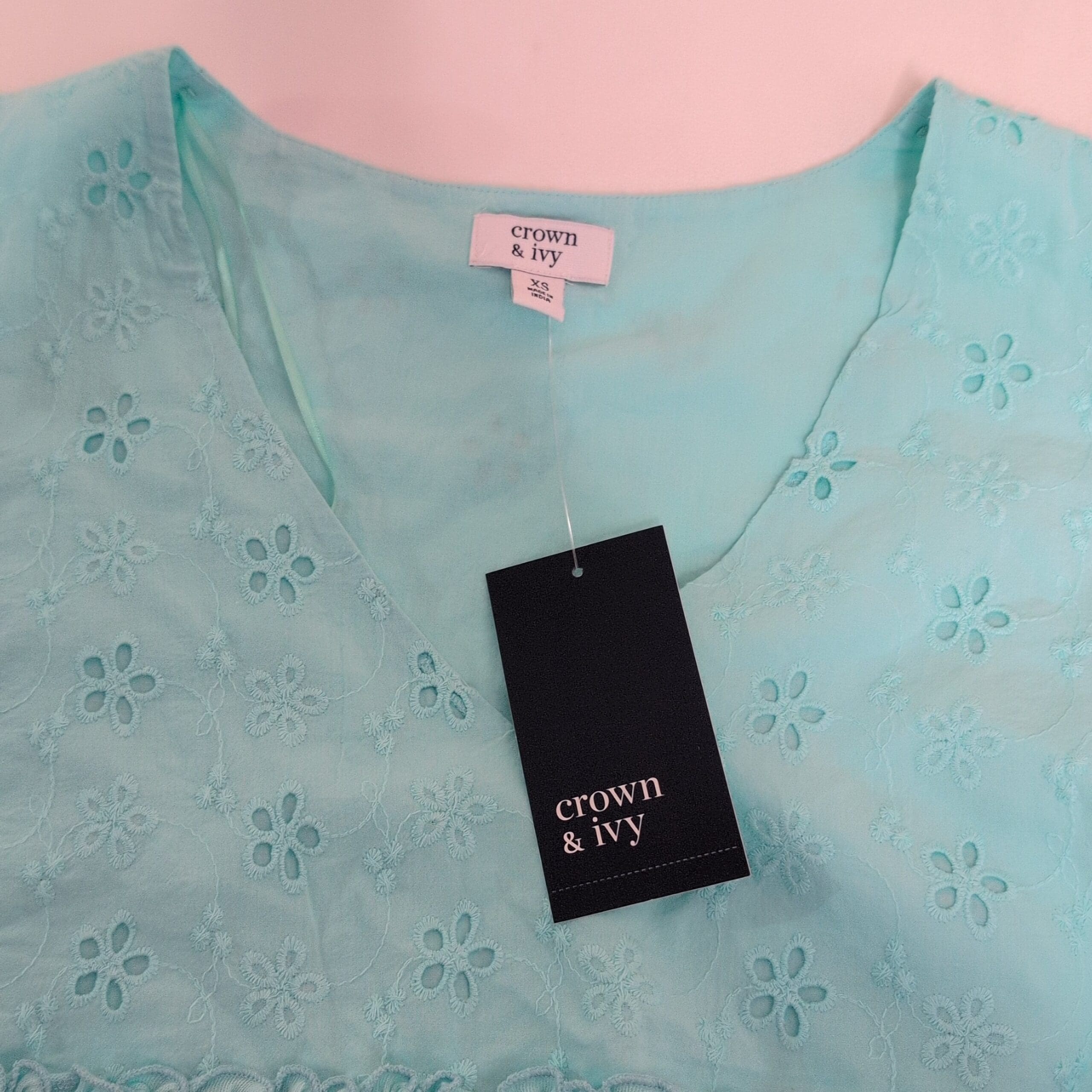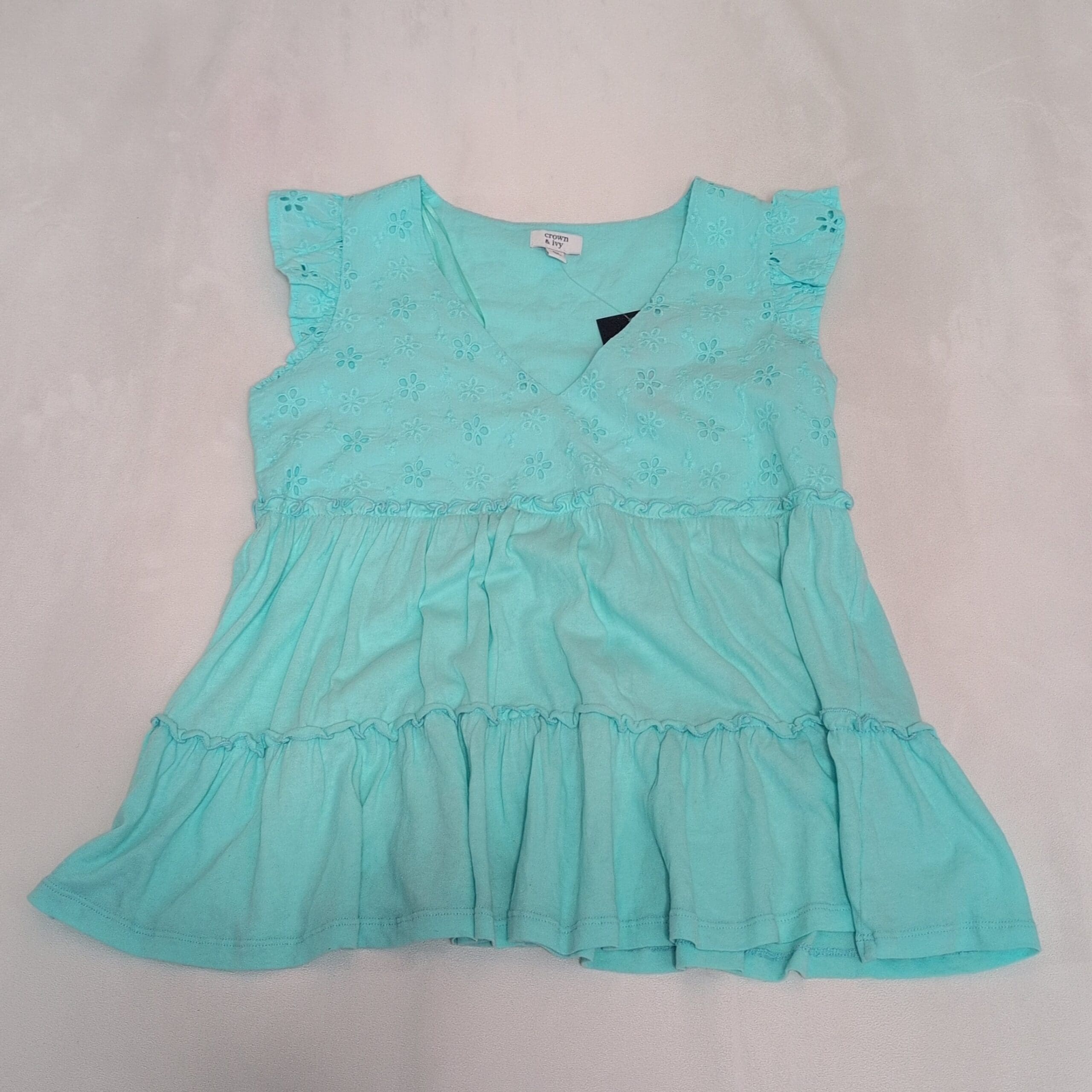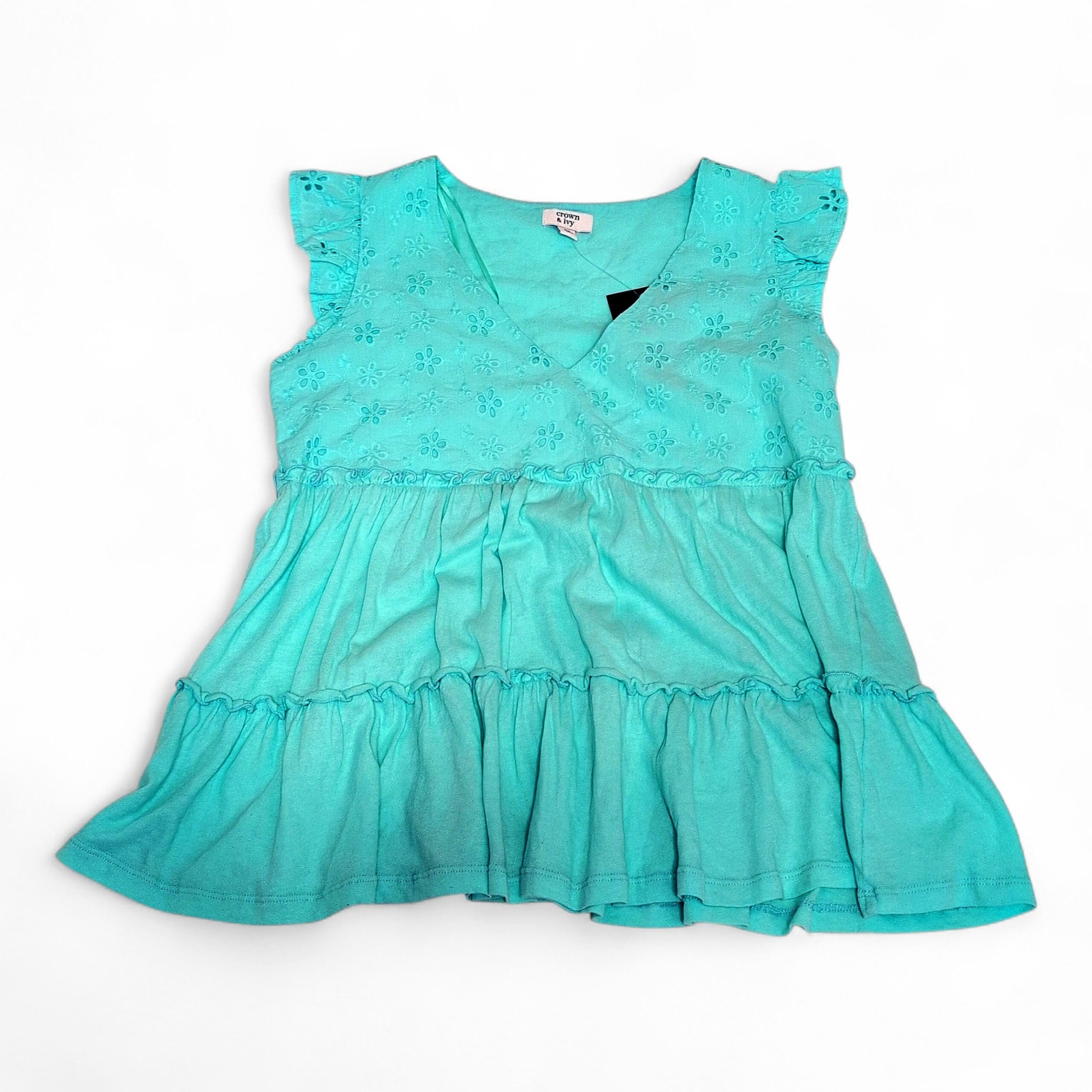 Light aqua Crown & Ivy women’s blouse in size XS. Features delicate eyelet floral embroidery on the bodice, V-neck wrap-style front, flutter cap sleeves, and a tiered ruffle hem for a feminine, breezy silhouette. Soft, lightweight feel ideal for spring and summer casual looks.