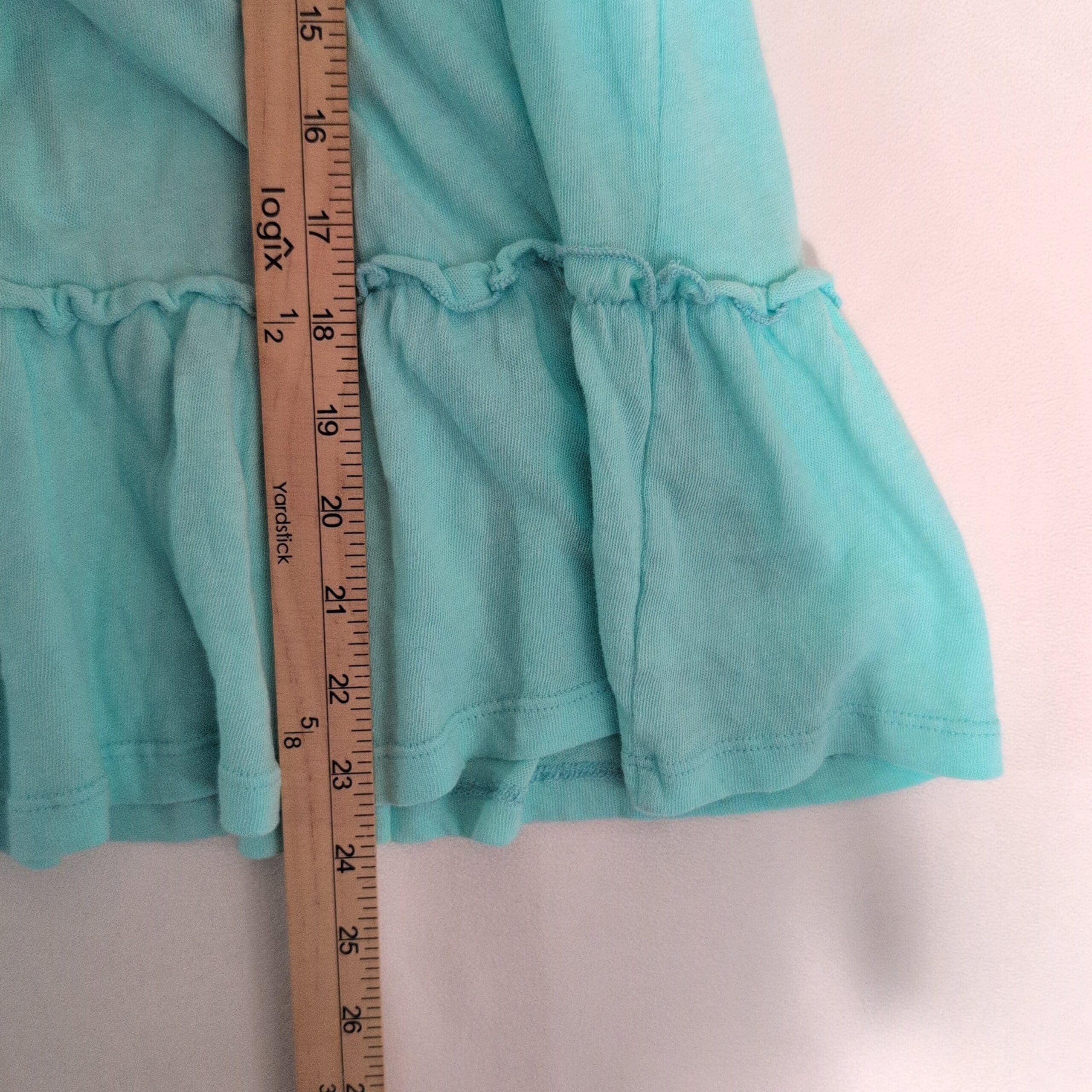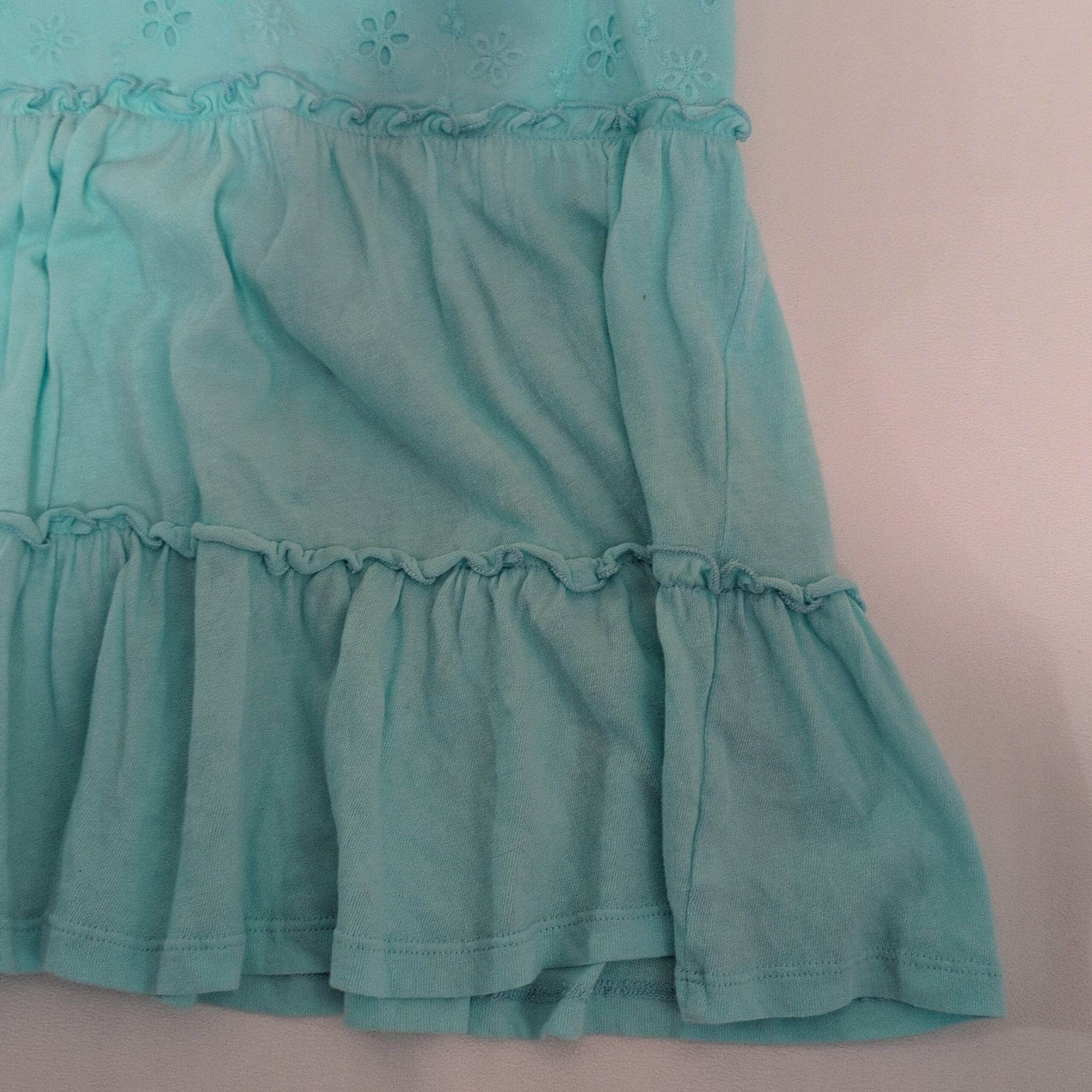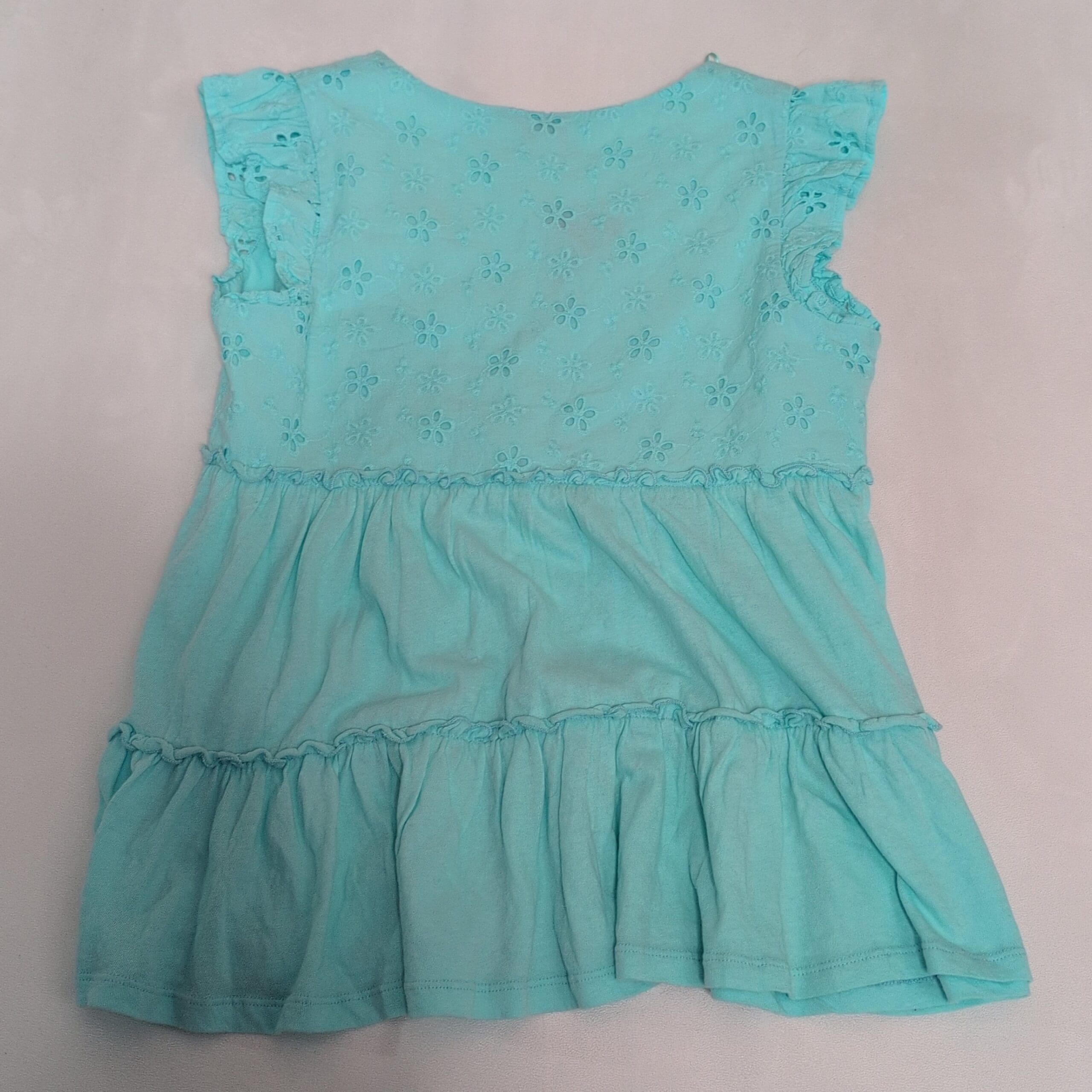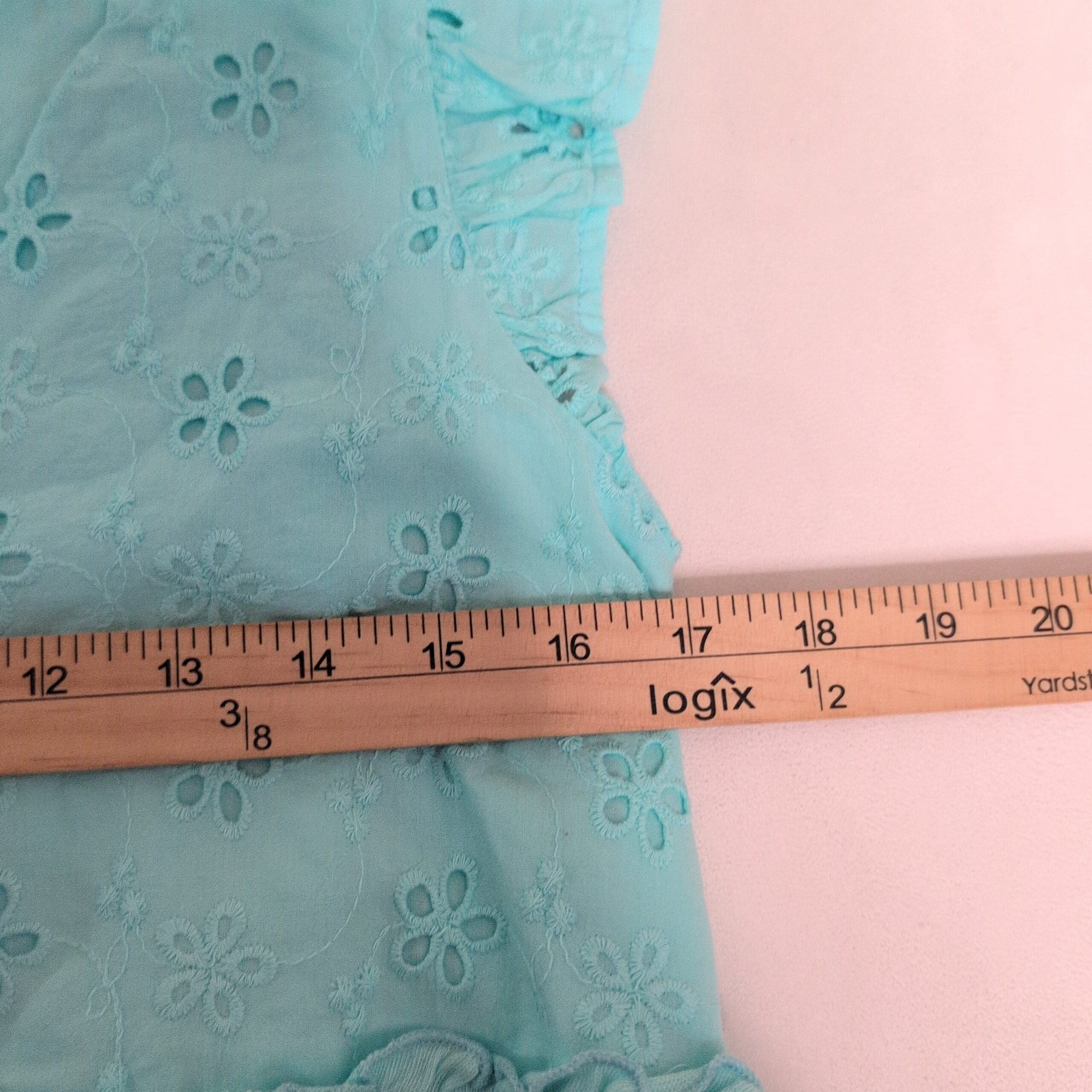 Light aqua Crown & Ivy women’s blouse in size XS. Features delicate eyelet floral embroidery on the bodice, V-neck wrap-style front, flutter cap sleeves, and a tiered ruffle hem for a feminine, breezy silhouette. Soft, lightweight feel ideal for spring and summer casual looks.