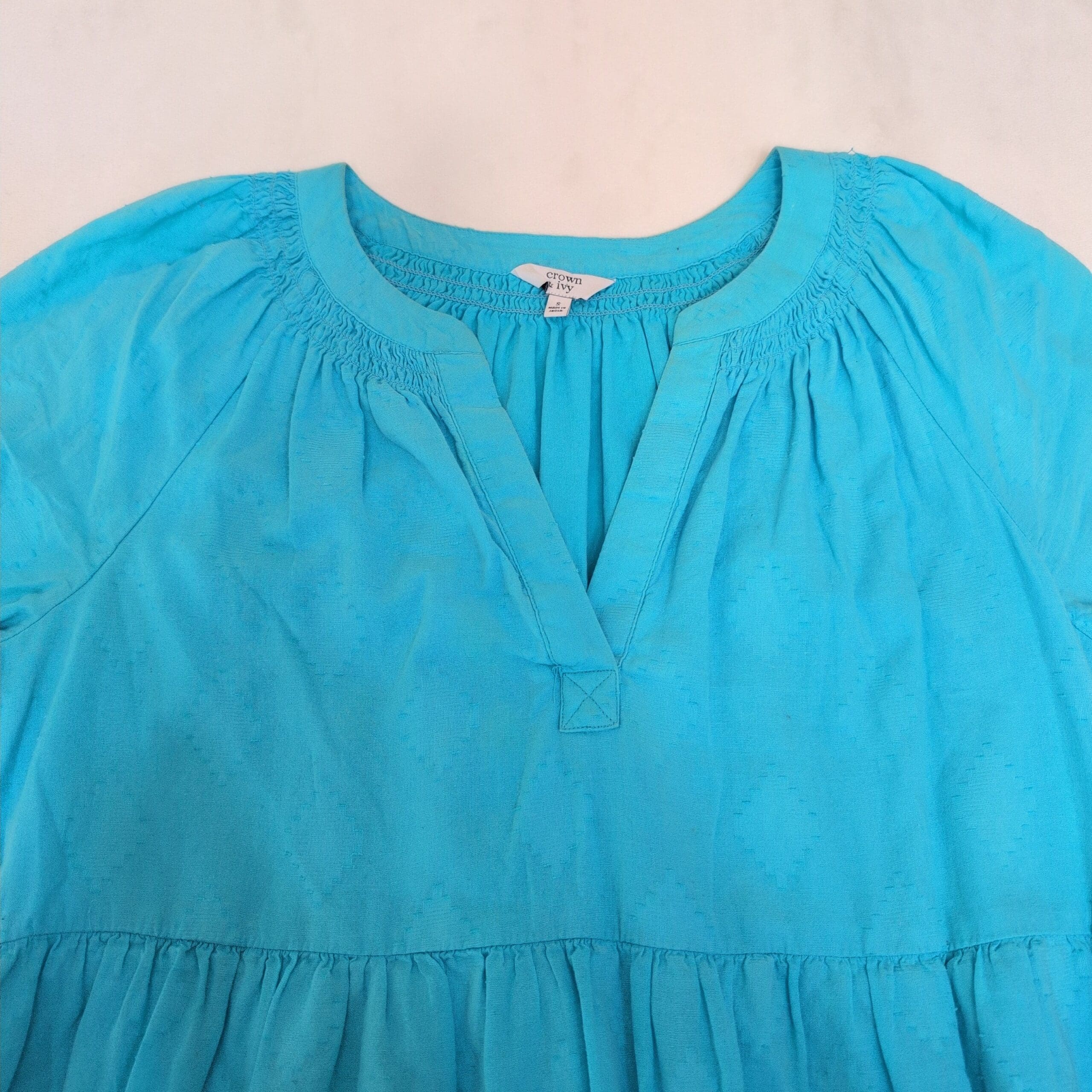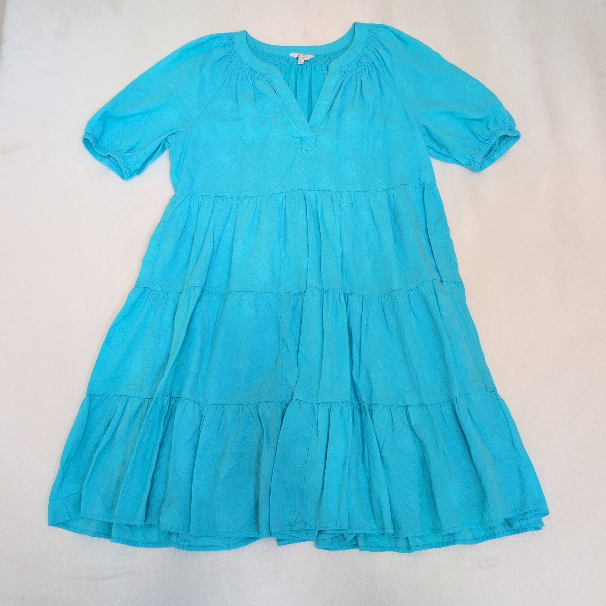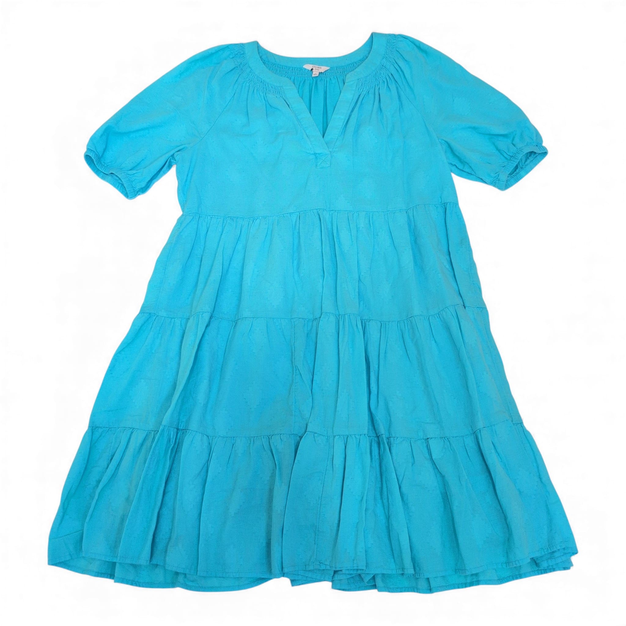 Crown & Ivy women’s tiered babydoll dress in a bright blue. Size S (standard). Features a smocked neckline with a subtle V-notch, short puff sleeves with elastic cuffs, and a flowy three-tier skirt for an easy, feminine silhouette—perfect for casual days, vacations, or weekend outings. Lightweight, relaxed fit that layers beautifully.