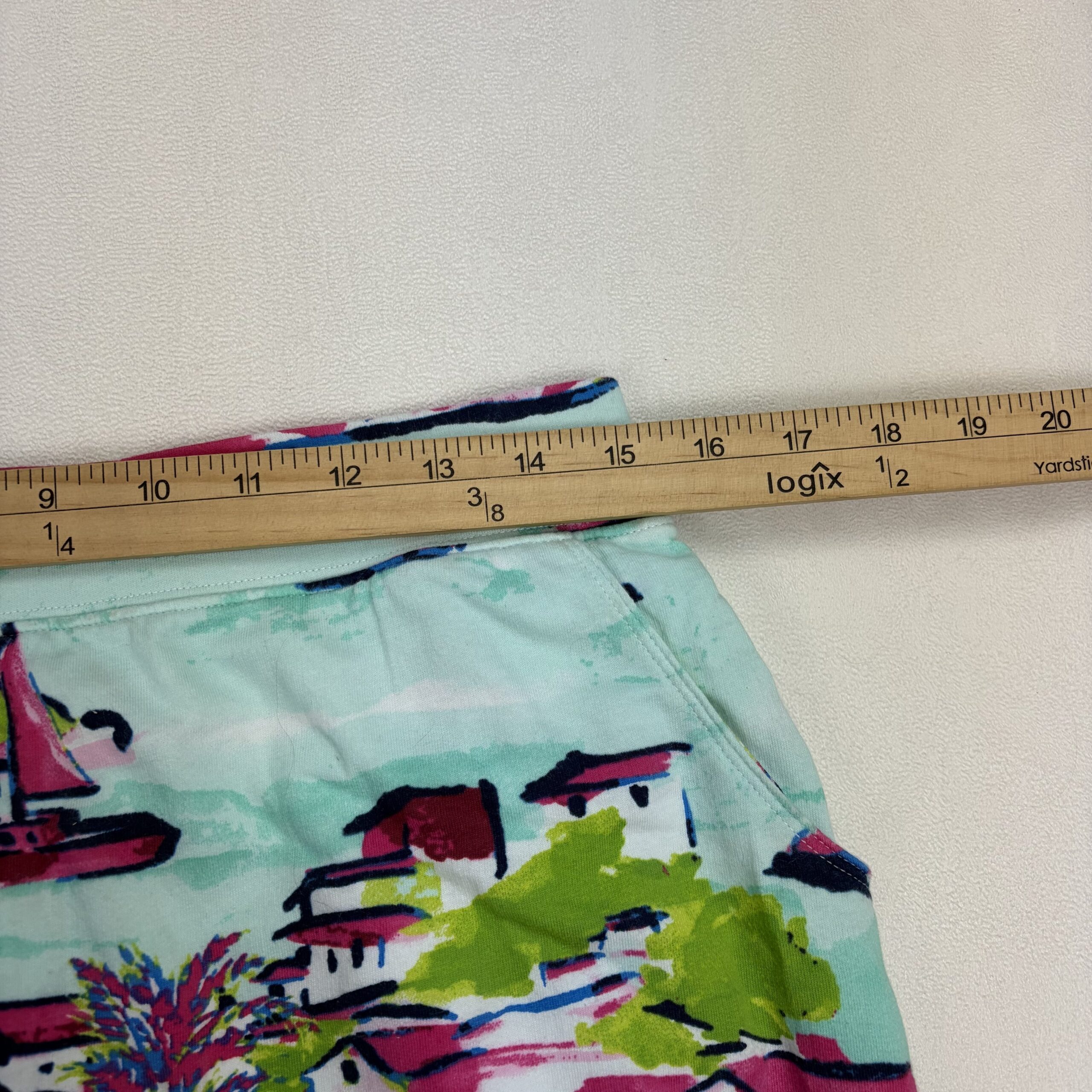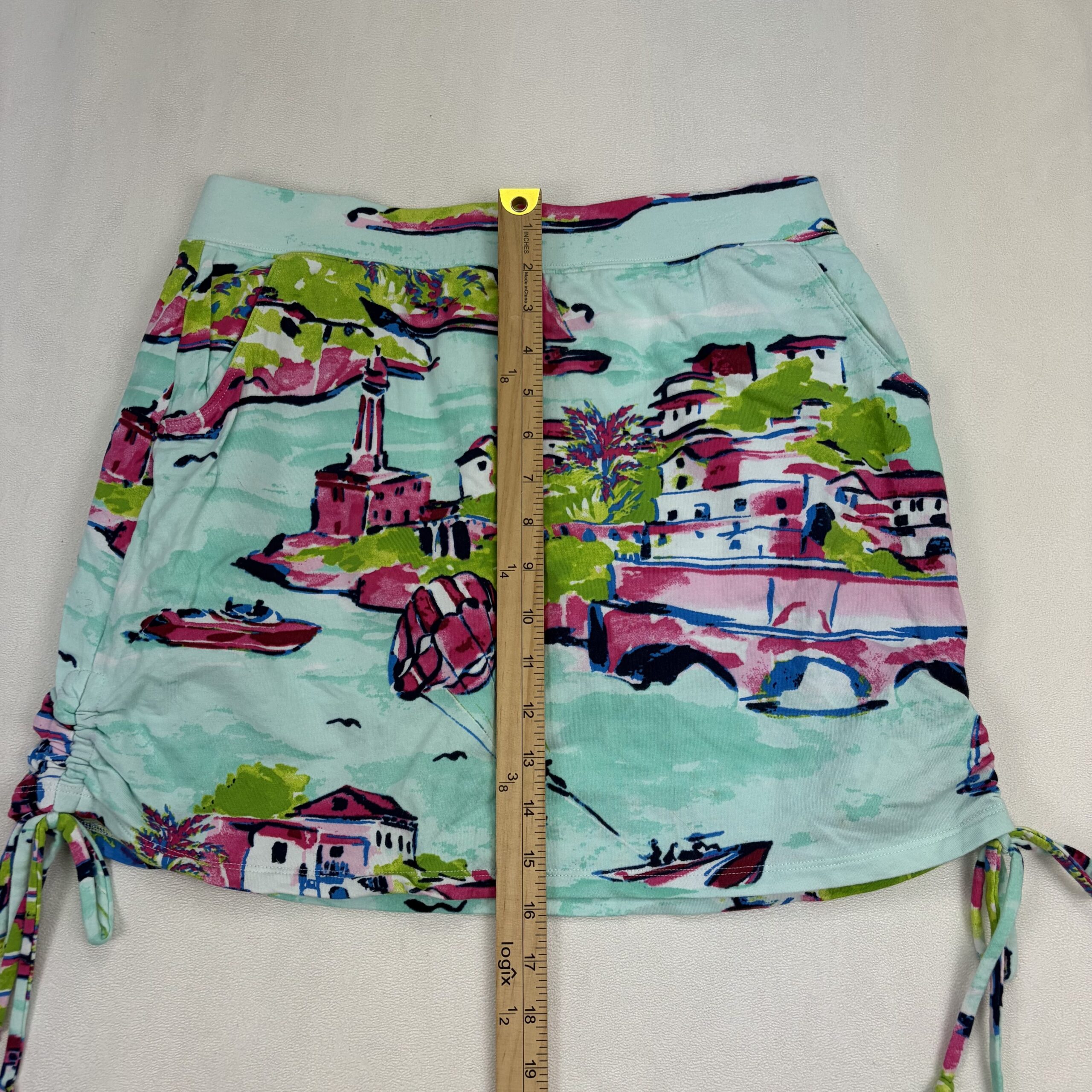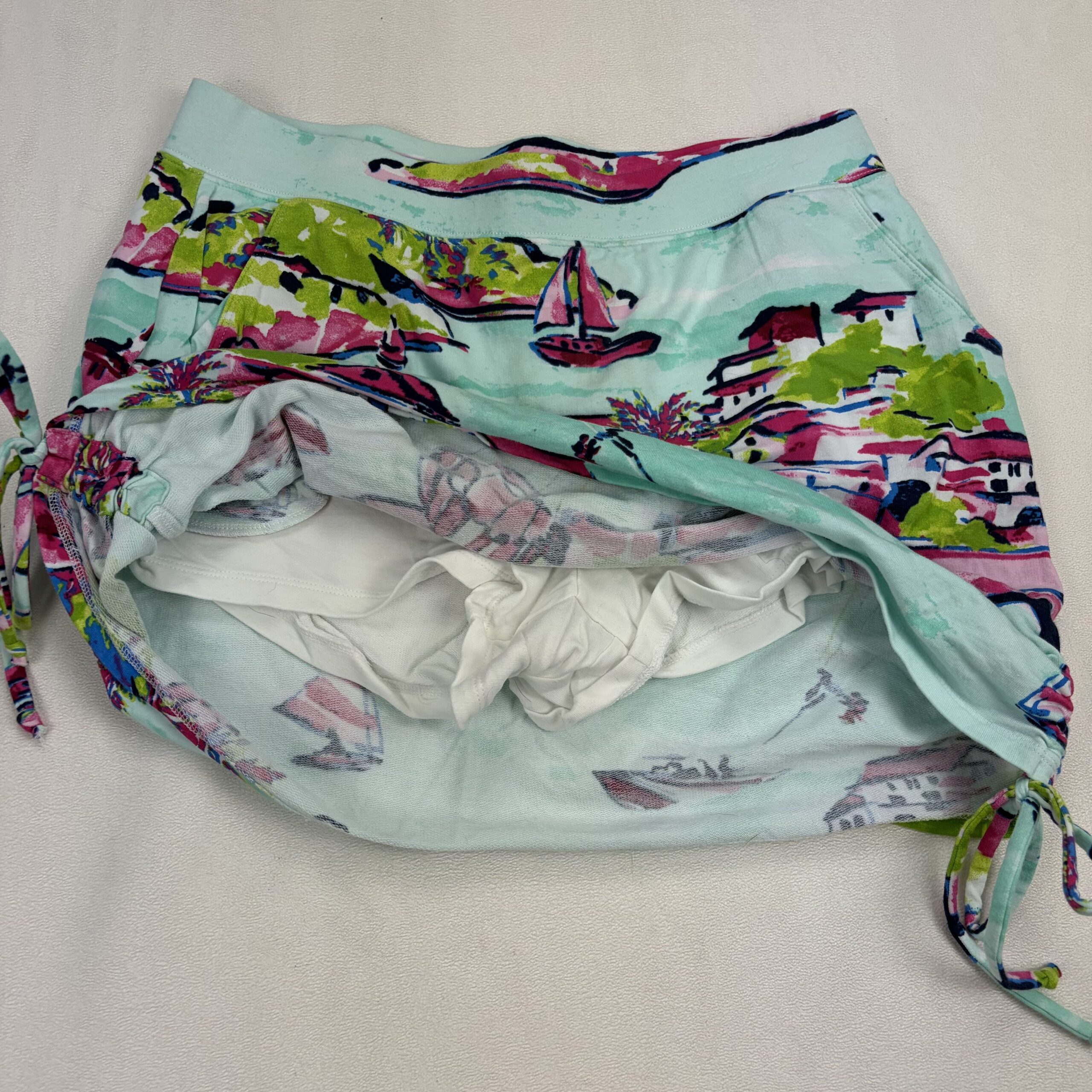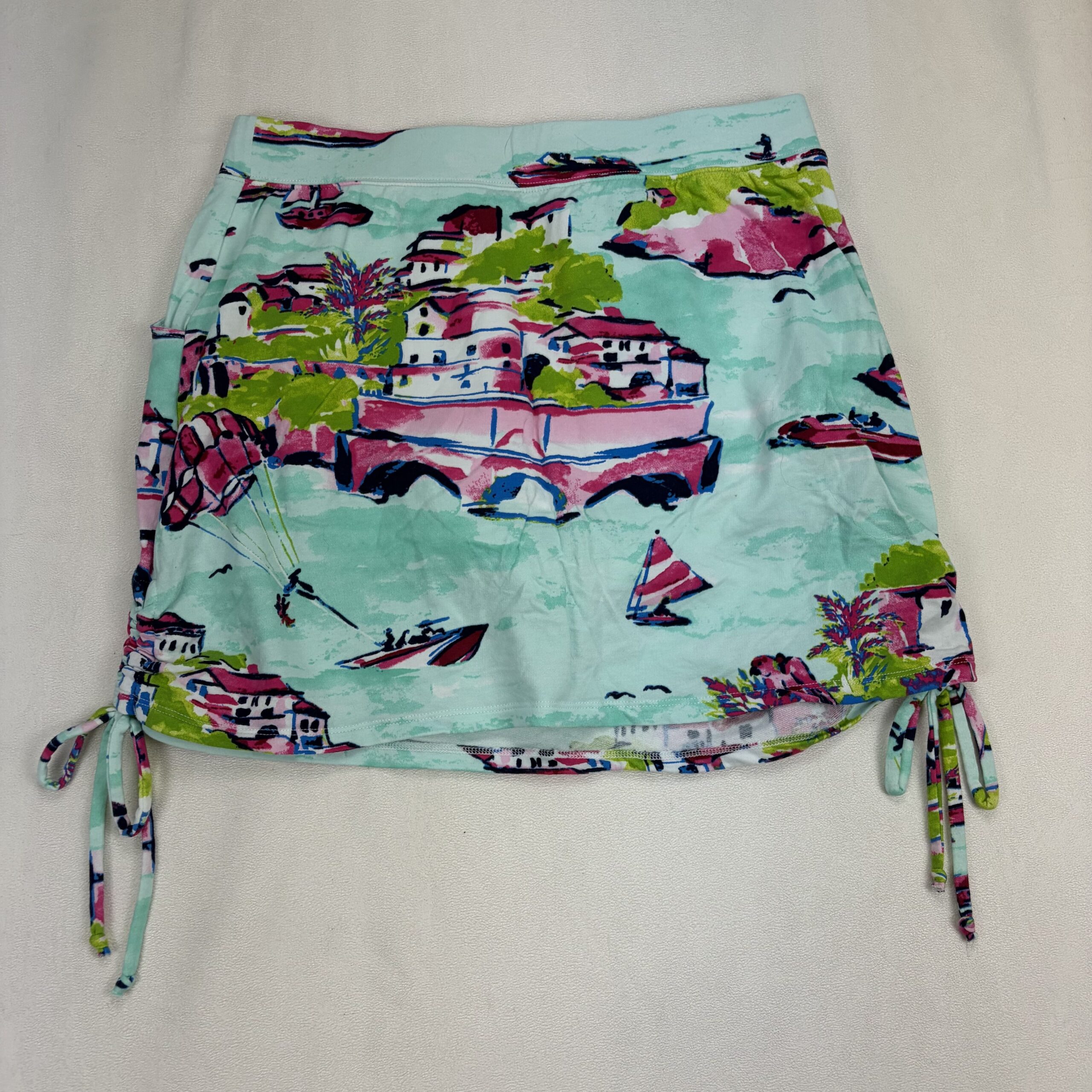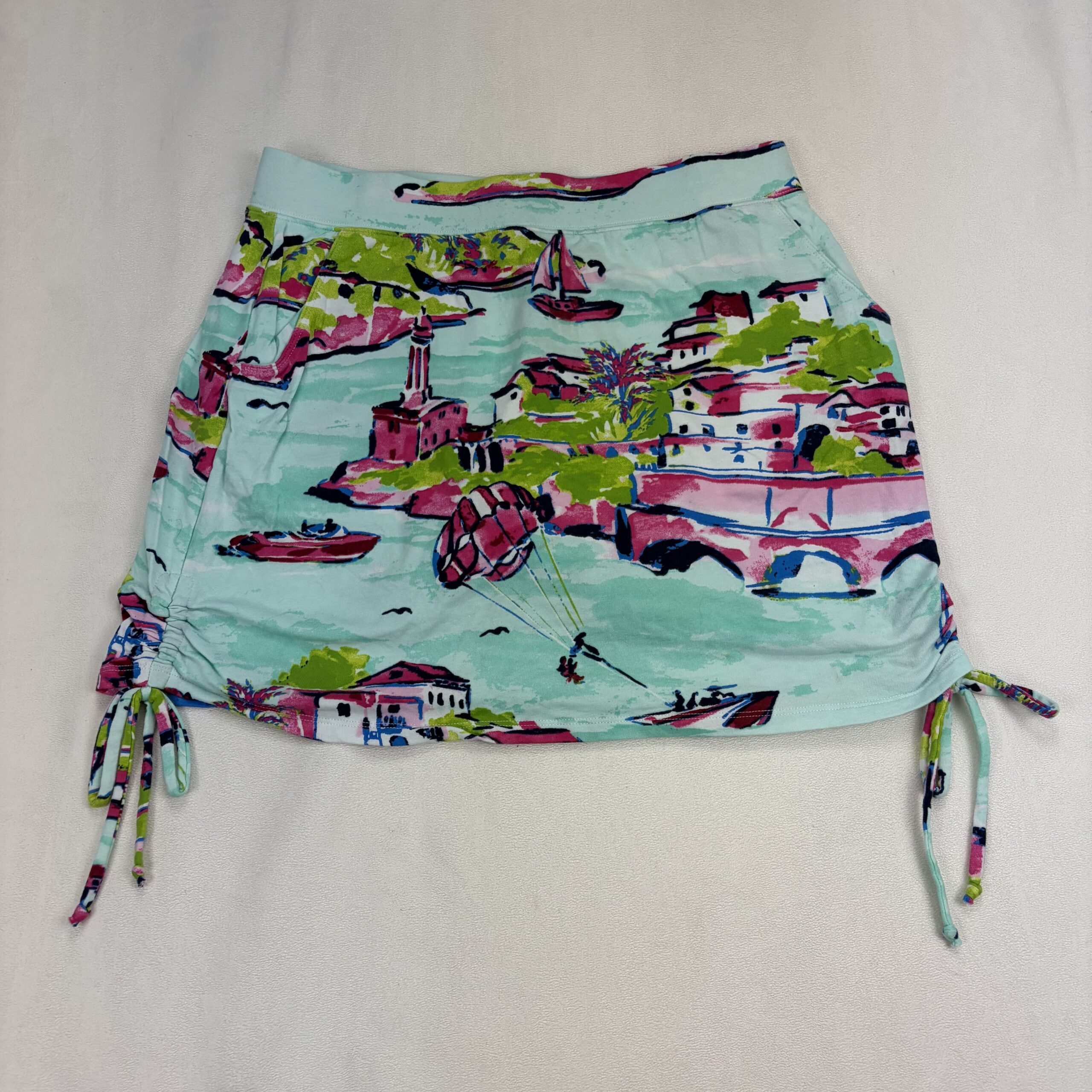 Crown & Ivy women’s mini skirt in size S. Lightweight stretch knit with an elastic waistband for comfortable wear. Features a vibrant seaside/vacation-inspired print in aqua, pink and lime with navy accents, plus adjustable side drawstring ruching and ties to customize length. Great for beach, resort or casual summer outfits. Excellent used condition — free of major rips, tears, stains, or flaws; typical light wear may be present.