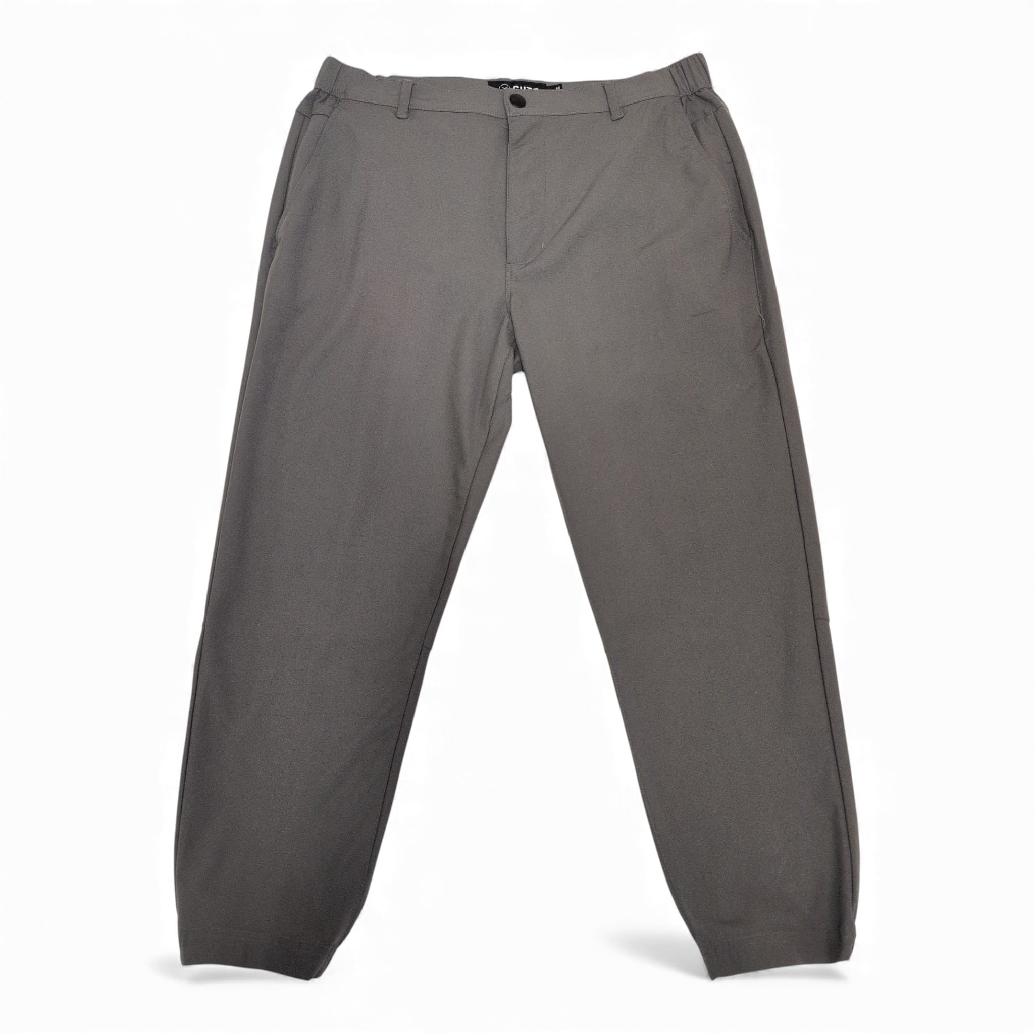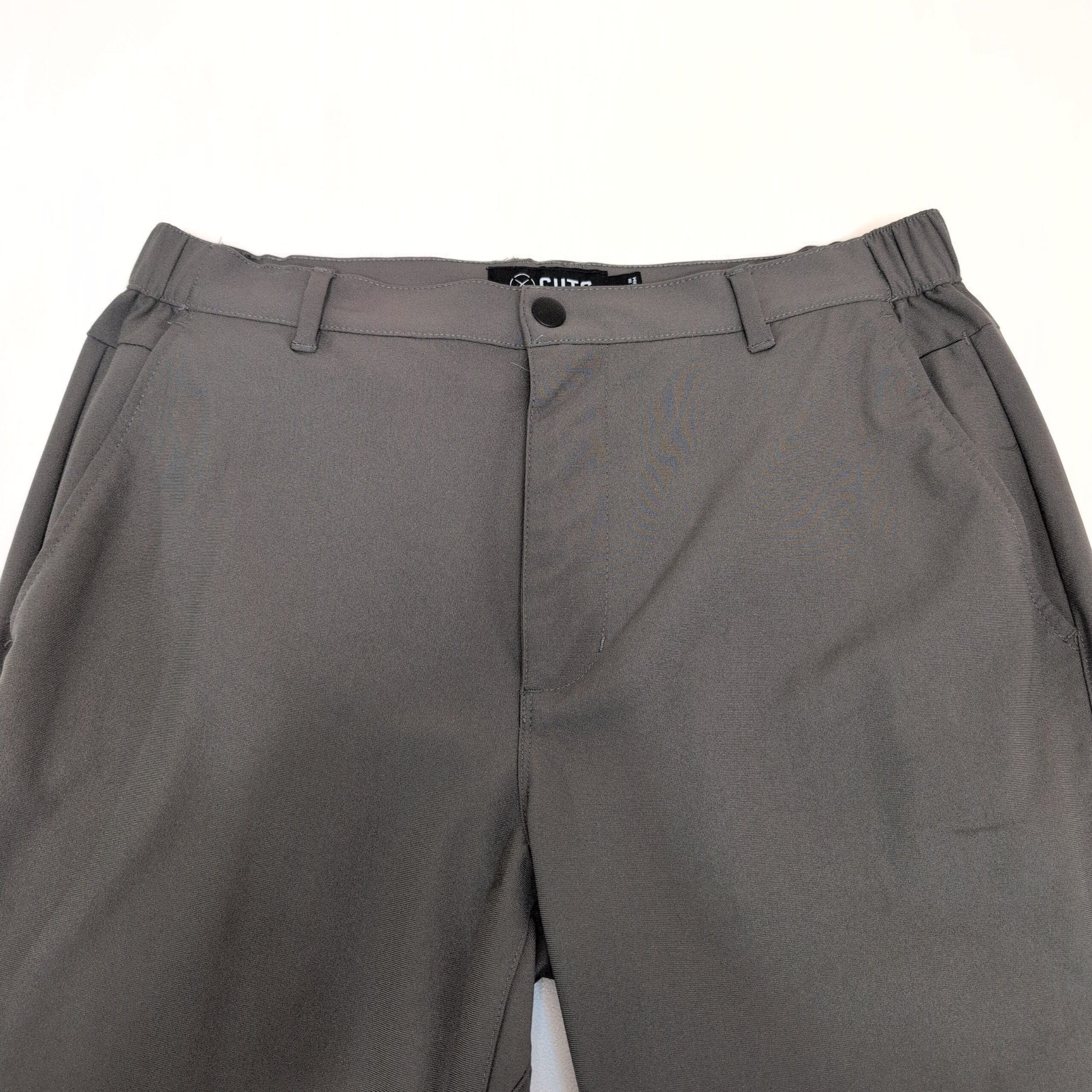 Cuts Clothing men’s chinos in green, size L. Modern tapered silhouette with elasticized cuffs, belt loops, zip fly closure, slanted front pockets and back welt pockets. Versatile piece for casual or smart-casual outfits — pairs well with a tee or button-down. Pre-owned; please review photos for condition and details.