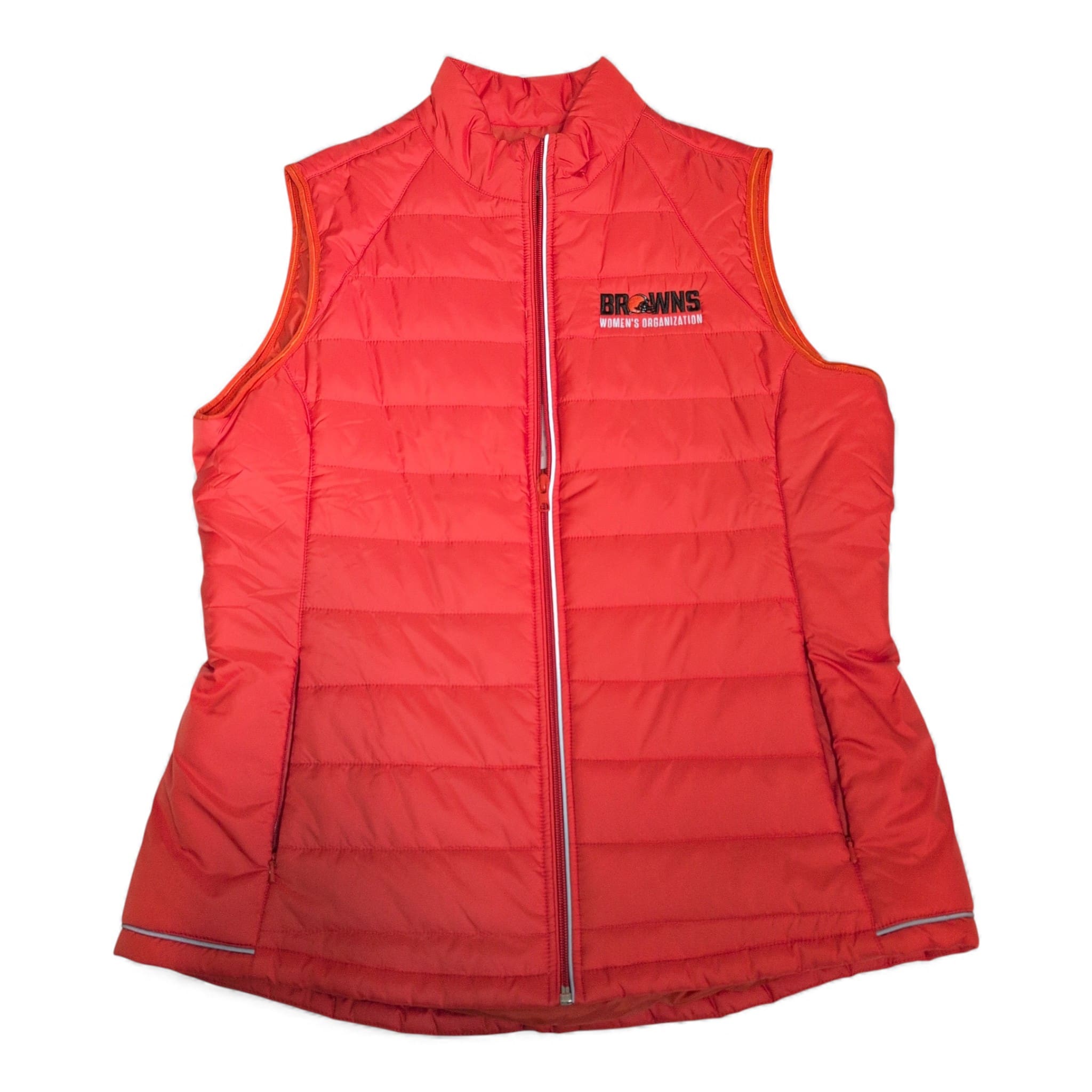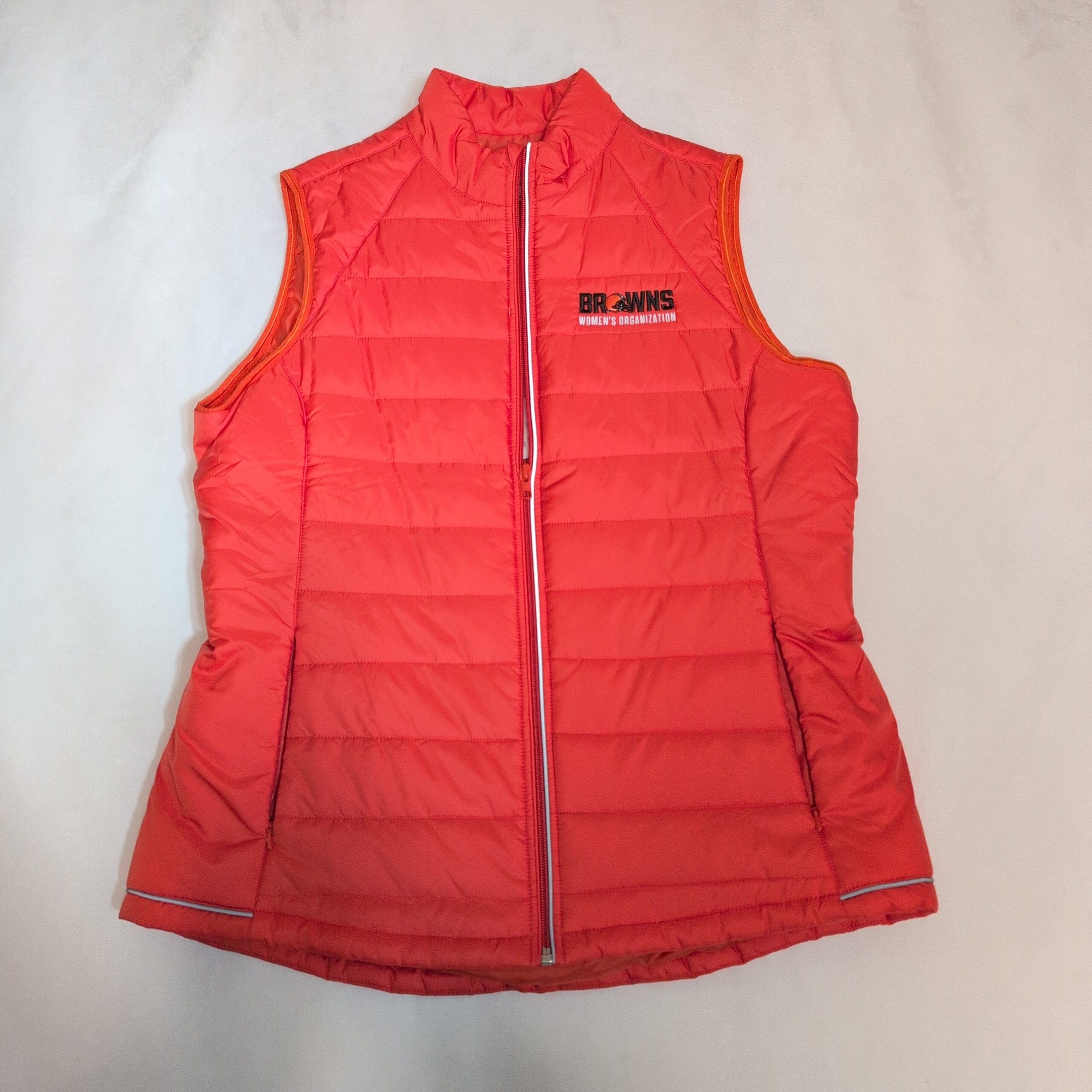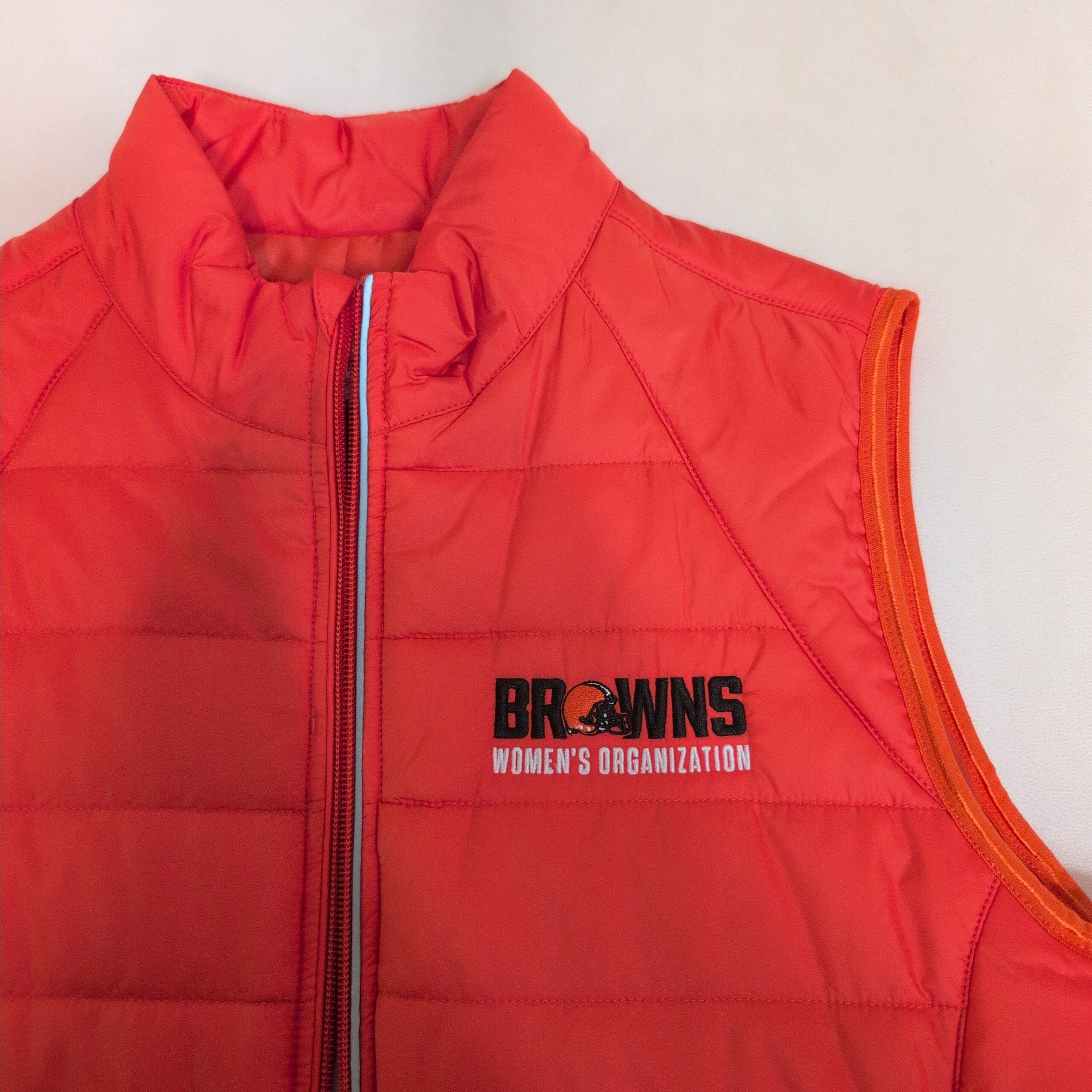 Cutter & Buck quilted puffer vest in bright Cleveland Browns orange. Official licensed NFL gear with embroidered Browns logo at the chest (reads “BROWNS Women’s Organization”). Size XL (standard). New with tags. Features a full zip front, stand collar, zippered hand pockets, and lightweight insulated quilting for comfortable layering on game day or around town.