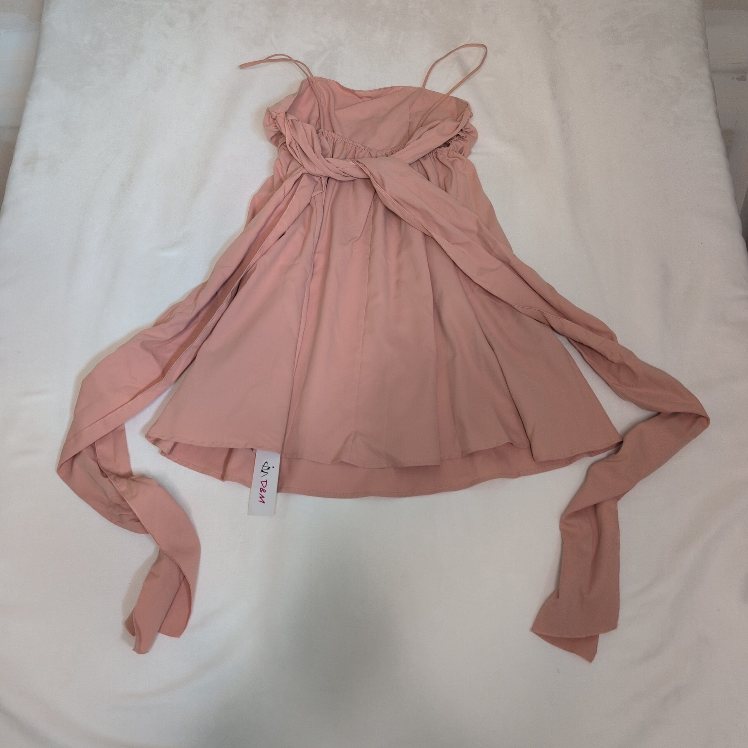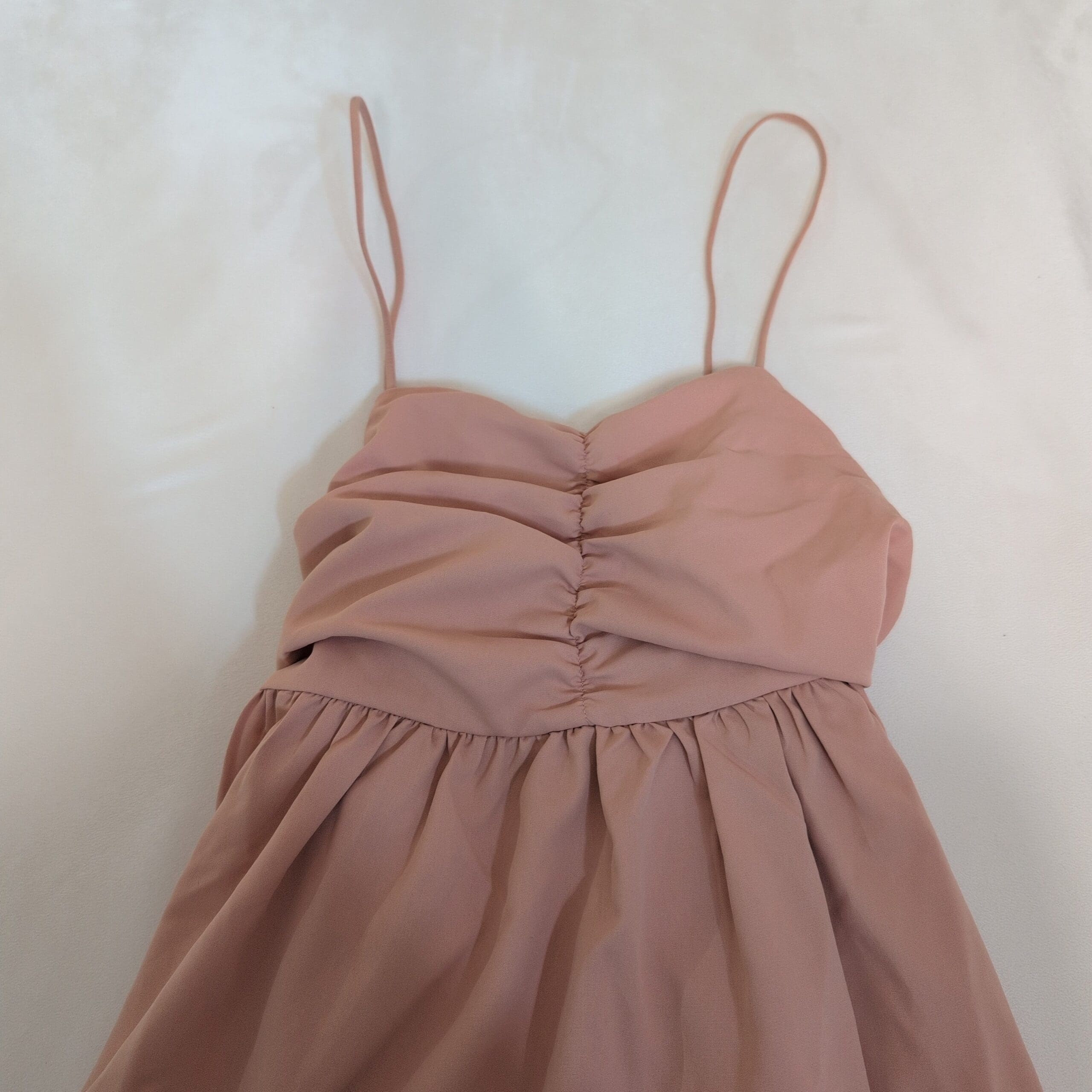 Details: Ruched bust with spaghetti straps and a gathered waist that flows into a fuller skirt. Includes long waist sash/tie as shown. Feminine and versatile for parties, dates, or warm-weather outings.