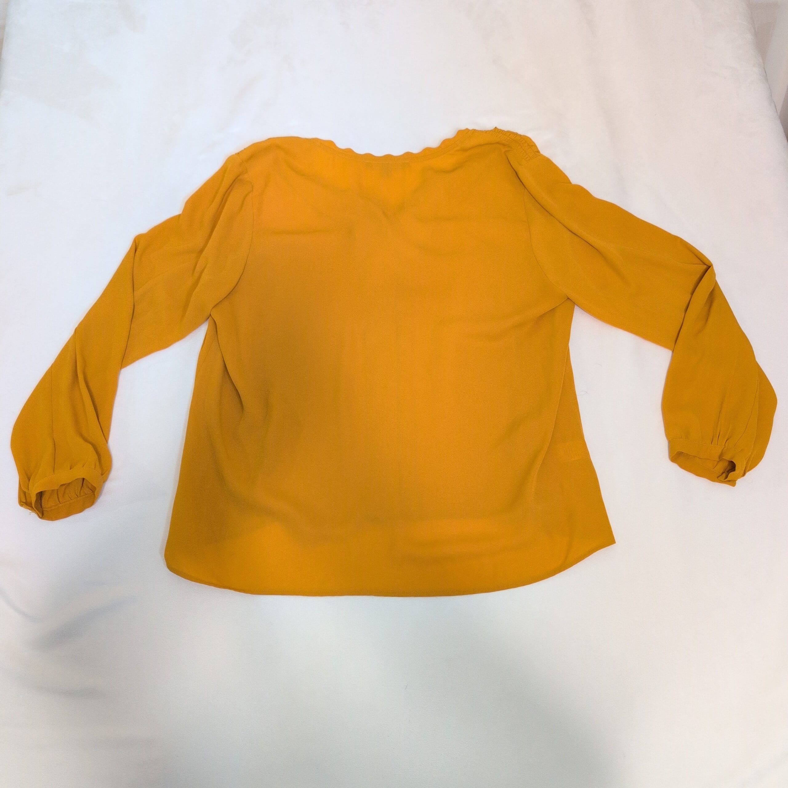Daniel Rainn women’s button-front blouse in a warm mustard yellow. Size XL (standard) featuring a scalloped V-neck placket, gathered yoke at the shoulders, and long sleeves with button cuffs. Lightweight, flowy silhouette ideal for work, weekend, or layered looks. Buttons down the center front; excellent pre-owned condition with no noticeable flaws.