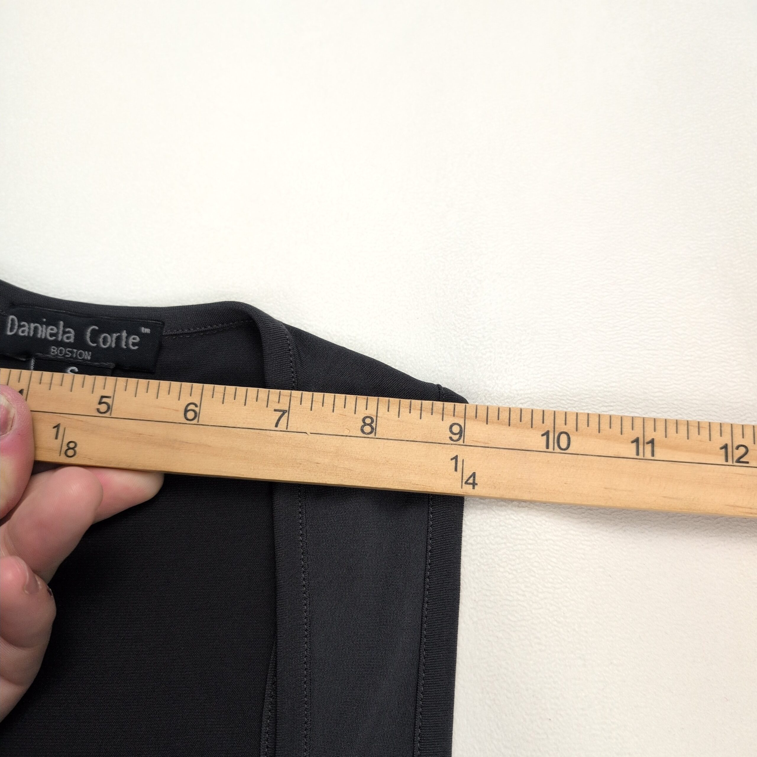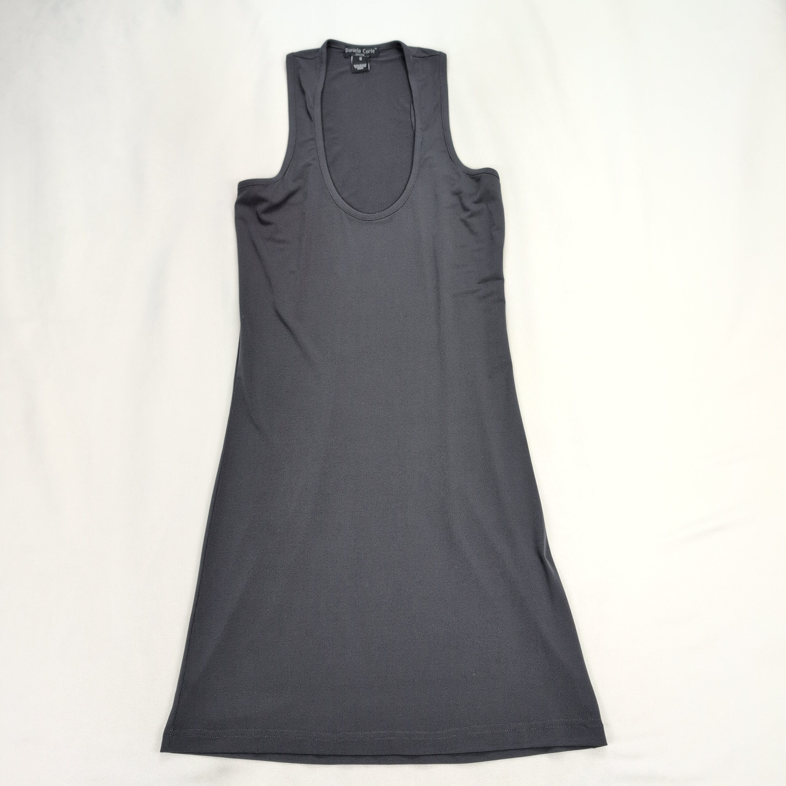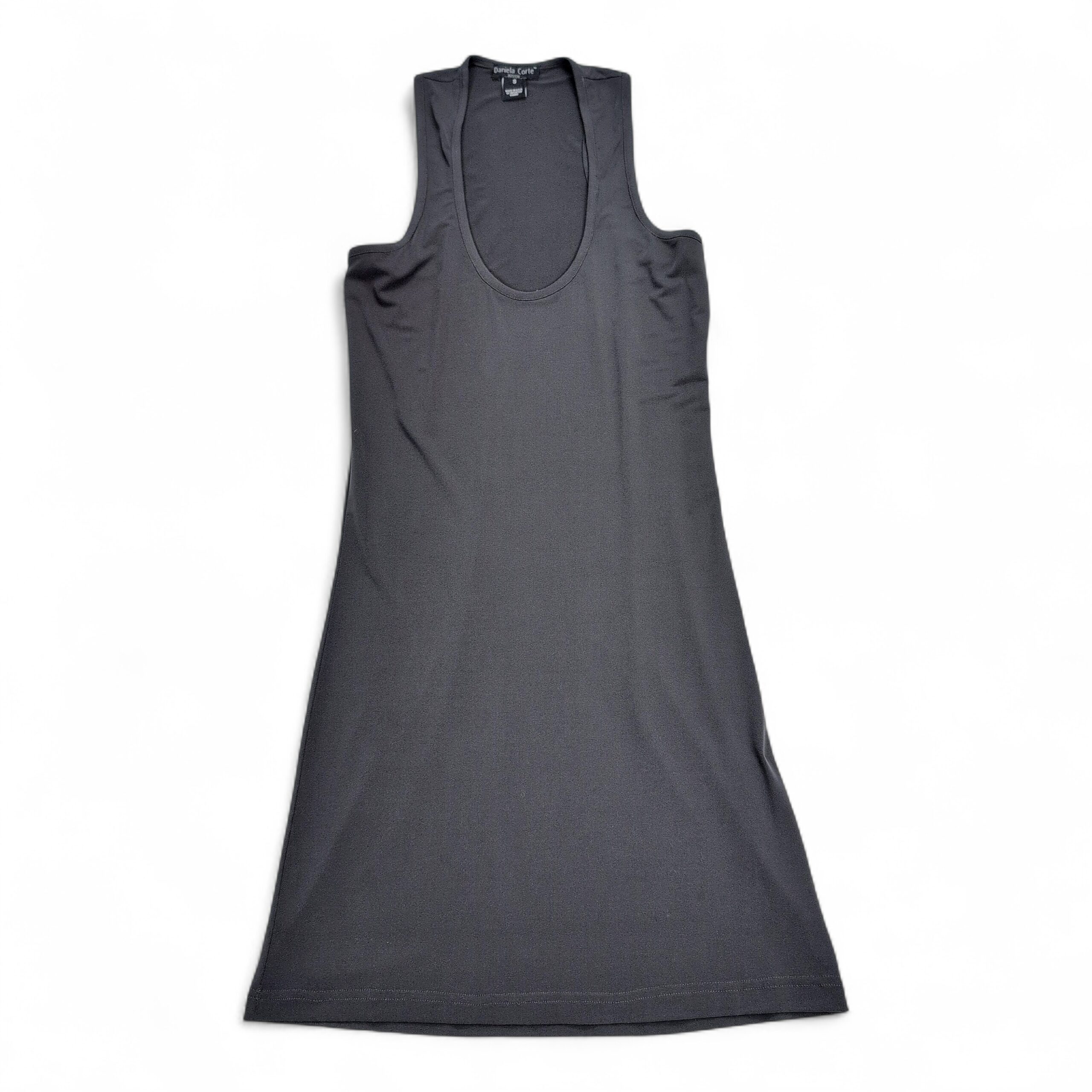 Daniela Corte women’s black sleeveless tank dress in size S. Scoop neckline with a slim, slightly A-line silhouette in a soft, stretchy knit — simple and versatile for layering or wearing on its own. Clean finish at hem and neckline; classic minimalist style that transitions easily from casual to dressier looks.