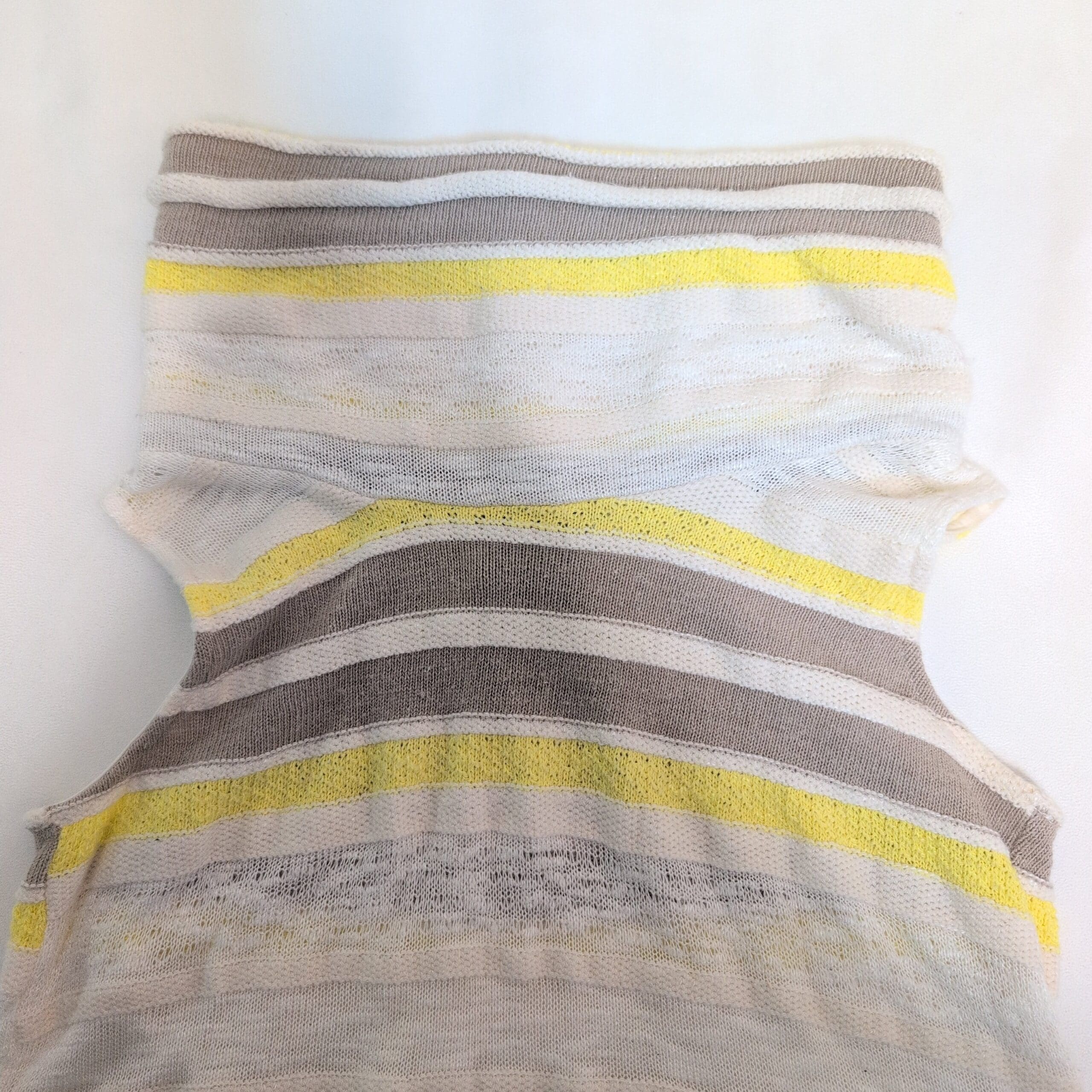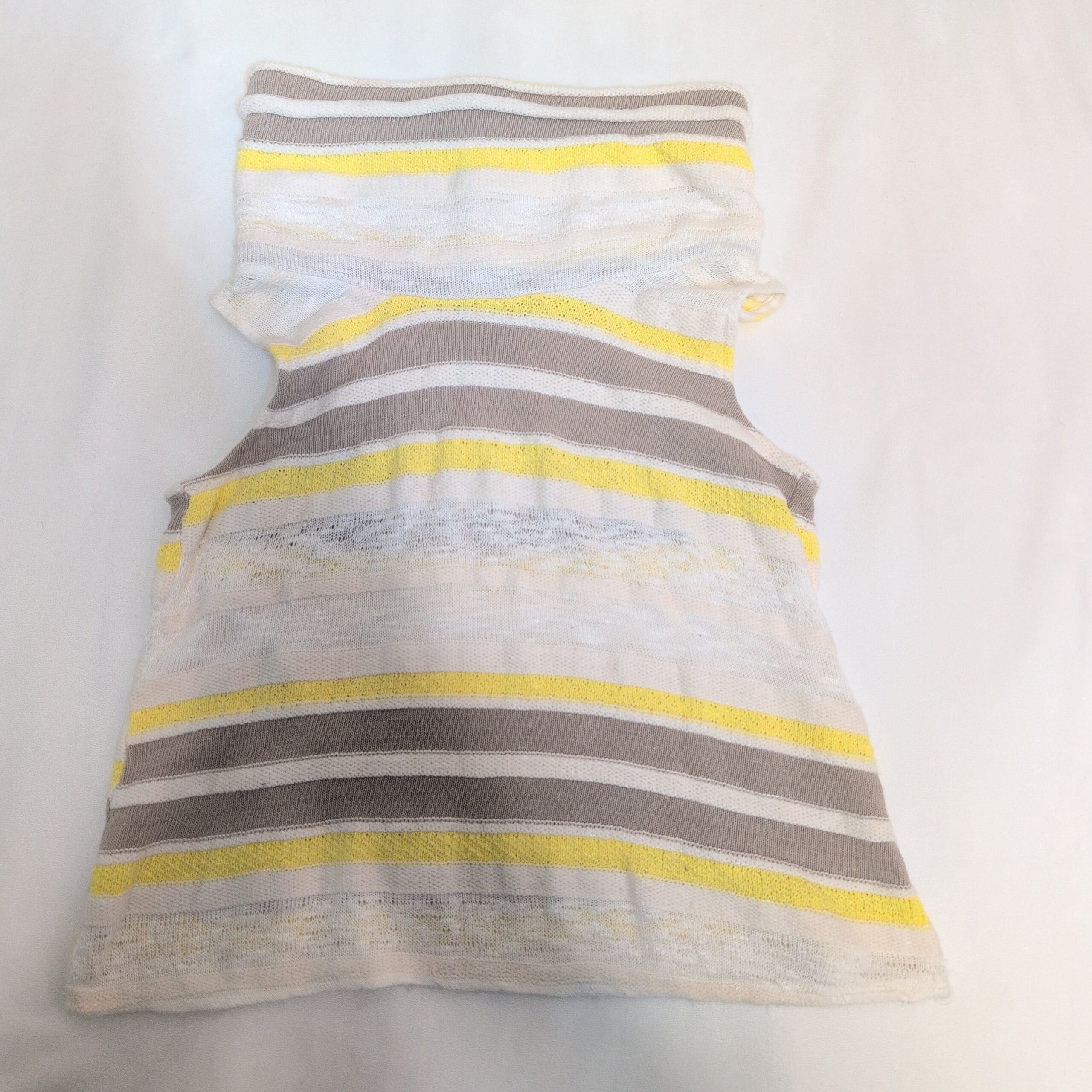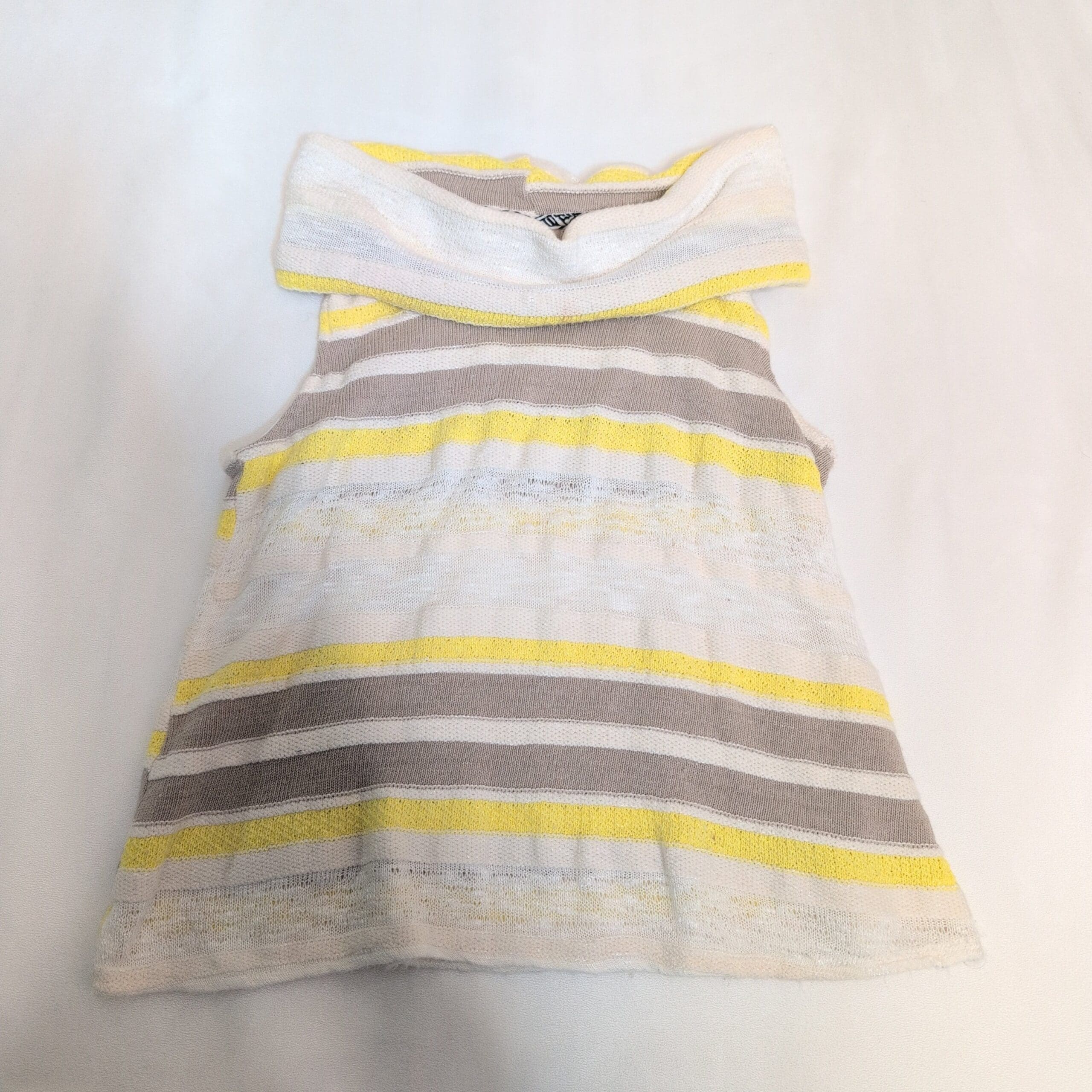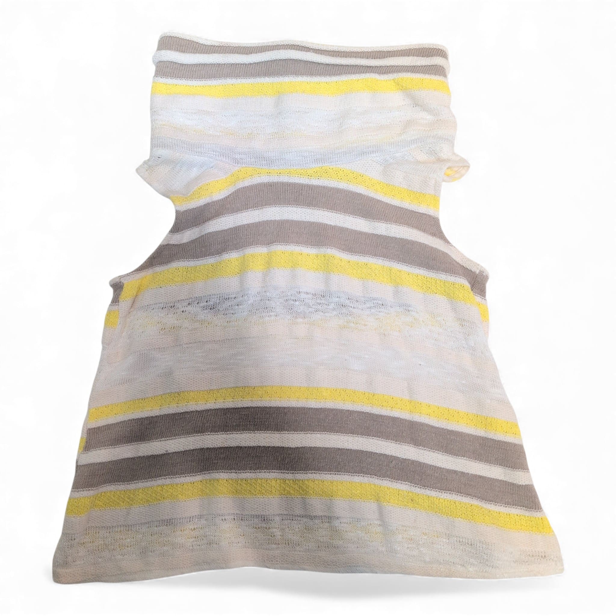 Lightweight sleeveless knit top by Dolan in a fresh yellow, white, and taupe striped pattern. Features a relaxed cowl neckline and a flattering slim fit in a true Size S. Soft, breathable open-knit construction makes it perfect for layering or warm-weather wear. Excellent condition — no flaws.
