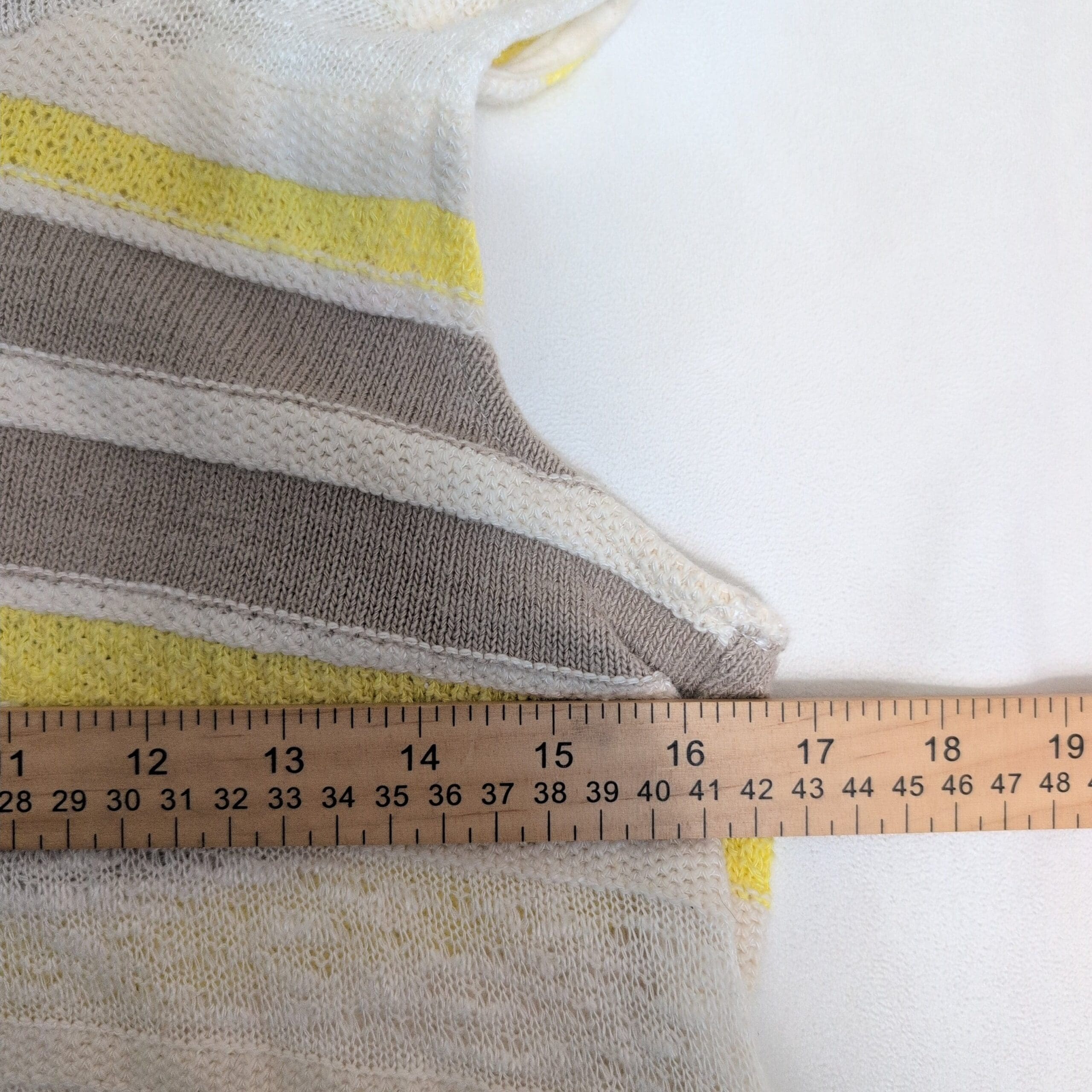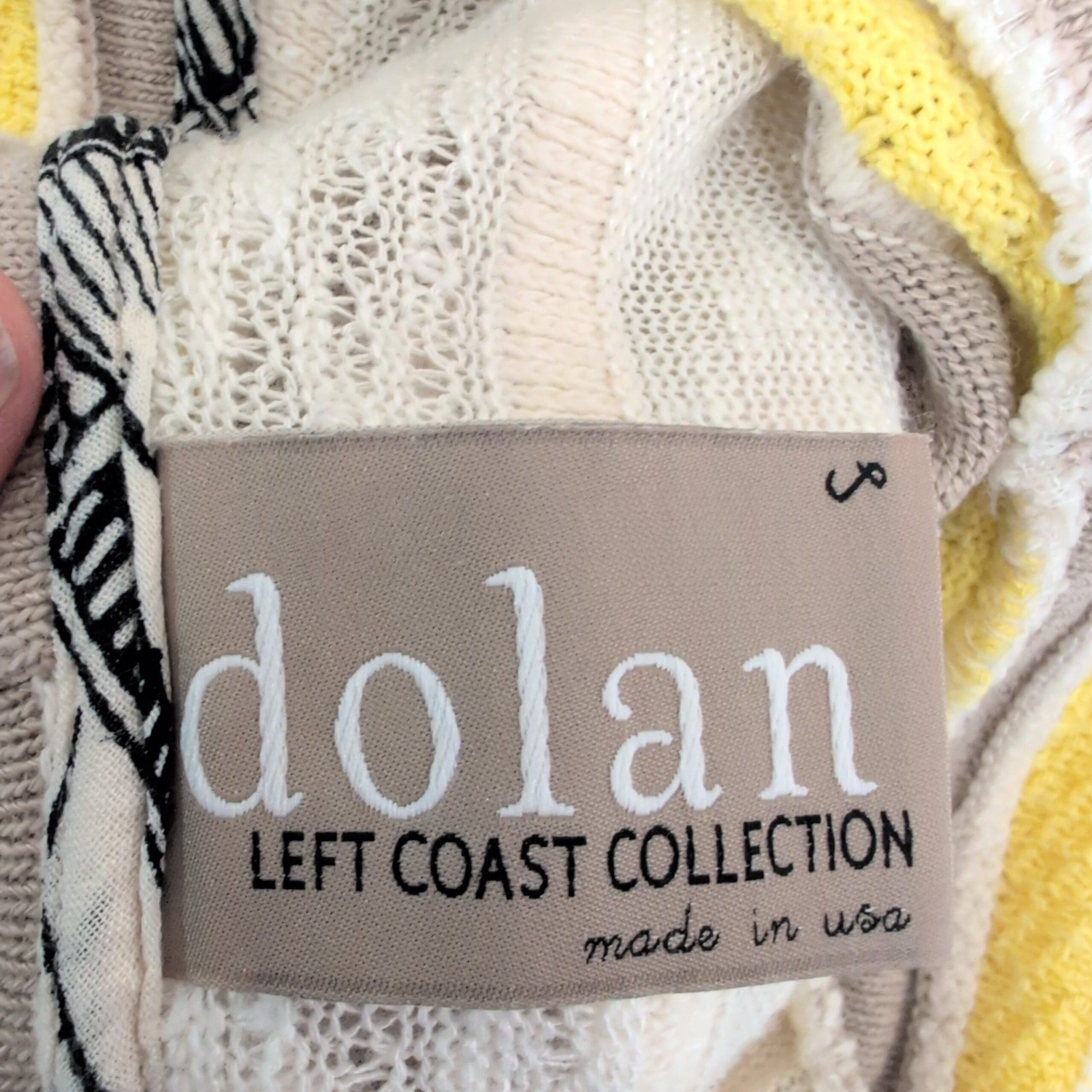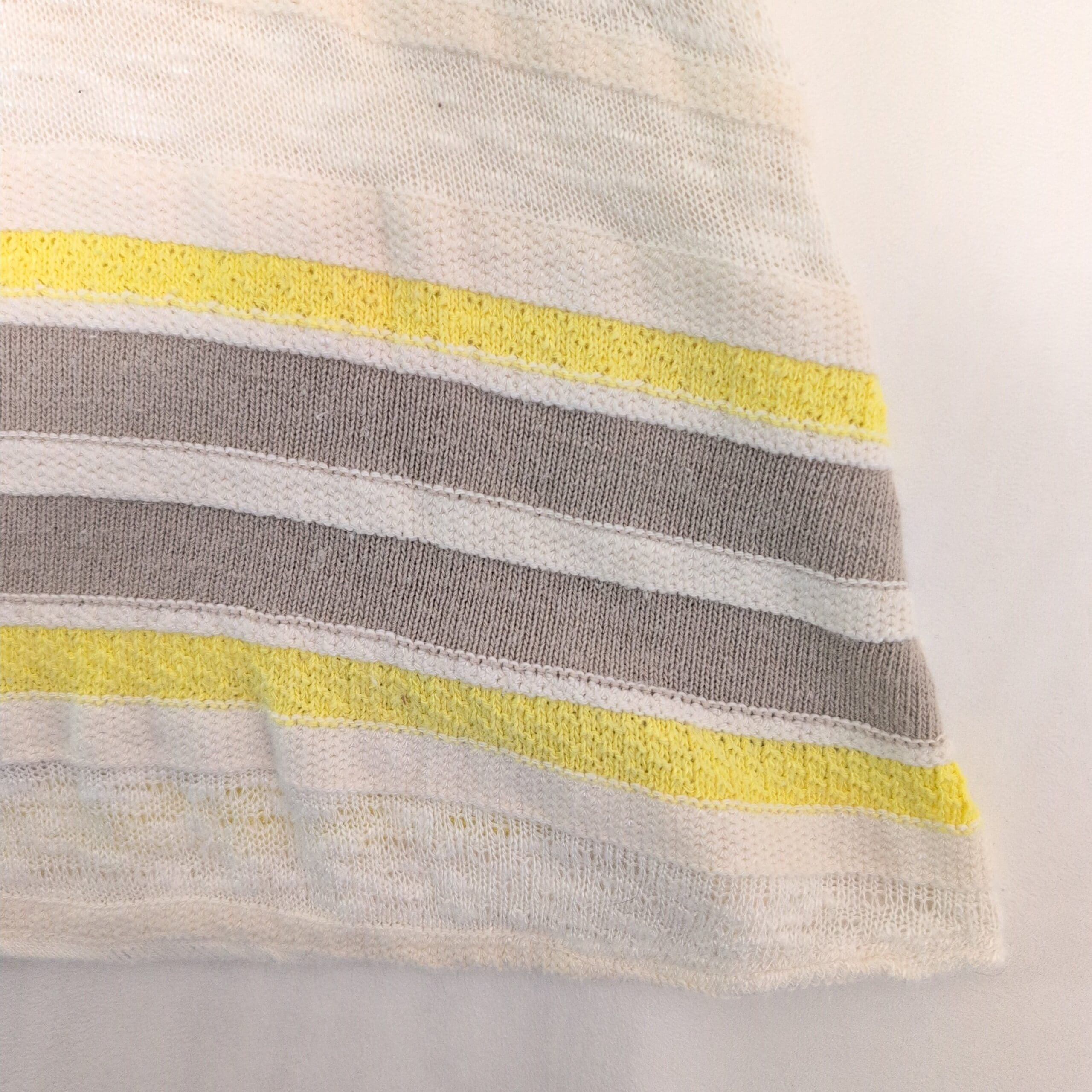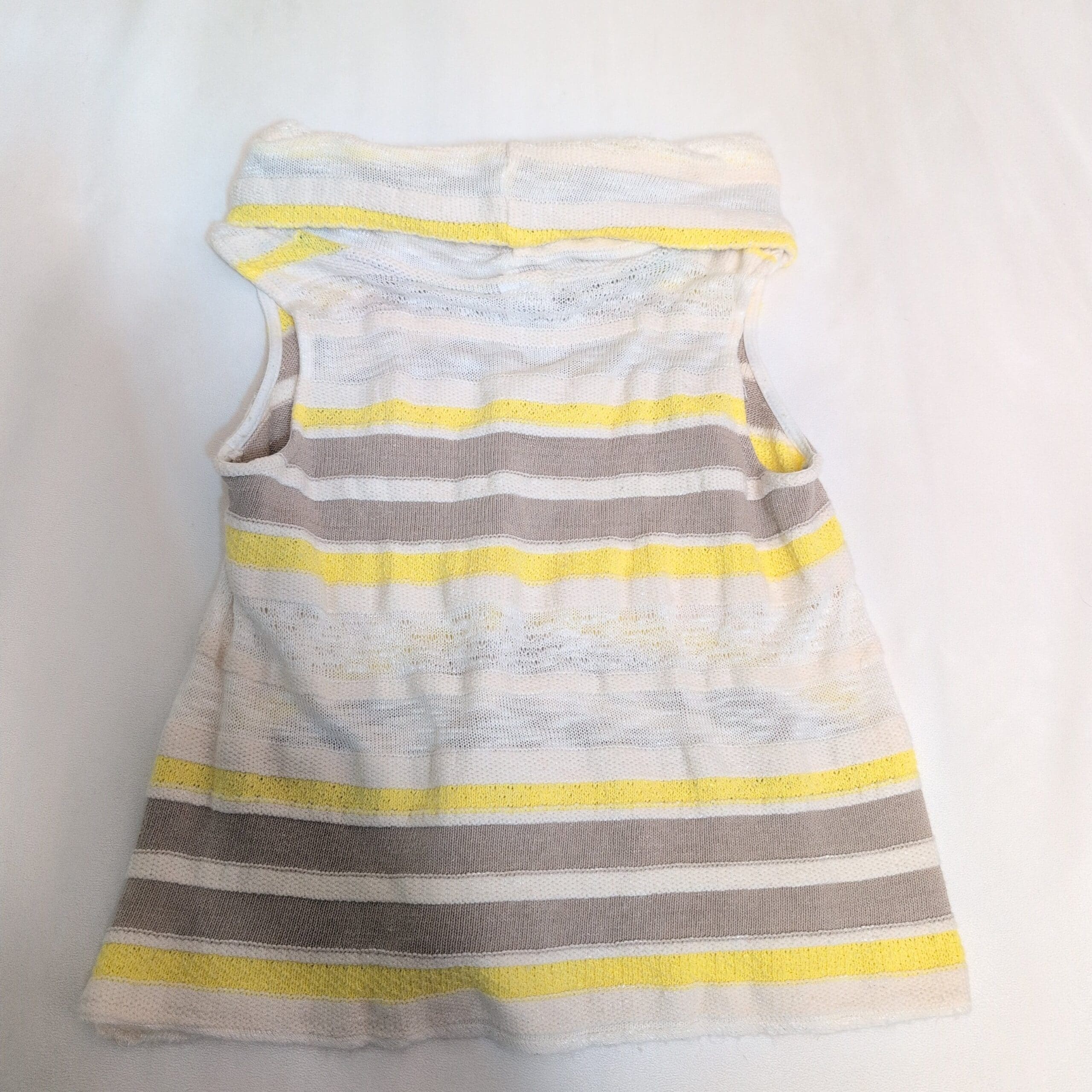 Lightweight sleeveless knit top by Dolan in a fresh yellow, white, and taupe striped pattern. Features a relaxed cowl neckline and a flattering slim fit in a true Size S. Soft, breathable open-knit construction makes it perfect for layering or warm-weather wear. Excellent condition — no flaws.