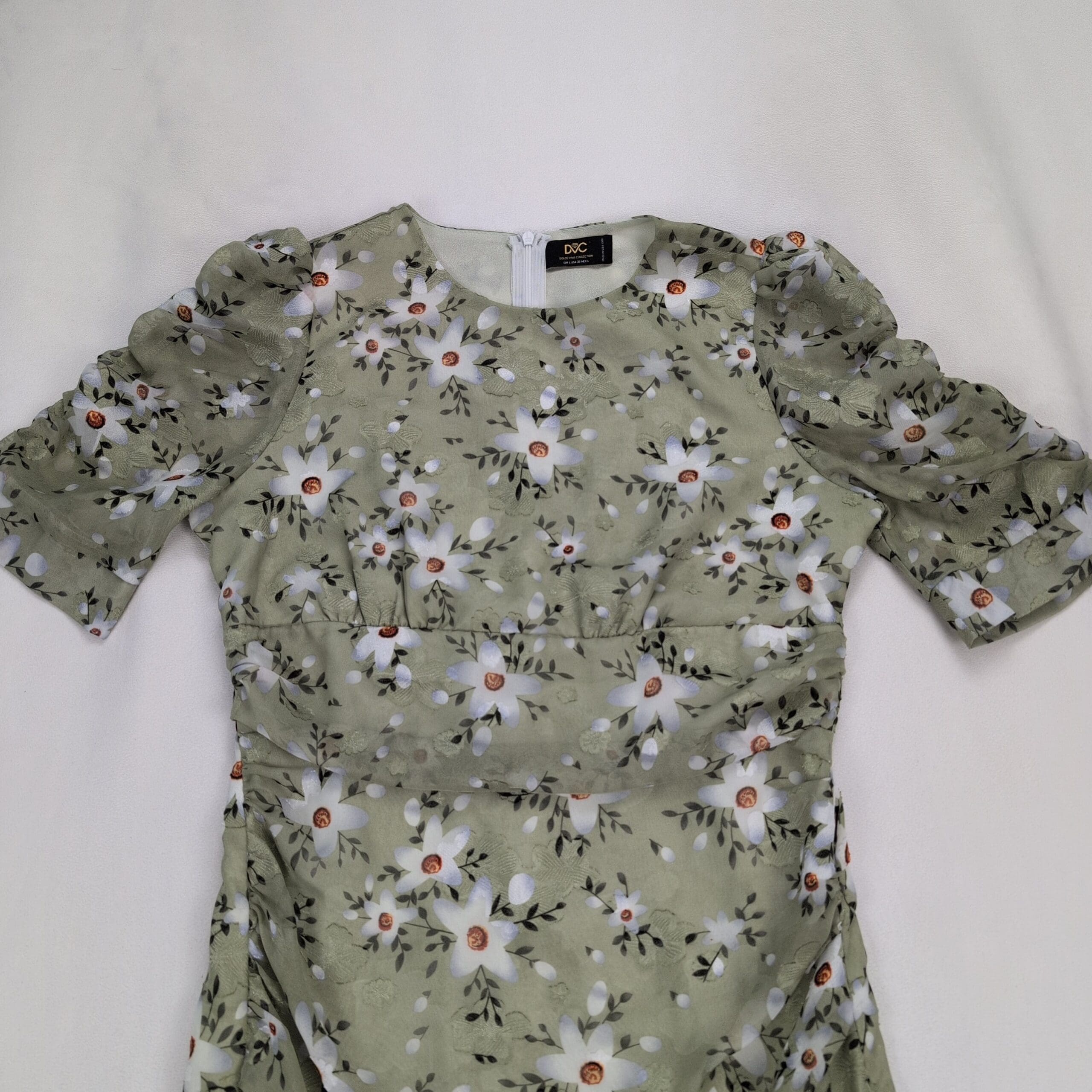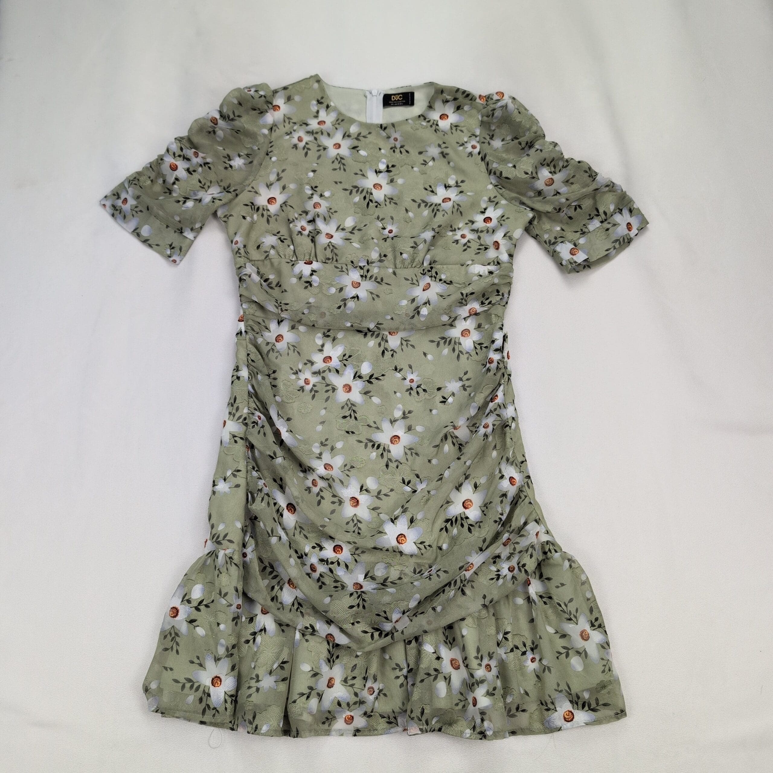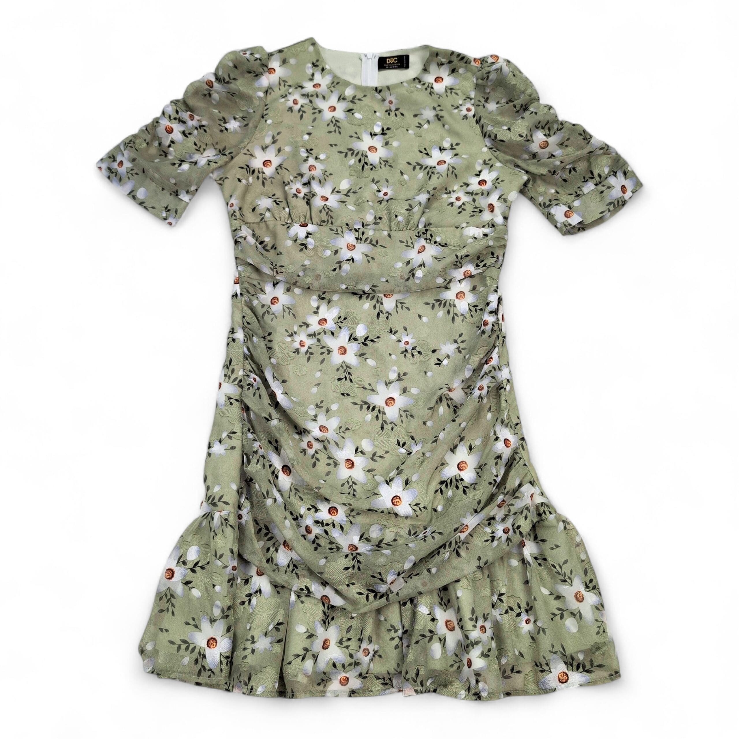 Dolce Vita size L sage-green floral dress with white daisy print. Features short puff sleeves, ruched bodice and side draping for a flattering silhouette, ruffled hem, and a back center zipper closure. Feminine, flowy style perfect for spring/summer events or daytime outings.