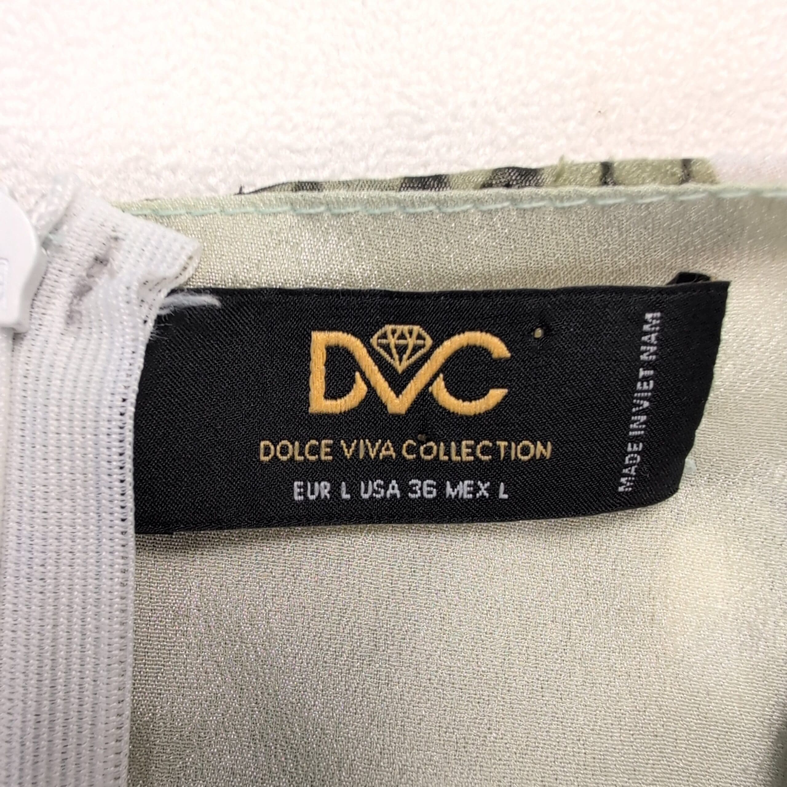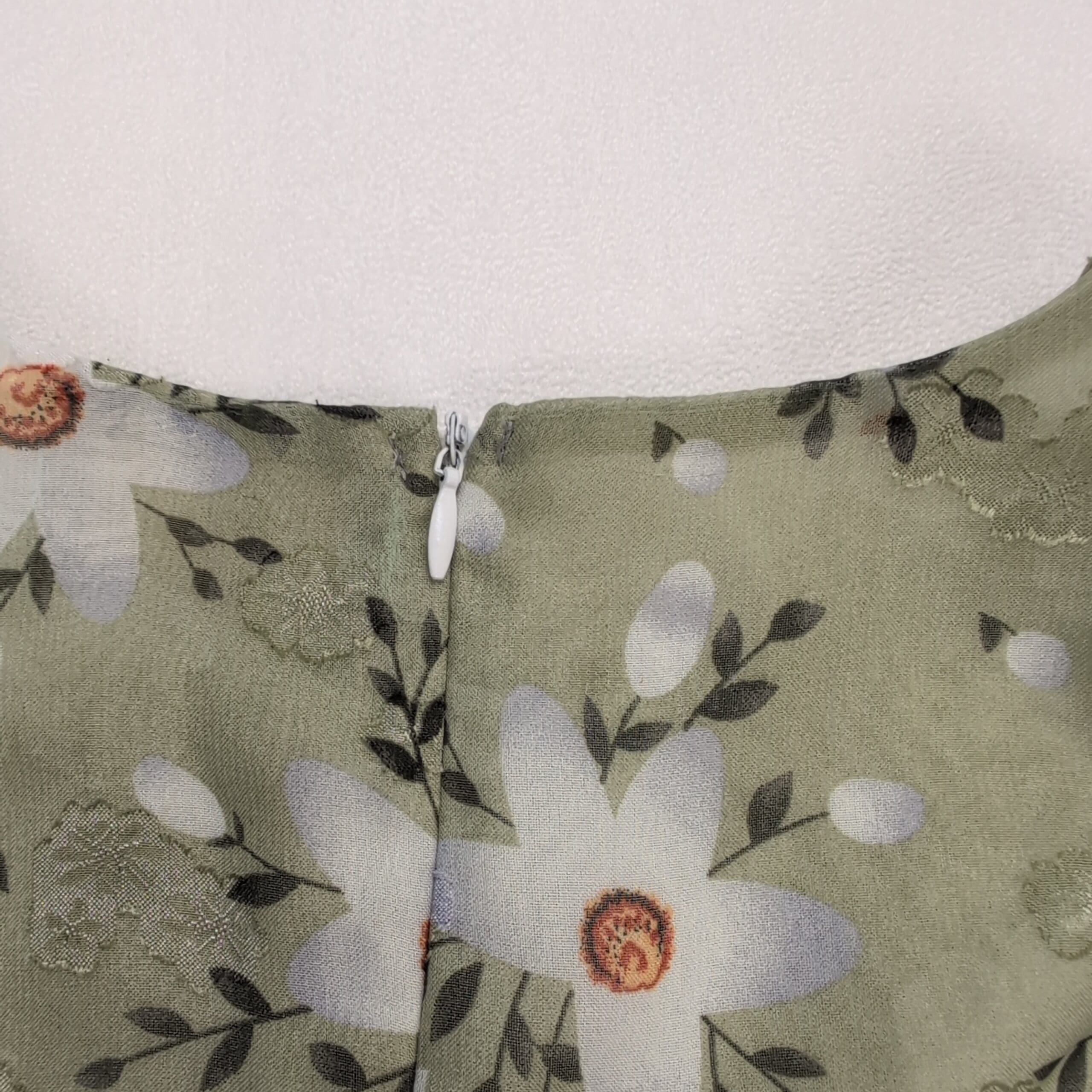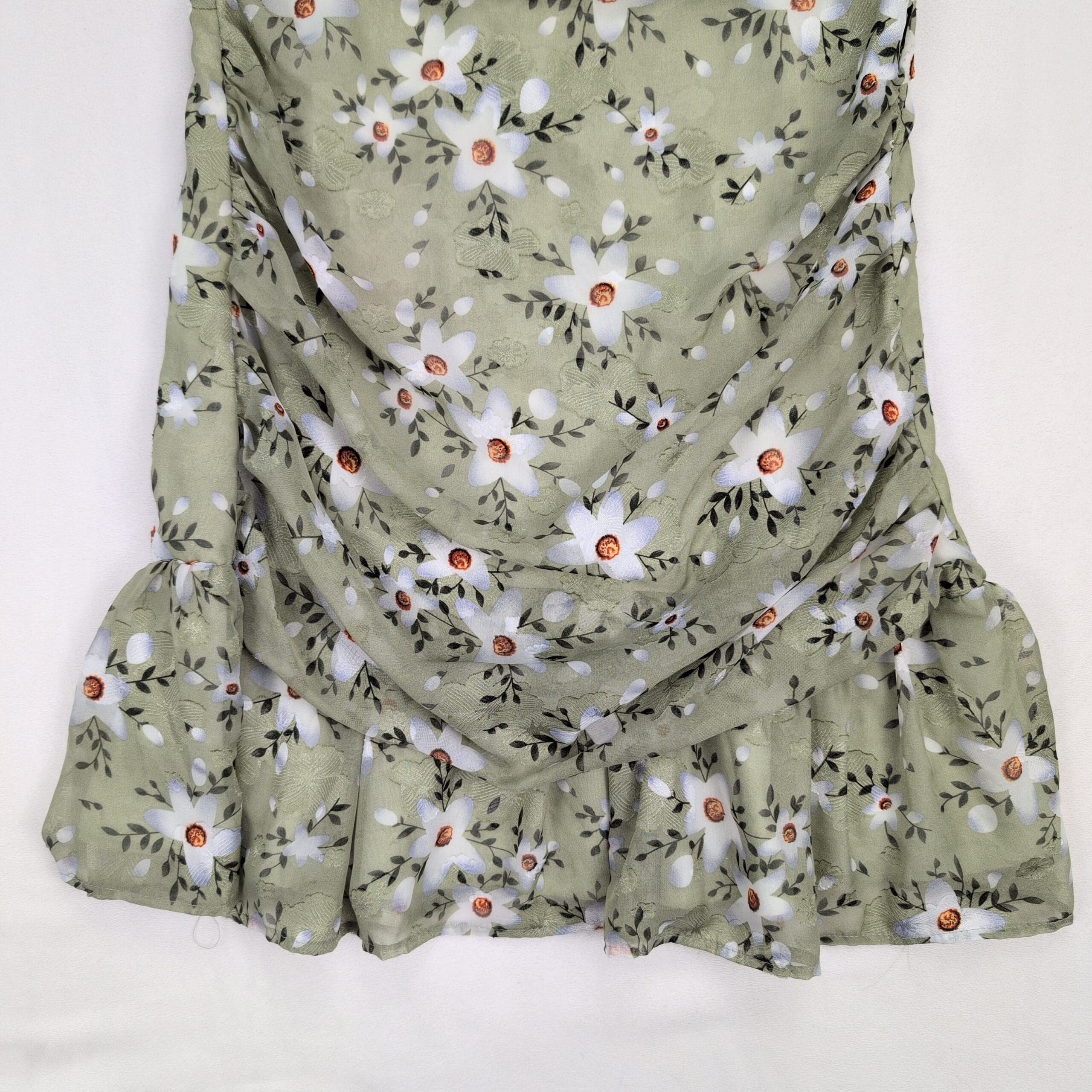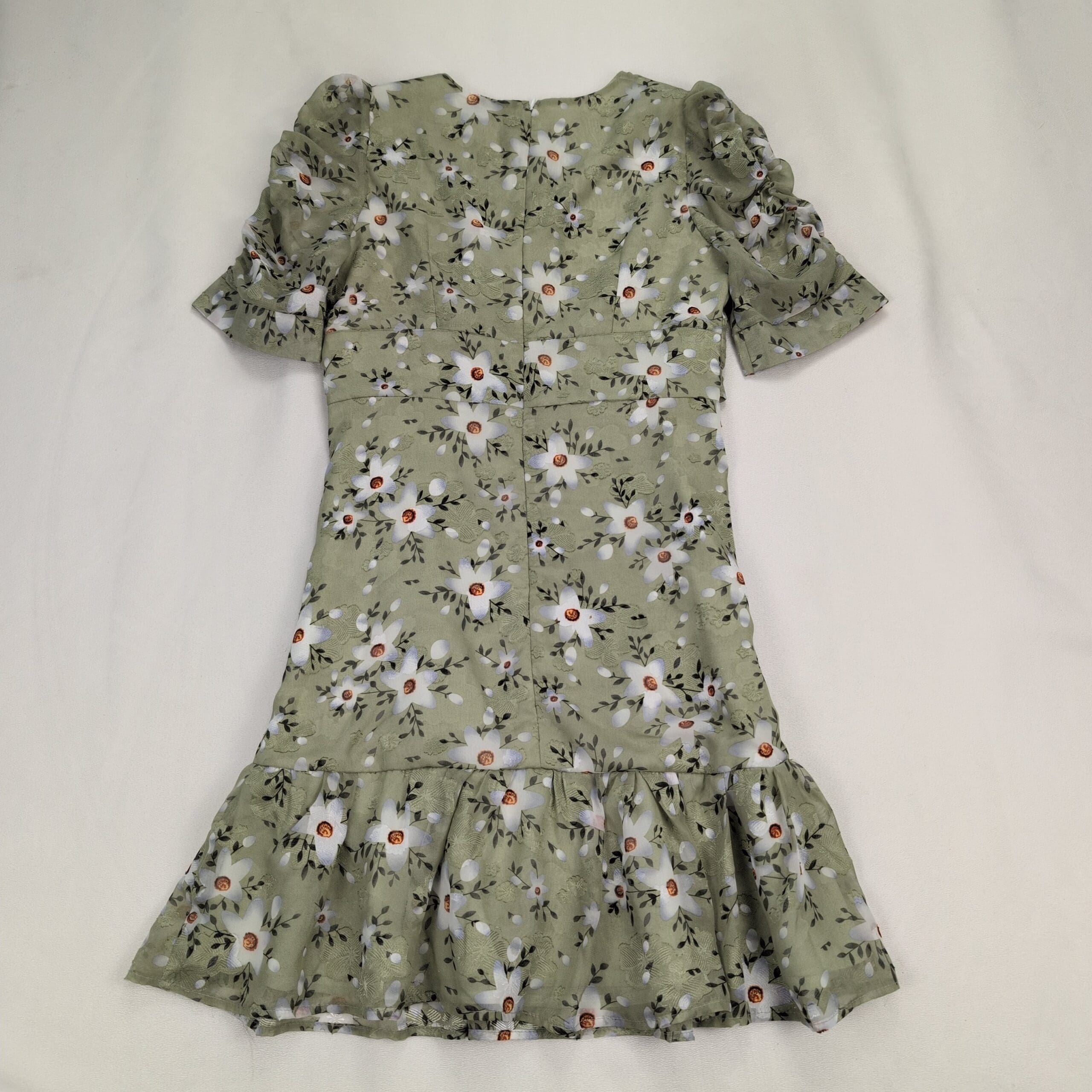 Dolce Vita size L sage-green floral dress with white daisy print. Features short puff sleeves, ruched bodice and side draping for a flattering silhouette, ruffled hem, and a back center zipper closure. Feminine, flowy style perfect for spring/summer events or daytime outings.