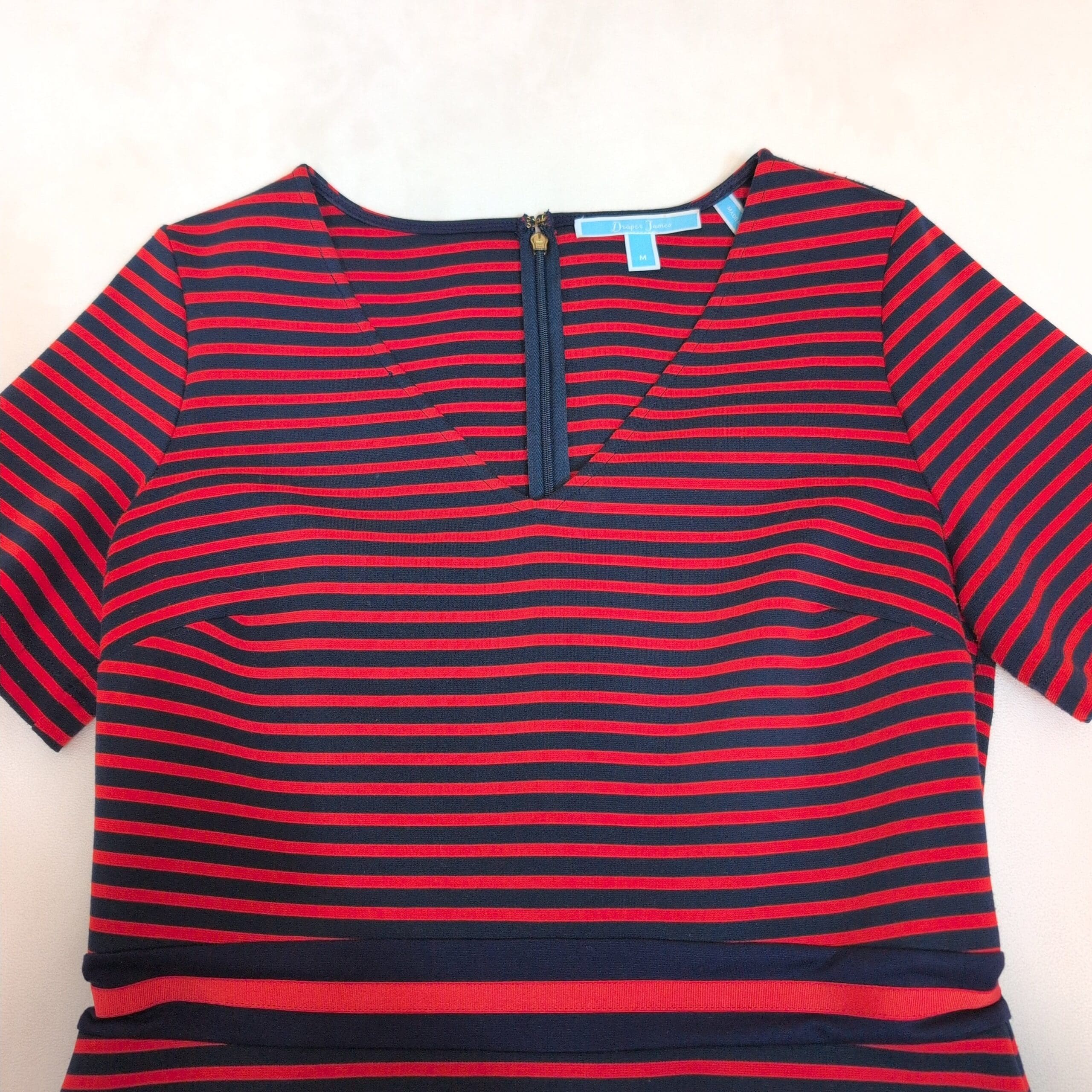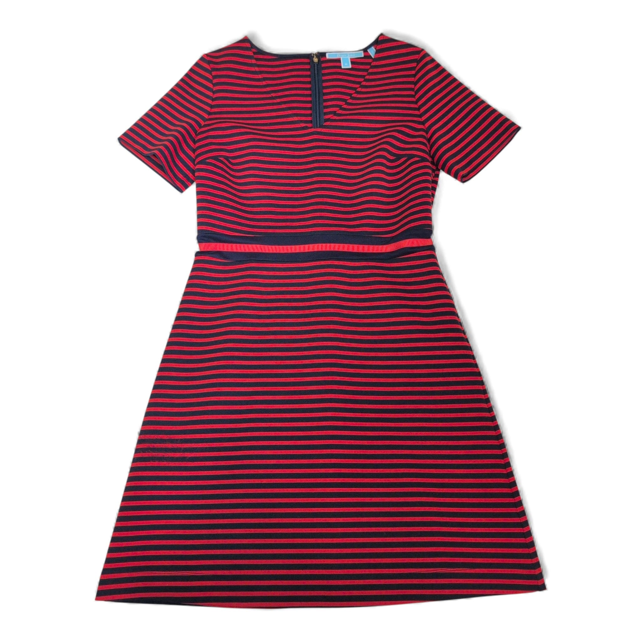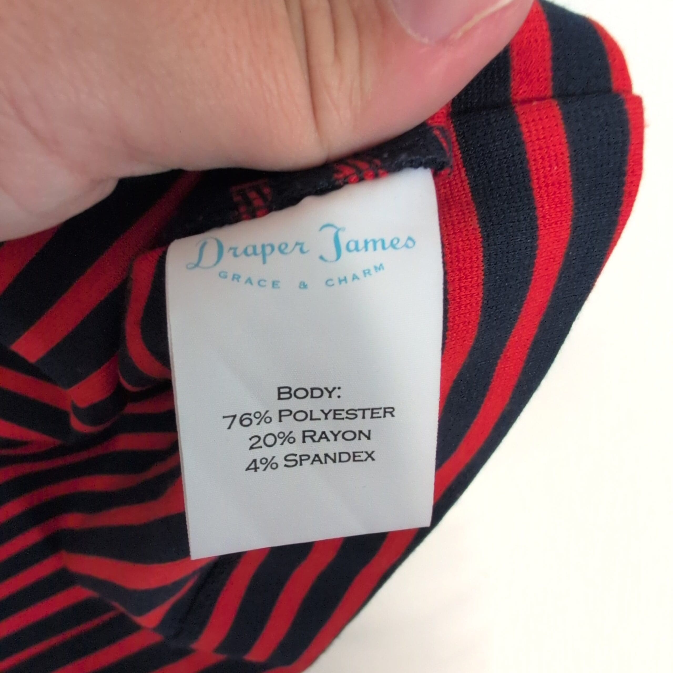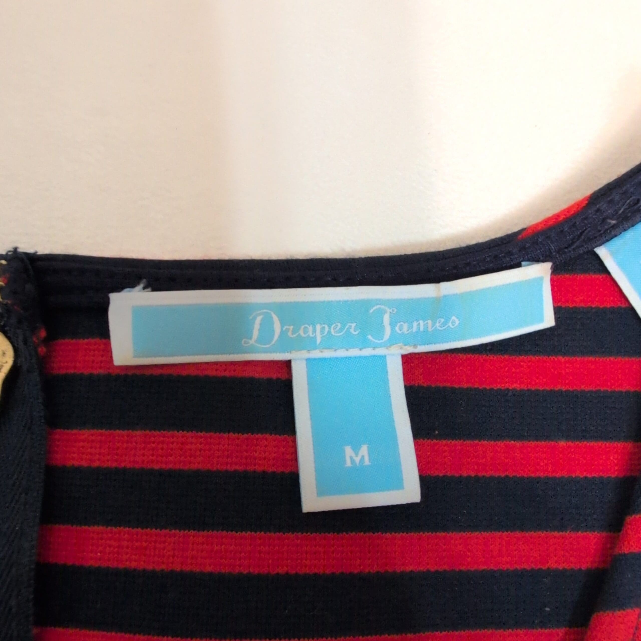 Draper James women’s dress in red and navy horizontal stripes. Size M (standard). Short sleeves with a modest V-notch neckline and an exposed back zipper. Fitted bodice with a defined waist band and a flattering A-line skirt—classic, versatile silhouette perfect for work, brunch, or special occasions. See photos for details.