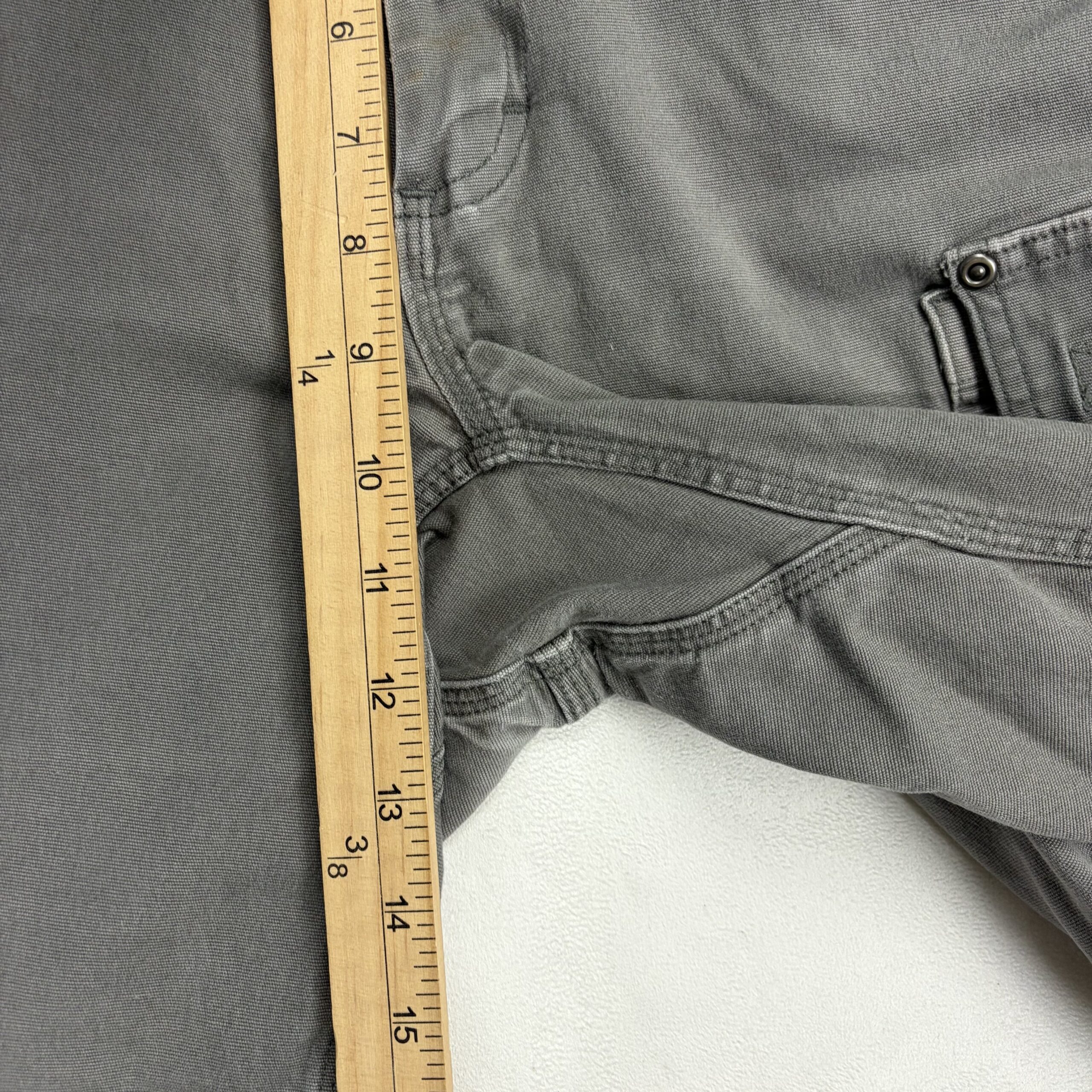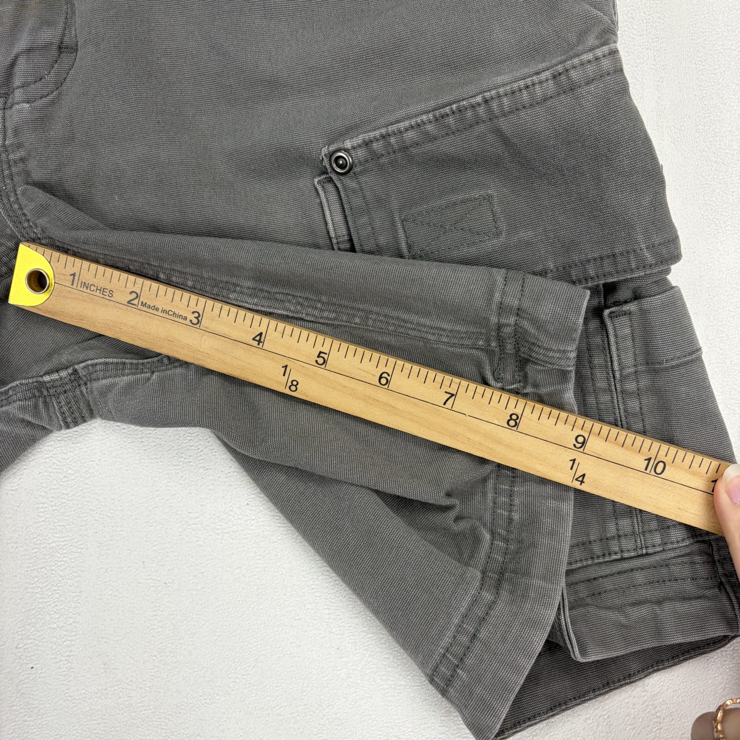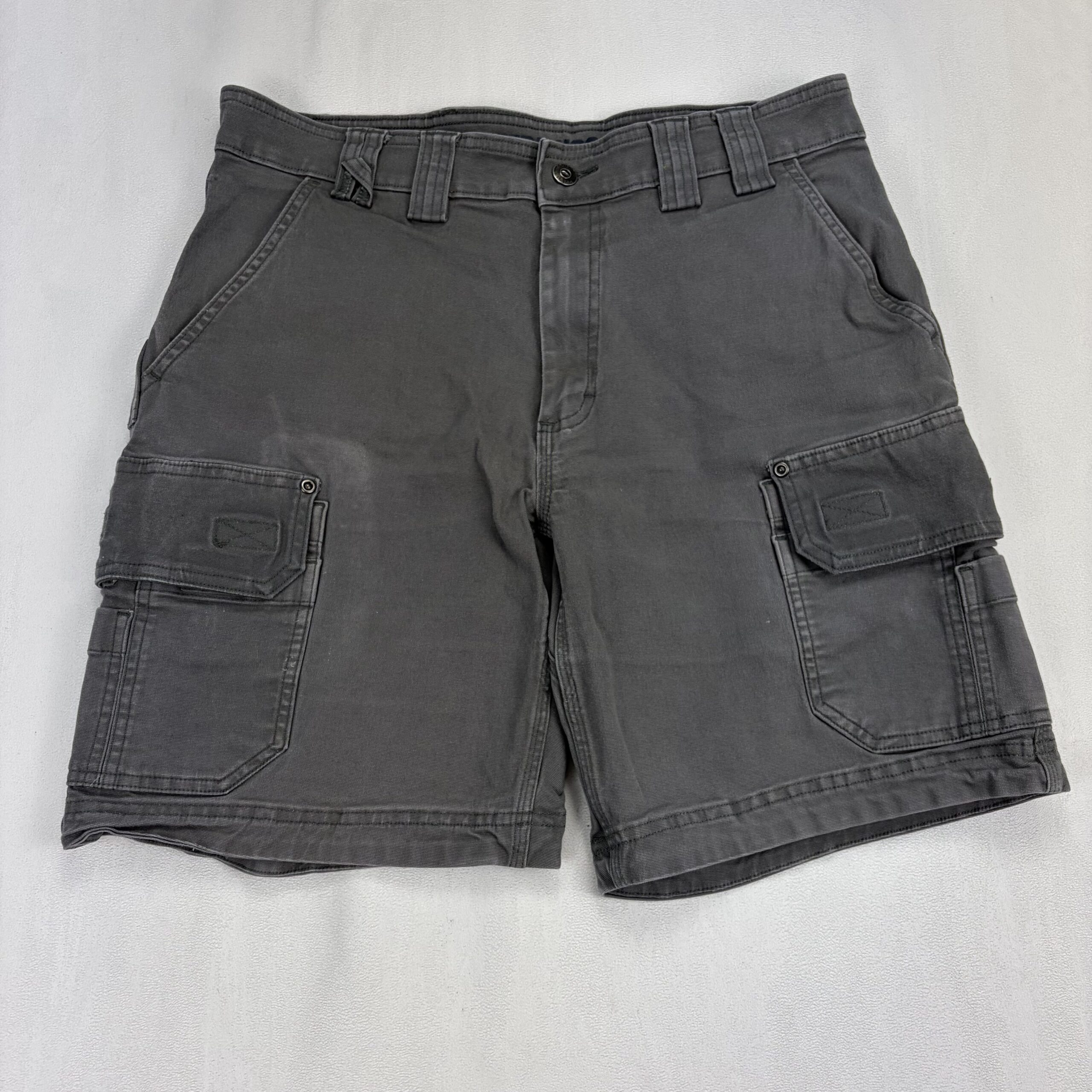 Duluth Trading Co men’s cargo shorts in size 34. Charcoal gray, classic workwear style with multiple utility pockets — hand pockets and snap-flap cargo pockets with additional smaller compartments for tools or phone. Sturdy belt loops and button-front with zip fly. Overall good used condition with normal light wear. Please note there is a small stain on the front (see photos) — no major rips, tears, or other significant flaws.