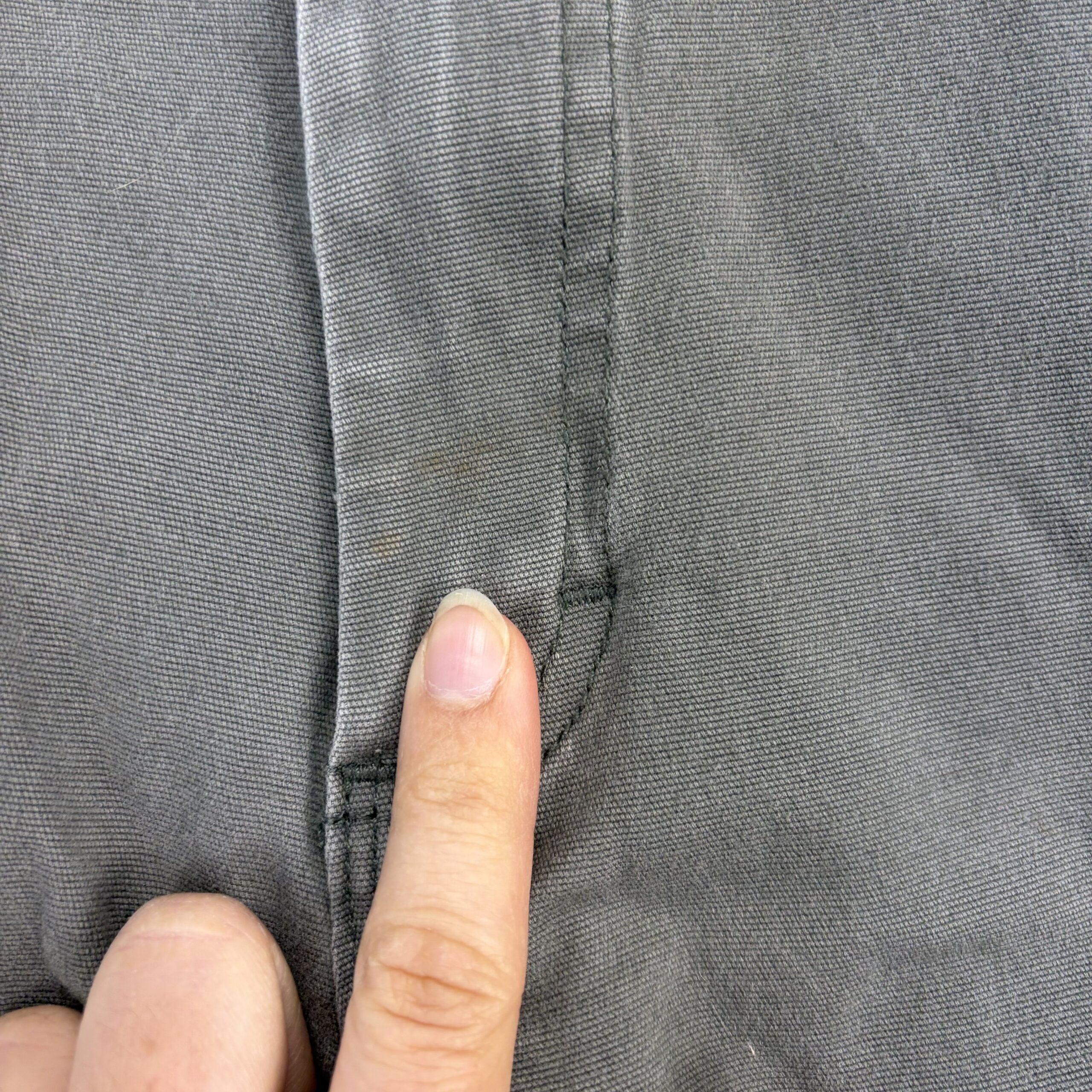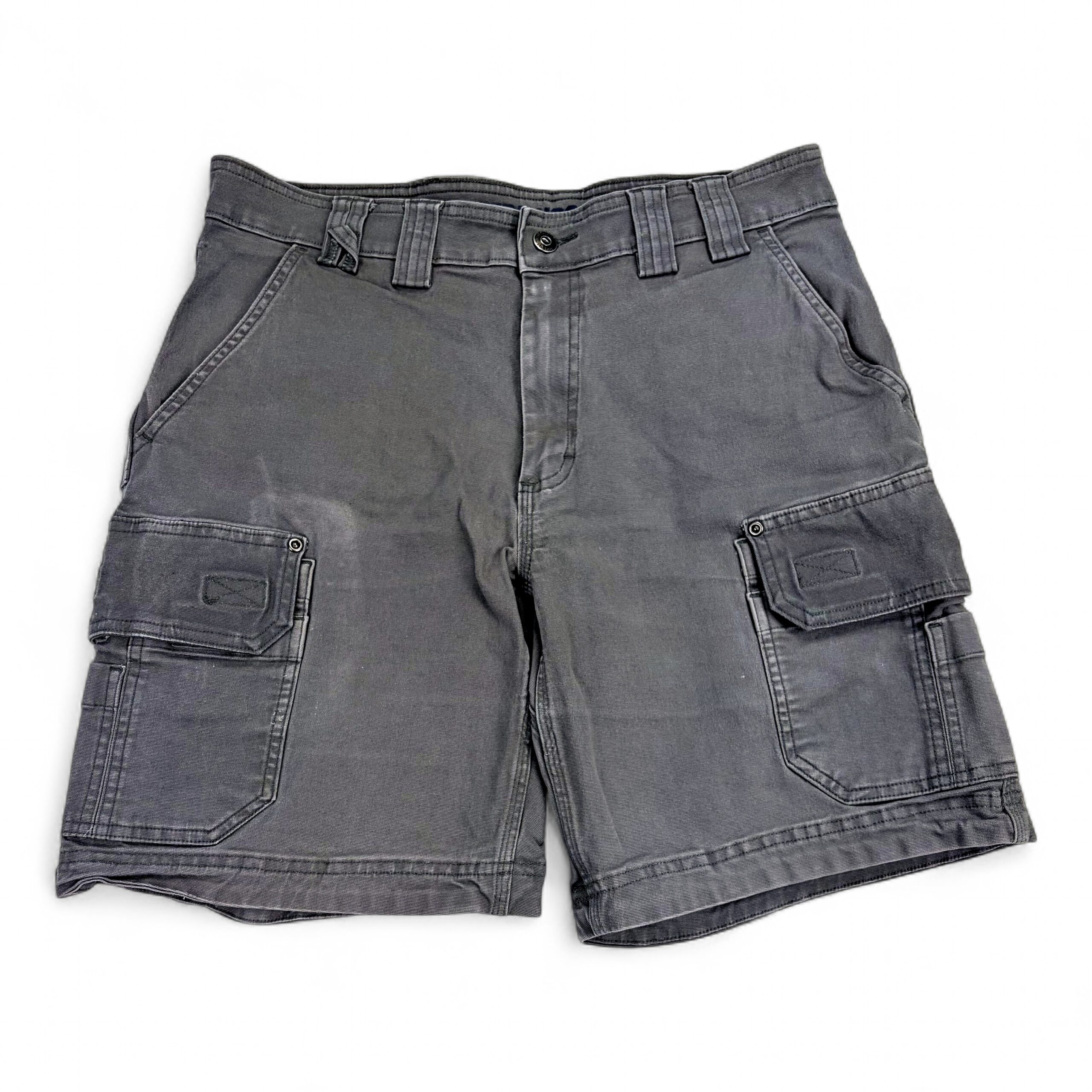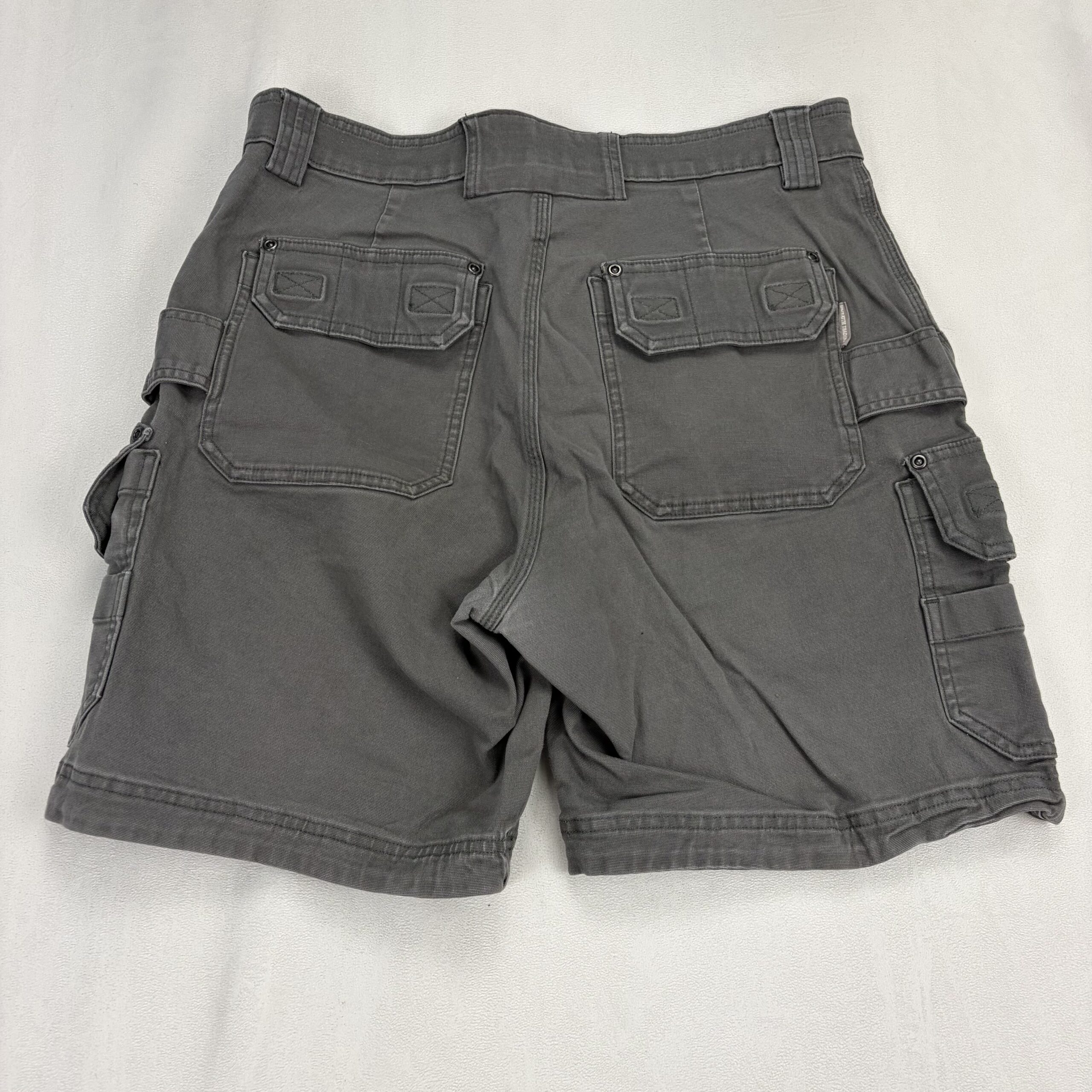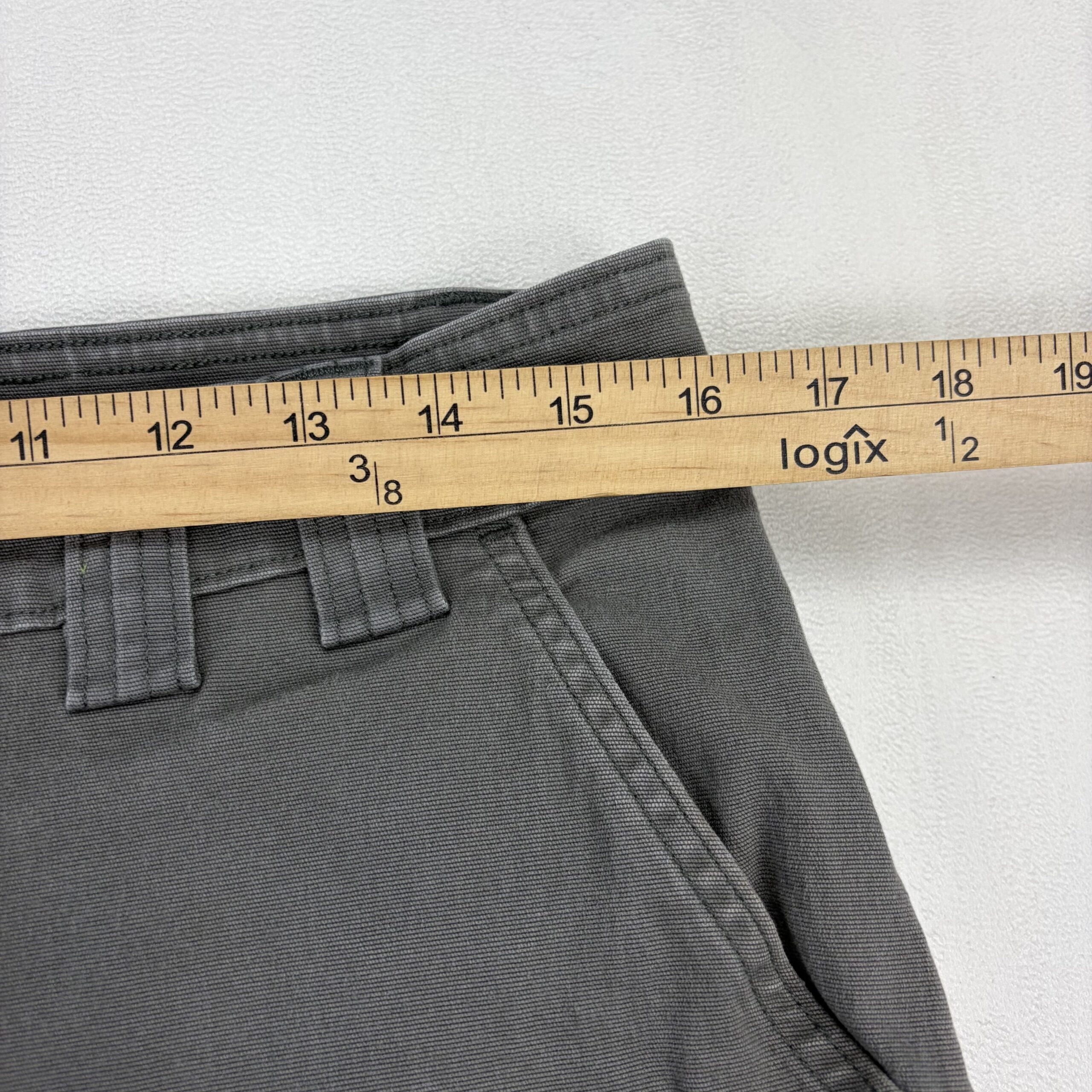 Duluth Trading Co men’s cargo shorts in size 34. Charcoal gray, classic workwear style with multiple utility pockets — hand pockets and snap-flap cargo pockets with additional smaller compartments for tools or phone. Sturdy belt loops and button-front with zip fly. Overall good used condition with normal light wear. Please note there is a small stain on the front (see photos) — no major rips, tears, or other significant flaws.