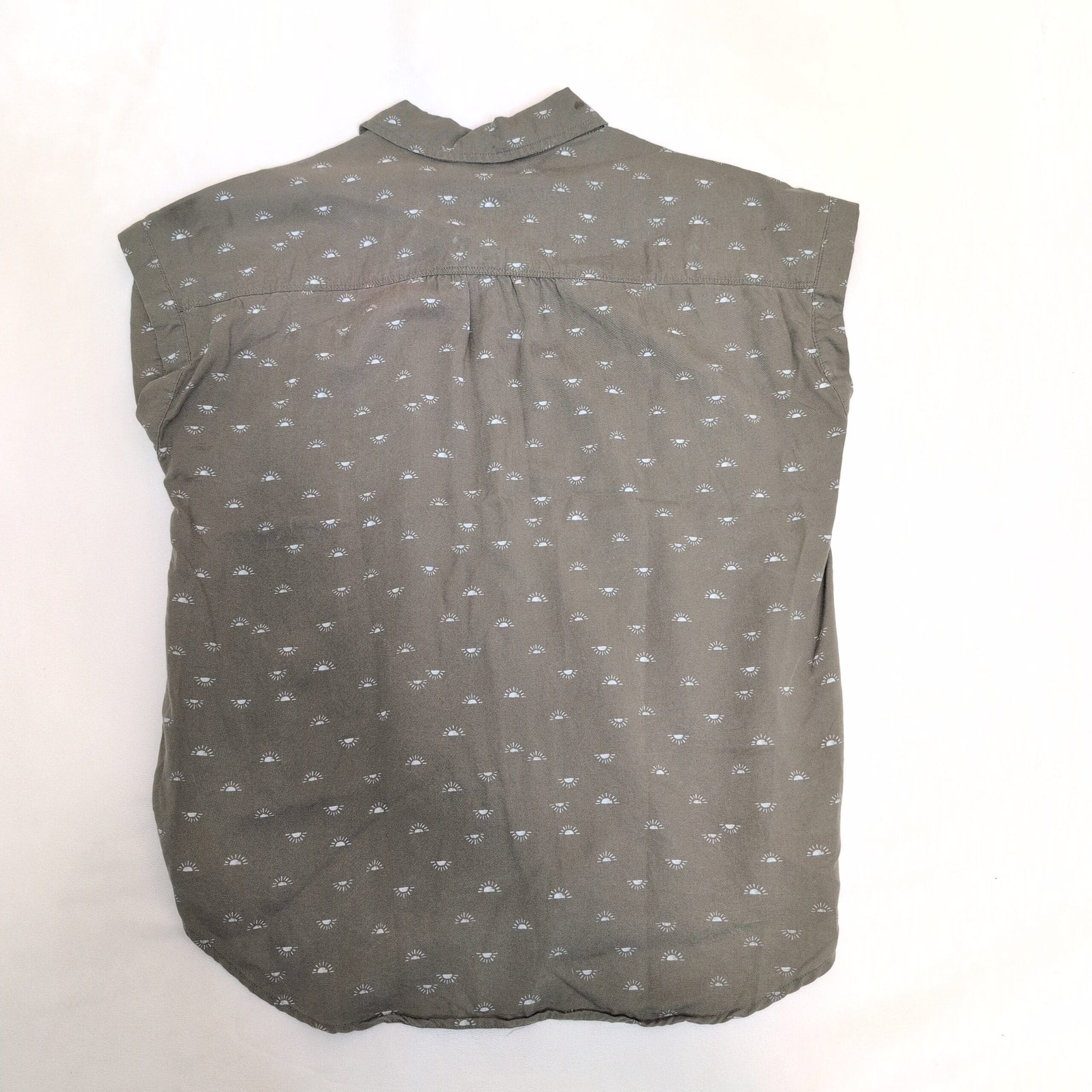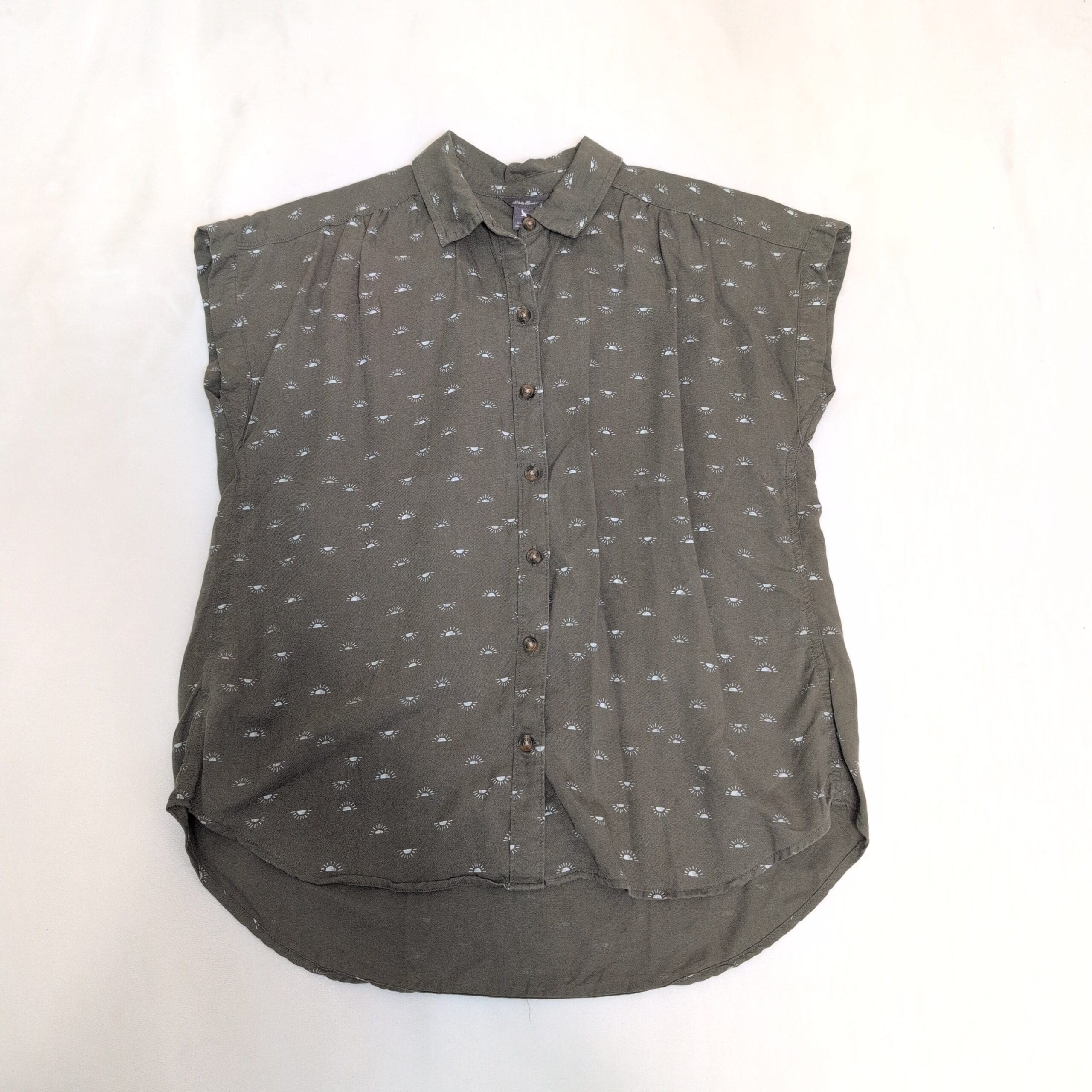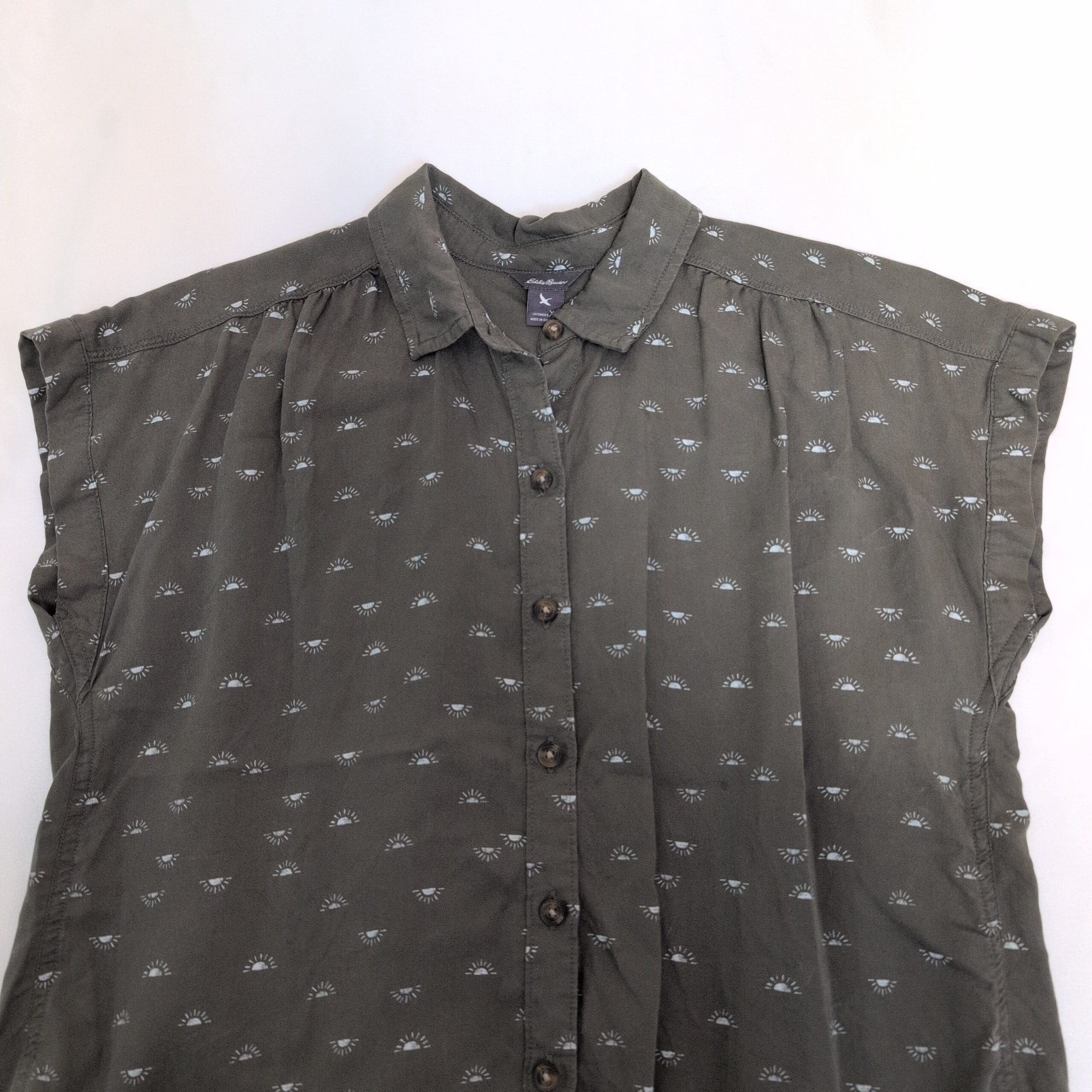 Eddie Bauer women’s button-down blouse in size XS. Olive-green base with a small light-blue sunburst-style print. Features a pointed collar, full button front, cap sleeves, relaxed fit and a curved high-low hem — an easy layering piece for everyday wear or travel.