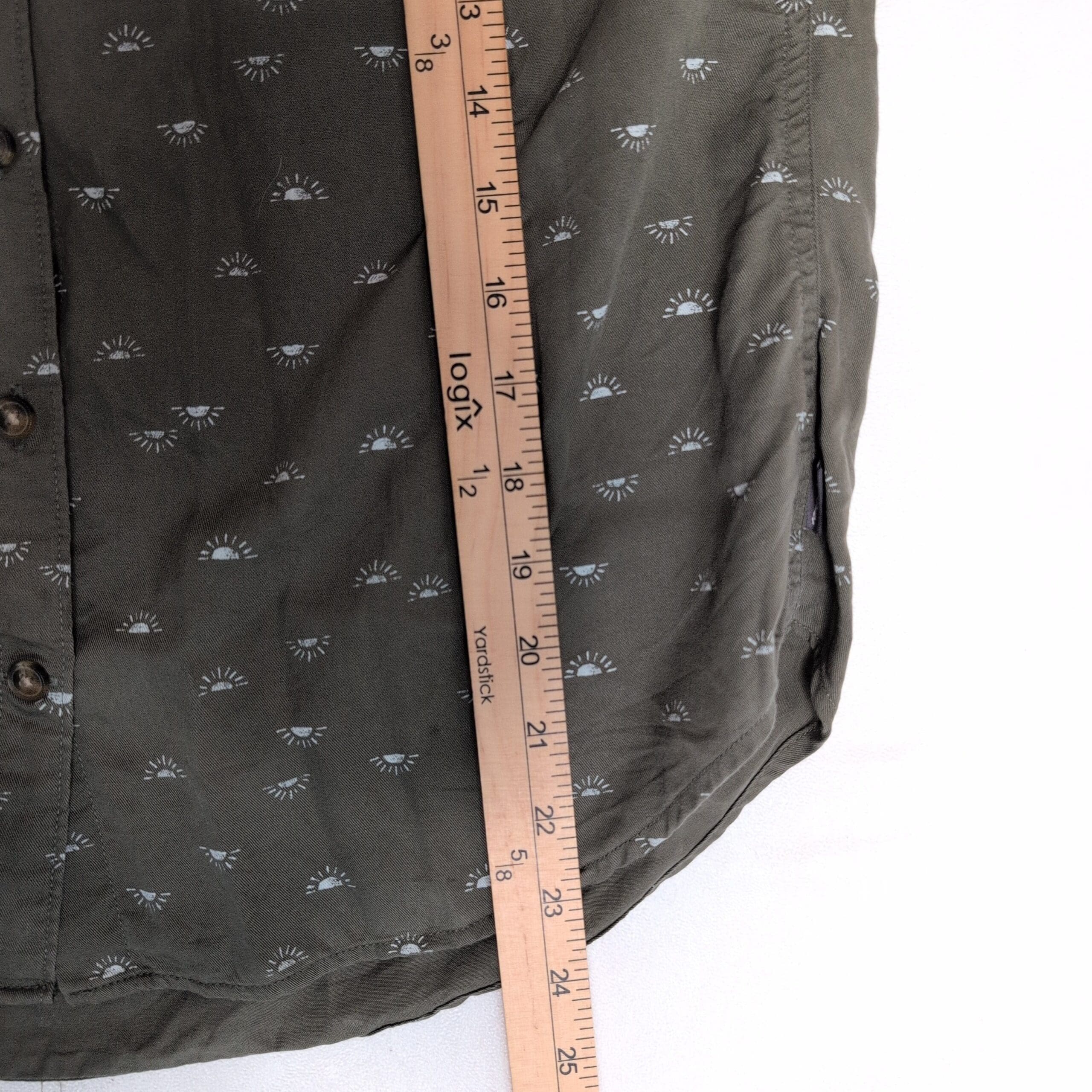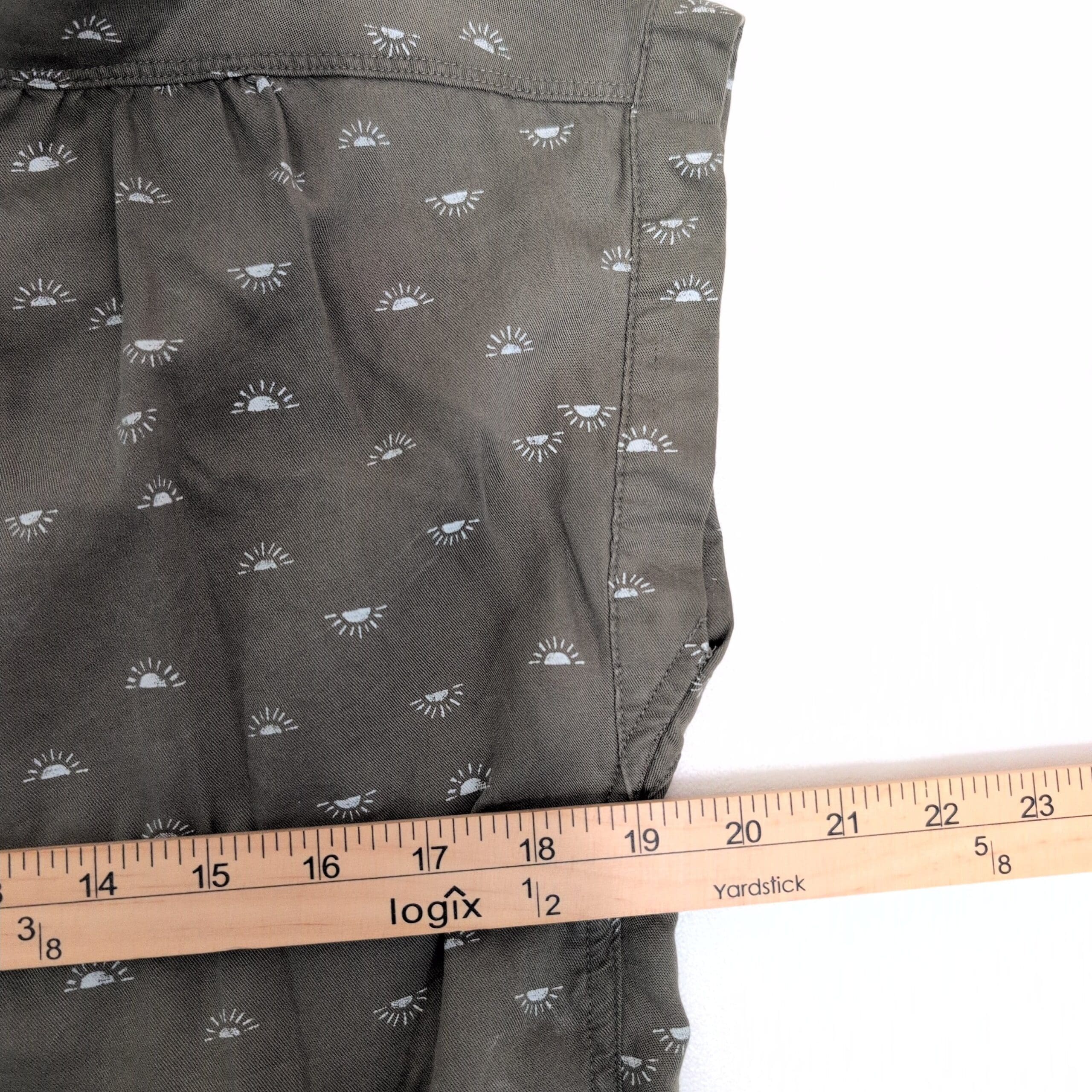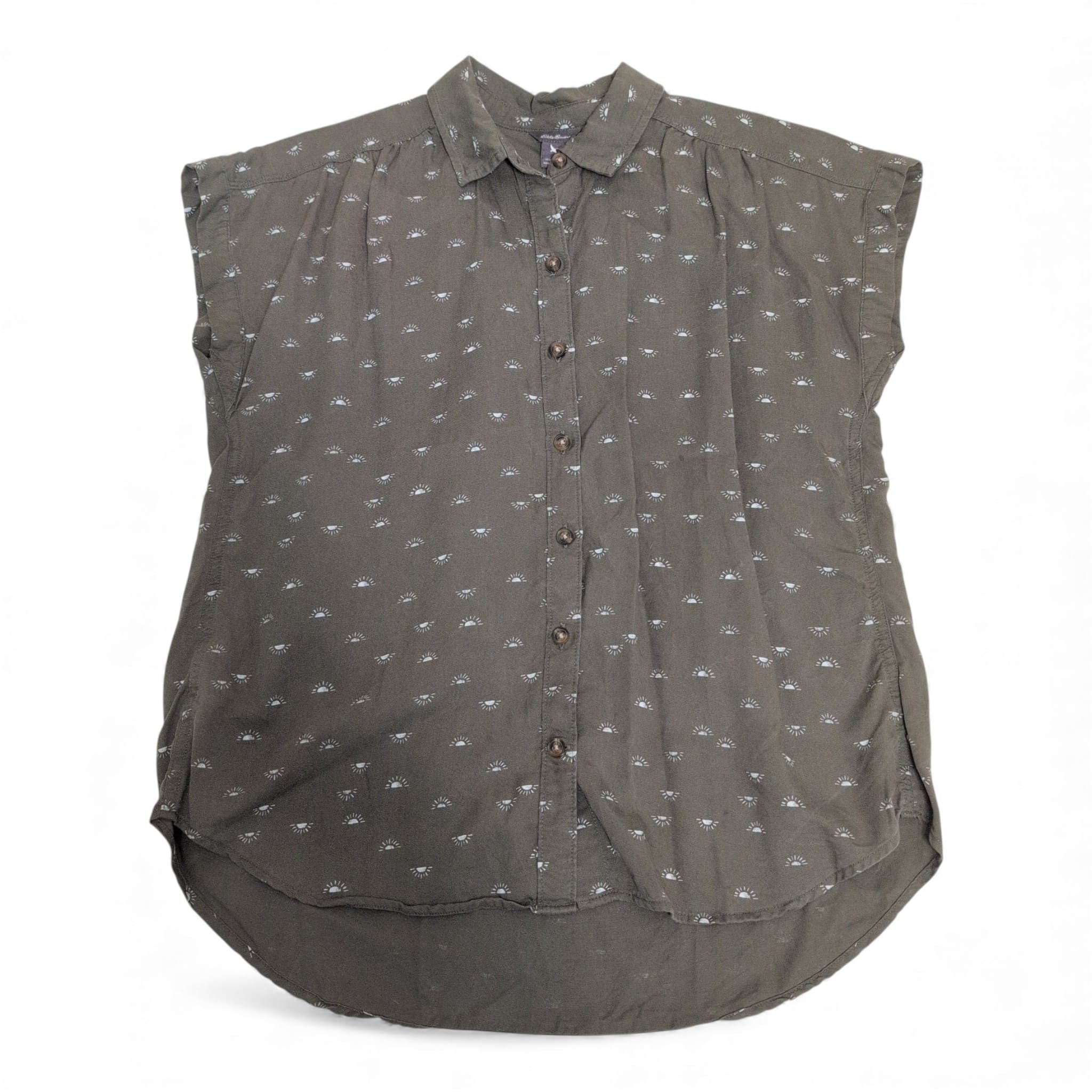 Eddie Bauer women’s button-down blouse in size XS. Olive-green base with a small light-blue sunburst-style print. Features a pointed collar, full button front, cap sleeves, relaxed fit and a curved high-low hem — an easy layering piece for everyday wear or travel.