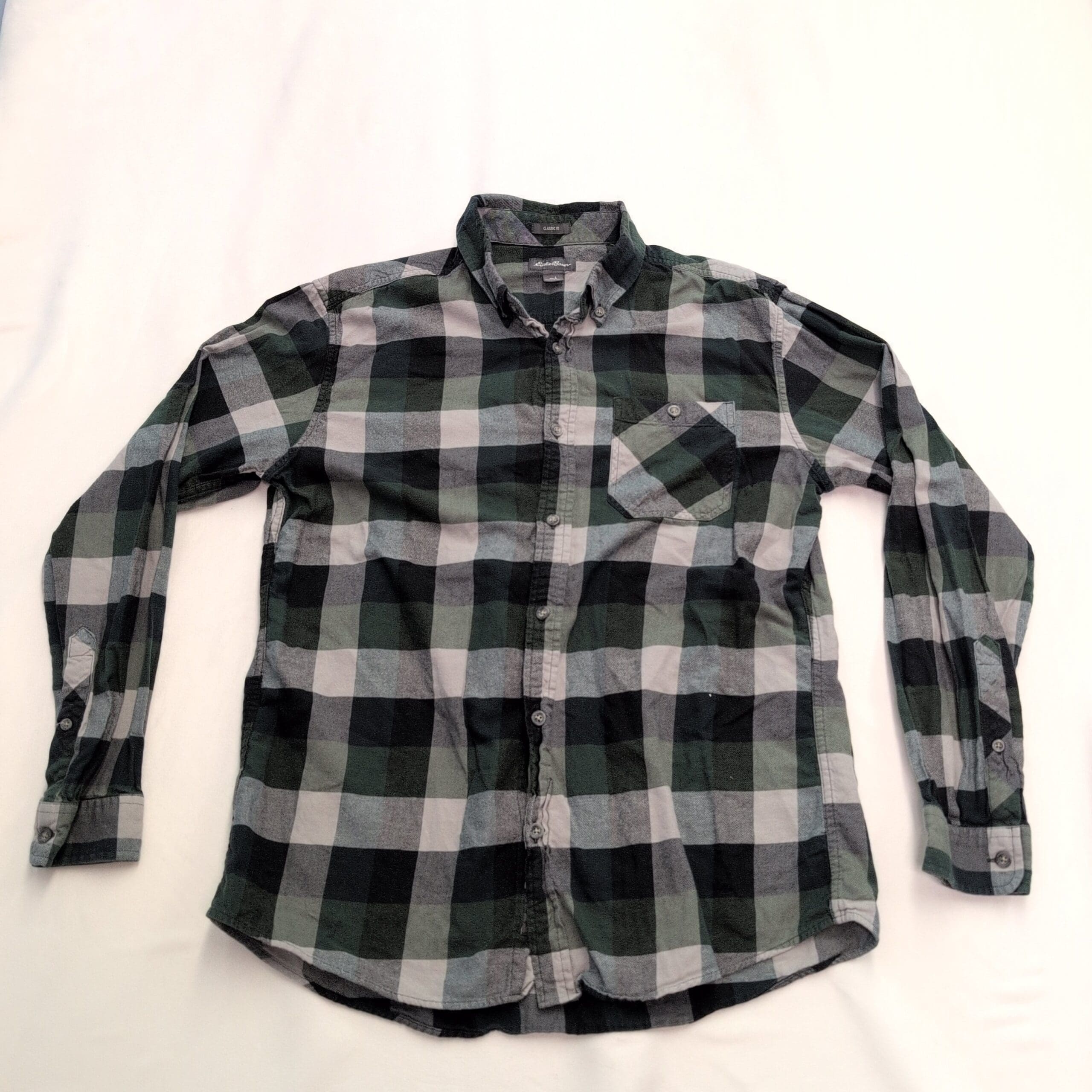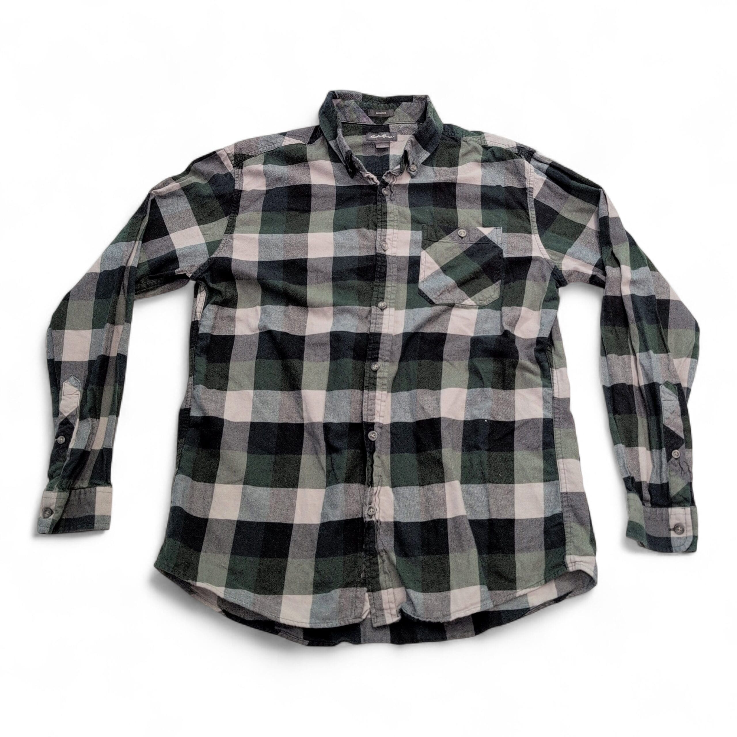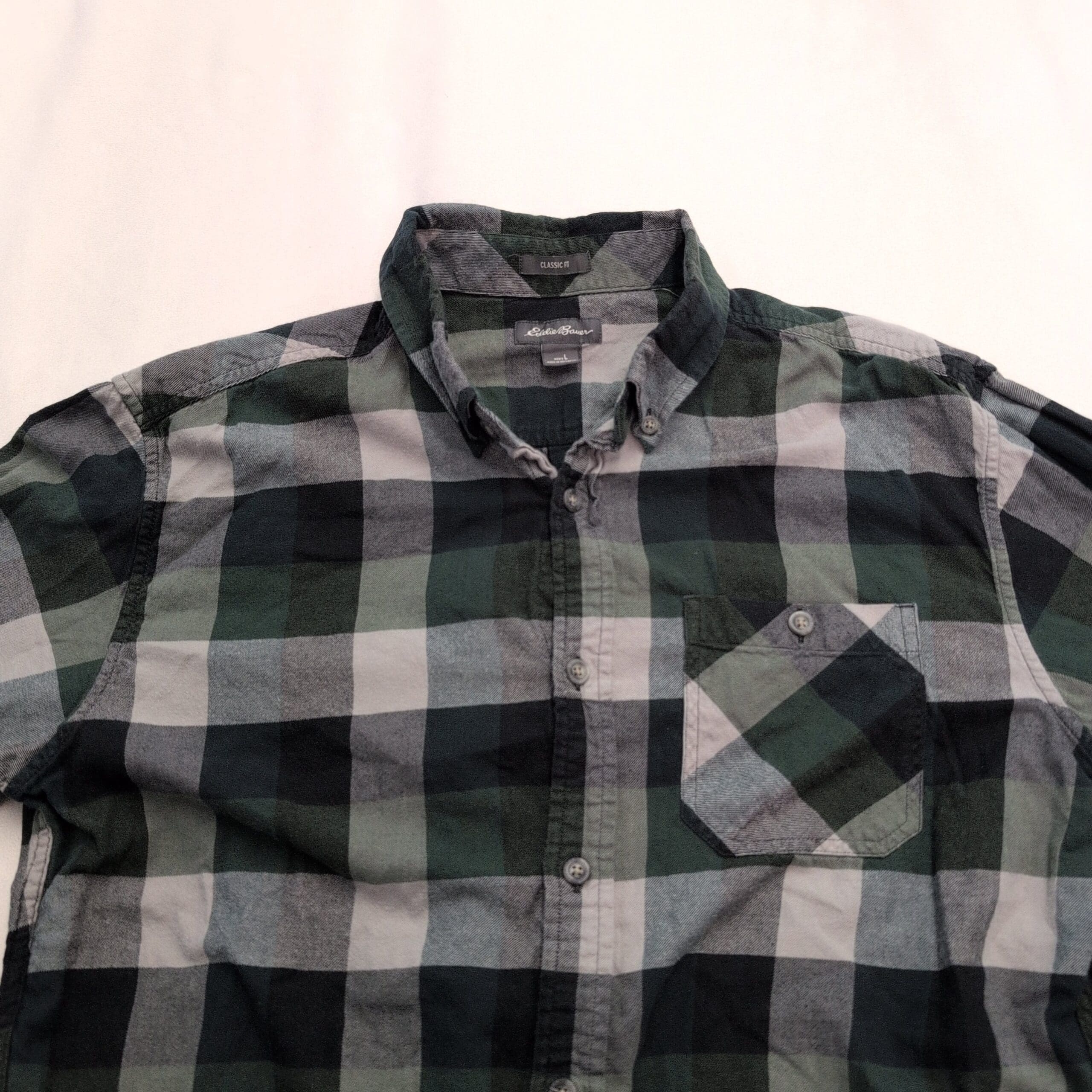 Eddie Bauer men’s long-sleeve casual button-down in green, black, and gray plaid. Size L (men). Features a single chest pocket, button-down collar, full button front, and a curved hem — great for layering or everyday wear.