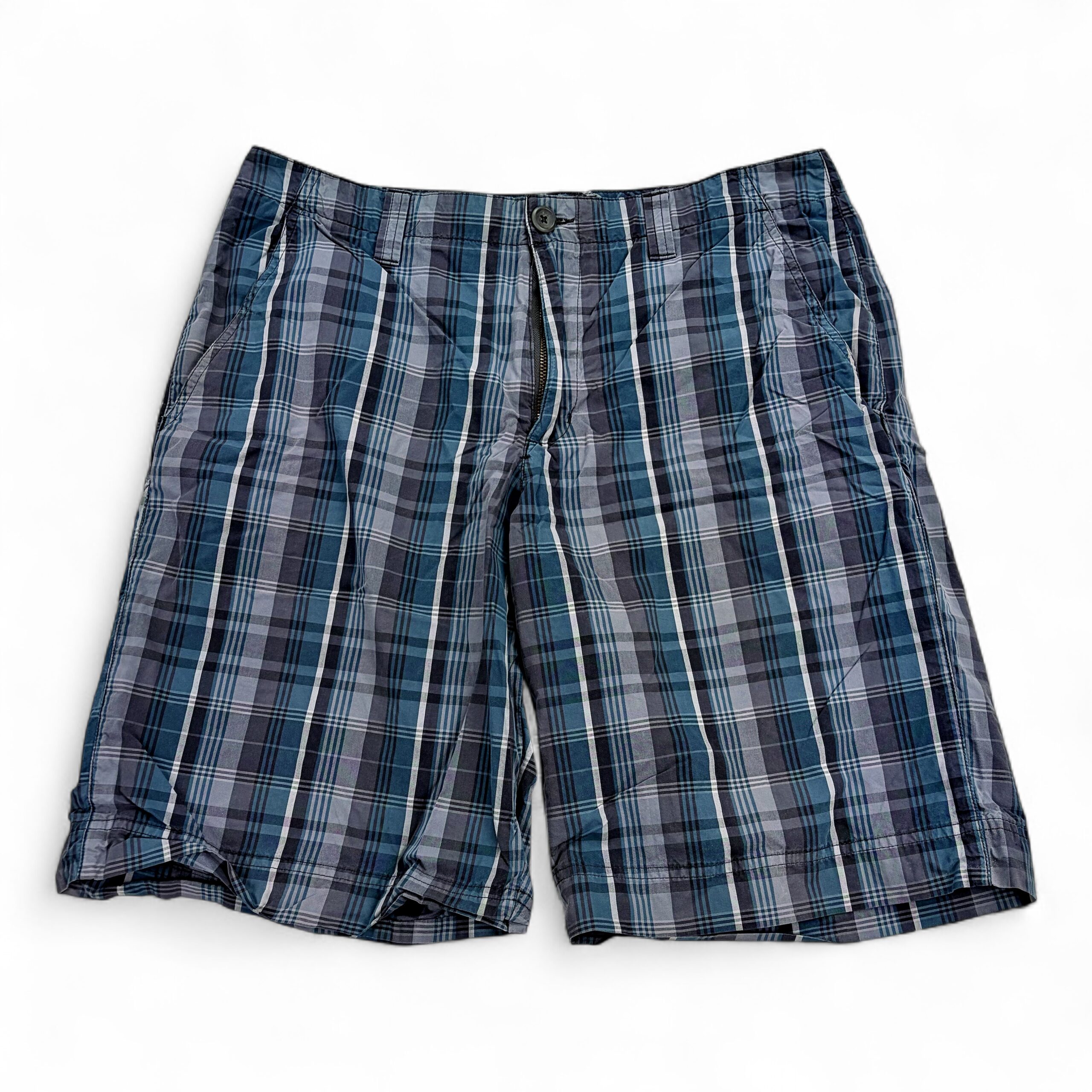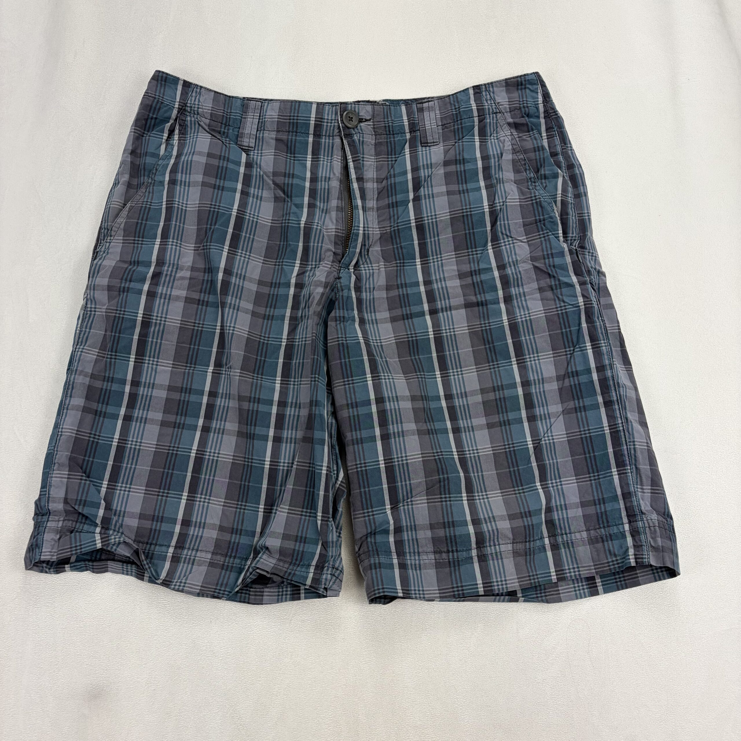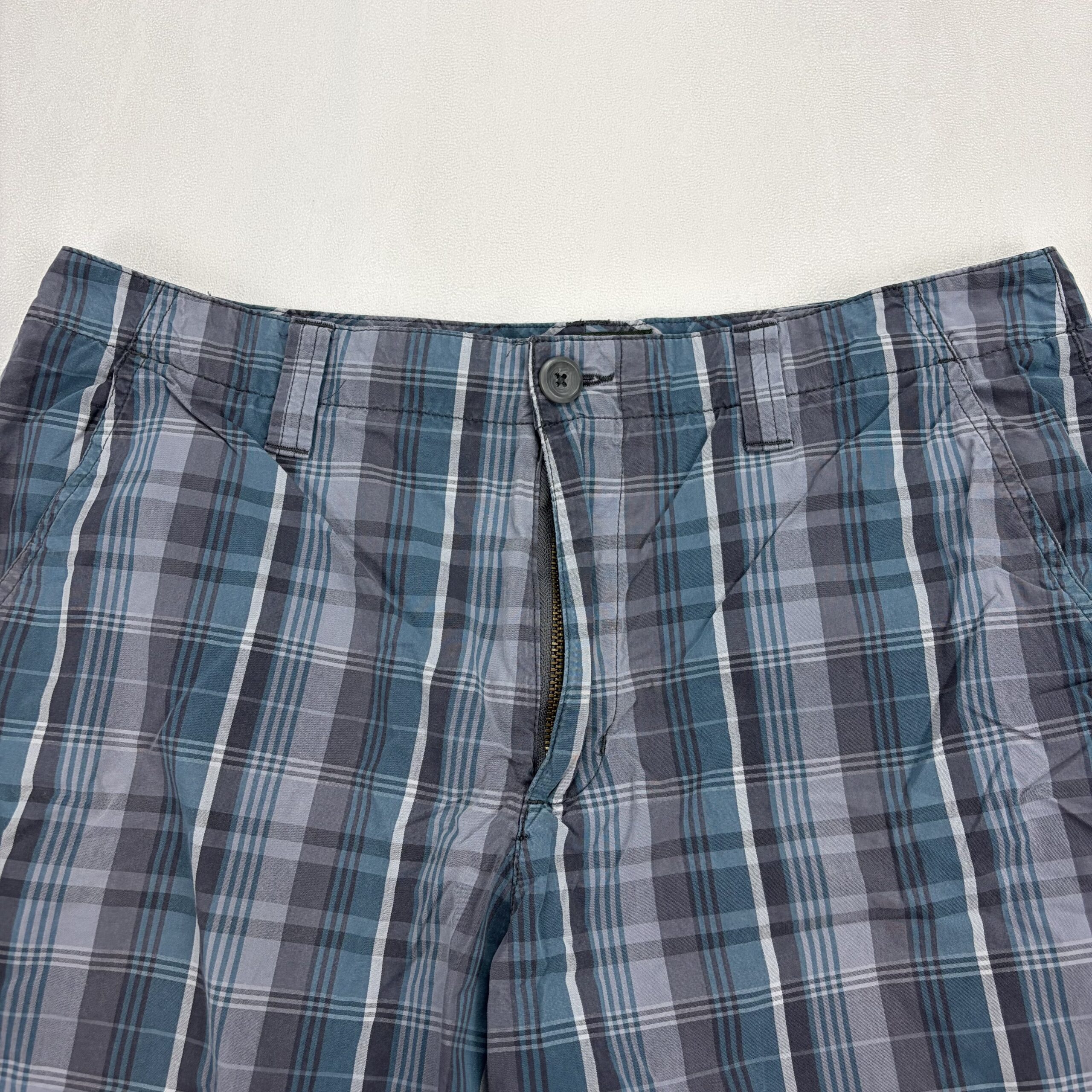 Eddie Bauer women’s mid-length plaid shorts in size 33 (Plus). Lightweight woven fabric in blue and gray plaid with a classic casual cut. Features a zipper fly with button closure, belt loops, and two front hand pockets for everyday convenience. Knee-length silhouette perfect for warm-weather errands, travel, or weekend wear.