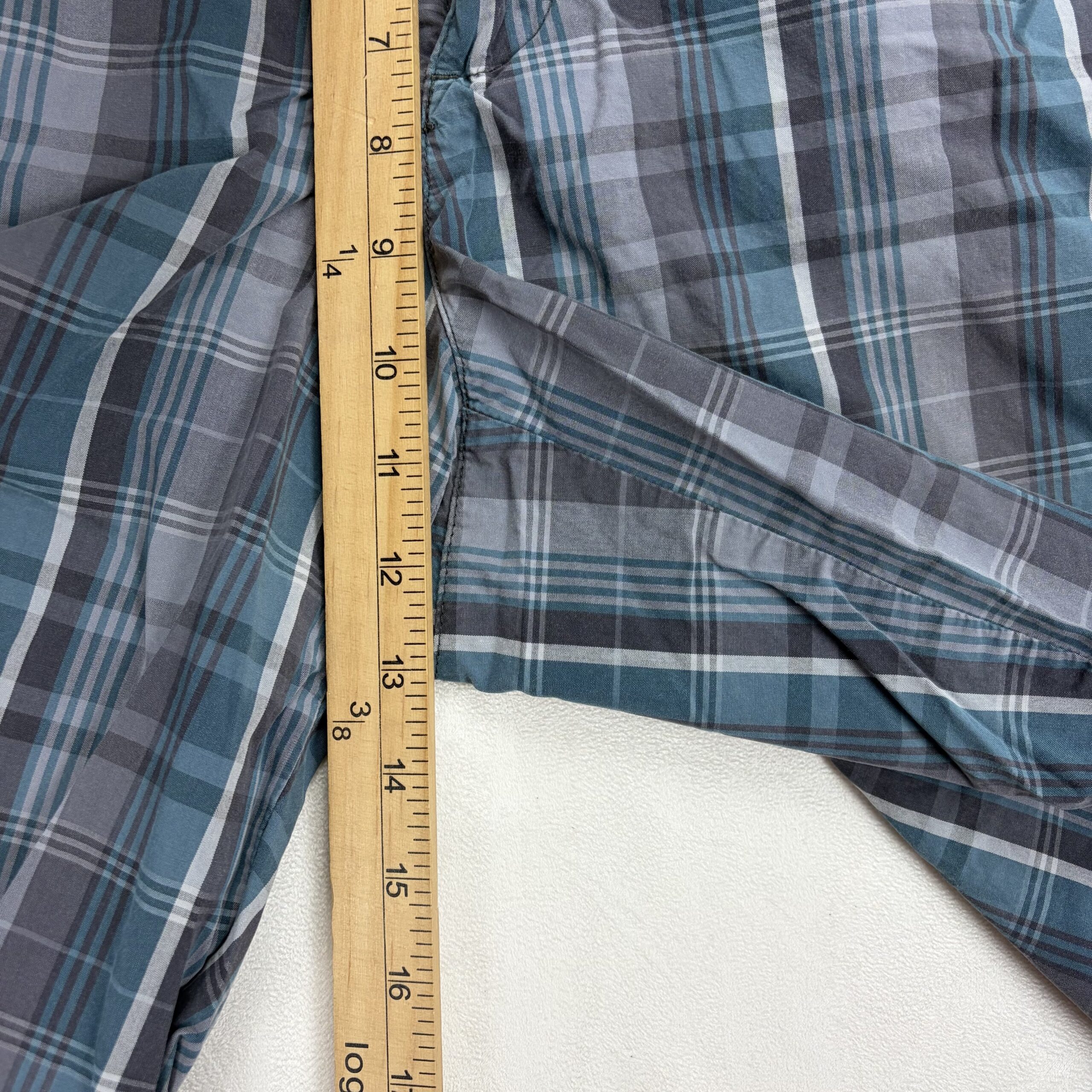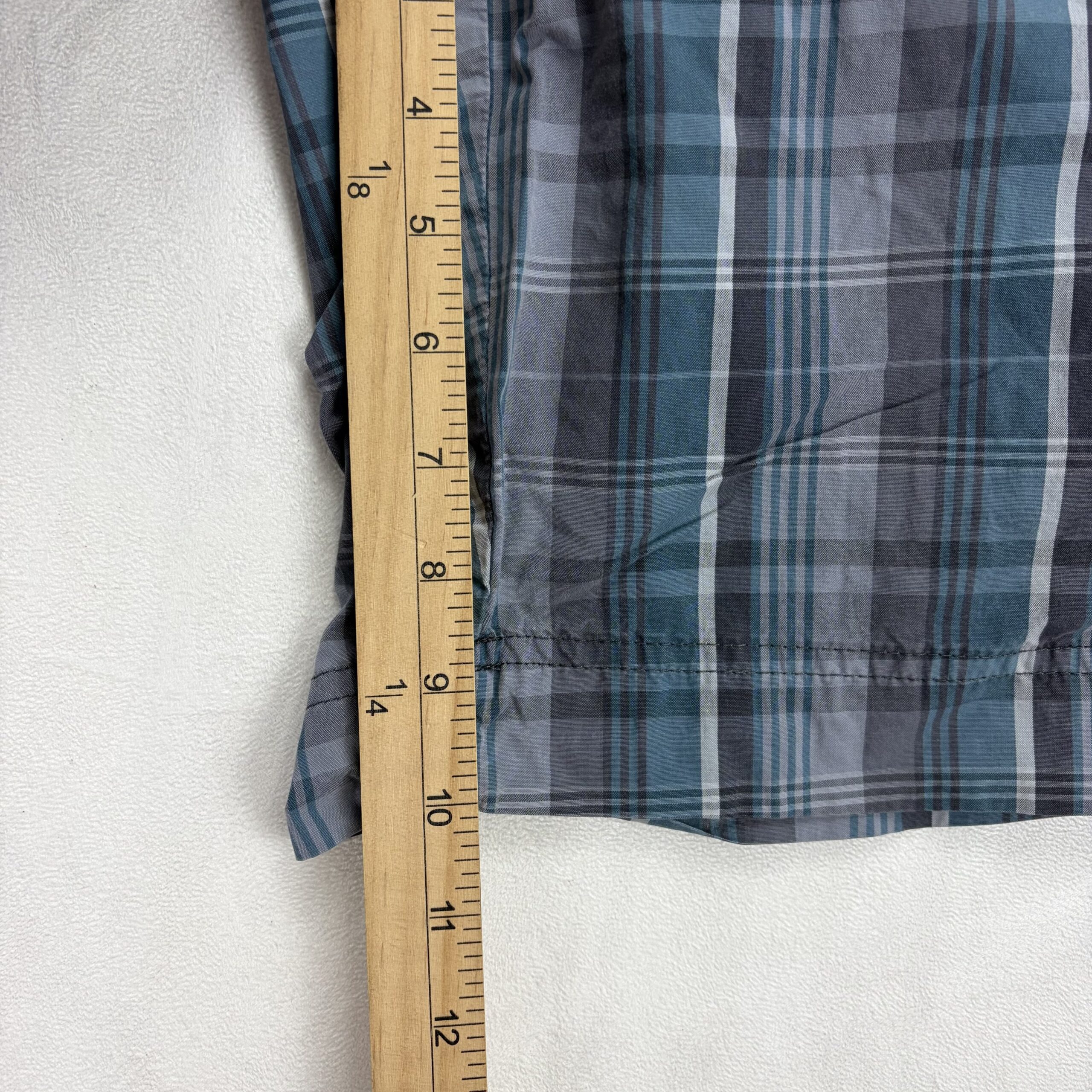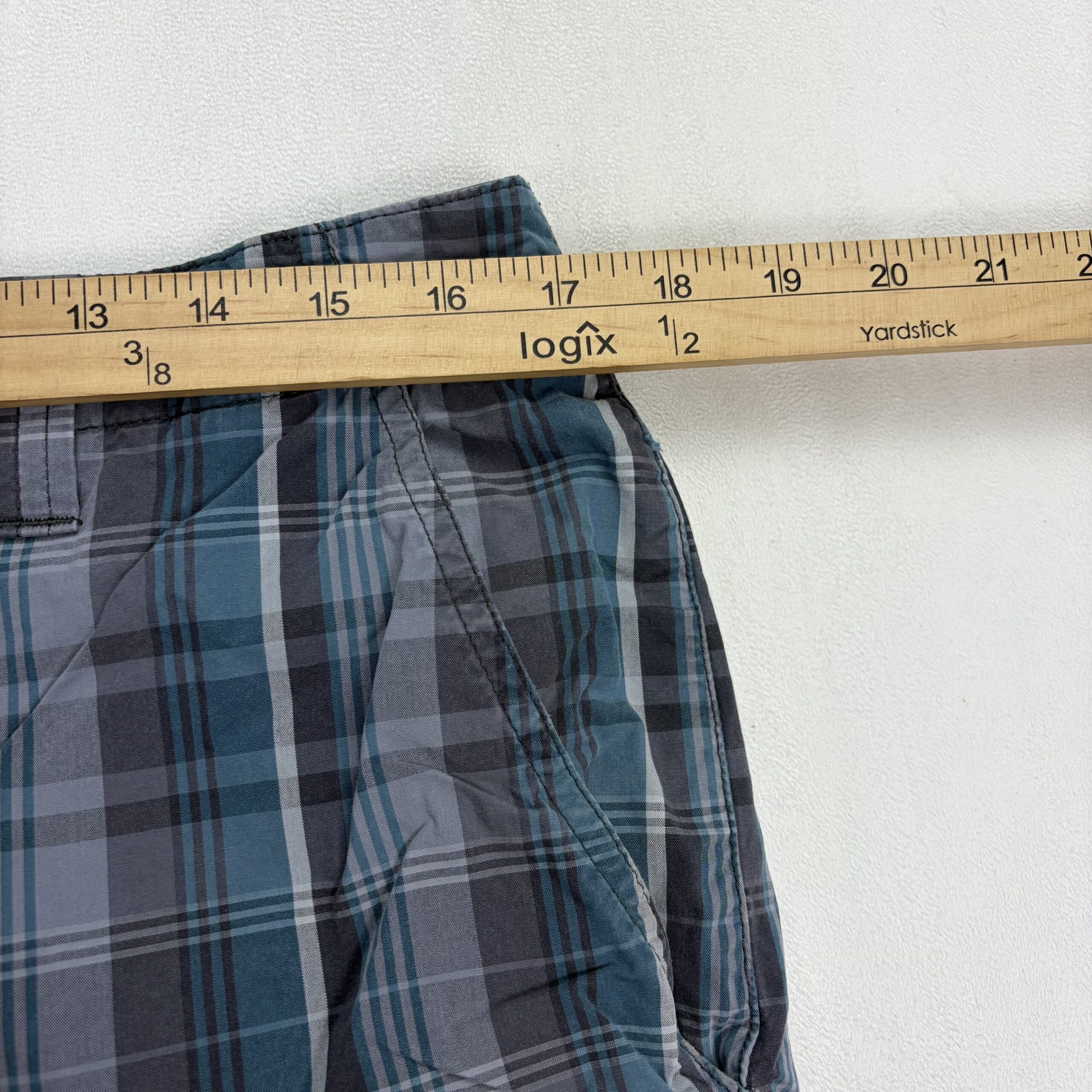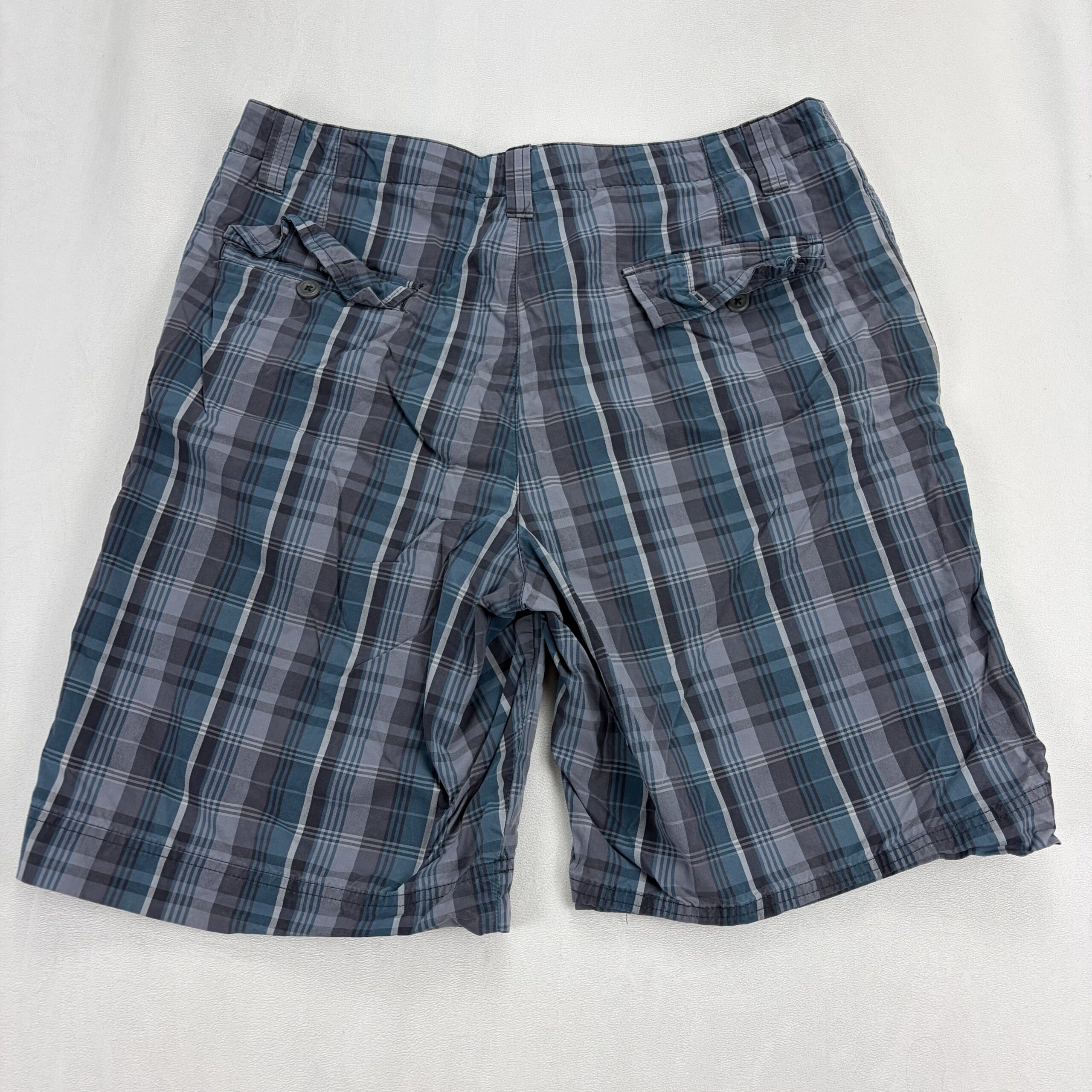 Eddie Bauer women’s mid-length plaid shorts in size 33 (Plus). Lightweight woven fabric in blue and gray plaid with a classic casual cut. Features a zipper fly with button closure, belt loops, and two front hand pockets for everyday convenience. Knee-length silhouette perfect for warm-weather errands, travel, or weekend wear.