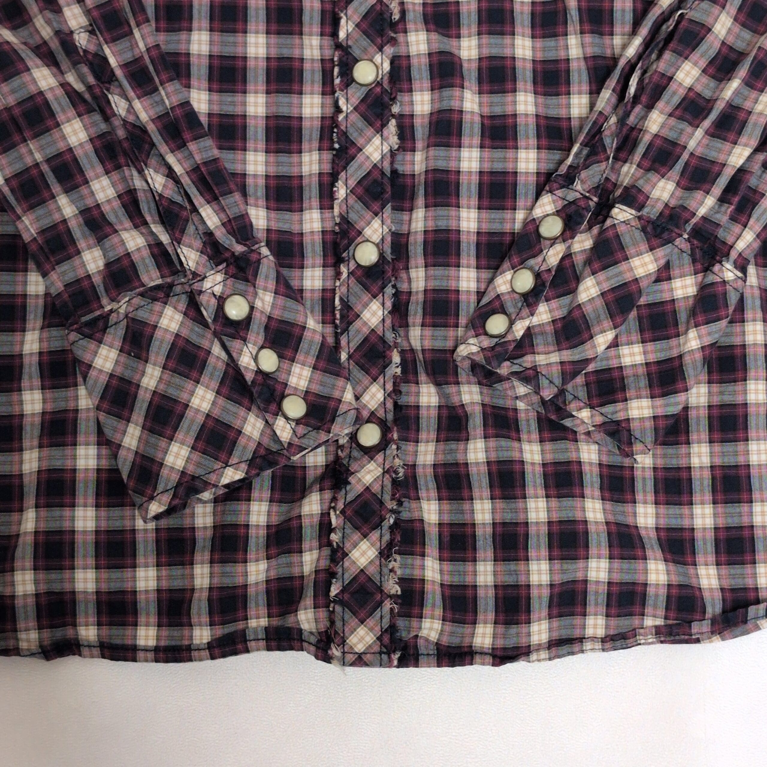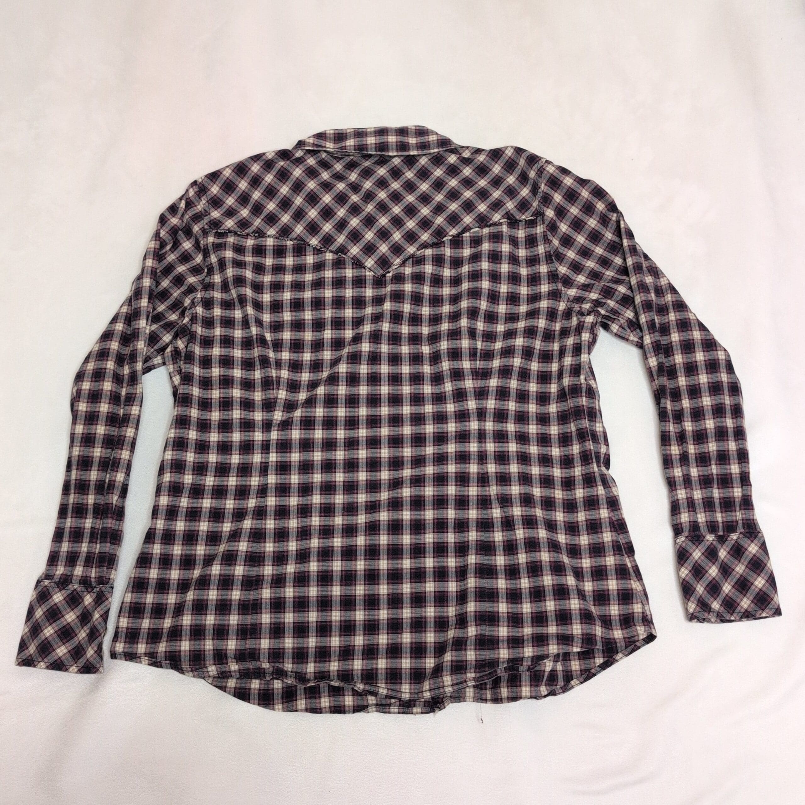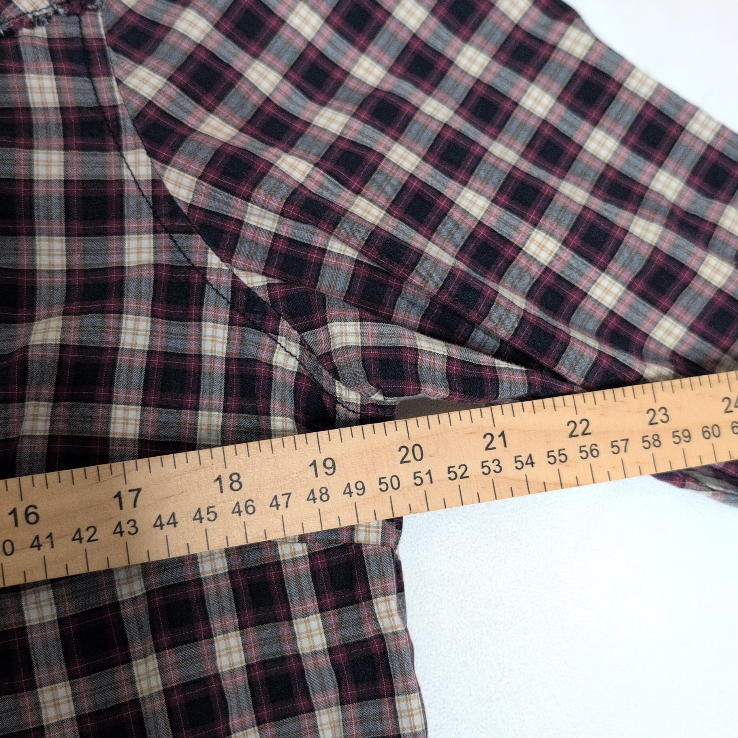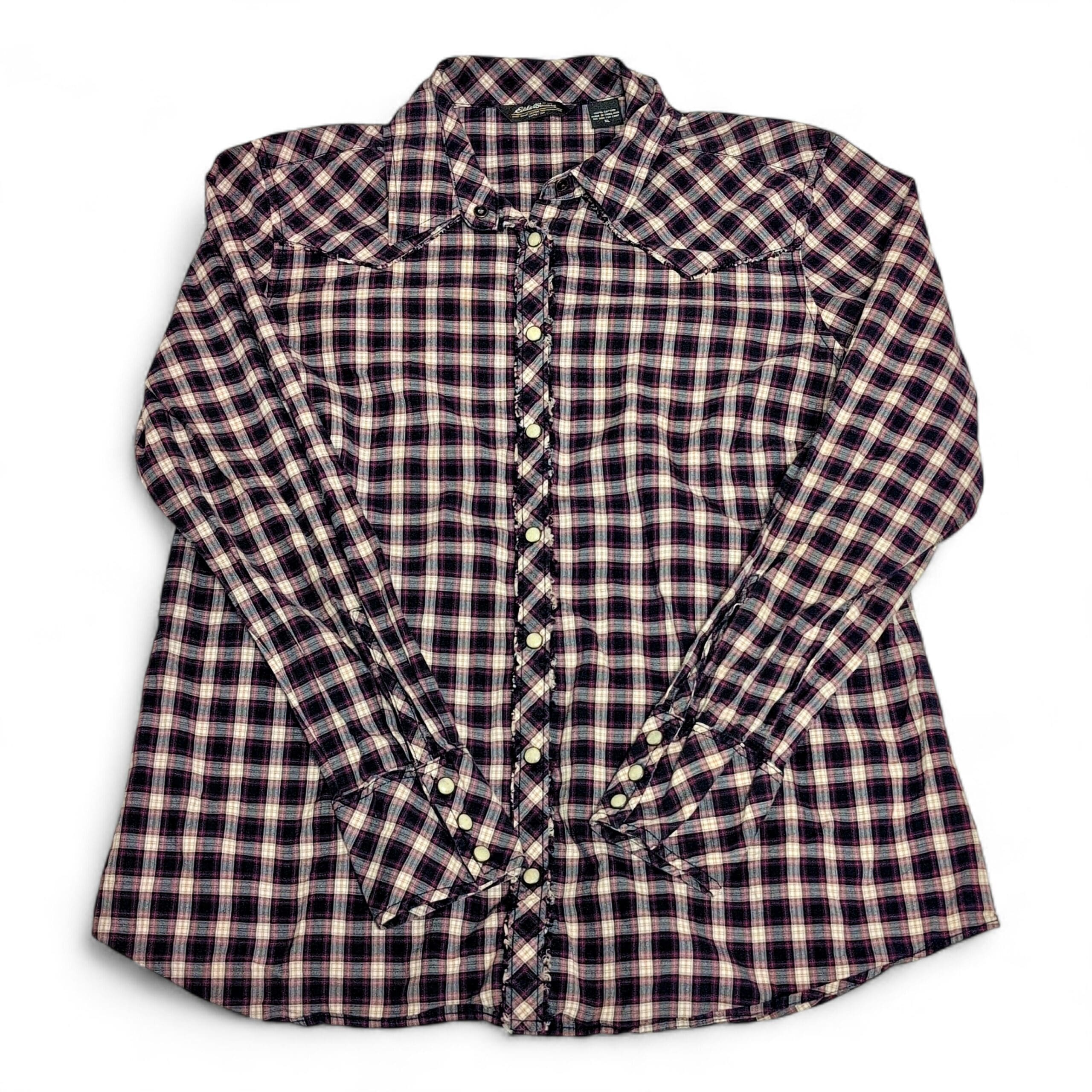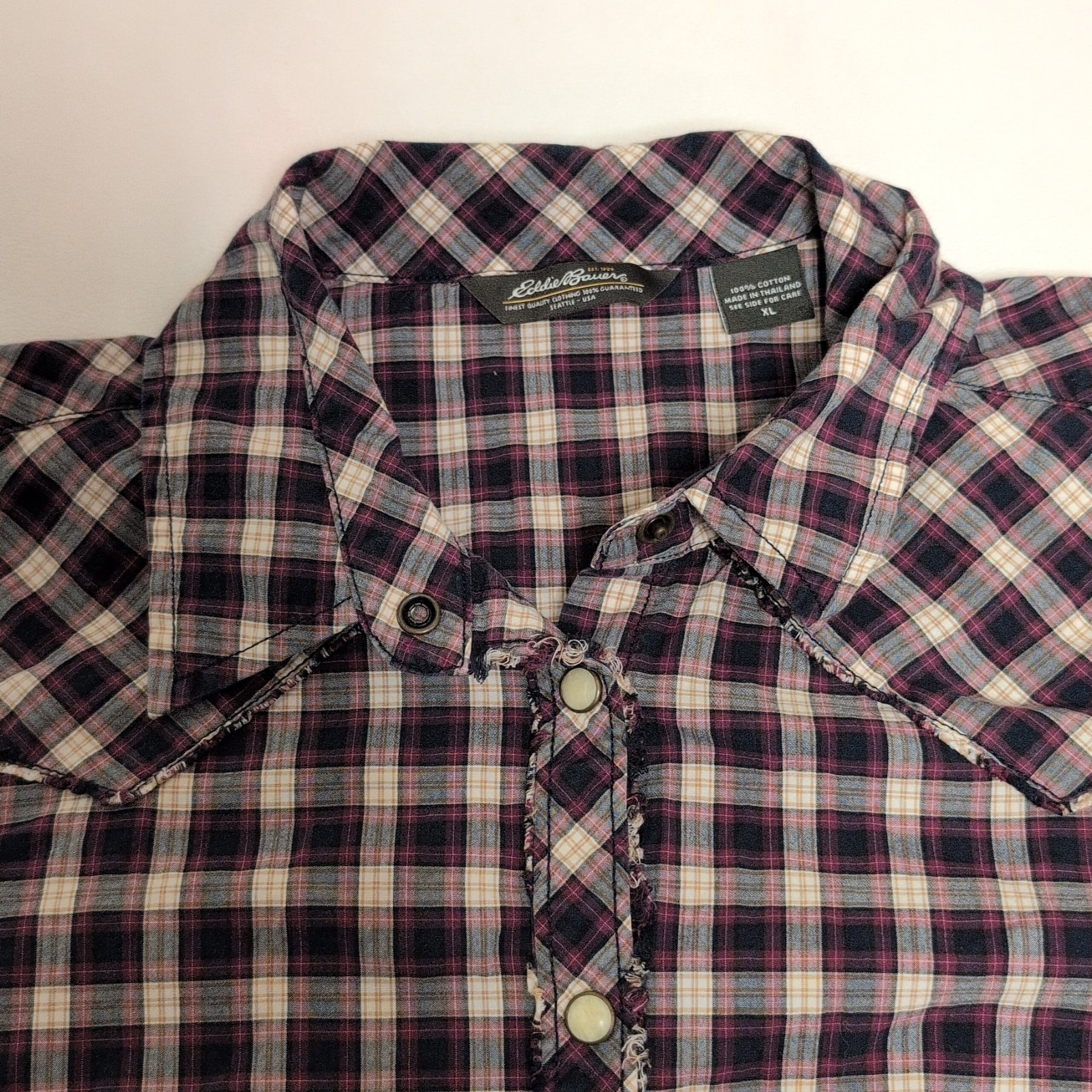 Eddie Bauer women’s long-sleeve purple plaid button-down shirt in size XL. Features a classic collared silhouette with western-style yoke and full button front. Soft woven fabric with button cuffs — versatile for layering or everyday wear. Good used condition with no flaws; typical gentle wear may be present.
