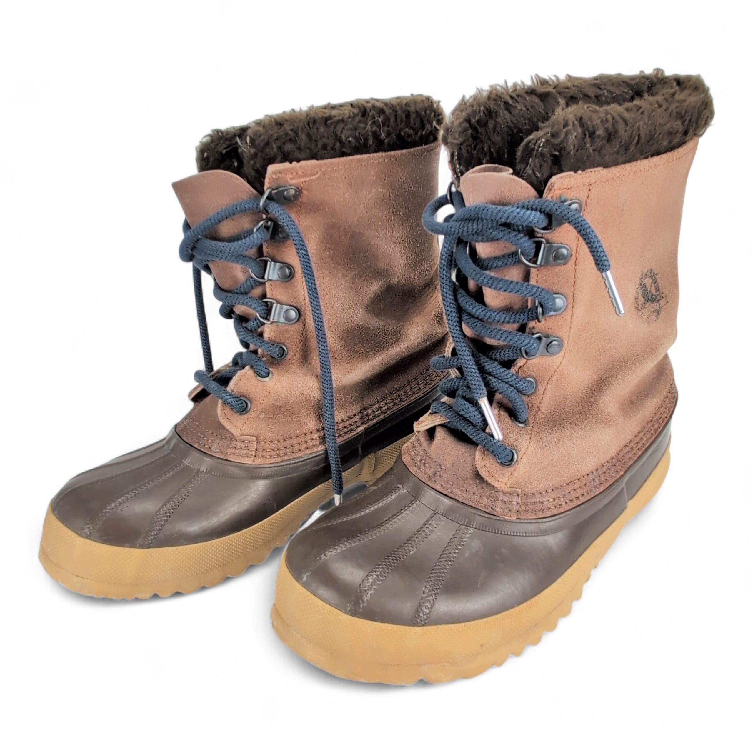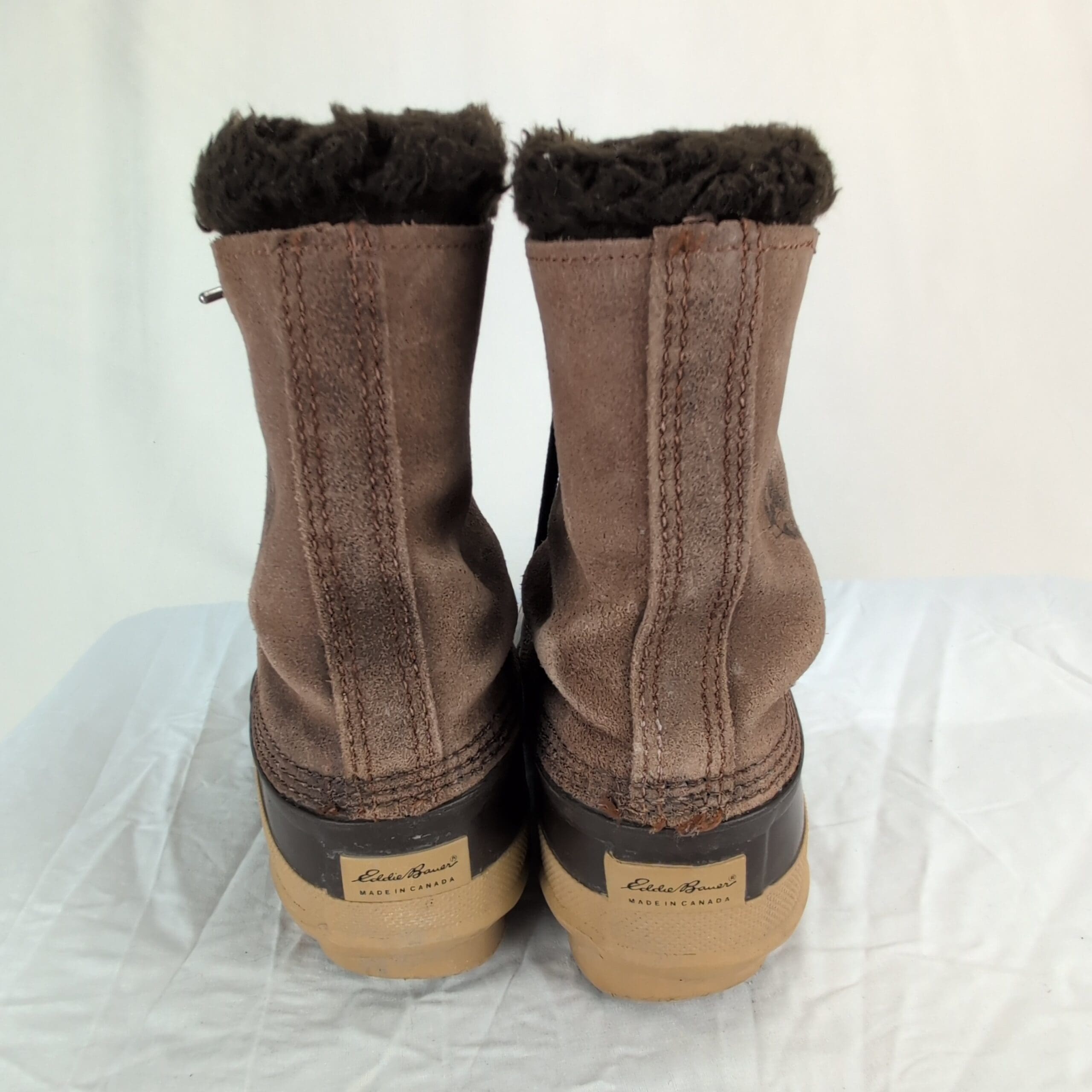 Eddie Bauer women’s winter & rain duck boots, size 8. Brown suede upper with waterproof rubber lower, faux-fur lining for added warmth, lace-up front with metal hooks and durable lugged rubber sole for traction in cold, wet conditions.