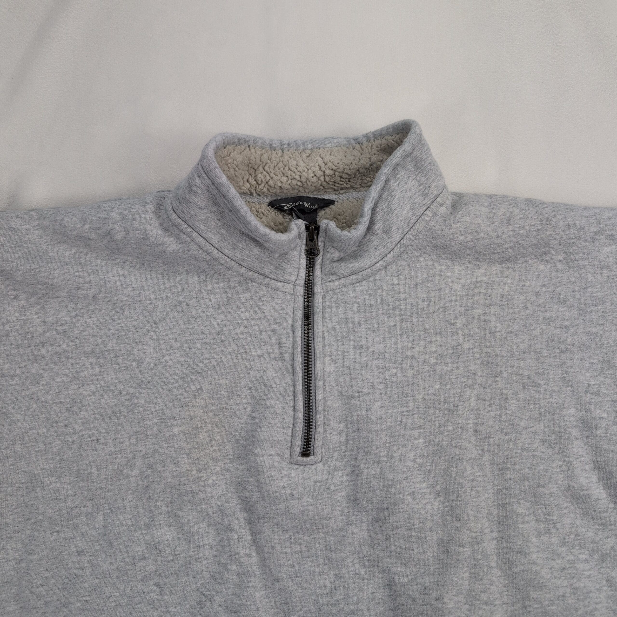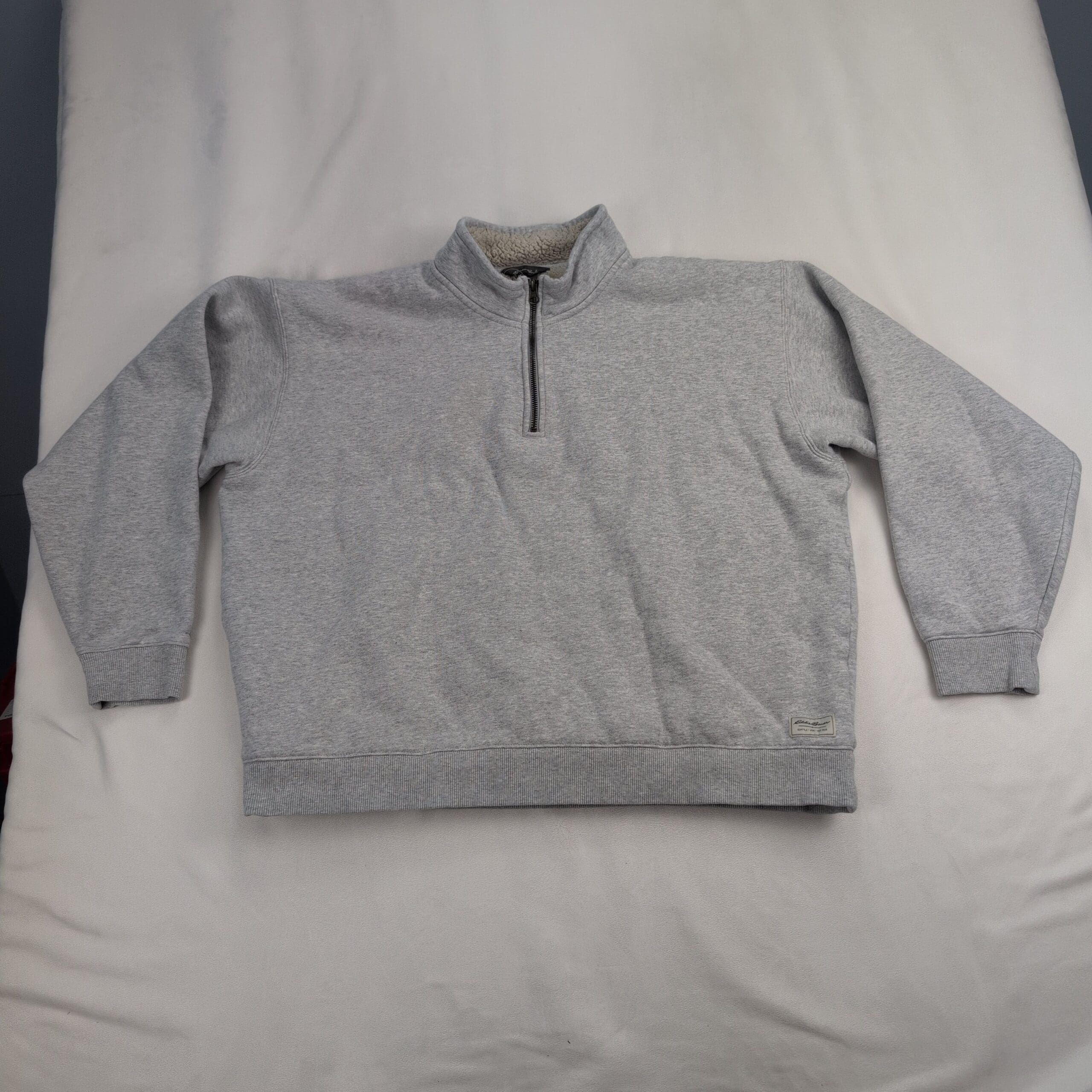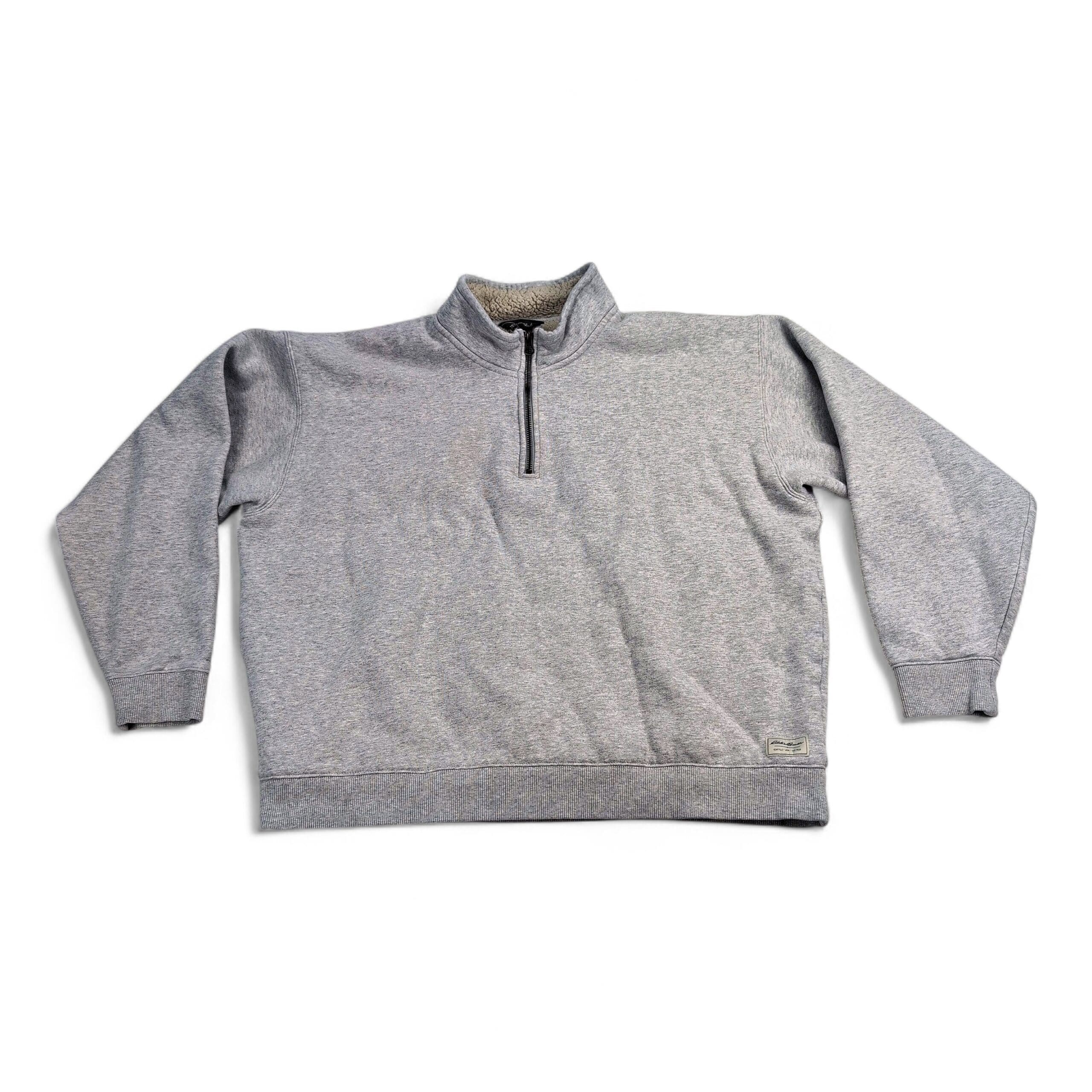 Eddie Bauer women’s quarter-zip pullover in size XL. Light heather gray sweatshirt with cozy faux sherpa fleece lining through the body and collar. Features a stand collar with metal zipper, ribbed cuffs and hem, and a small Eddie Bauer patch at the lower hem. Excellent used condition — free of major rips, tears, stains, or flaws. Typical light wear may be present from normal use.