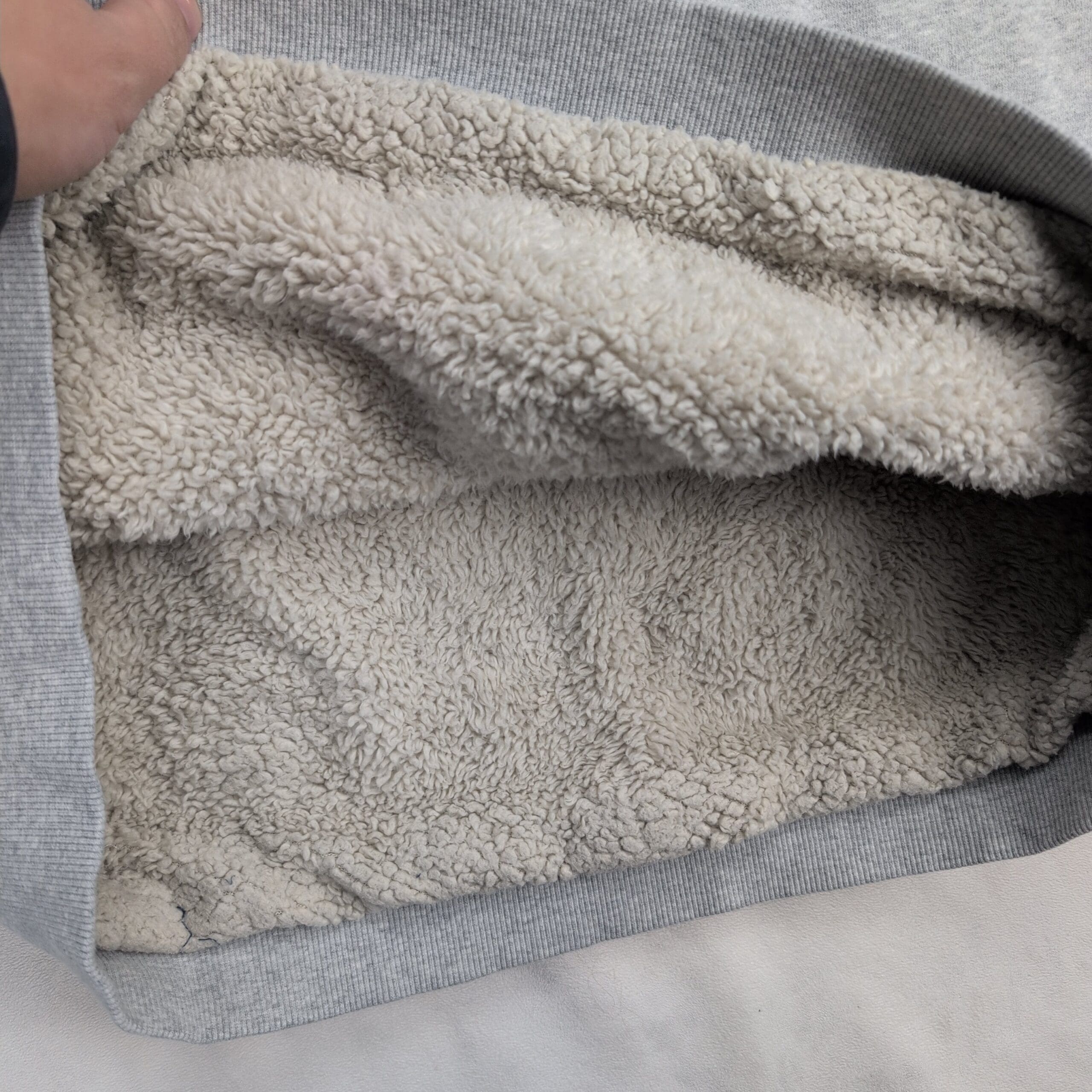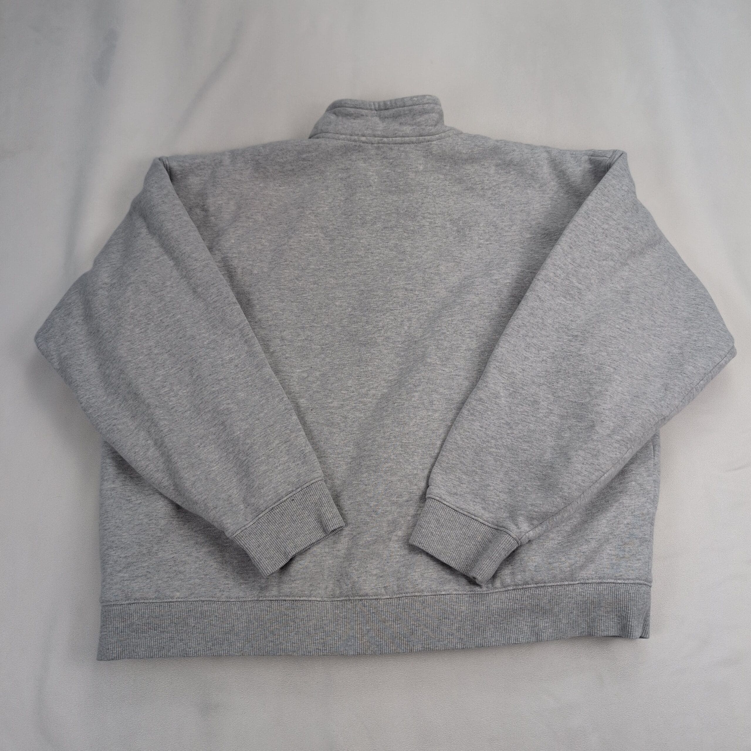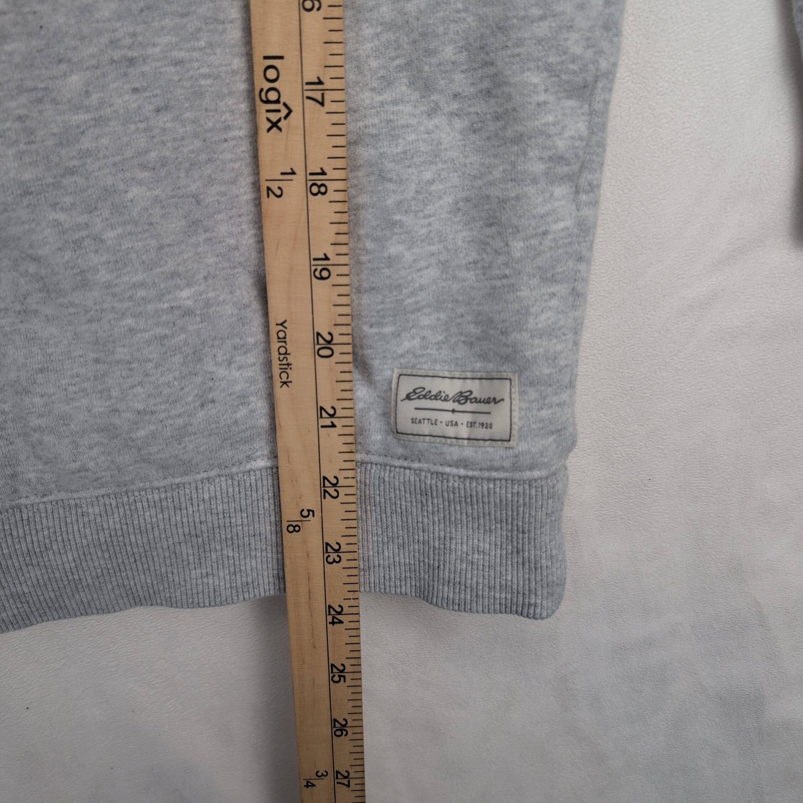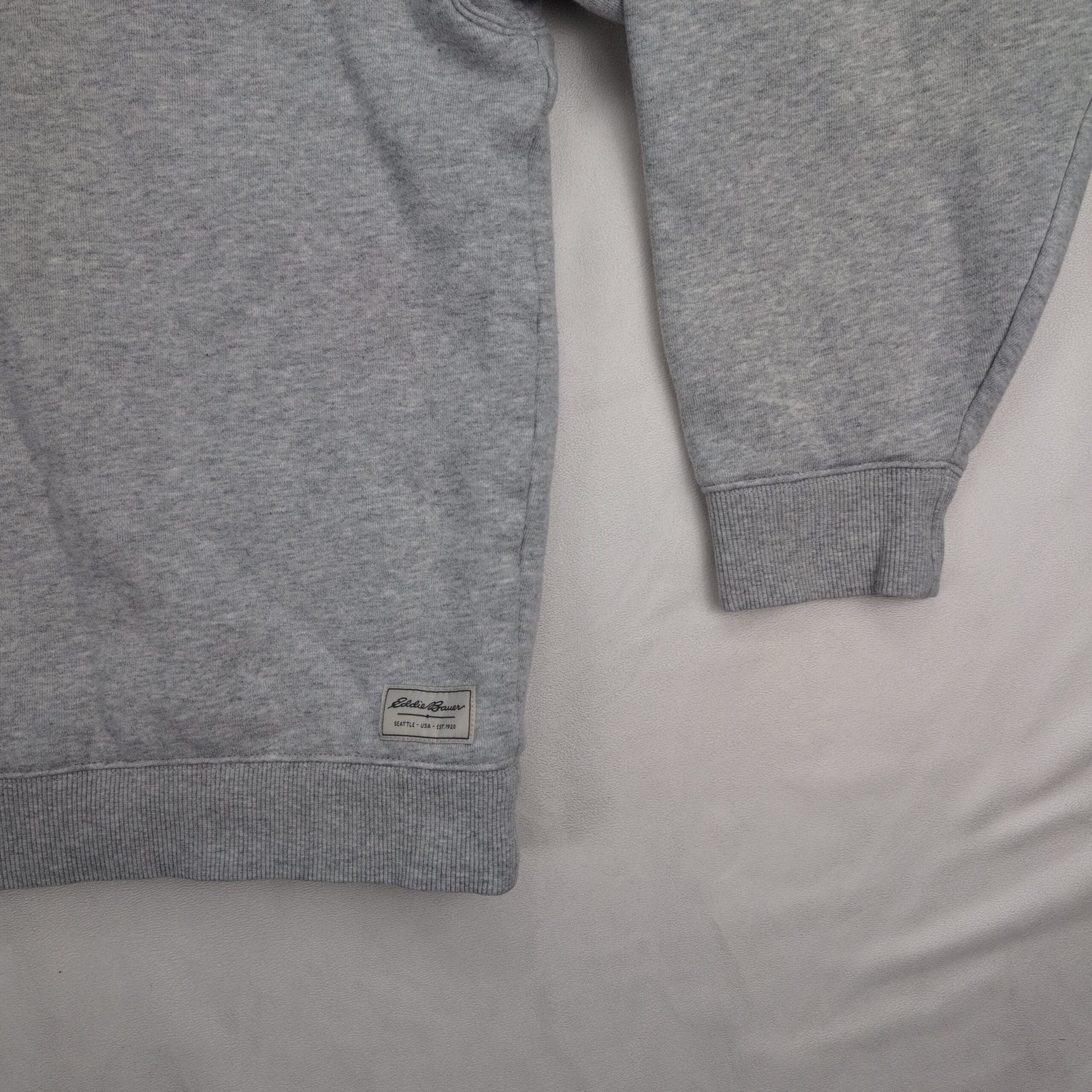 Eddie Bauer women’s quarter-zip pullover in size XL. Light heather gray sweatshirt with cozy faux sherpa fleece lining through the body and collar. Features a stand collar with metal zipper, ribbed cuffs and hem, and a small Eddie Bauer patch at the lower hem. Excellent used condition — free of major rips, tears, stains, or flaws. Typical light wear may be present from normal use.