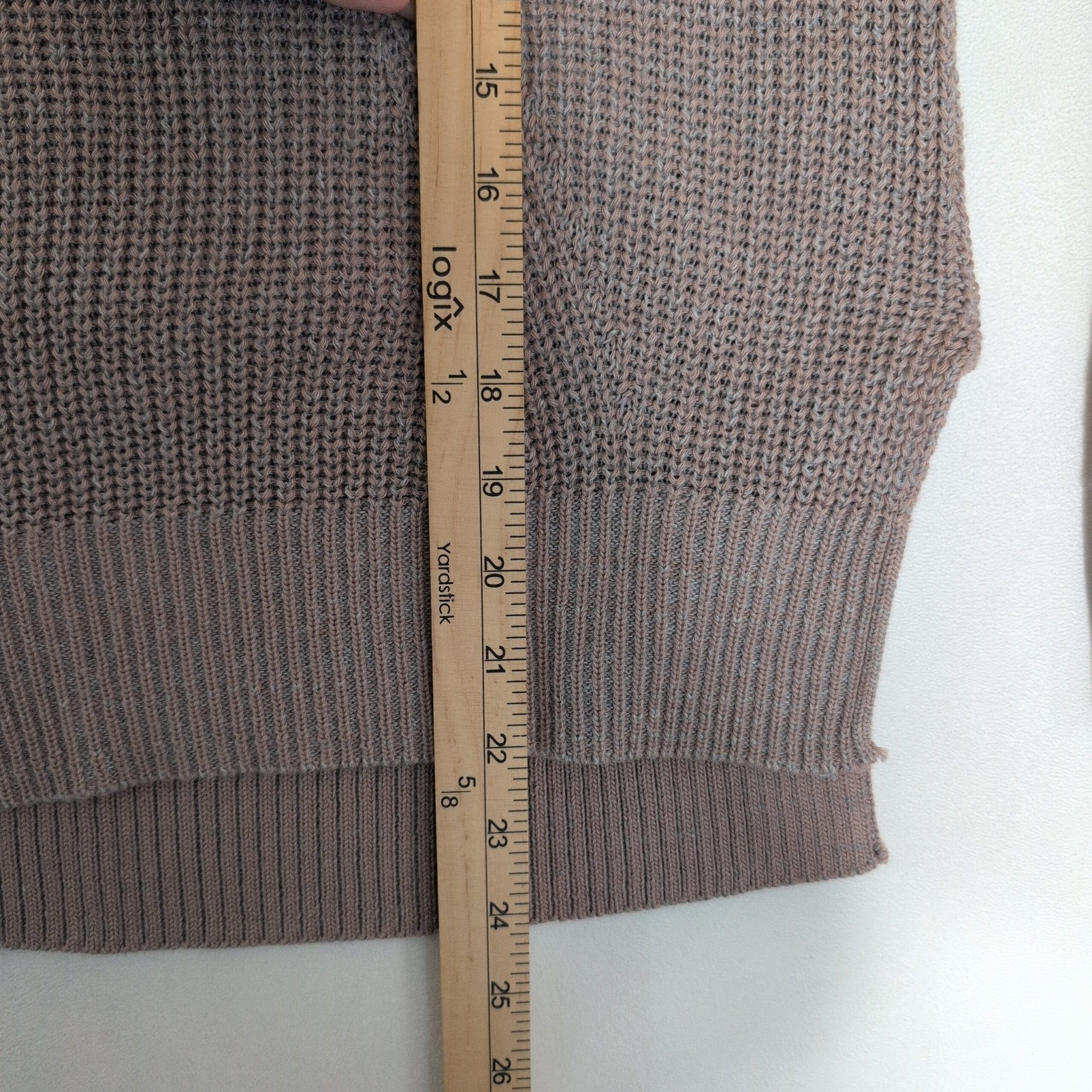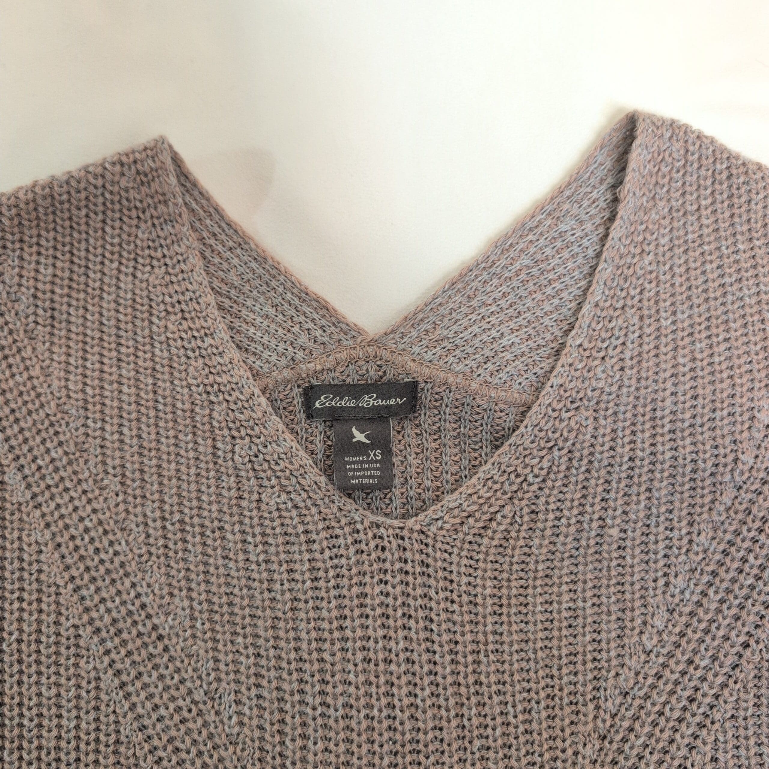 Classic Eddie Bauer V-neck sweater in a warm tan — size XS (standard). Textured knit construction with ribbed cuffs and a wide ribbed hem, subtle high-low hemline and a relaxed silhouette for easy layering. Long sleeves and a flattering V-neck make this a versatile everyday piece. Tag reads Eddie Bauer, size XS. Pre-owned with light, normal wear consistent with gentle use; please review photos for condition and details.