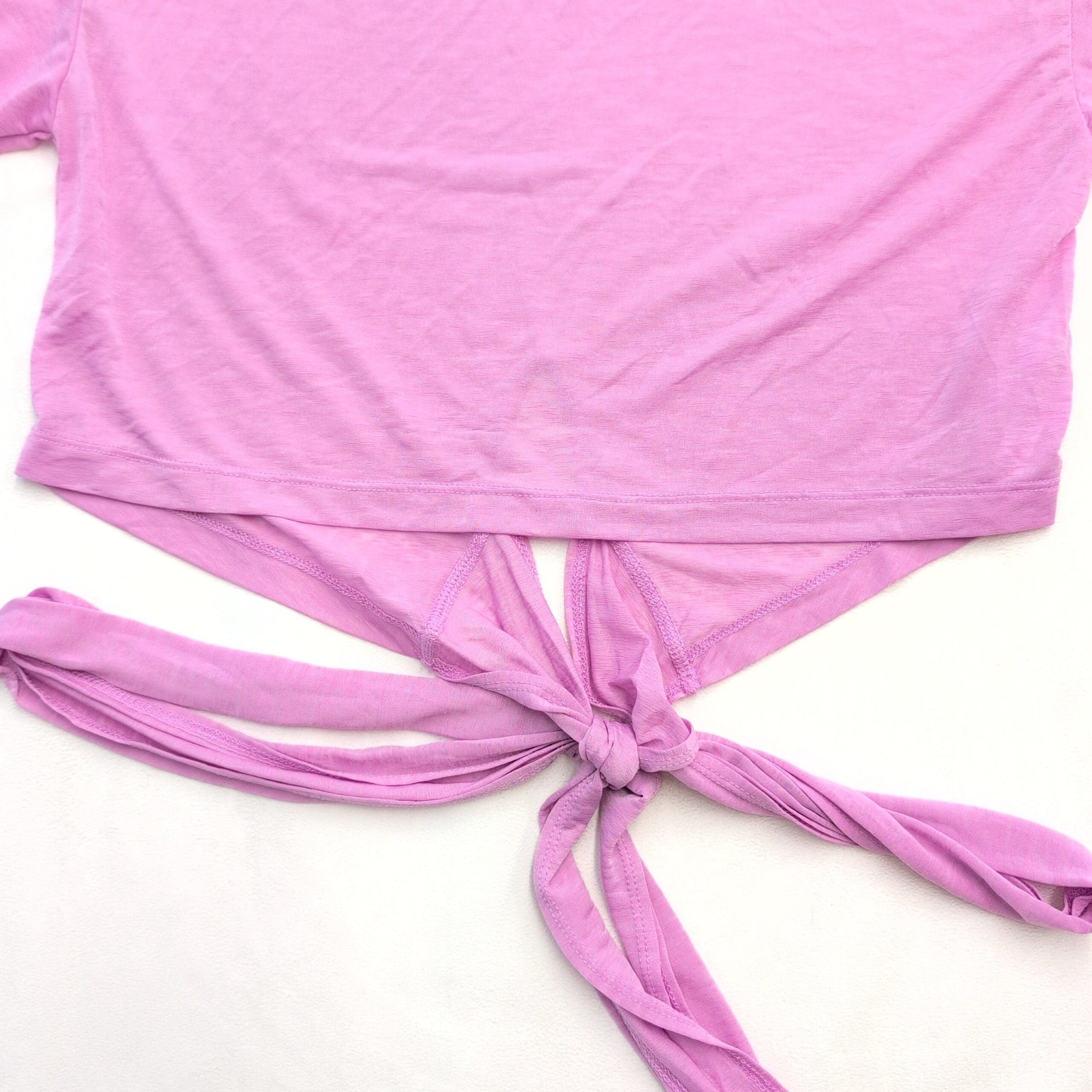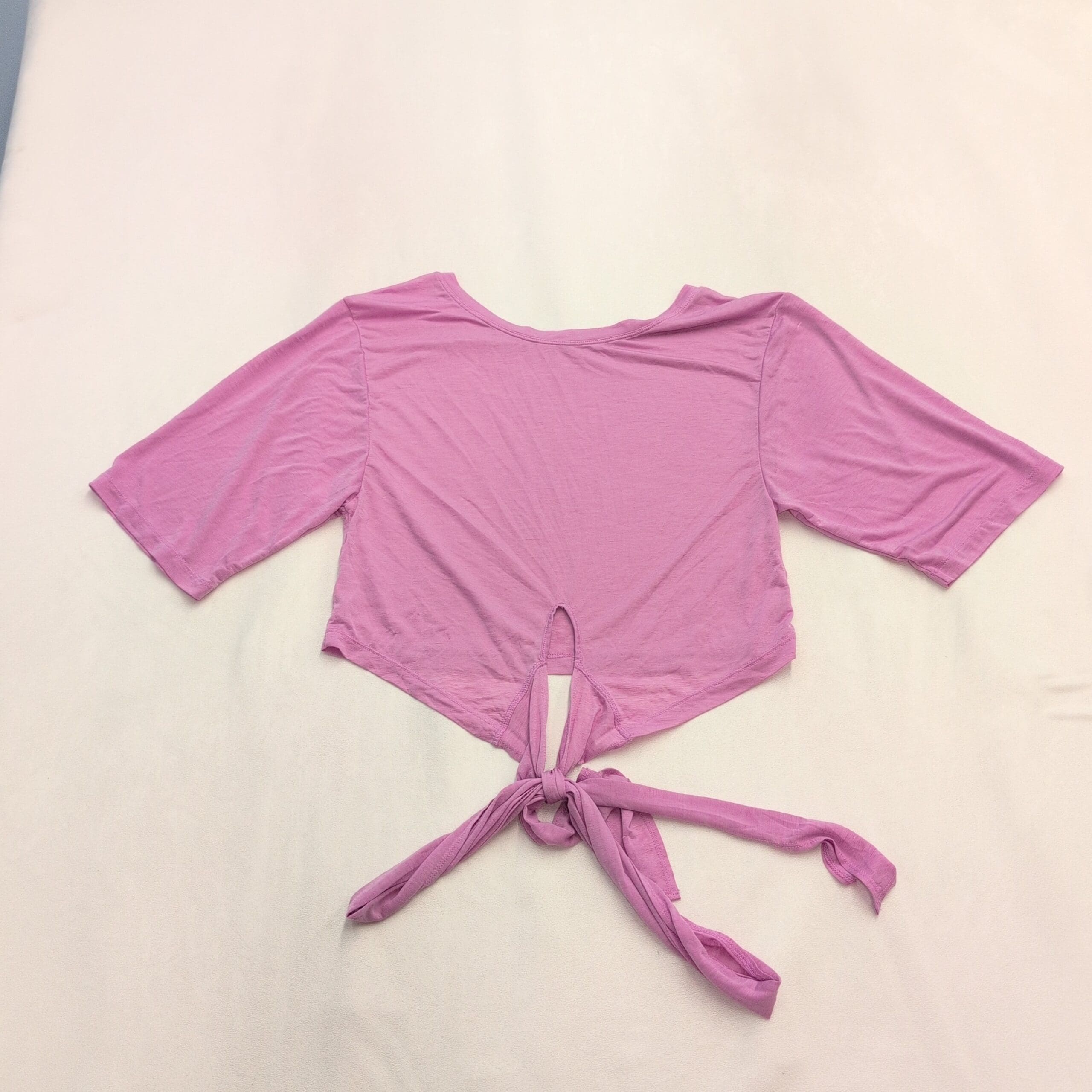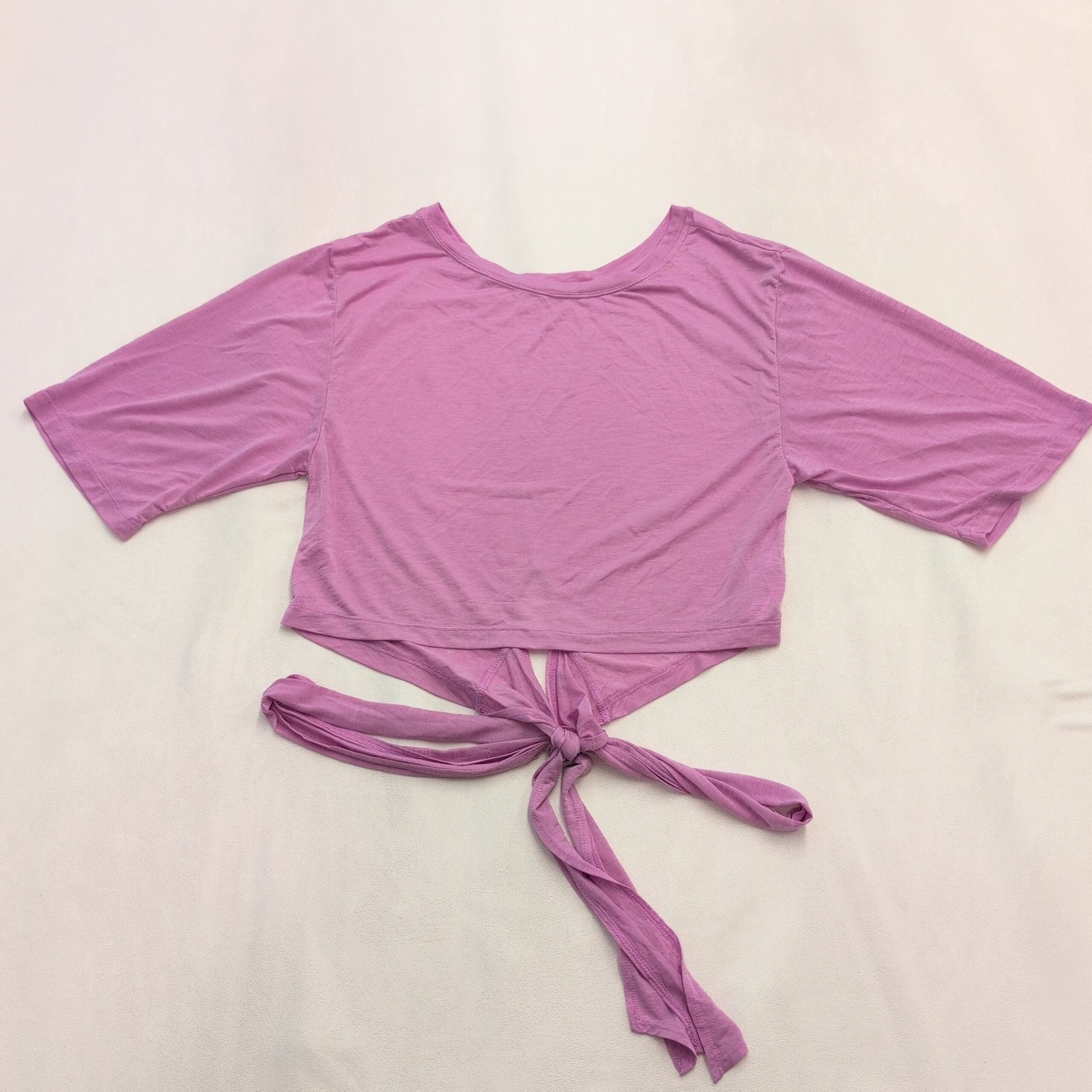 Fabletics tie-front cropped tee in a soft lavender-pink shade. Size L (standard) with a relaxed, cropped silhouette, crew neckline, and elbow-length short sleeves. Long front ties allow for adjustable knot styling — pairs well with high-waist leggings, shorts, or denim. Lightweight, slightly stretchy knit for comfortable, everyday wear. Excellent used condition with no major rips, tears, or stains; shows typical light wear consistent with a pre-loved garment.
