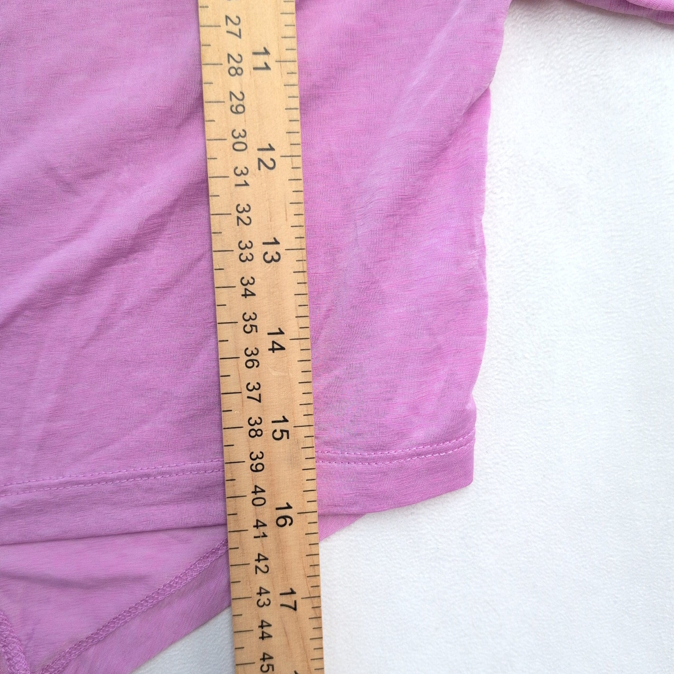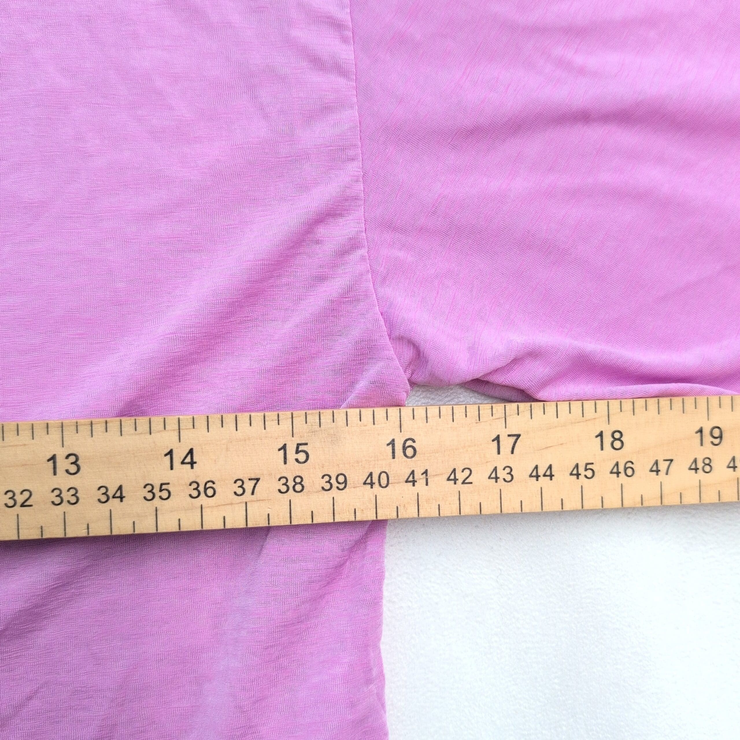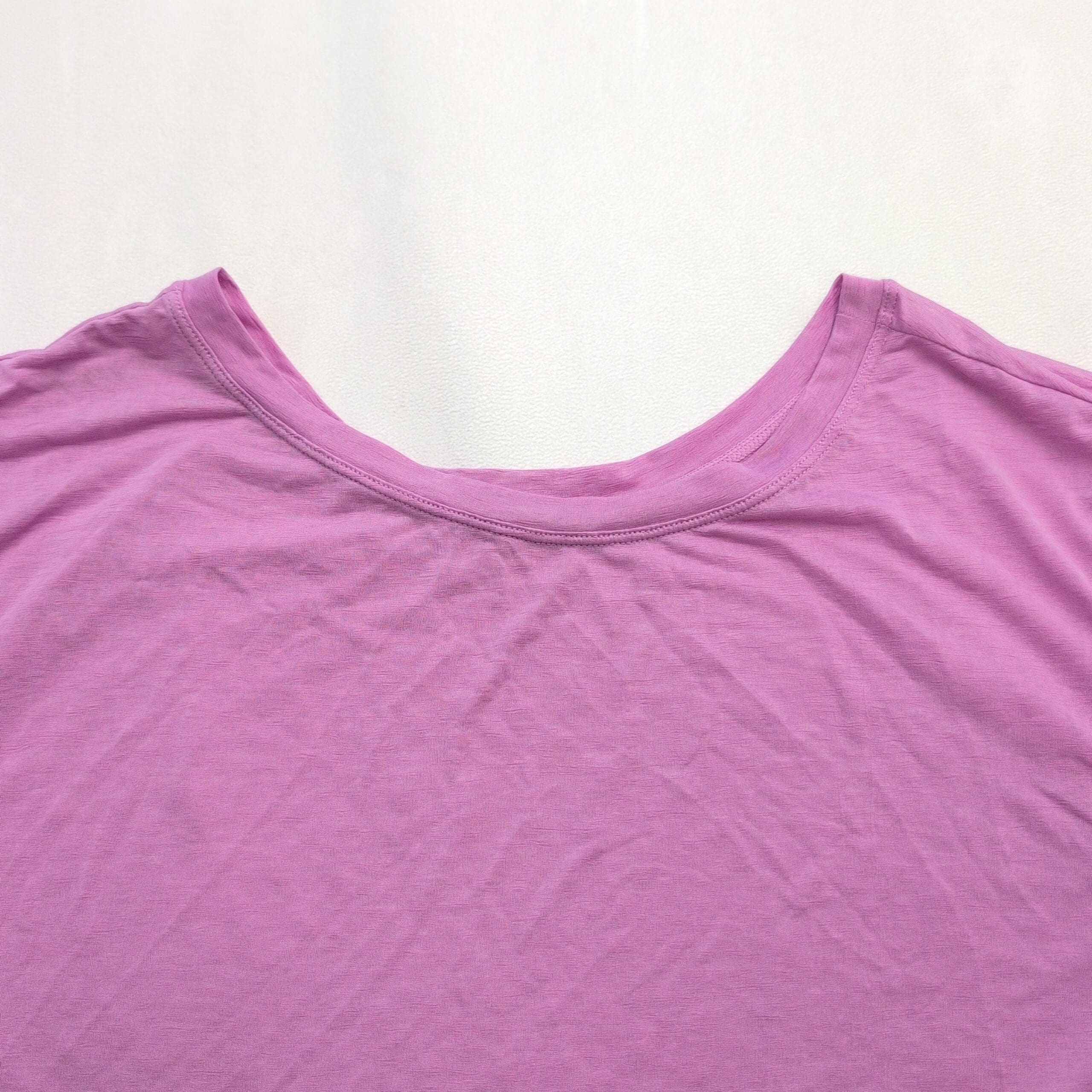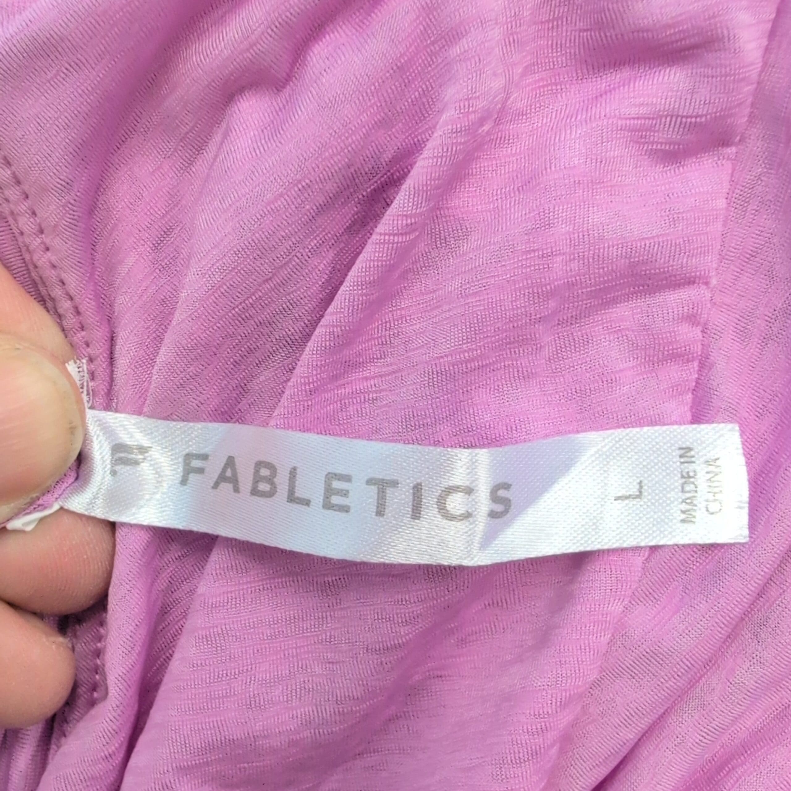 Fabletics tie-front cropped tee in a soft lavender-pink shade. Size L (standard) with a relaxed, cropped silhouette, crew neckline, and elbow-length short sleeves. Long front ties allow for adjustable knot styling — pairs well with high-waist leggings, shorts, or denim. Lightweight, slightly stretchy knit for comfortable, everyday wear. Excellent used condition with no major rips, tears, or stains; shows typical light wear consistent with a pre-loved garment.