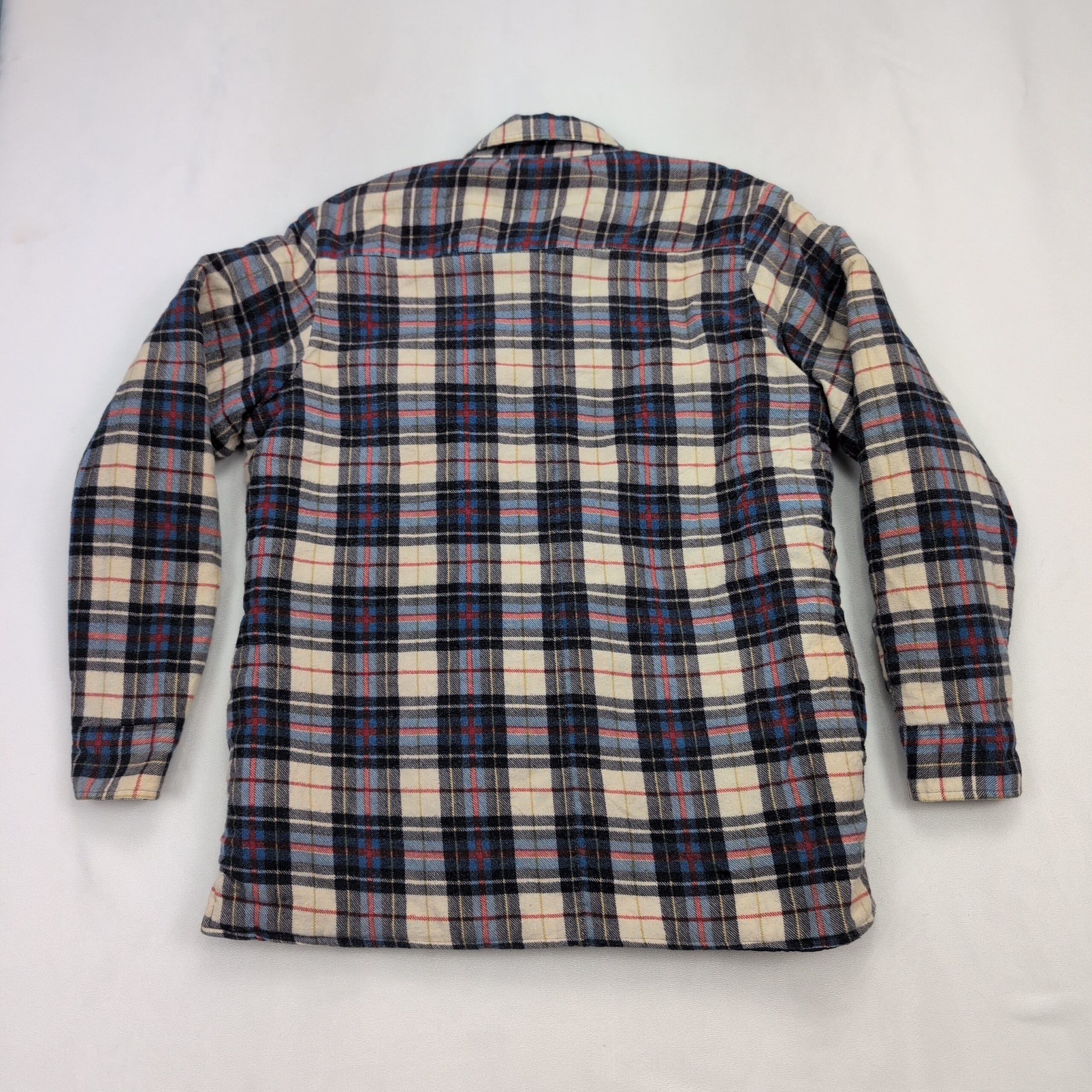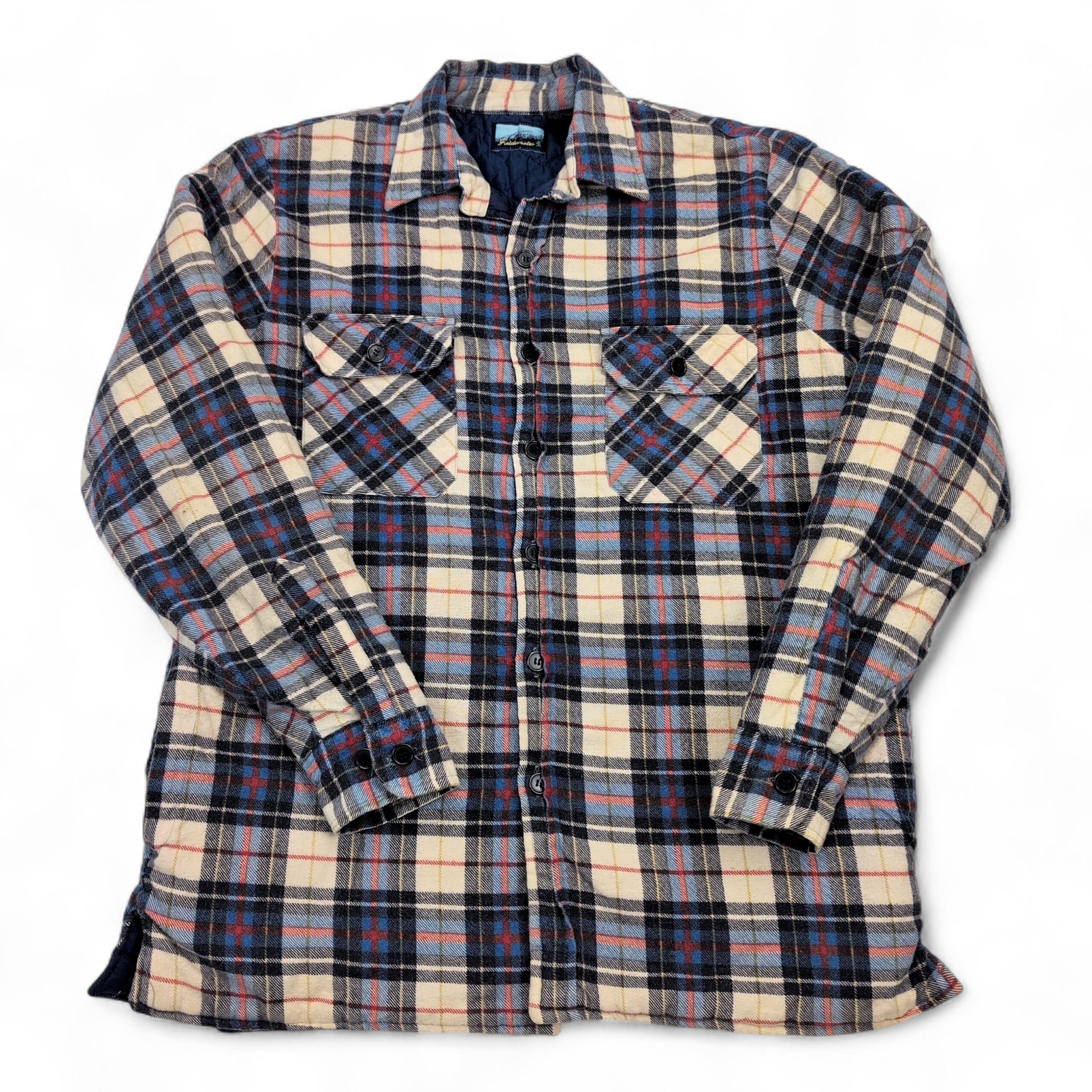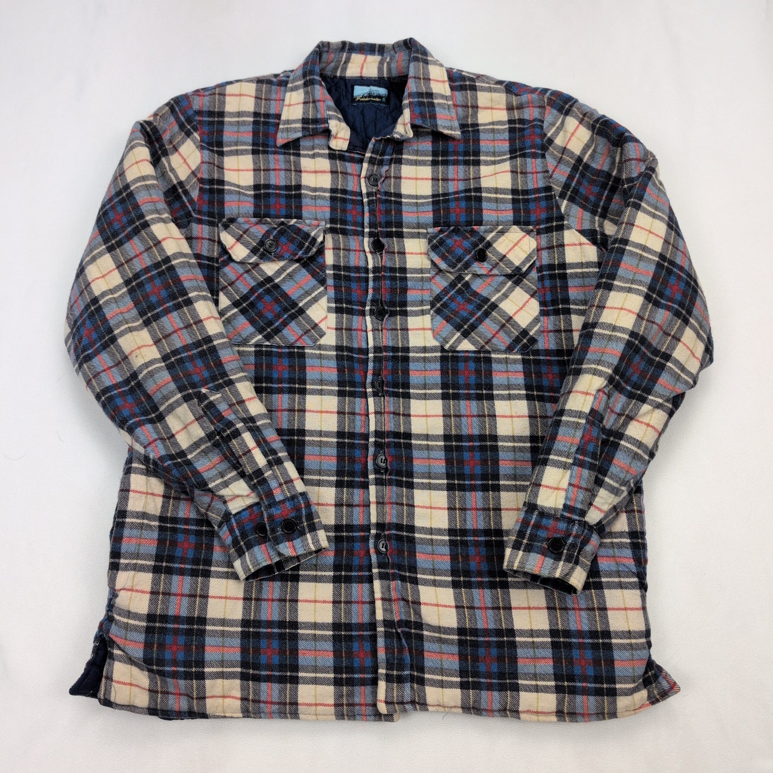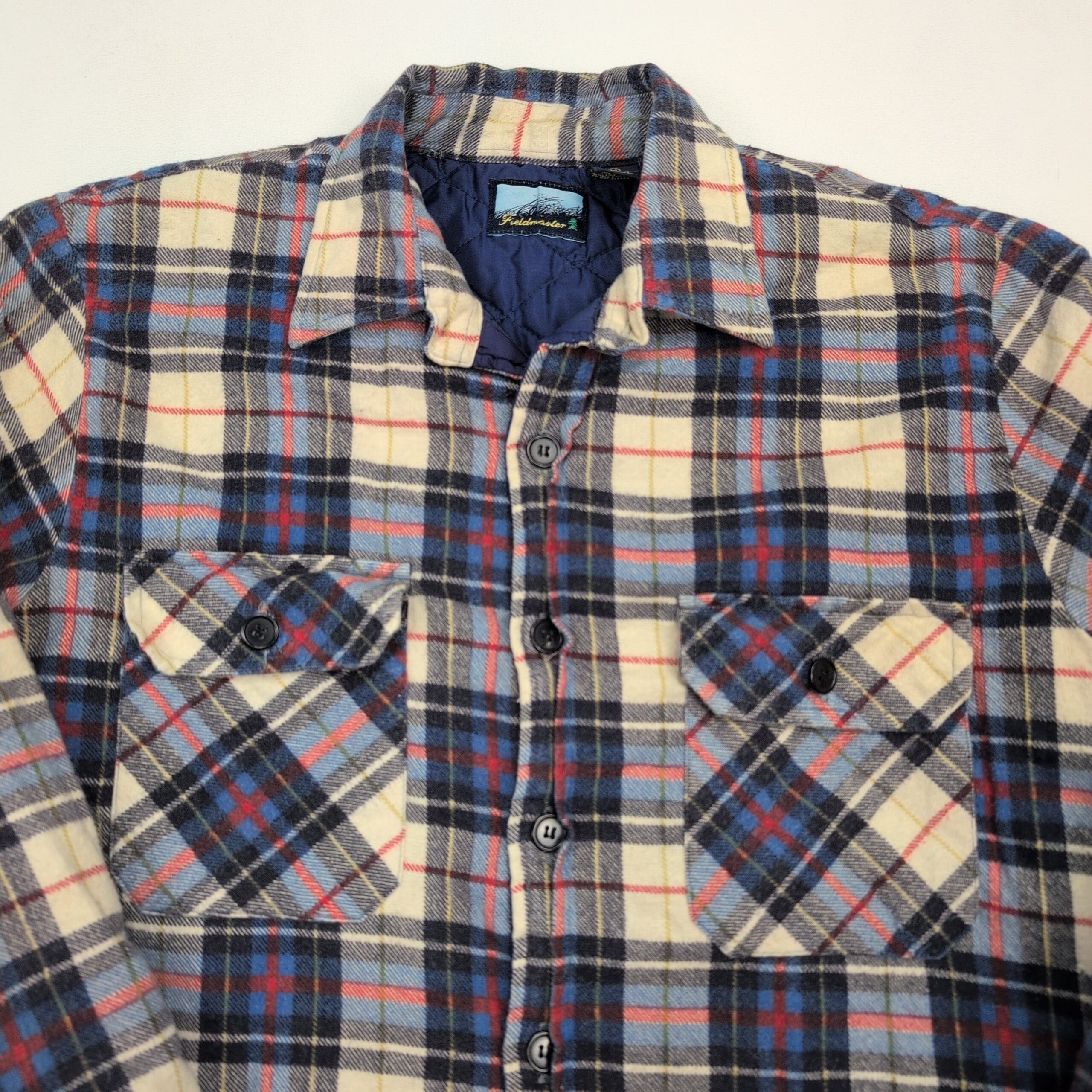Women’s Fieldmaster plaid shacket in size M. Brushed plaid flannel exterior in cream, navy, light blue and red with a quilted lining for added warmth. Button-front closure, two button-flap chest pockets, long sleeves with button cuffs, and a slightly curved hem with side vents. Excellent used condition — free of major rips, tears, stains, or flaws; typical light wear may be present. Great layered piece for cool weather.