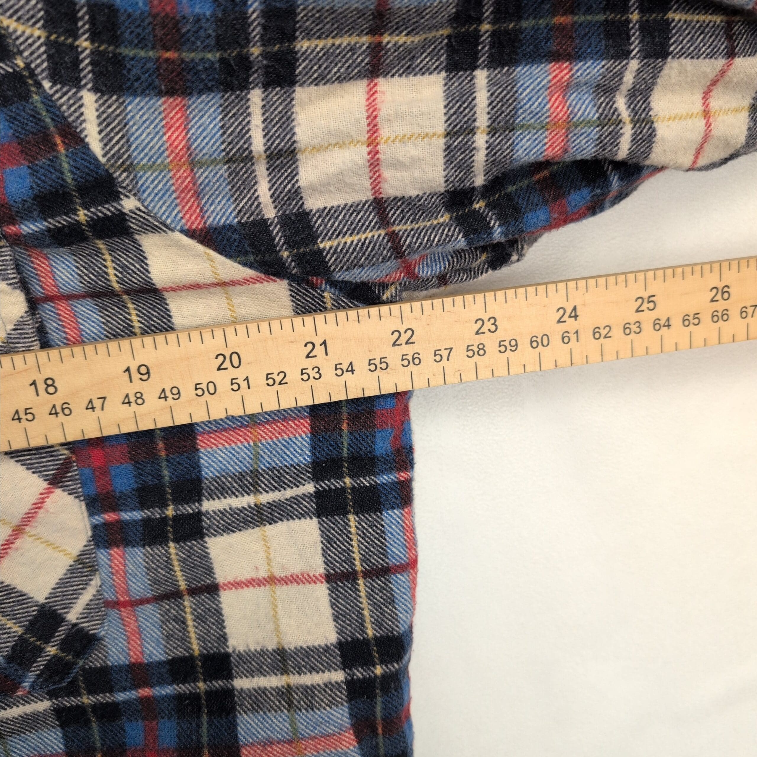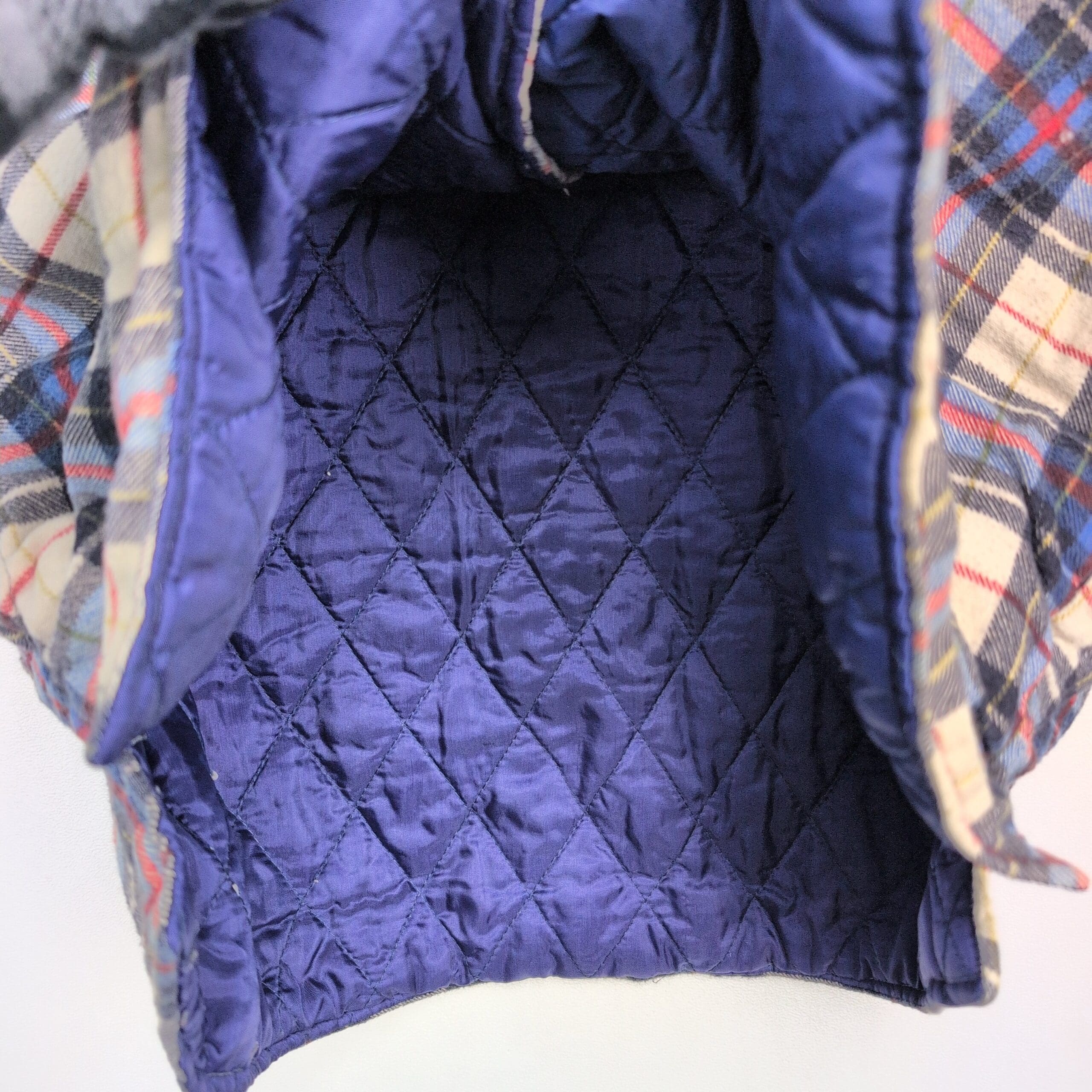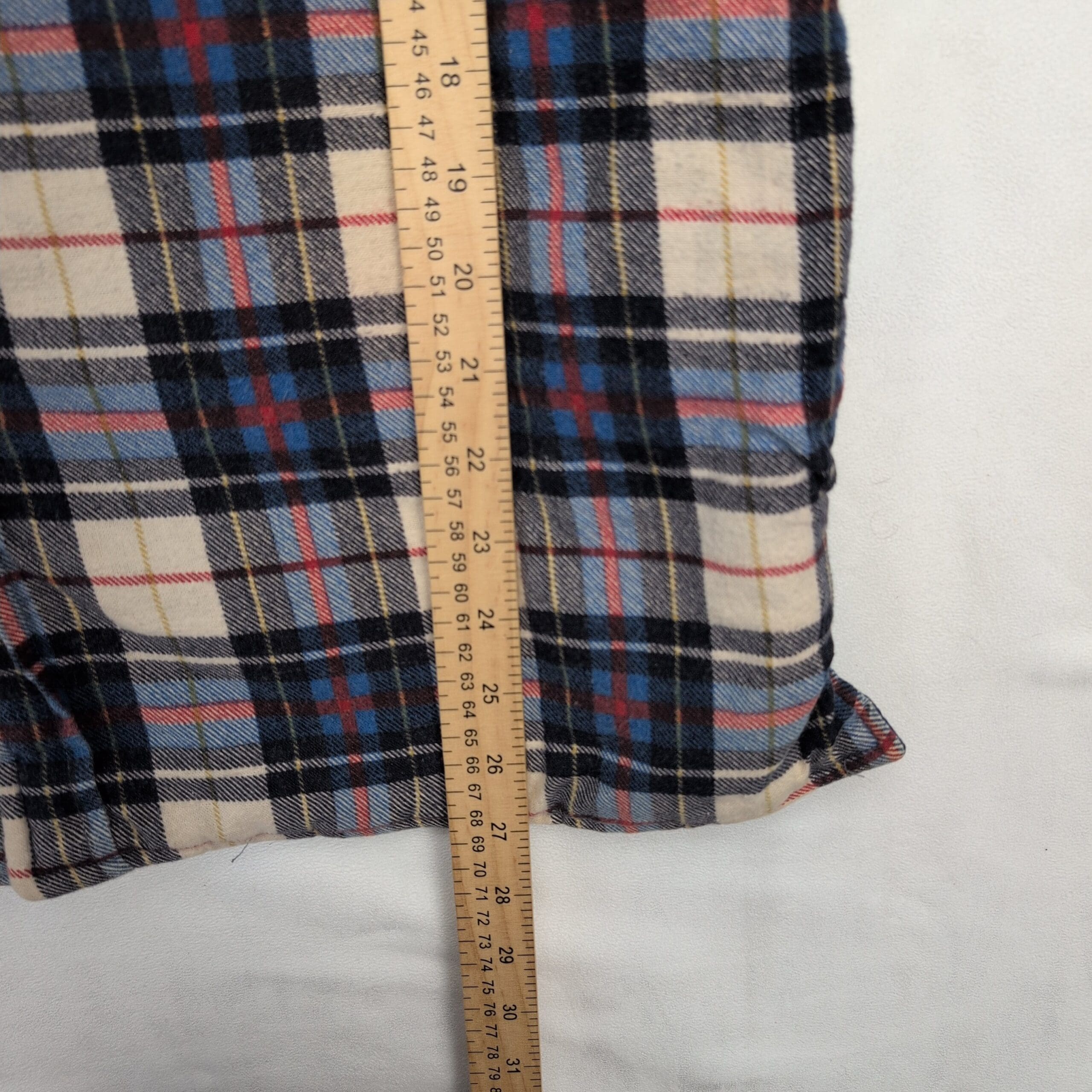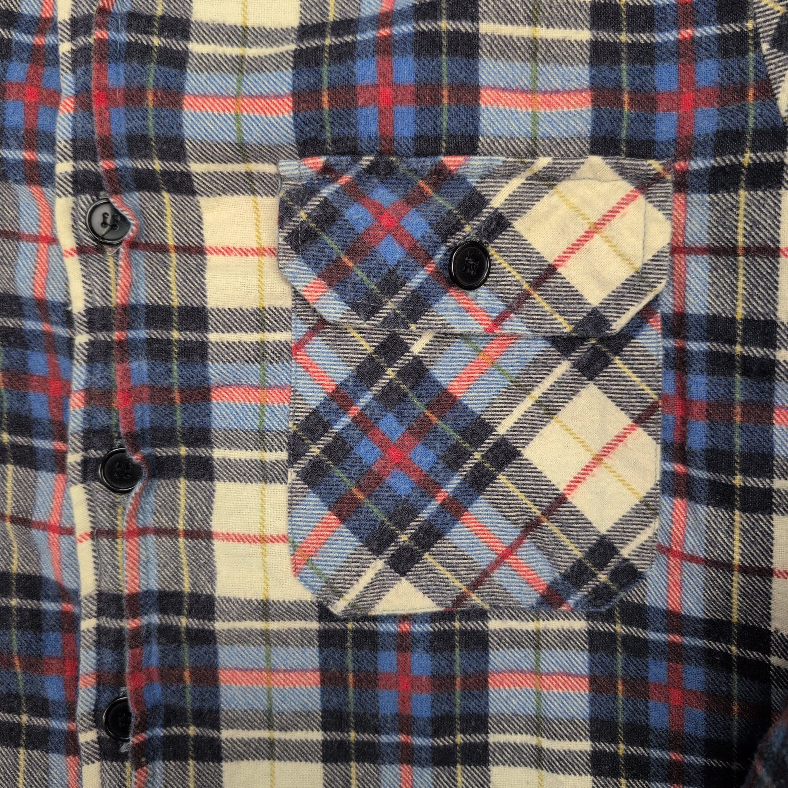 Women’s Fieldmaster plaid shacket in size M. Brushed plaid flannel exterior in cream, navy, light blue and red with a quilted lining for added warmth. Button-front closure, two button-flap chest pockets, long sleeves with button cuffs, and a slightly curved hem with side vents. Excellent used condition — free of major rips, tears, stains, or flaws; typical light wear may be present. Great layered piece for cool weather.