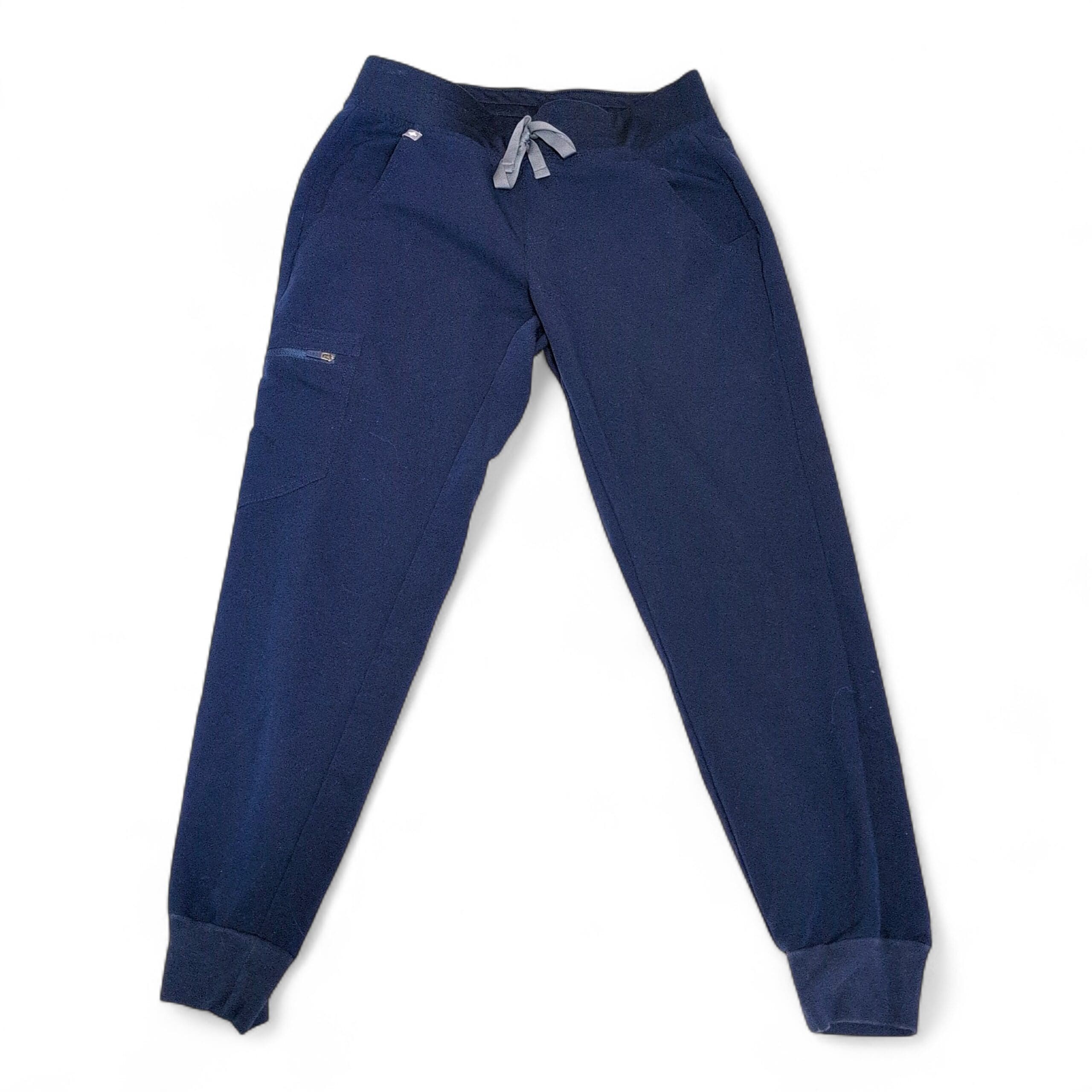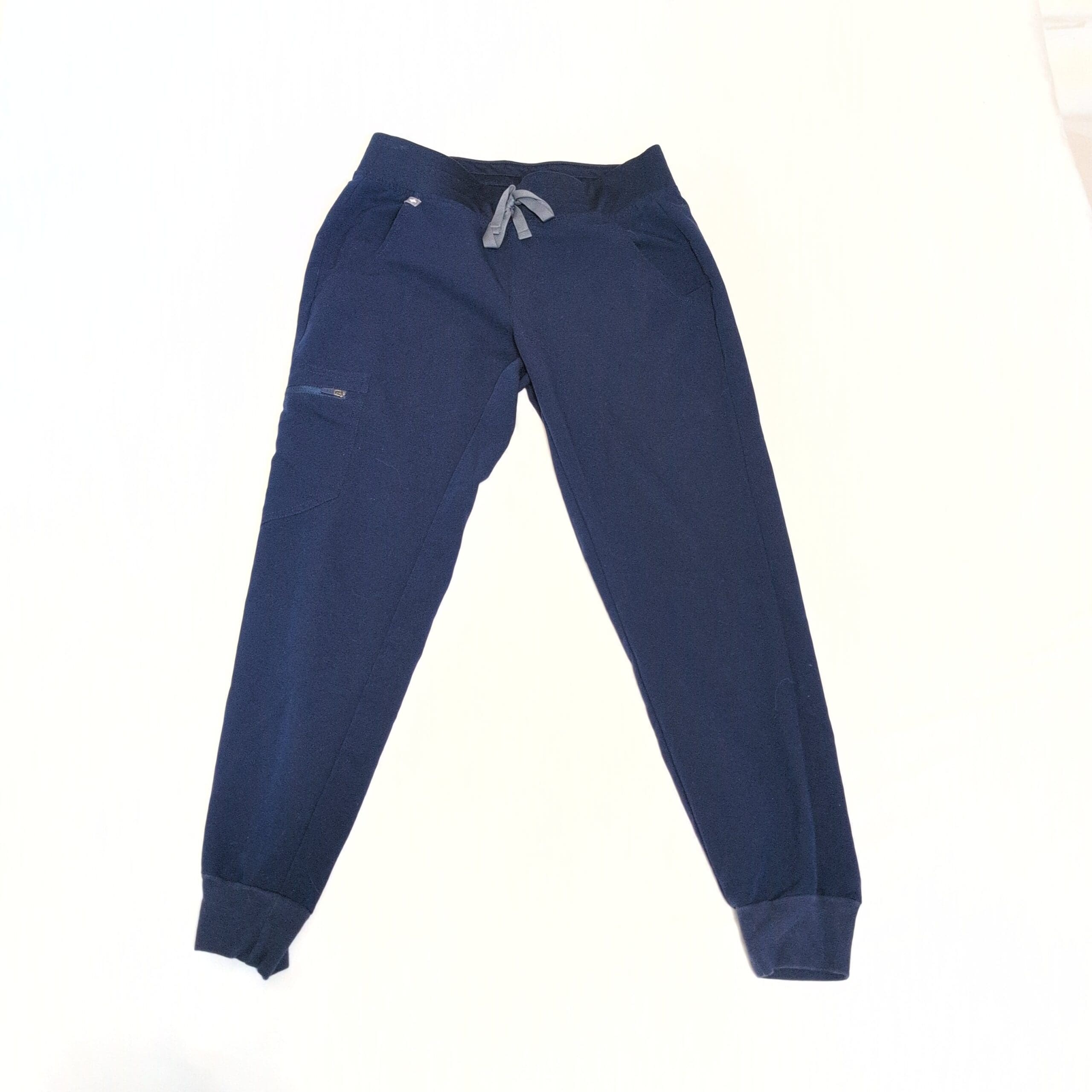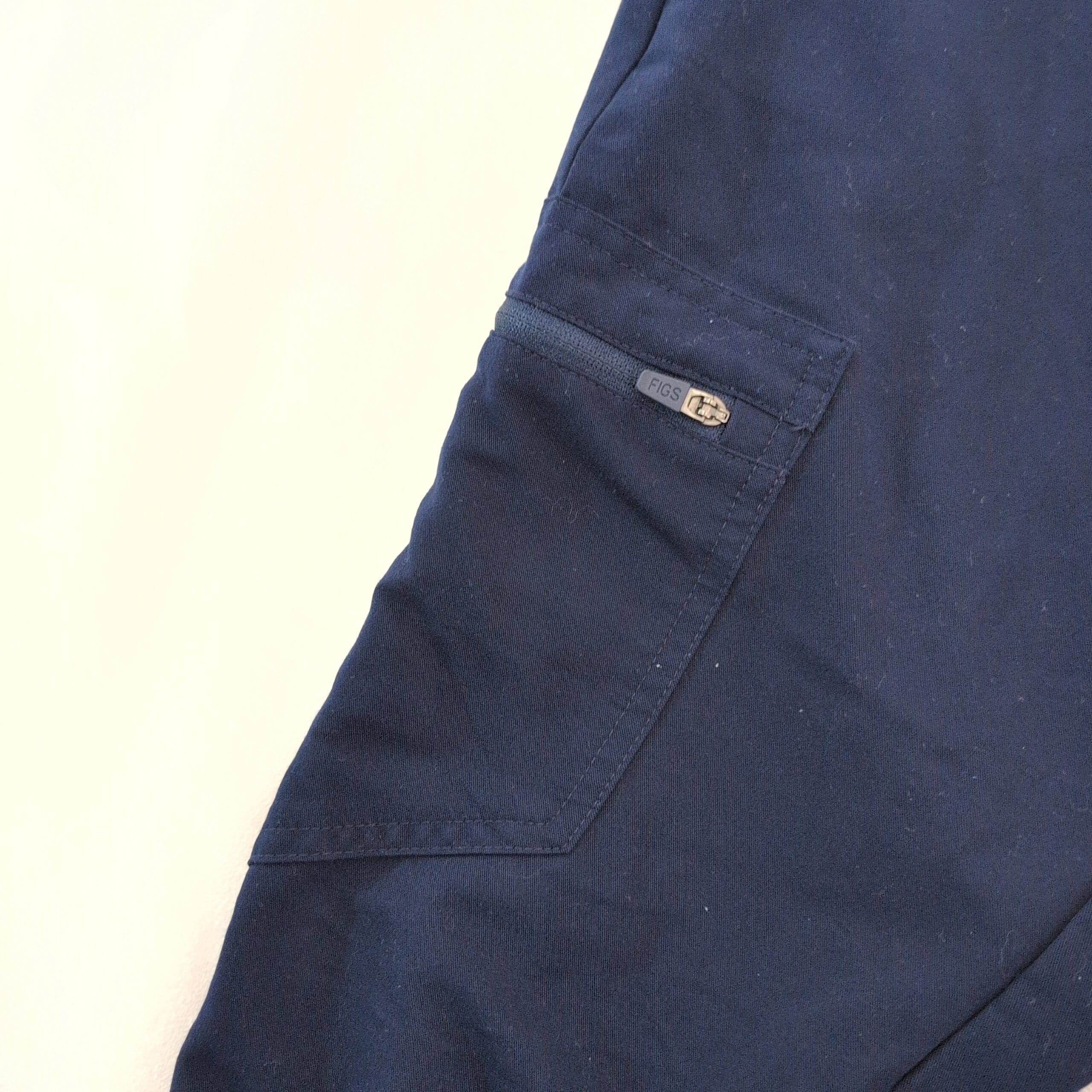 FIGS women’s navy jogger scrub pants in size XS. Comfortable mid-rise drawstring waist with elastic ribbed cuffs for a tapered jogger fit. Features multiple pockets including a zippered thigh pocket and angled front pockets for secure storage. Soft stretch performance fabric allows ease of movement for long shifts while maintaining a sharp, professional look.