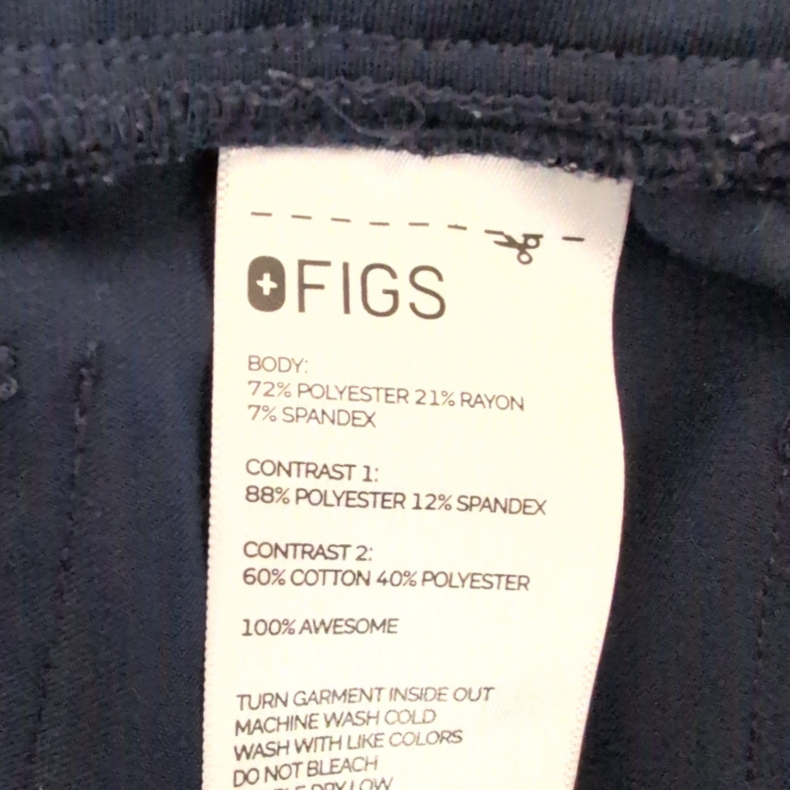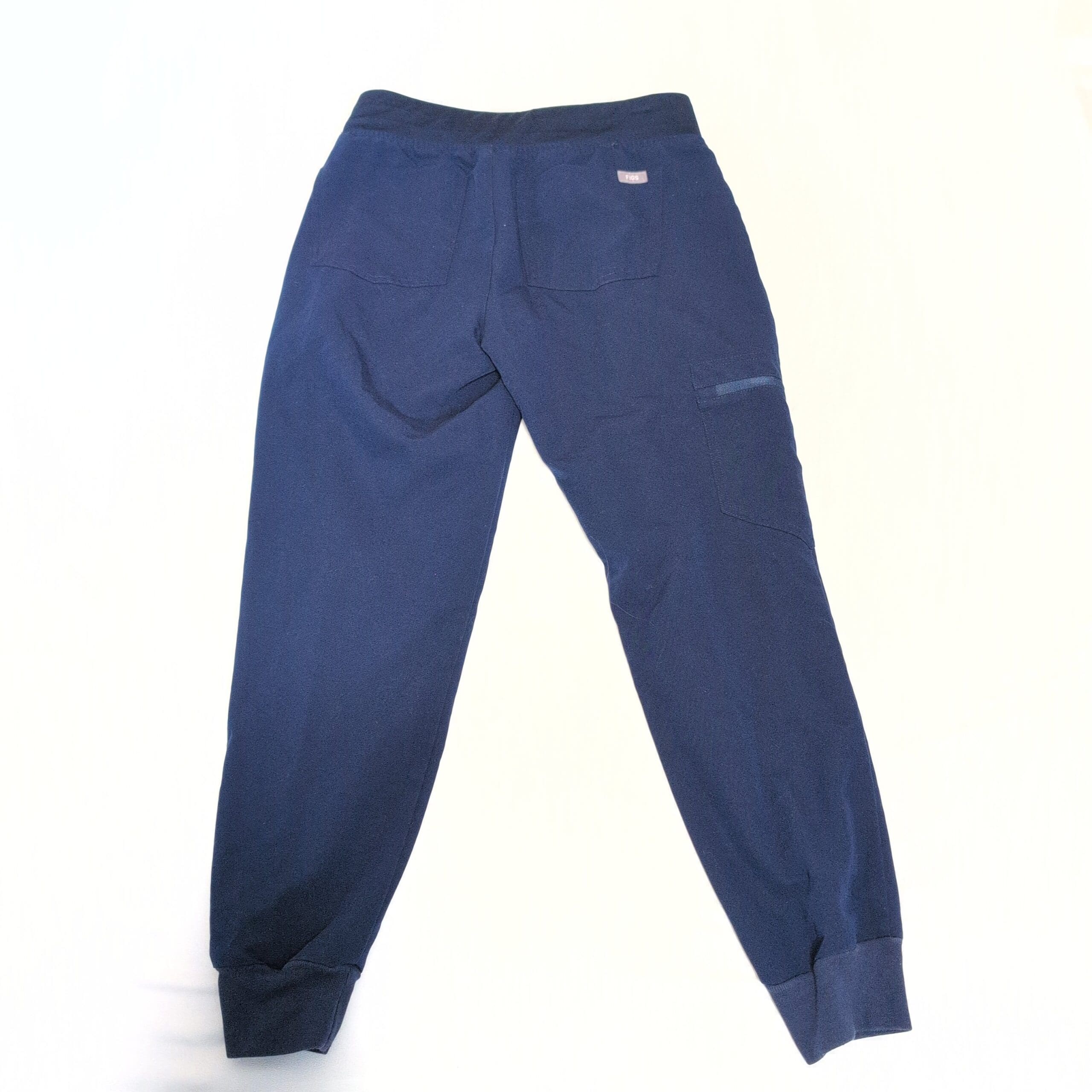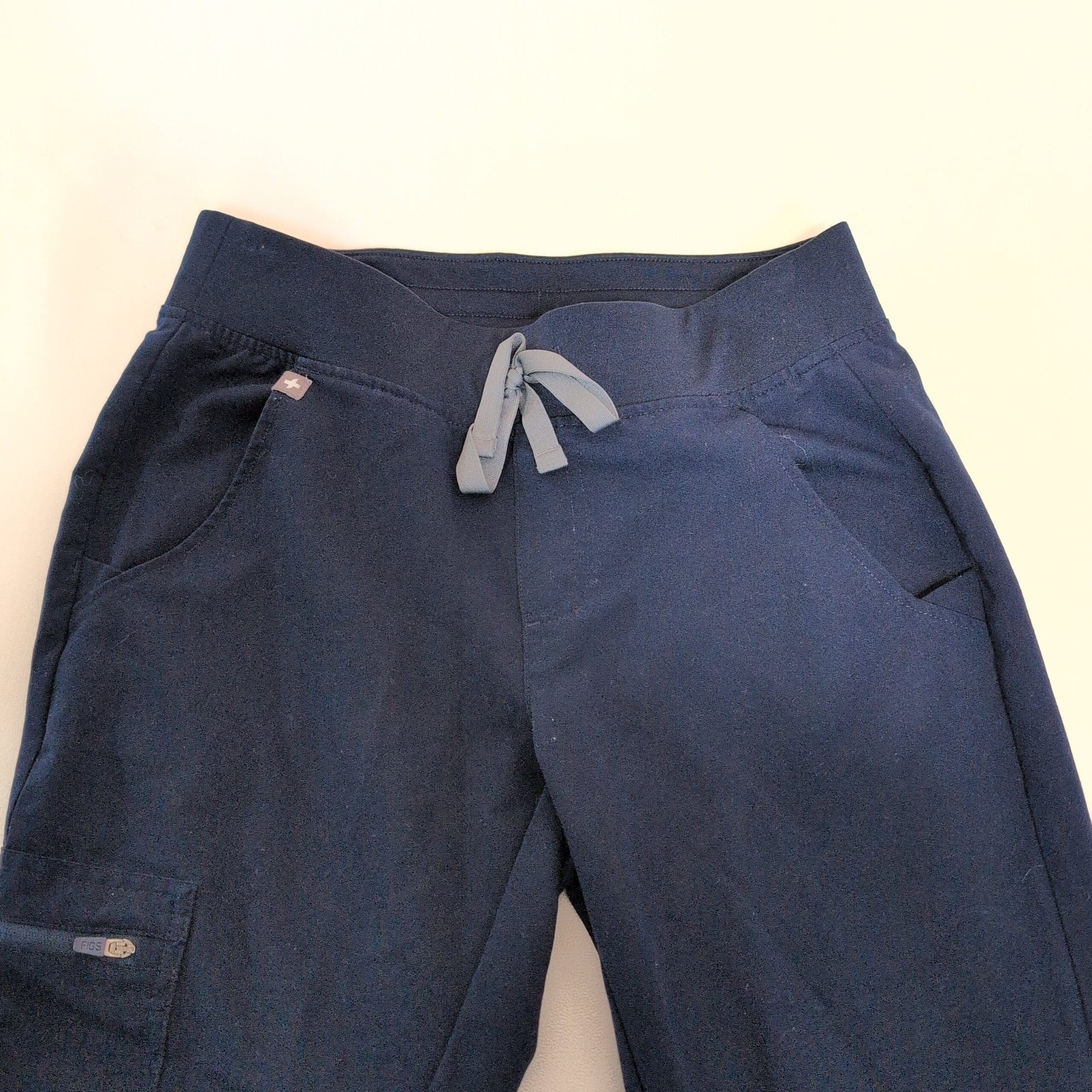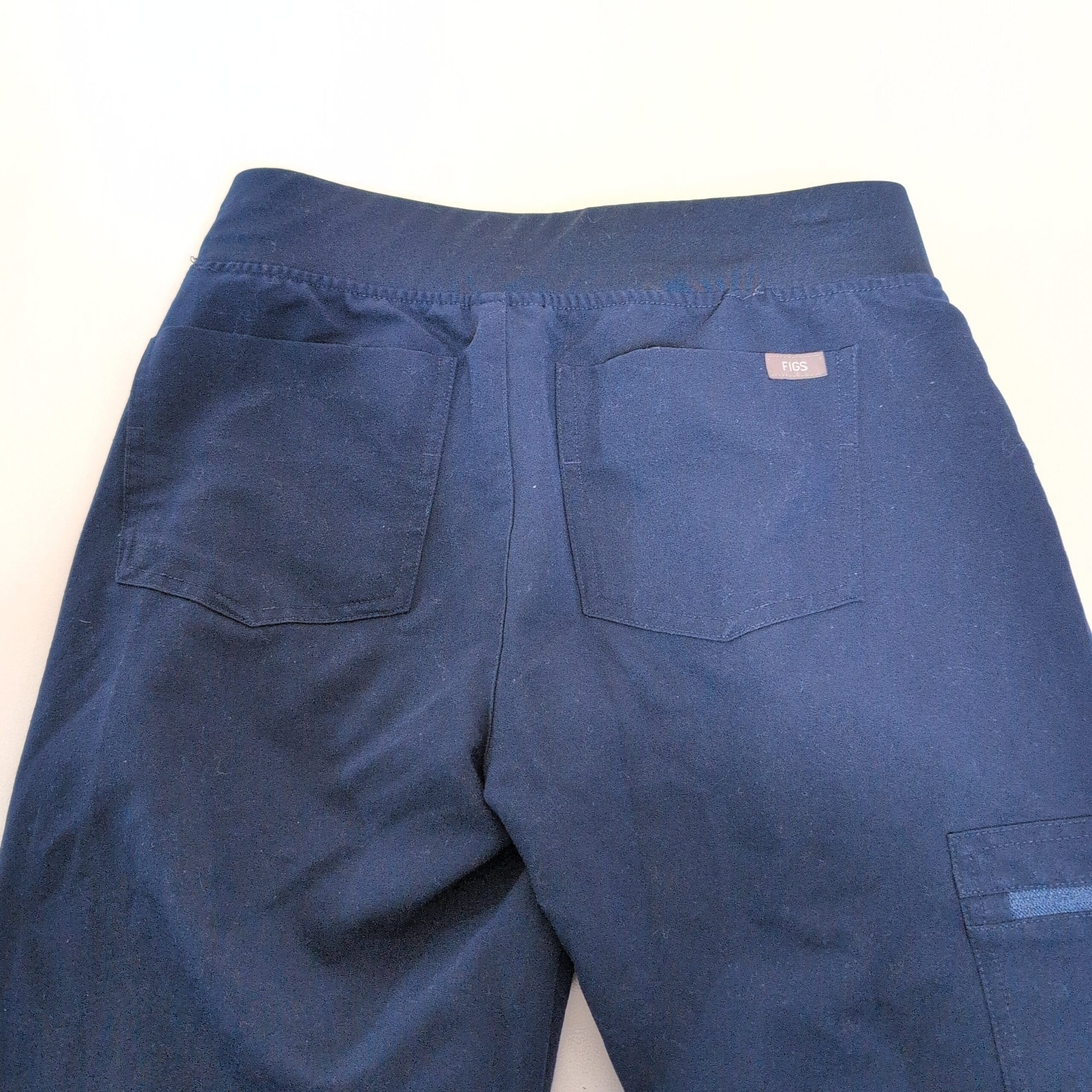 FIGS women’s navy jogger scrub pants in size XS. Comfortable mid-rise drawstring waist with elastic ribbed cuffs for a tapered jogger fit. Features multiple pockets including a zippered thigh pocket and angled front pockets for secure storage. Soft stretch performance fabric allows ease of movement for long shifts while maintaining a sharp, professional look.