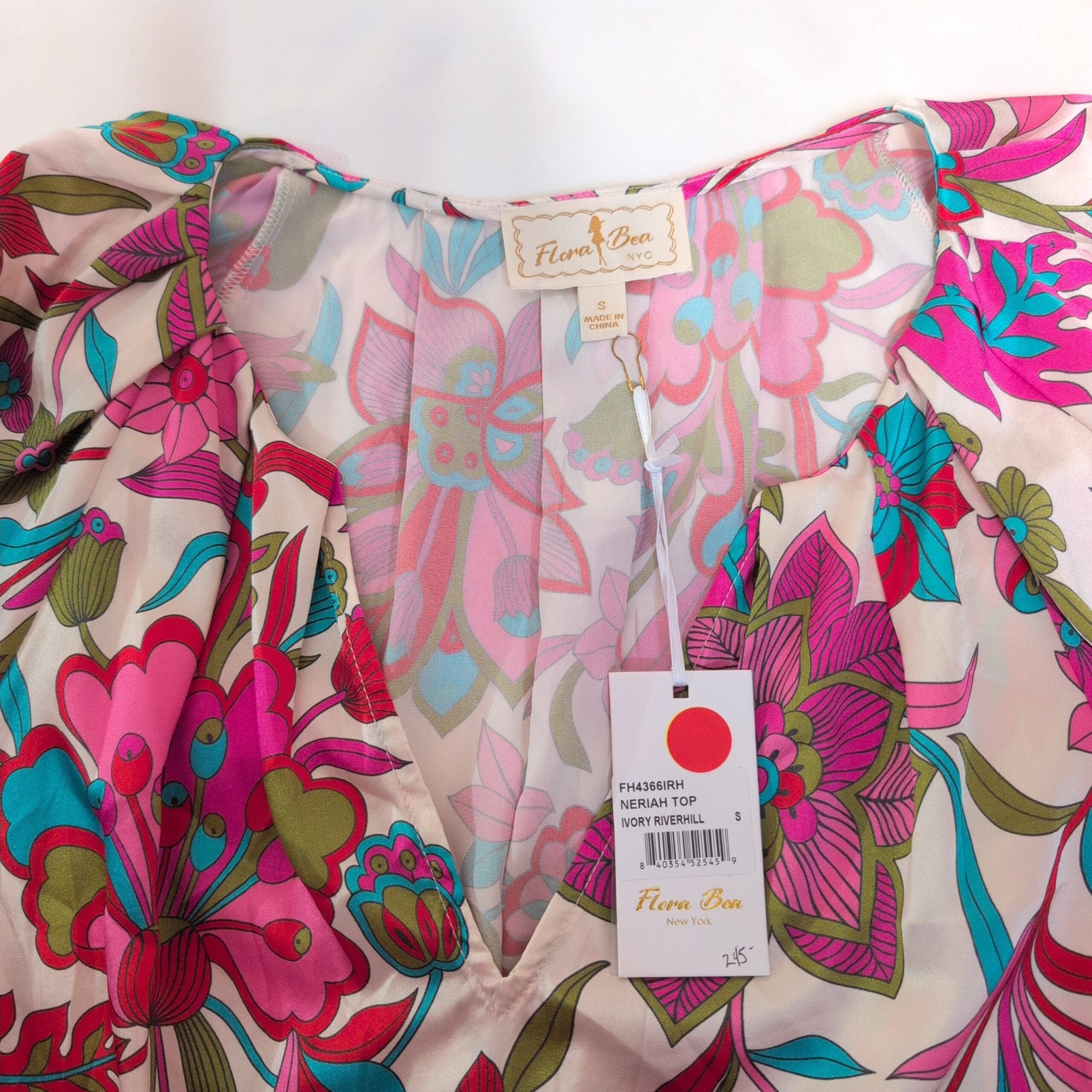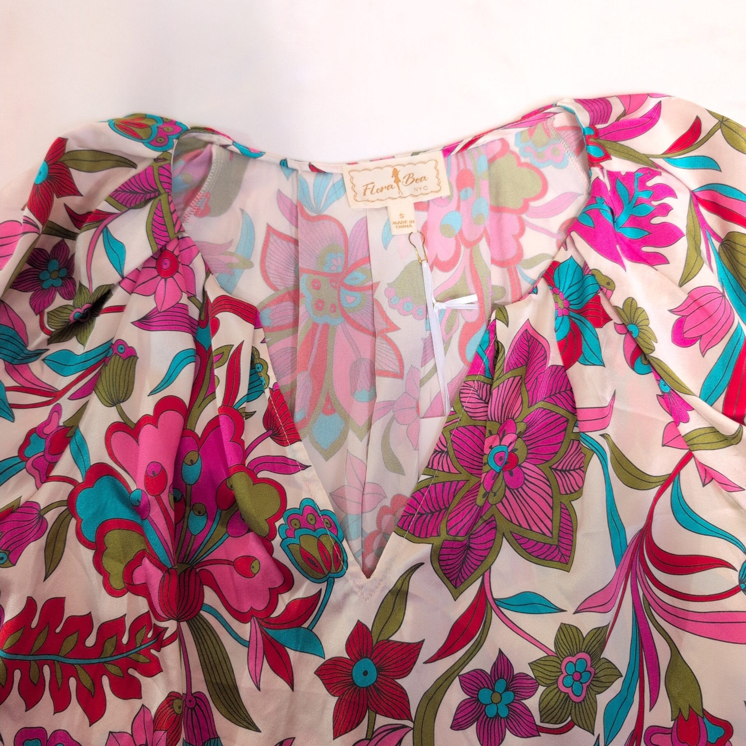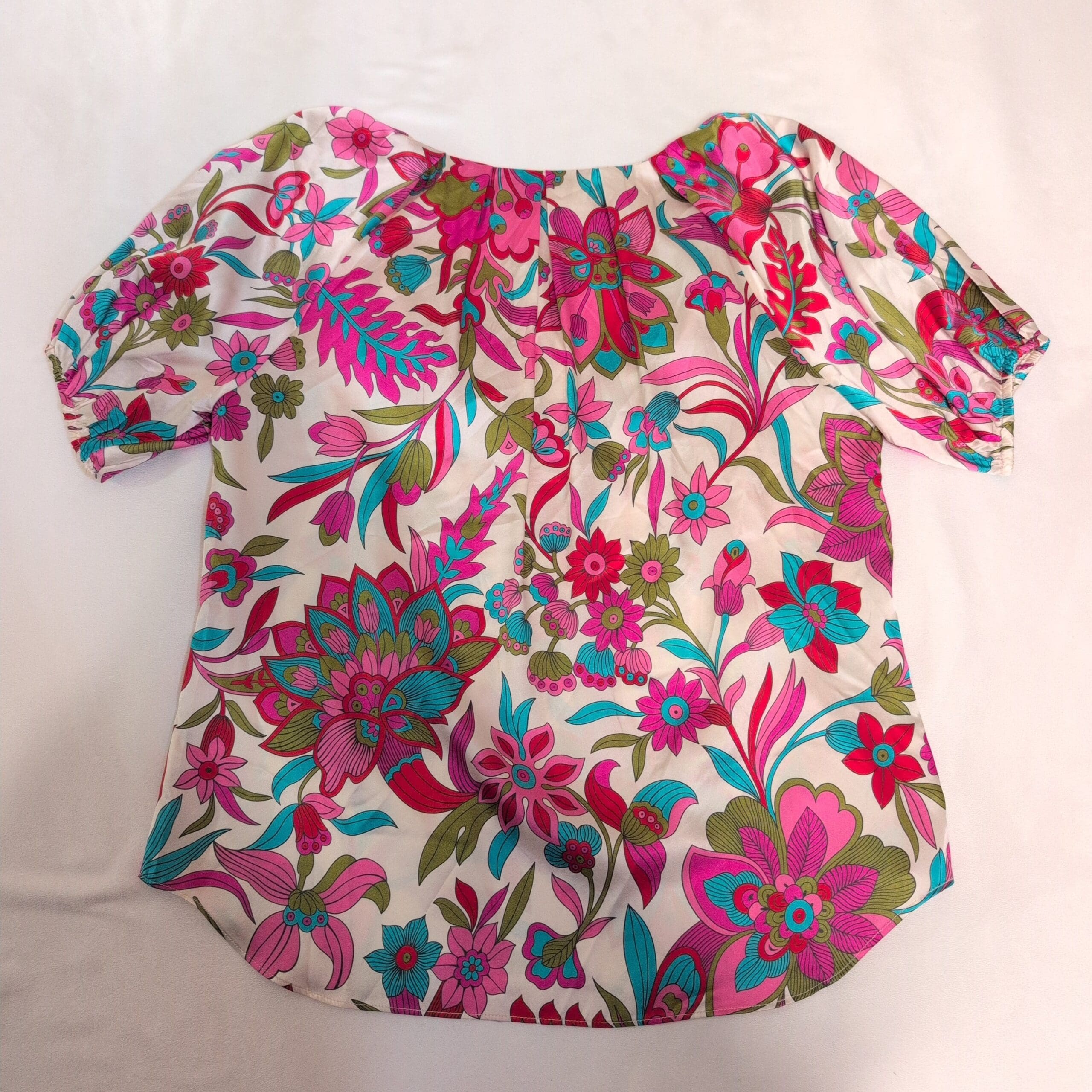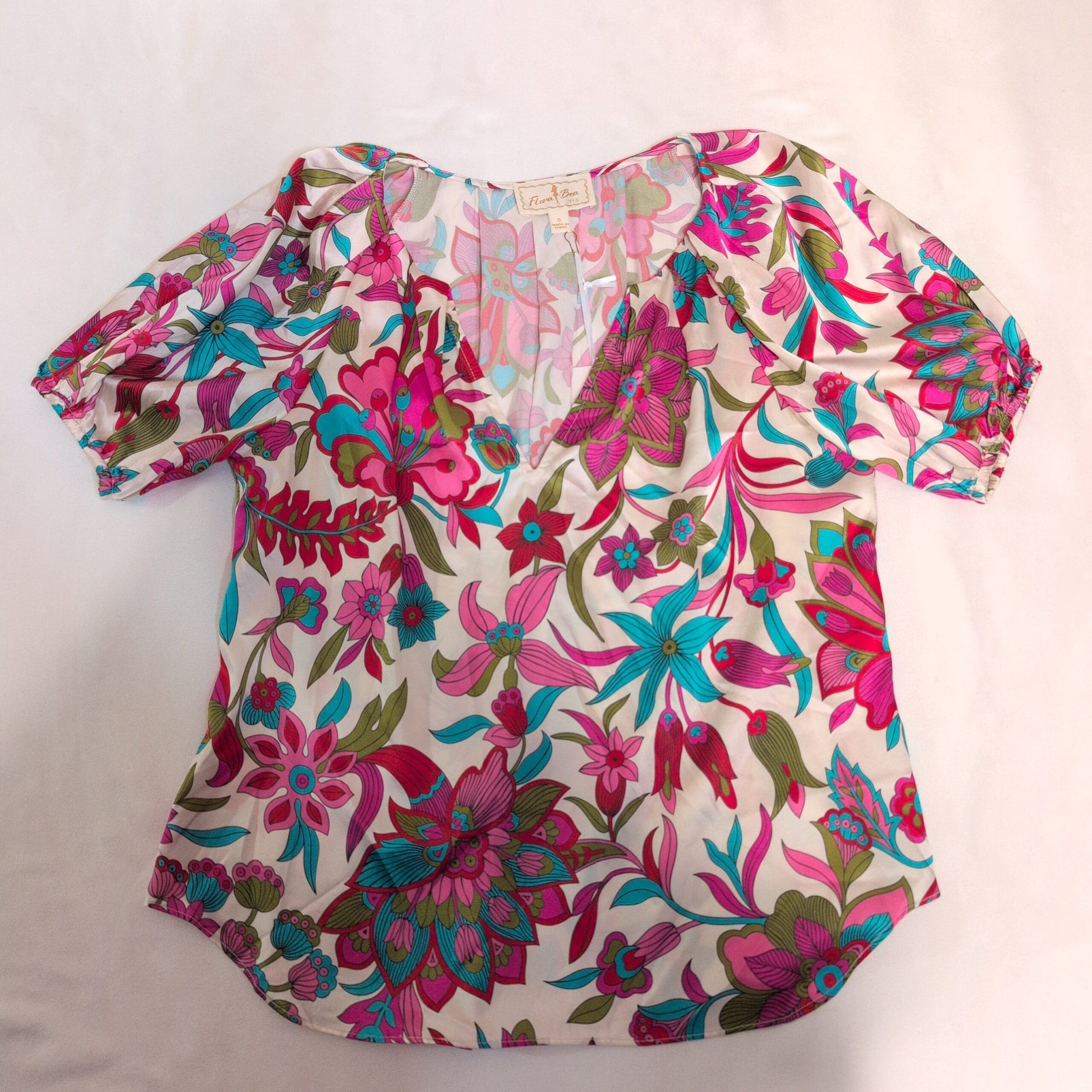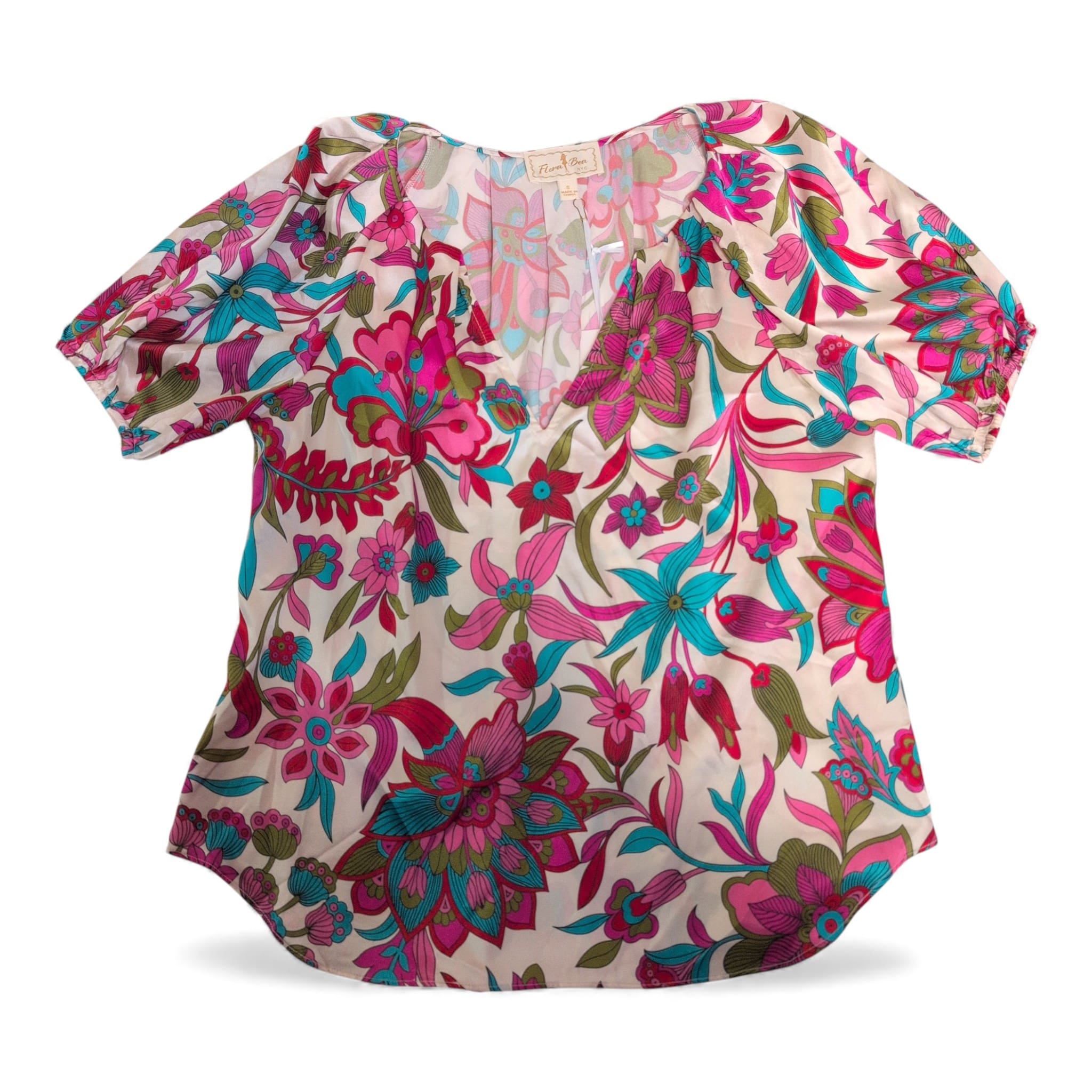 Flora Bea 100% silk short-sleeve blouse in a vibrant pink floral print. Size S (standard). Features a flattering V-neck, relaxed silhouette, and gently elasticized short sleeves for a polished yet comfortable look. Lightweight, luxurious silk with bold teal, magenta, and olive floral motifs — perfect for dressing up or casual weekends. Condition: New with tags. Care: dry clean recommended.