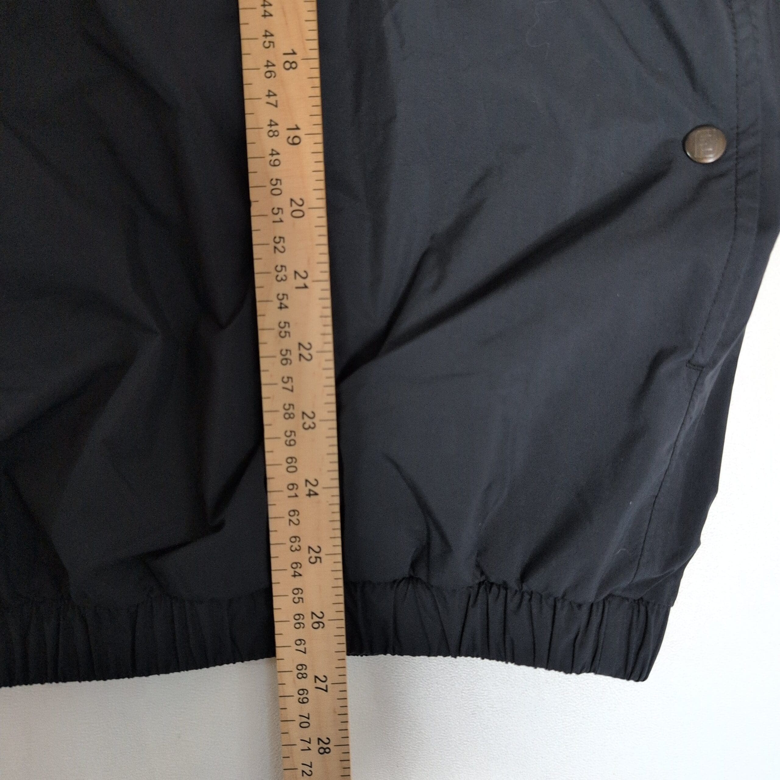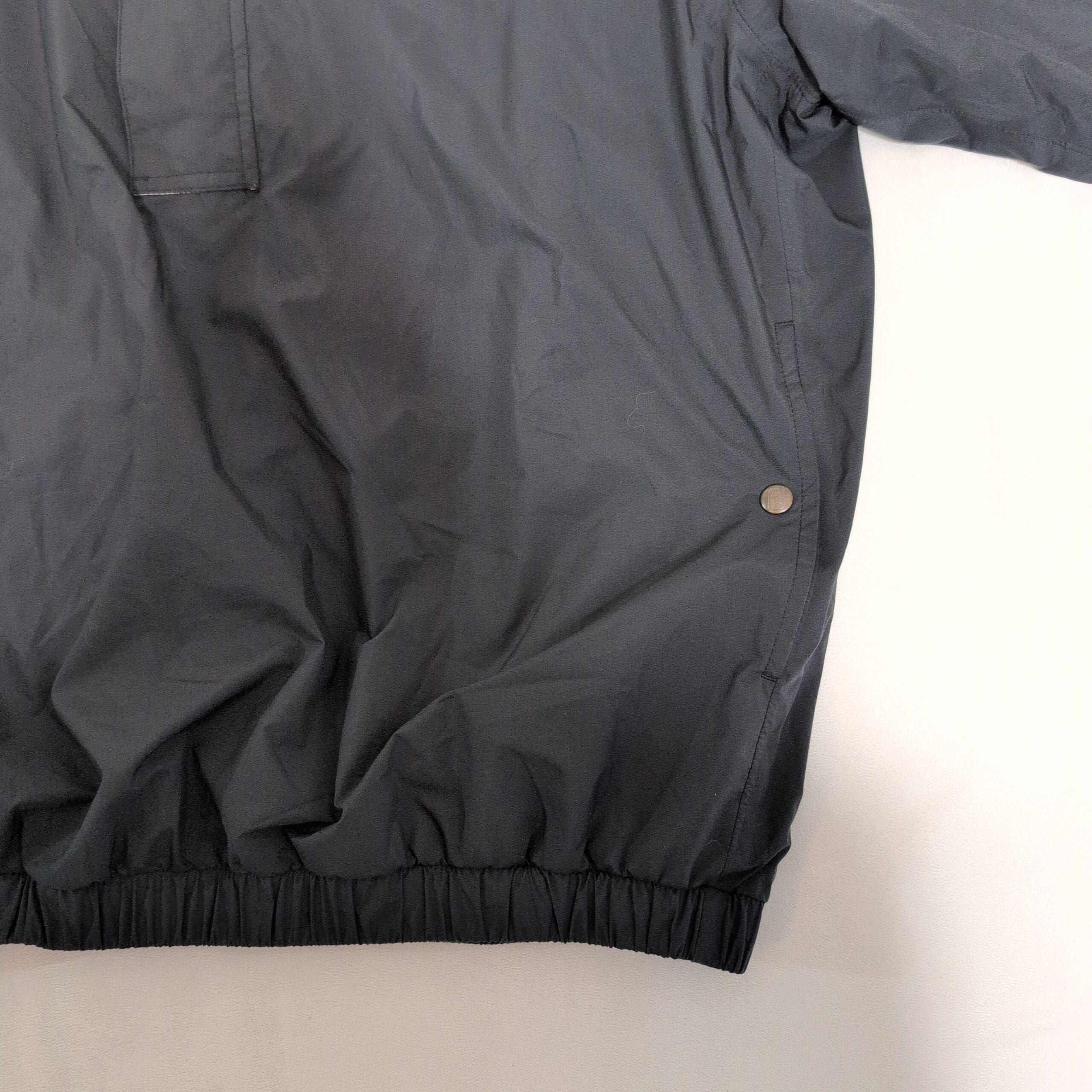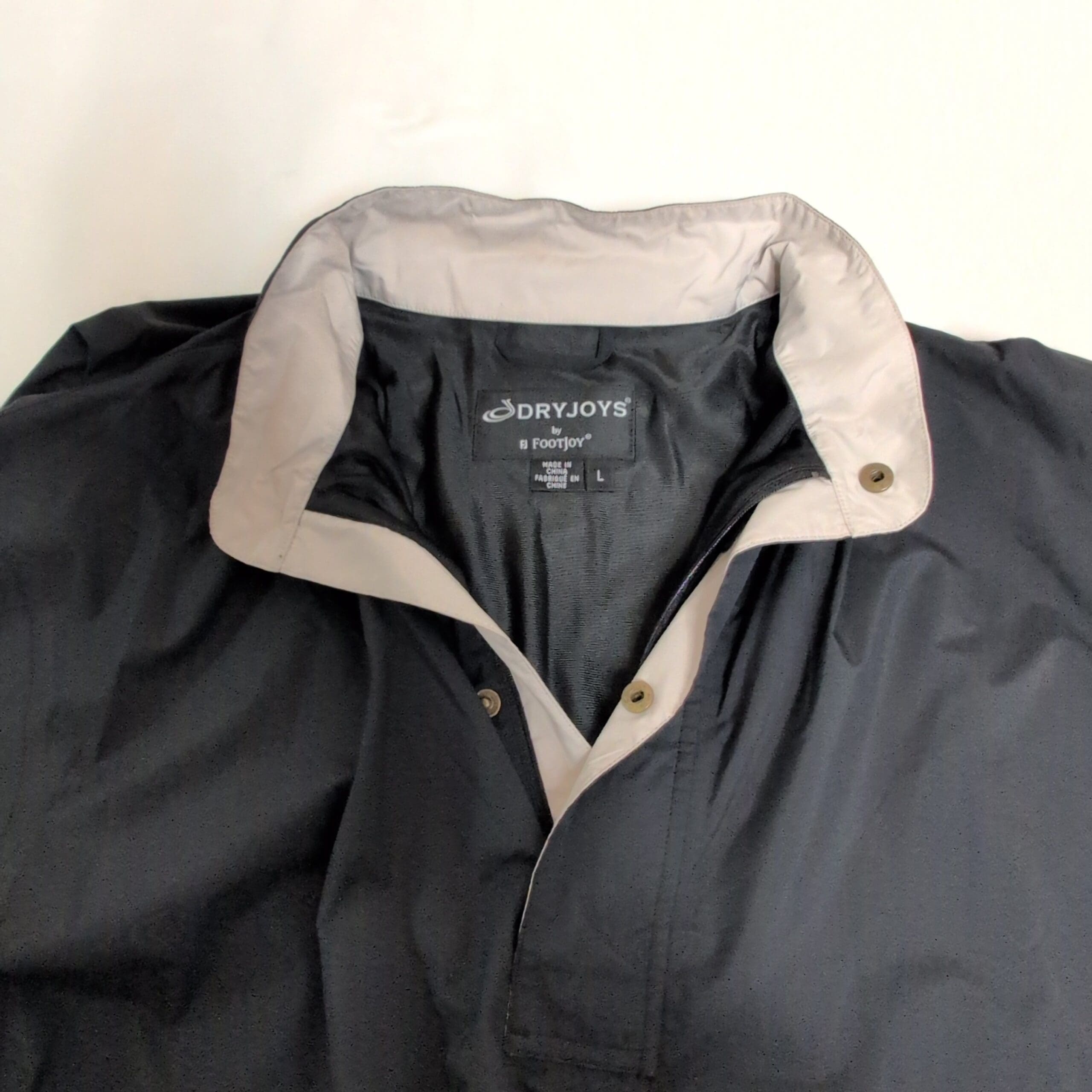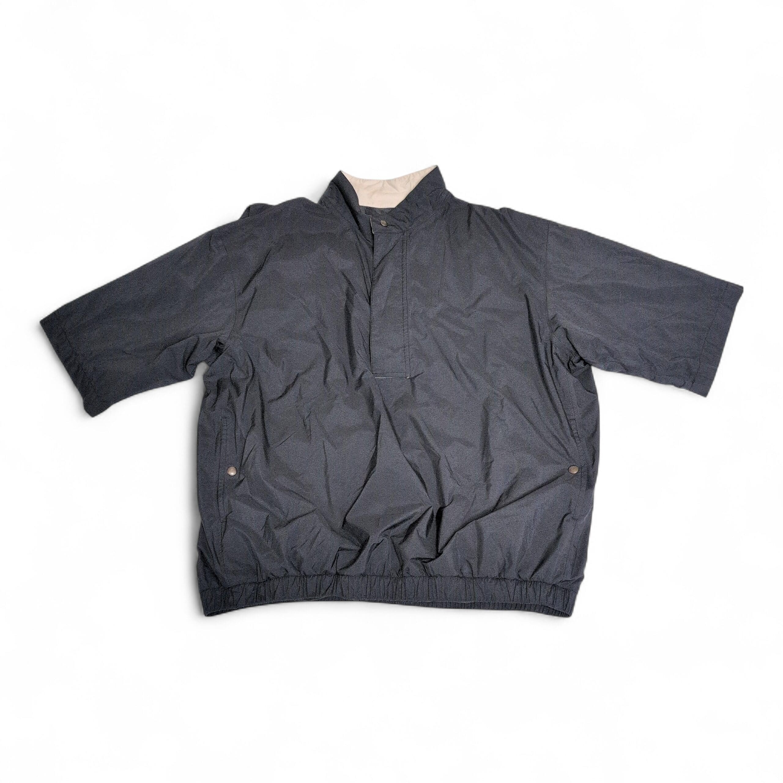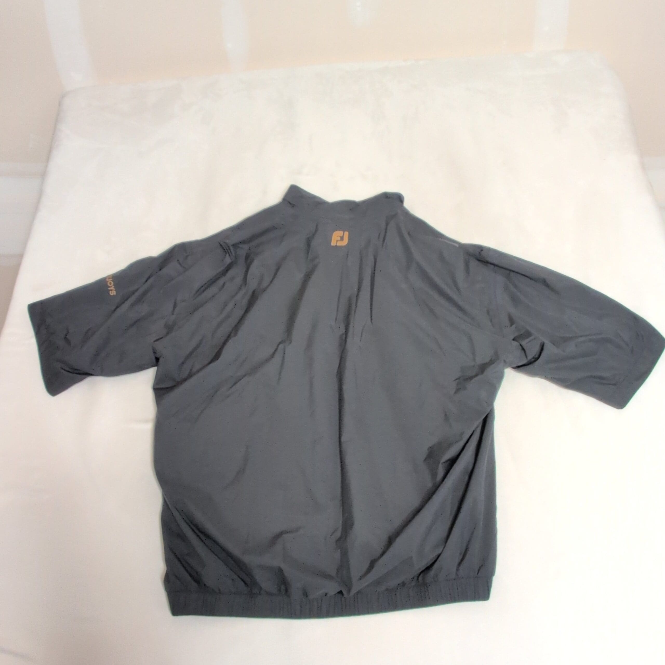 FootJoy men’s short-sleeve lightweight pullover jacket in black. Size L. Features a stand collar with partial snap placket, short sleeves for breathability, two snap-side pockets, elasticized hem for a secure fit, and a smooth water-resistant shell — ideal for golf or casual layering. Subtle beige collar lining adds contrast. Gently used with light surface wear and normal creasing from storage; see photos for details.