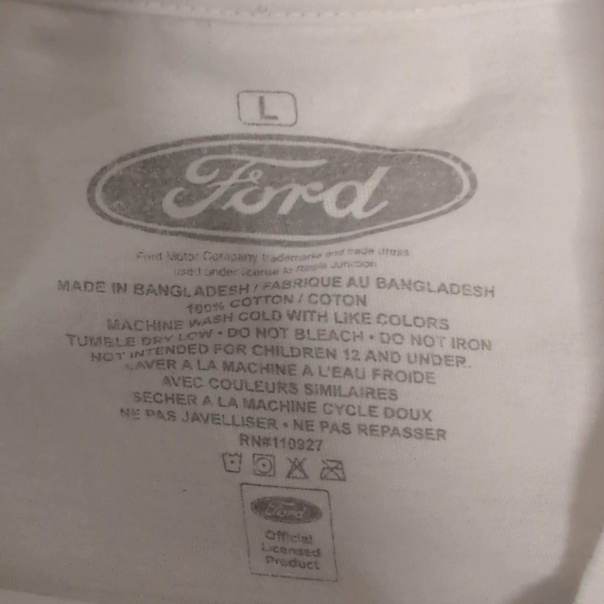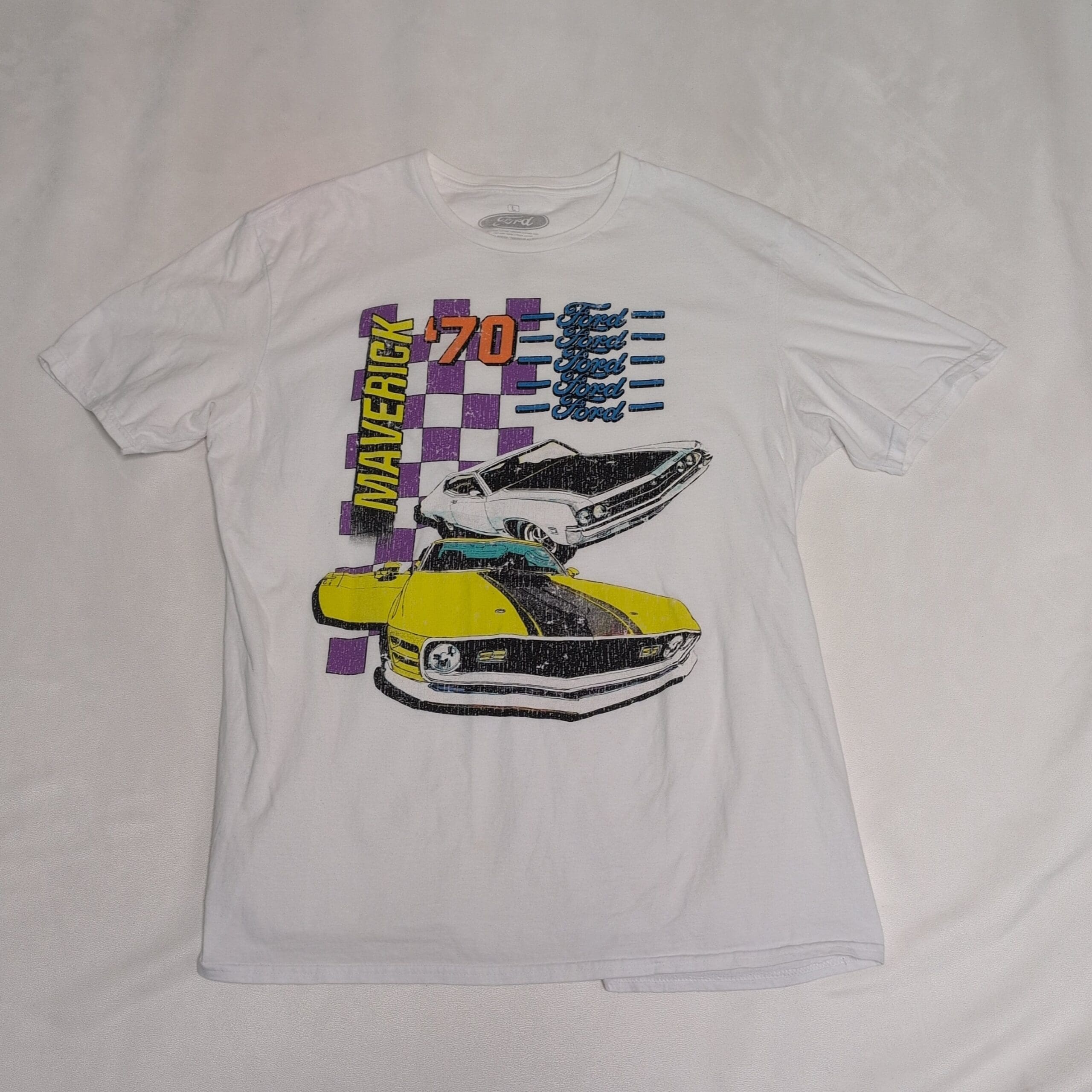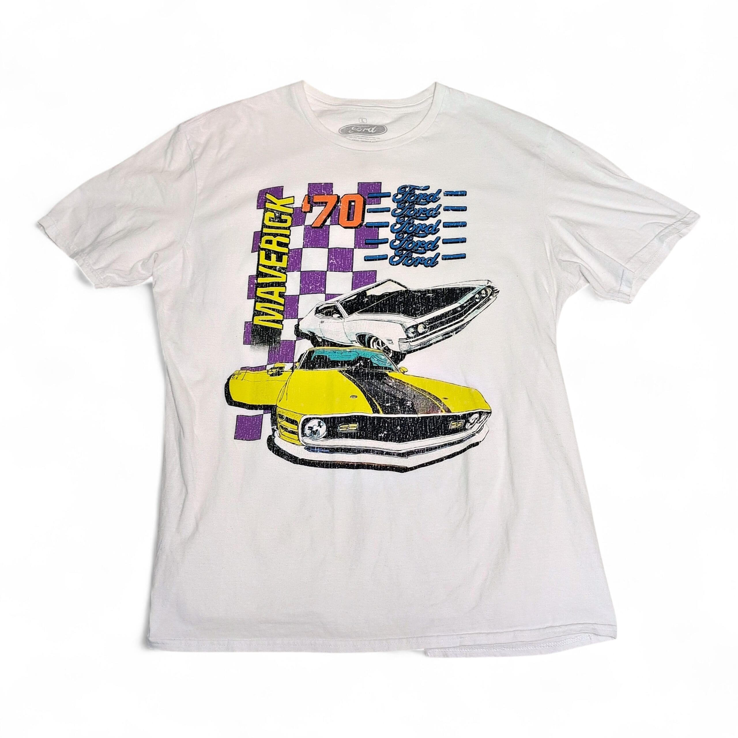 White Ford Maverick ’70 graphic short-sleeve tee in men’s size L. Features a large vintage-style front print with two classic cars, checkerboard accents and bold “Maverick” text in yellow, purple and black. Ribbed crew neck and soft cotton knit (fabric content not listed).