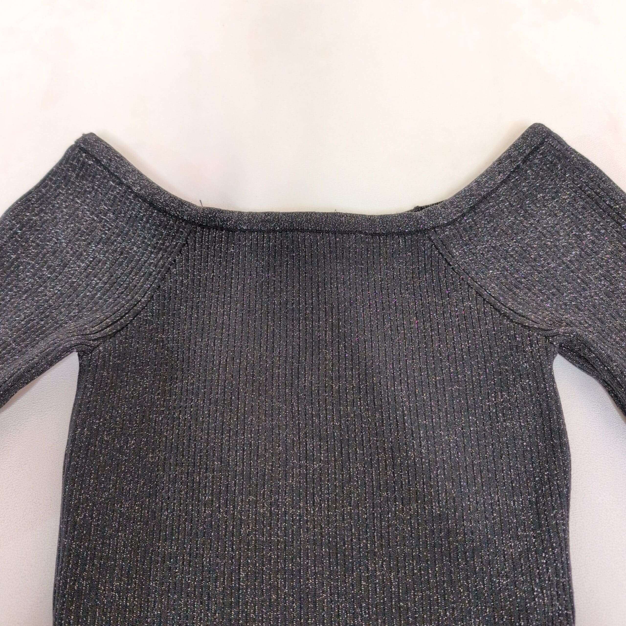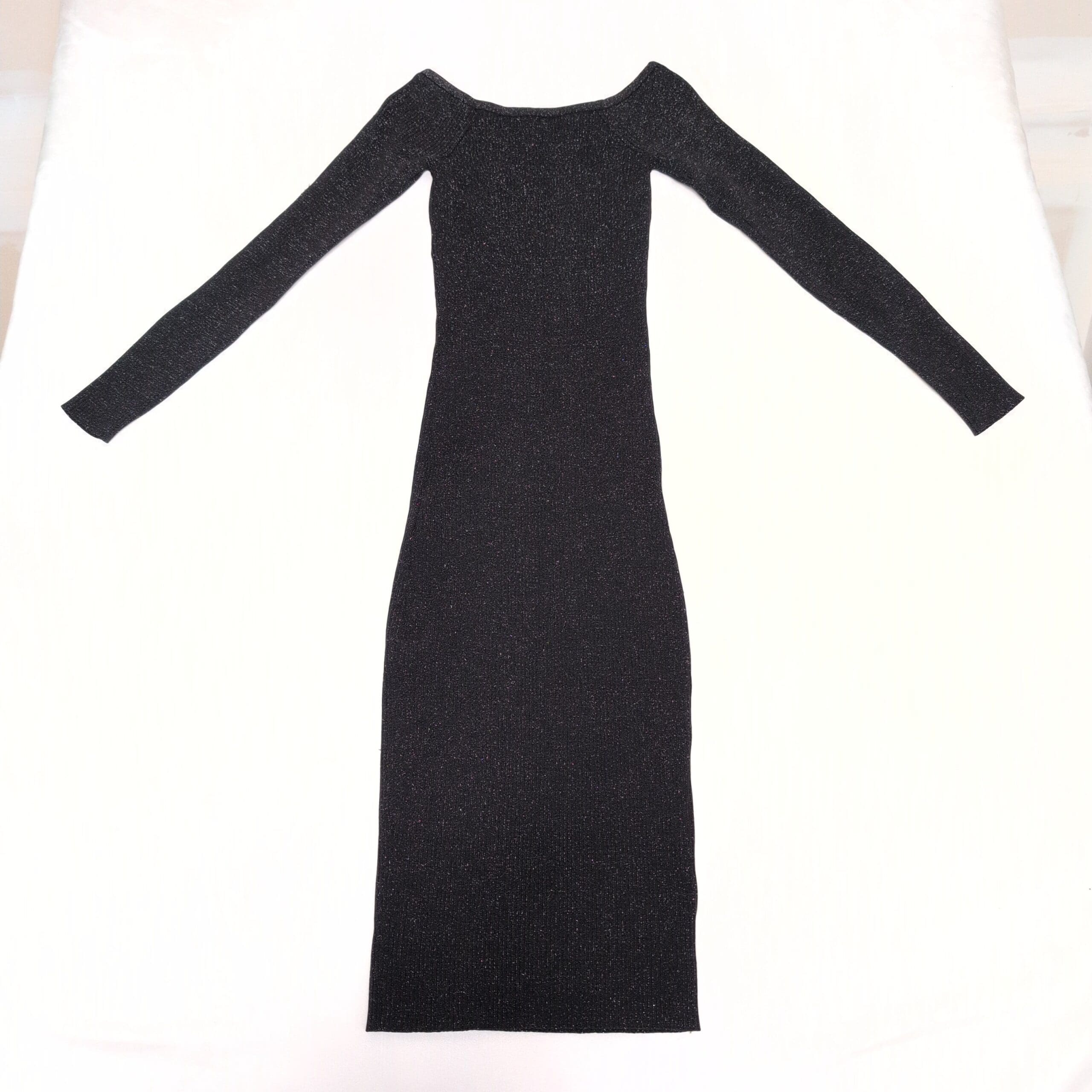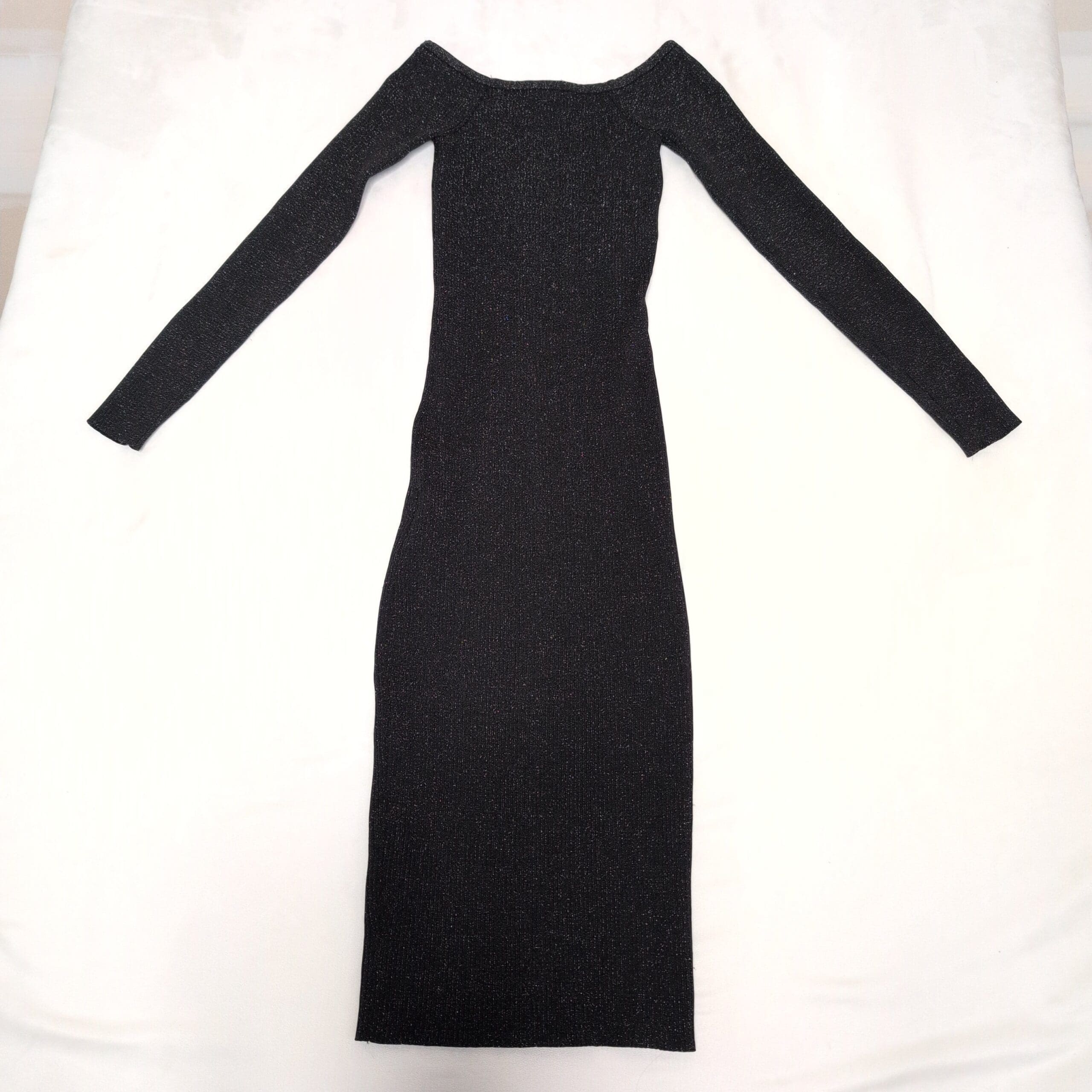Classic Forever 21 black midi dress with a subtle metallic shimmer. Features an off-shoulder boat neckline and long sleeves for an elegant, streamlined look. Form-fitting, body-skimming silhouette with gentle stretch for comfortable wear. Size M (standard). Gently used; minimal signs of wear.