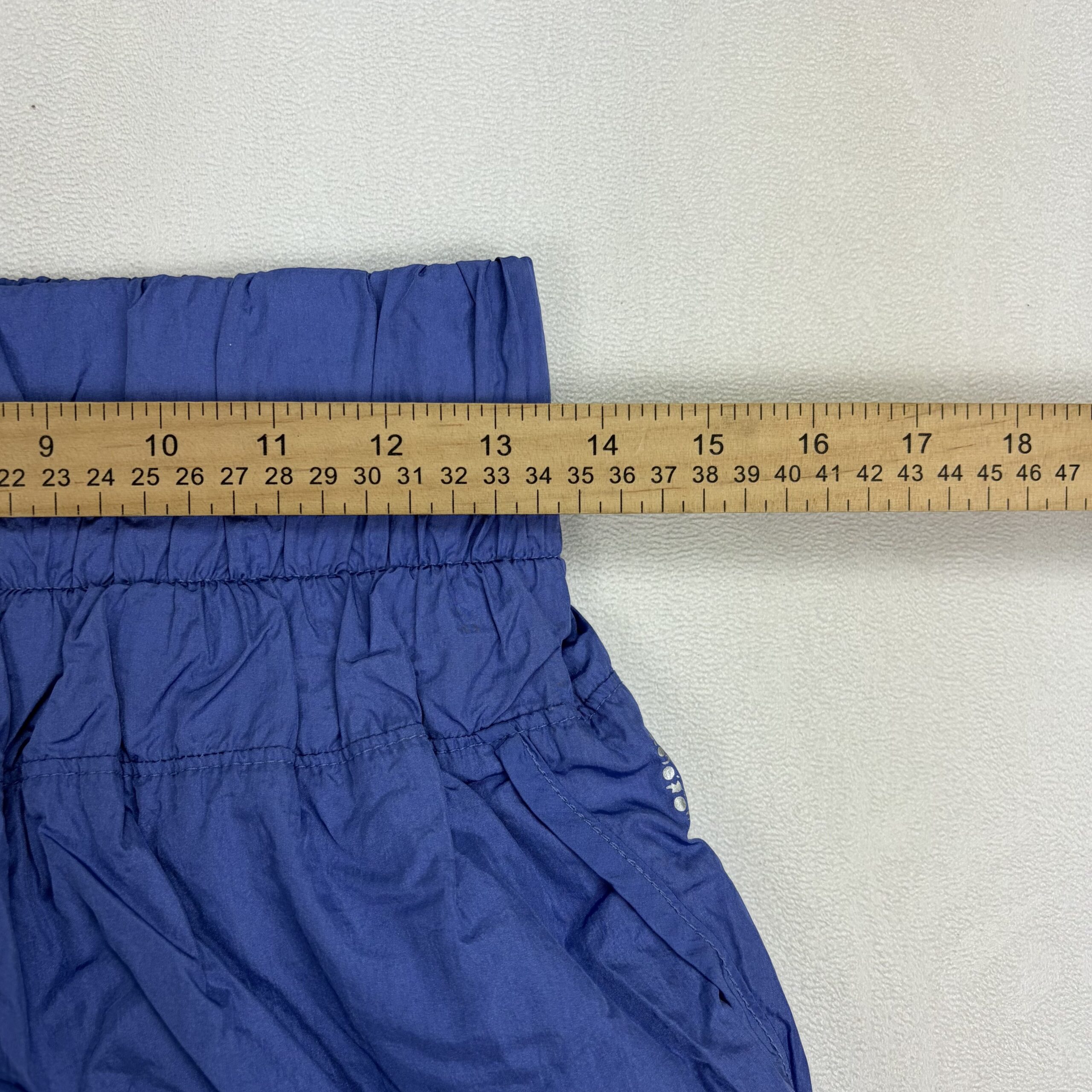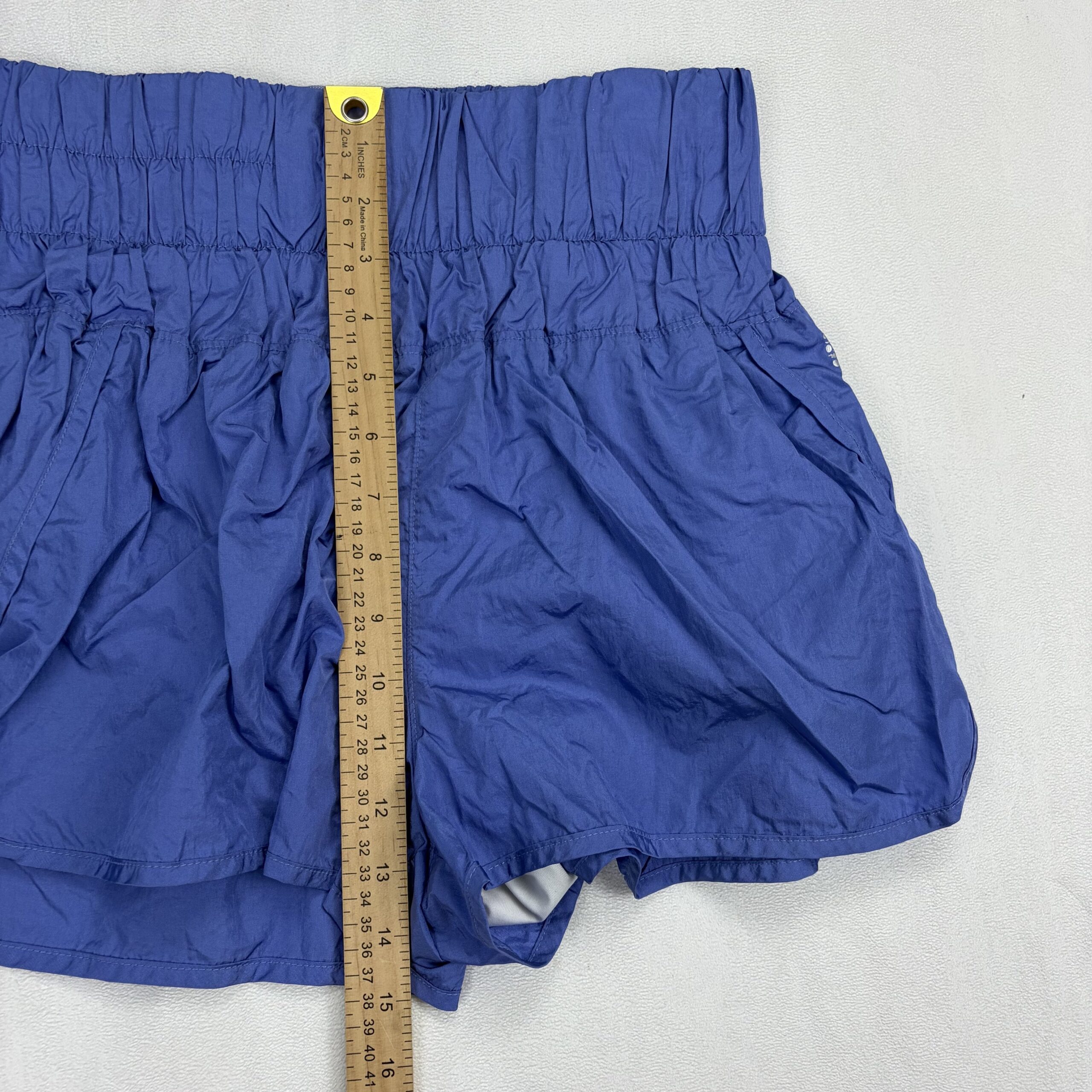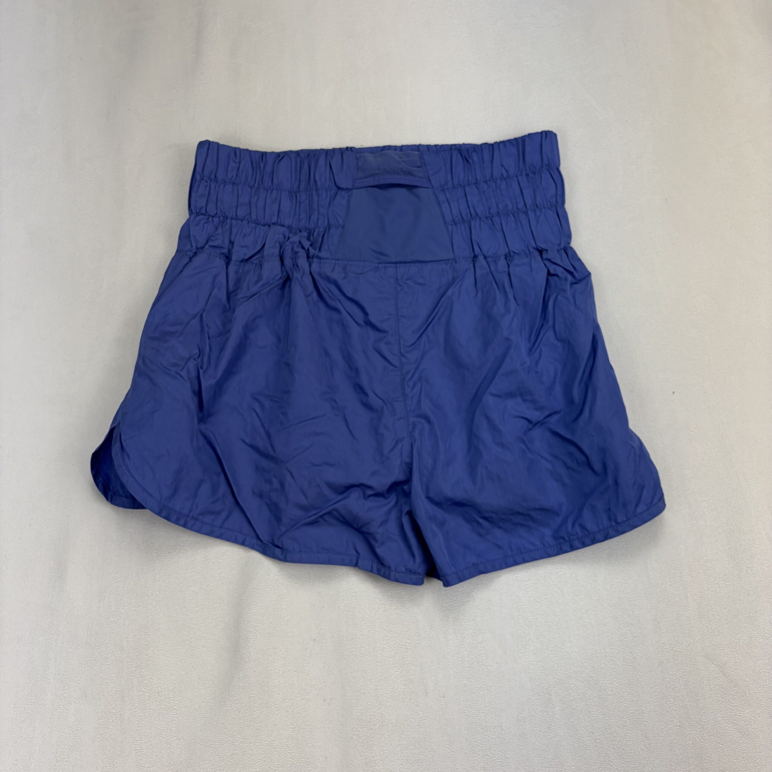 FP Movement by Free People women’s athletic shorts in size M. Vibrant royal/periwinkle blue with a high smocked elastic waistband for a secure, comfortable fit. Lightweight woven shell with a built-in white liner, curved hem, and side pockets for convenience. Small reflective FP Movement logo at the right hip. Versatile for running, studio classes, or casual wear.