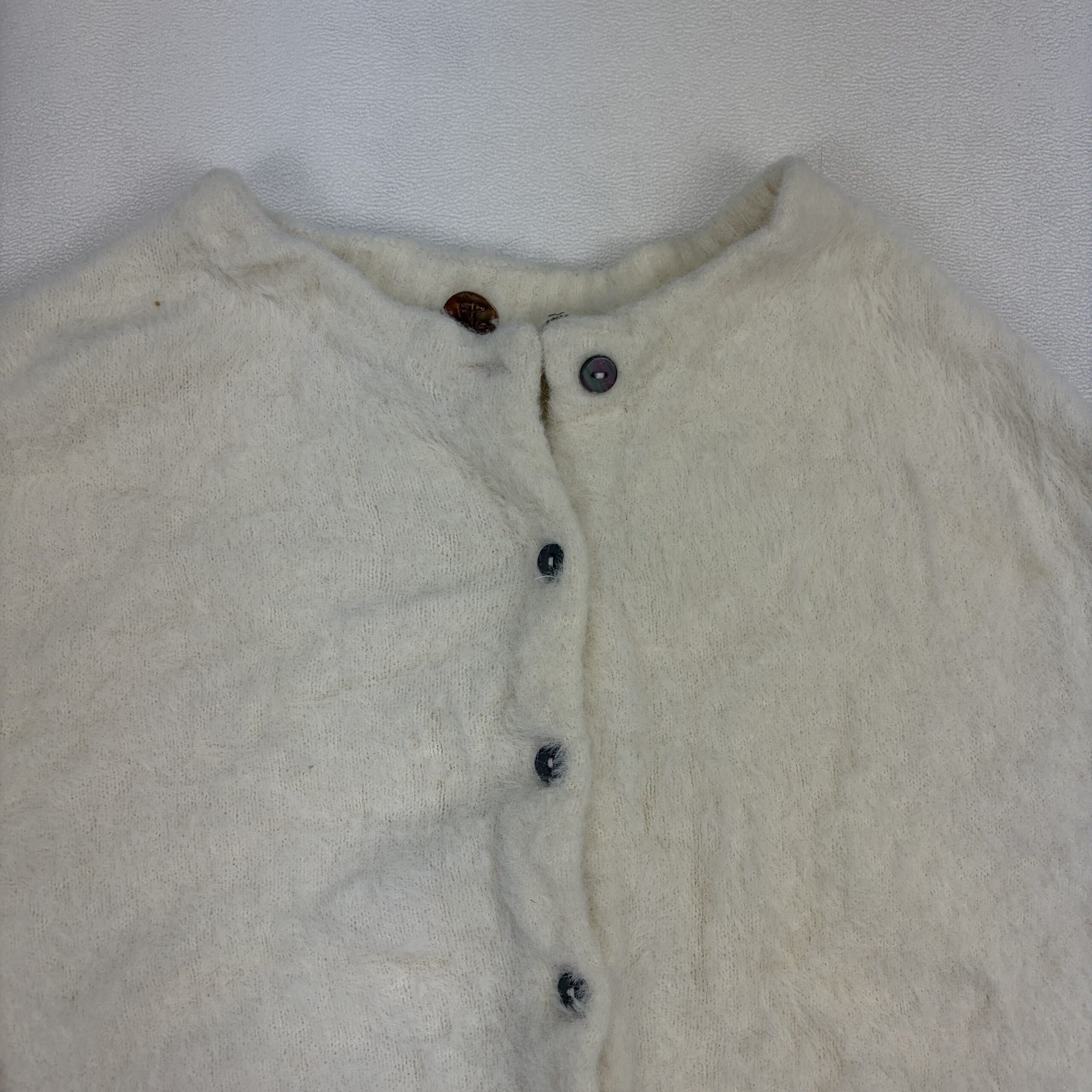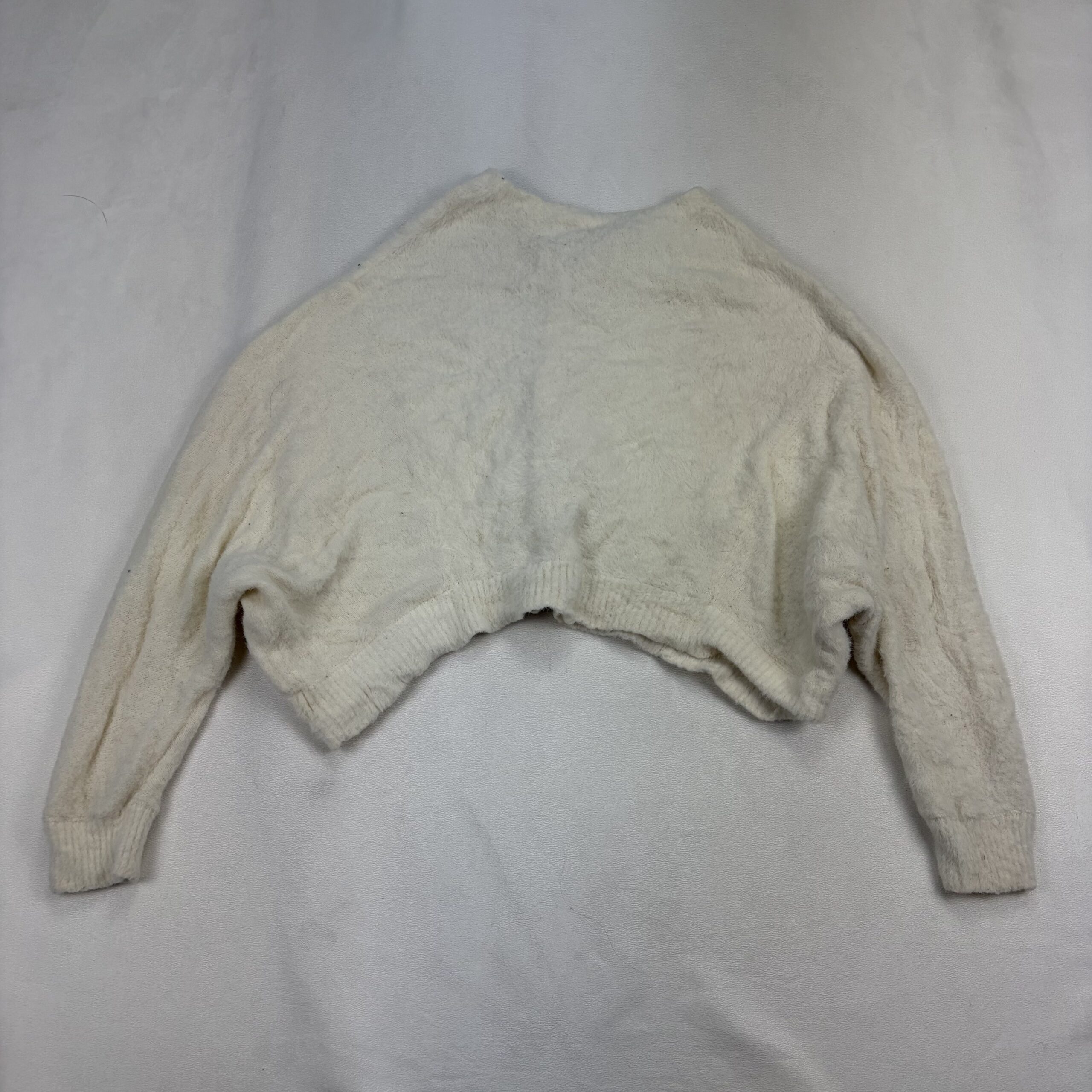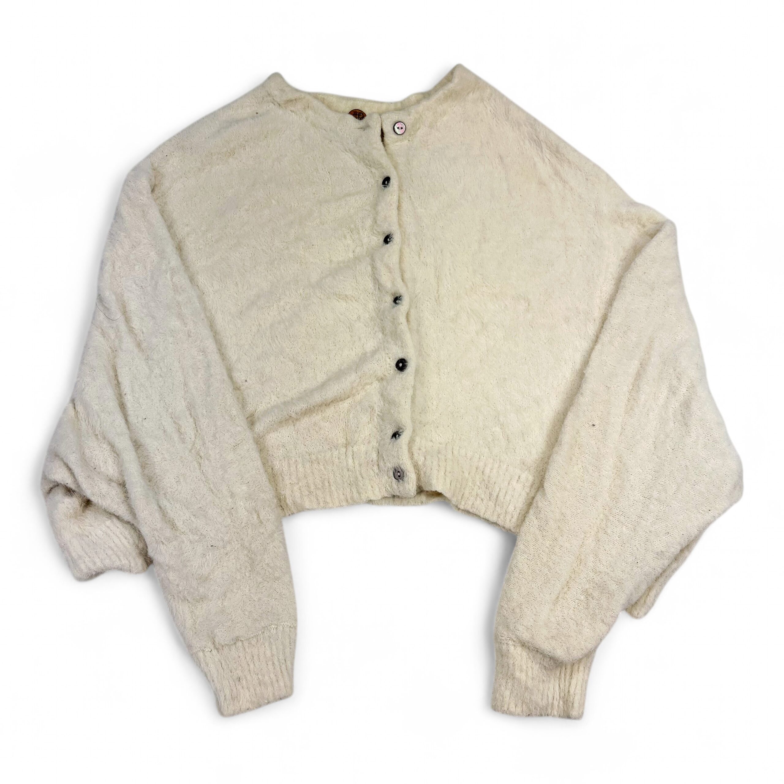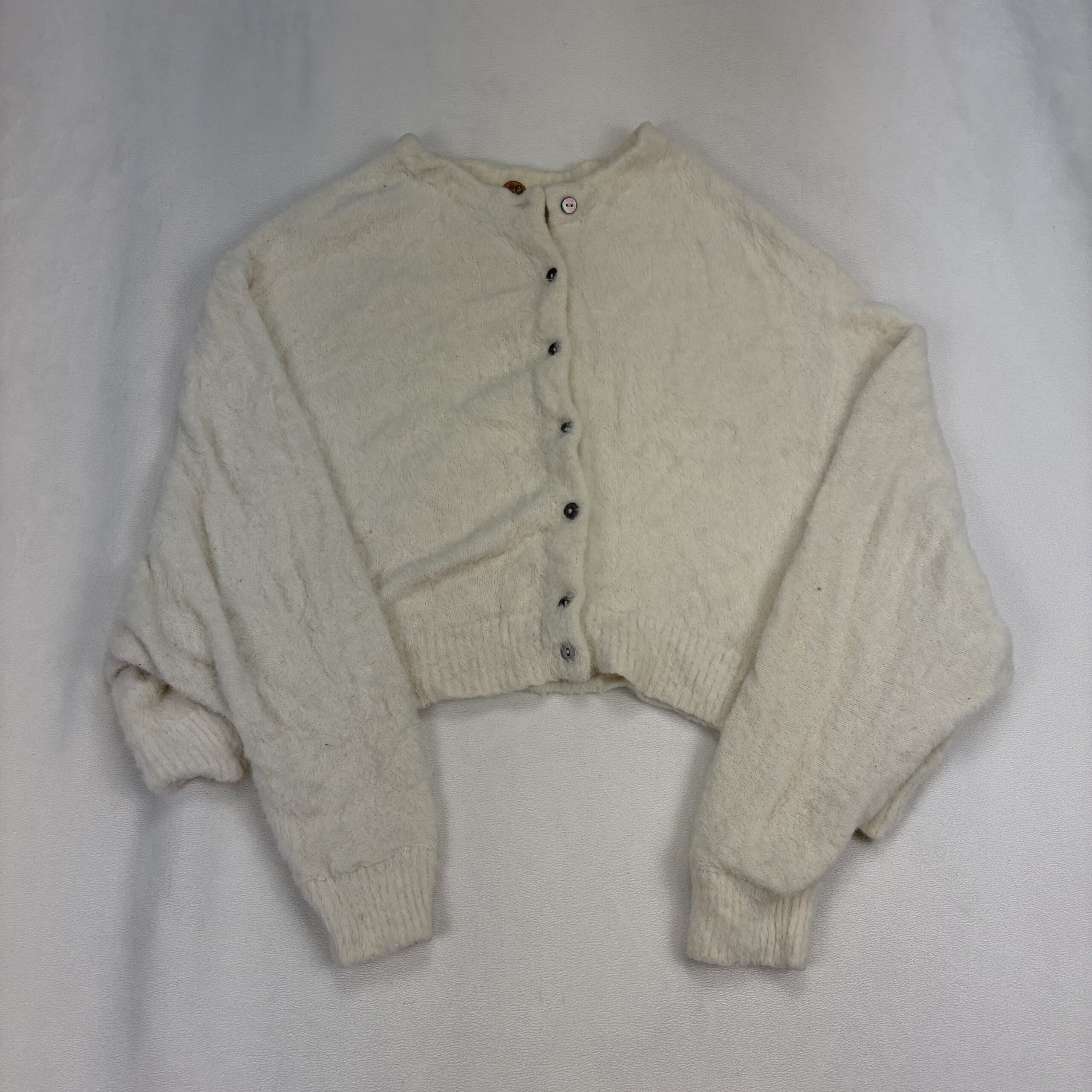 Free People cream/ivory cropped fuzzy button-up cardigan in size XS. Features a soft textured knit, round neckline, full button front, ribbed cuffs and hem, and voluminous long sleeves for a cozy, on-trend look. Excellent used condition — no major rips, stains, or holes. Shows light pilling and gentle wear consistent with normal use. Tag/fiber content not listed; please see photos for details.