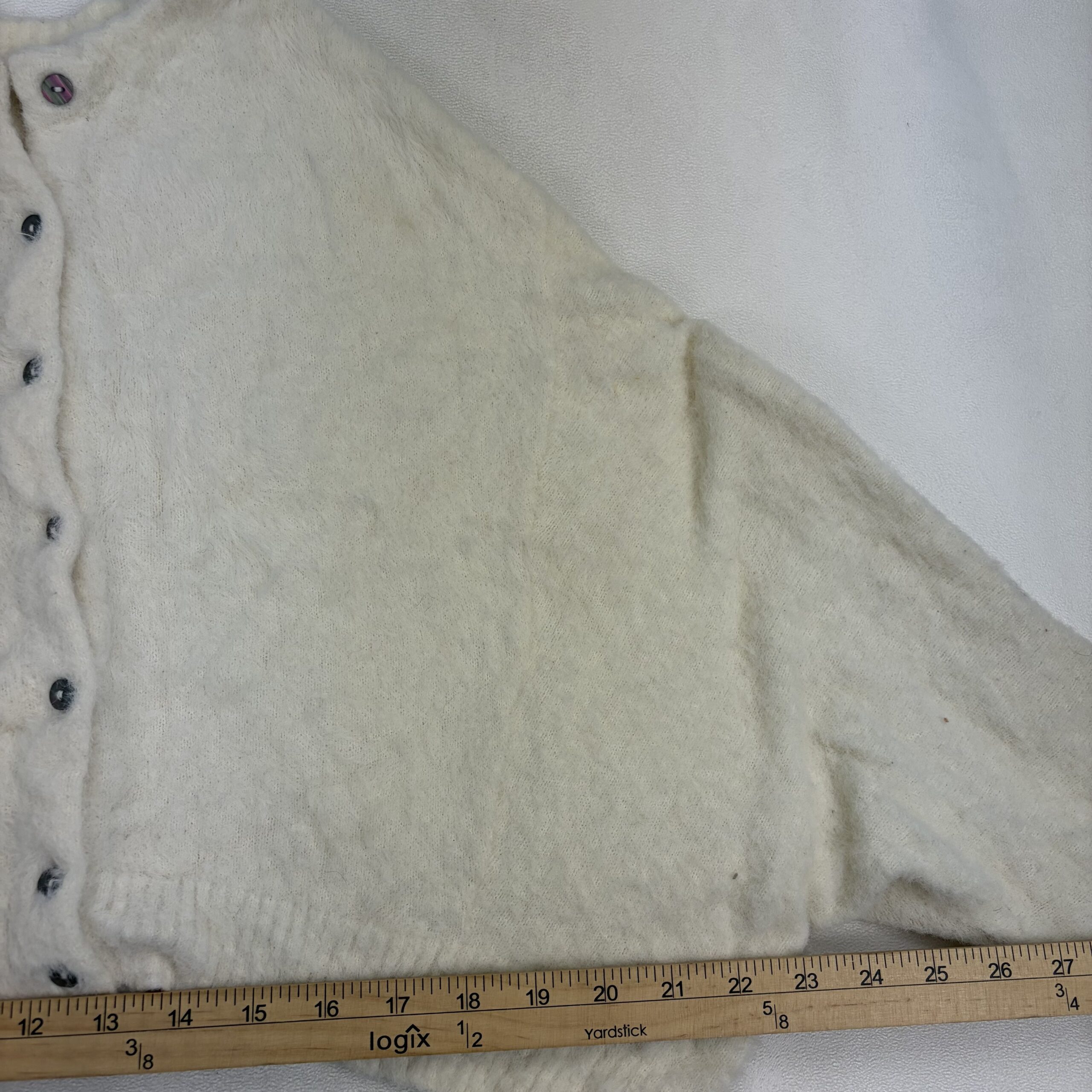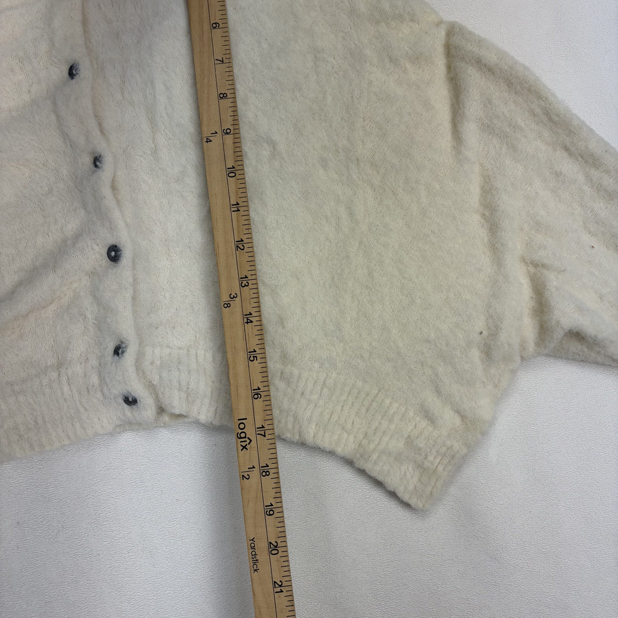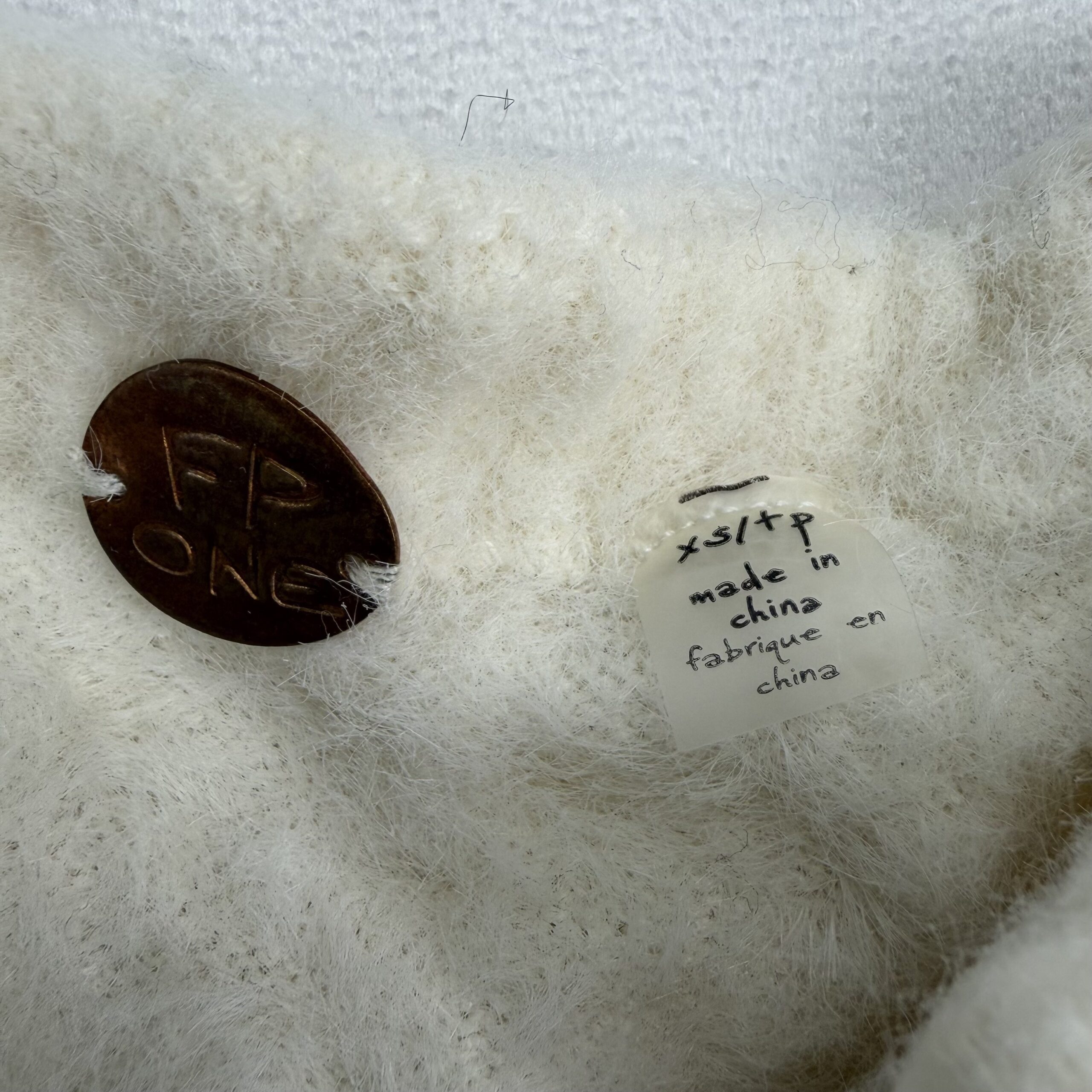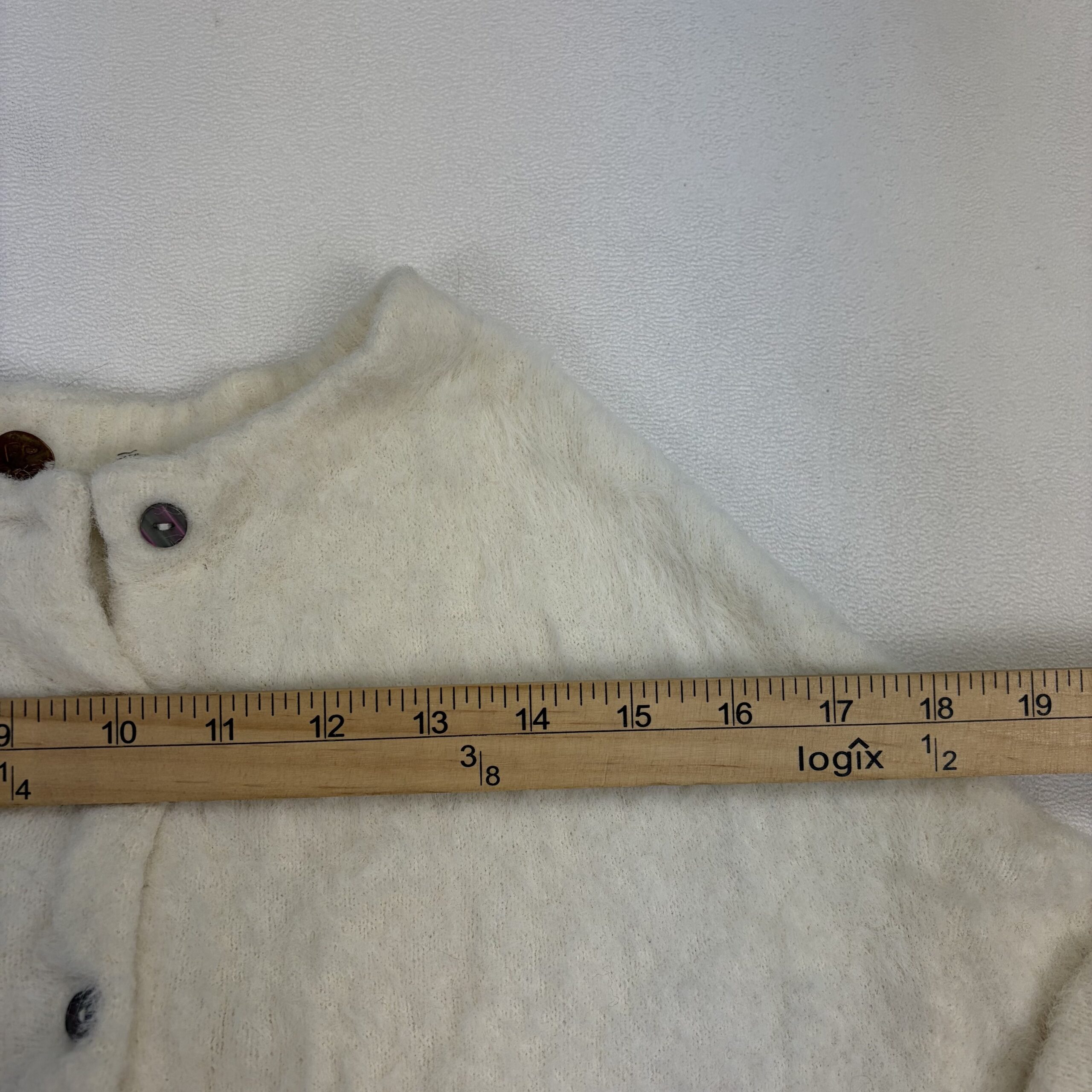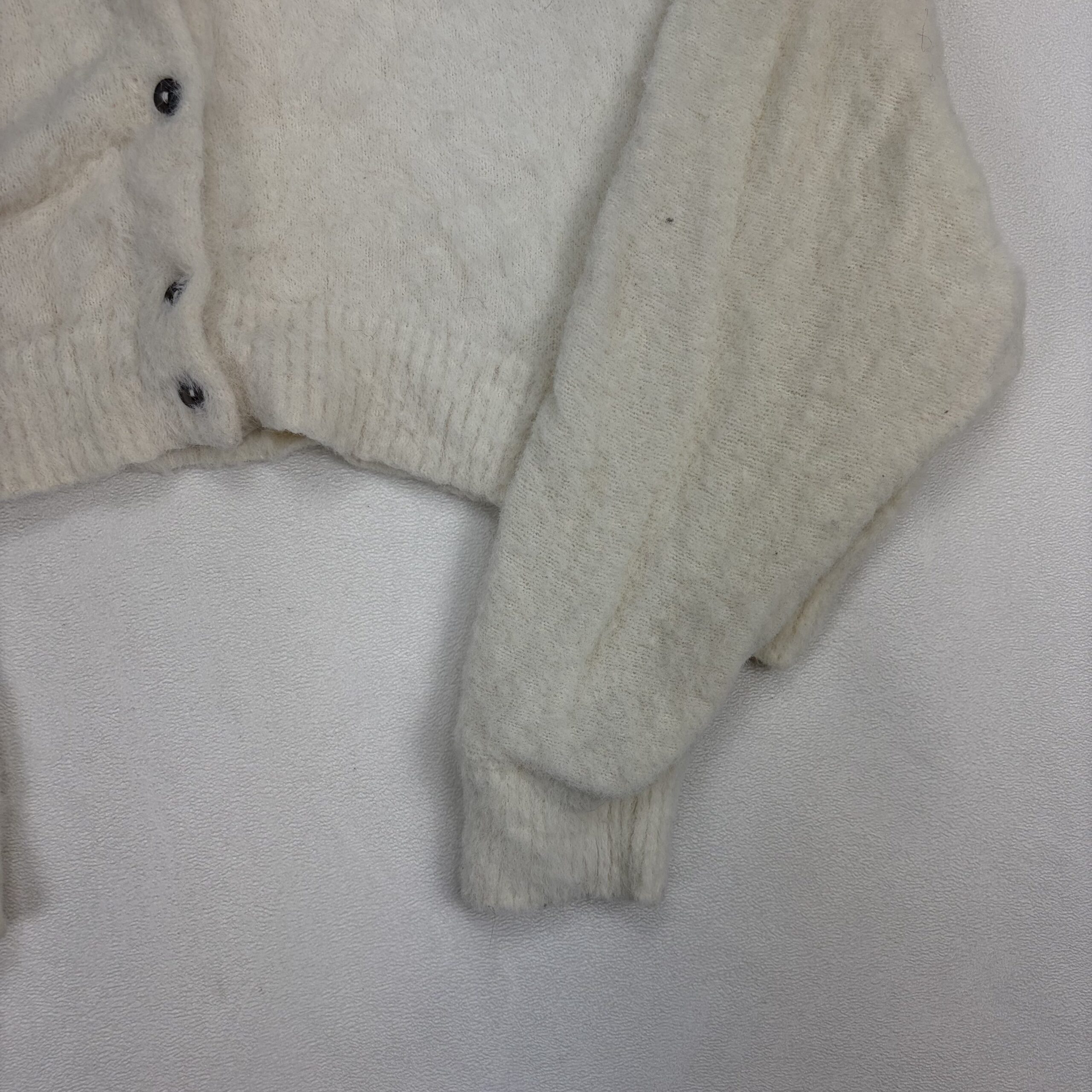 Free People cream/ivory cropped fuzzy button-up cardigan in size XS. Features a soft textured knit, round neckline, full button front, ribbed cuffs and hem, and voluminous long sleeves for a cozy, on-trend look. Excellent used condition — no major rips, stains, or holes. Shows light pilling and gentle wear consistent with normal use. Tag/fiber content not listed; please see photos for details.
