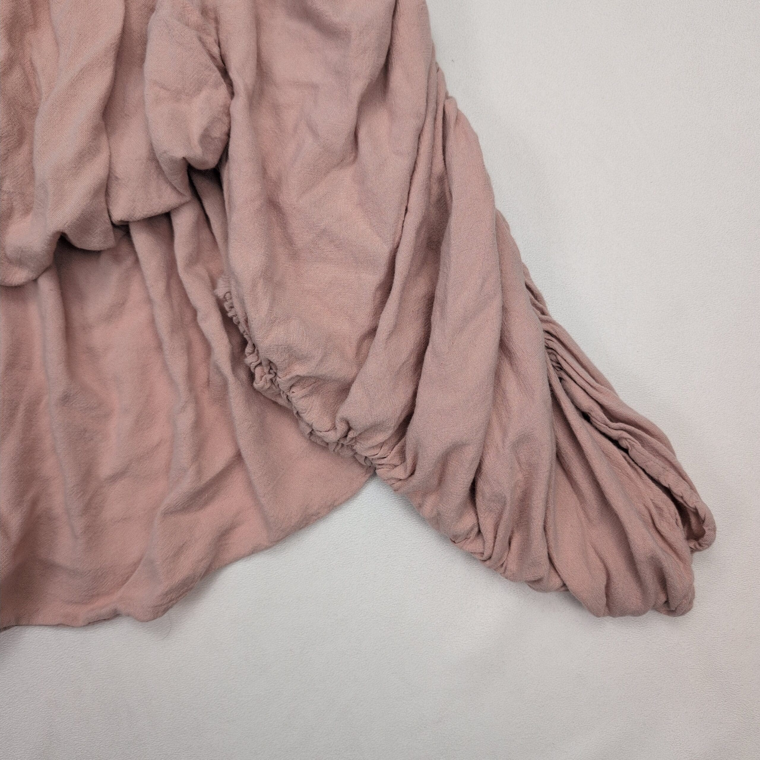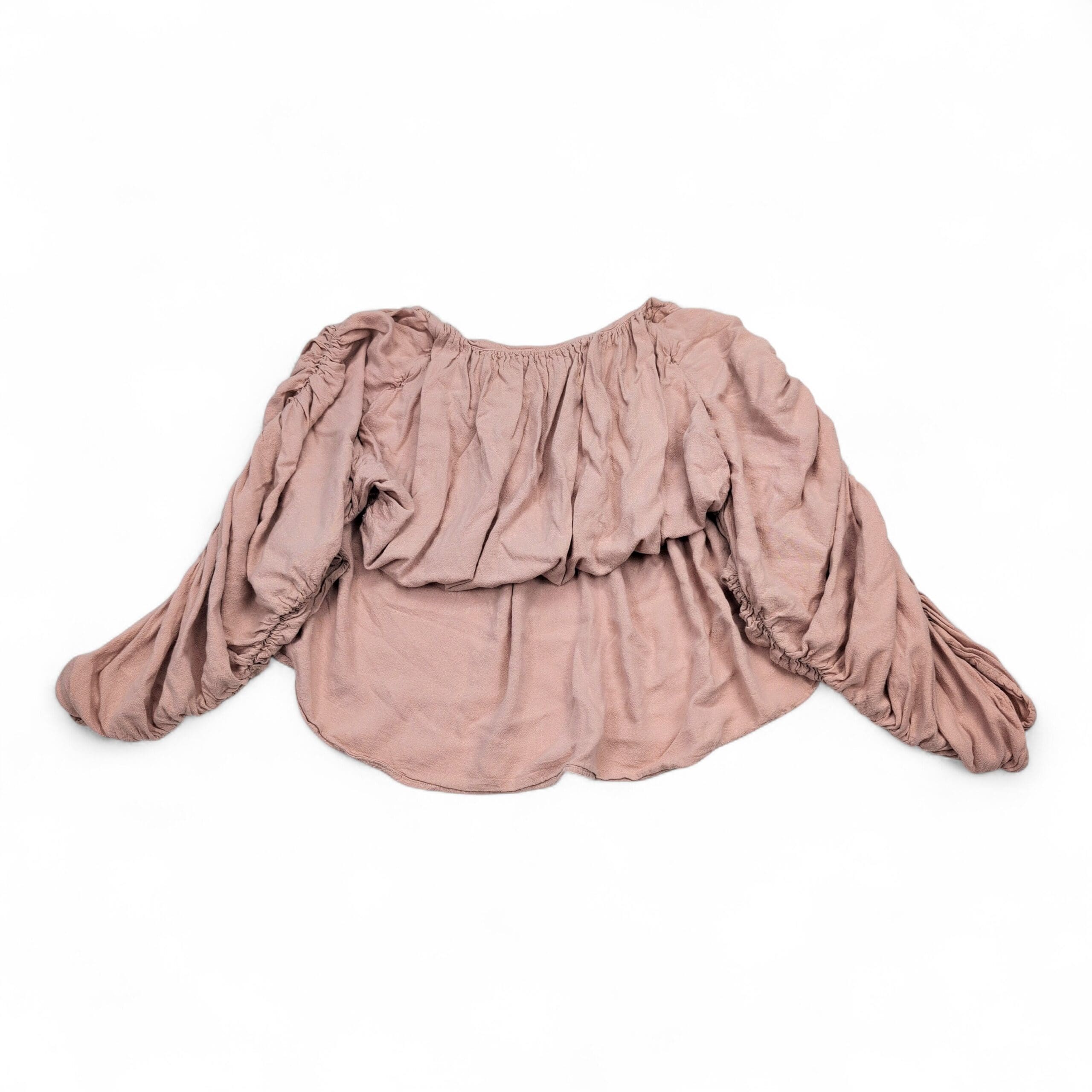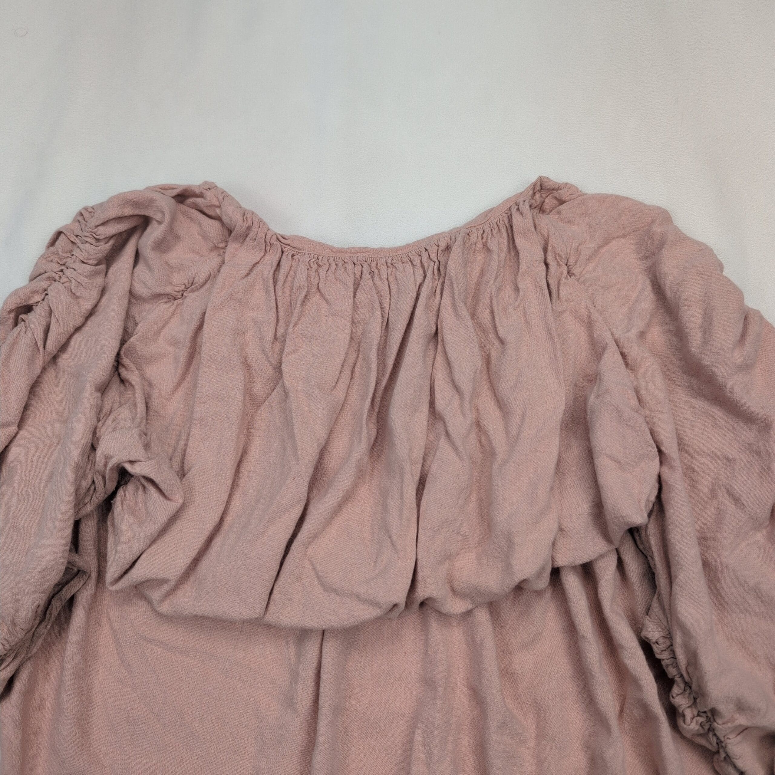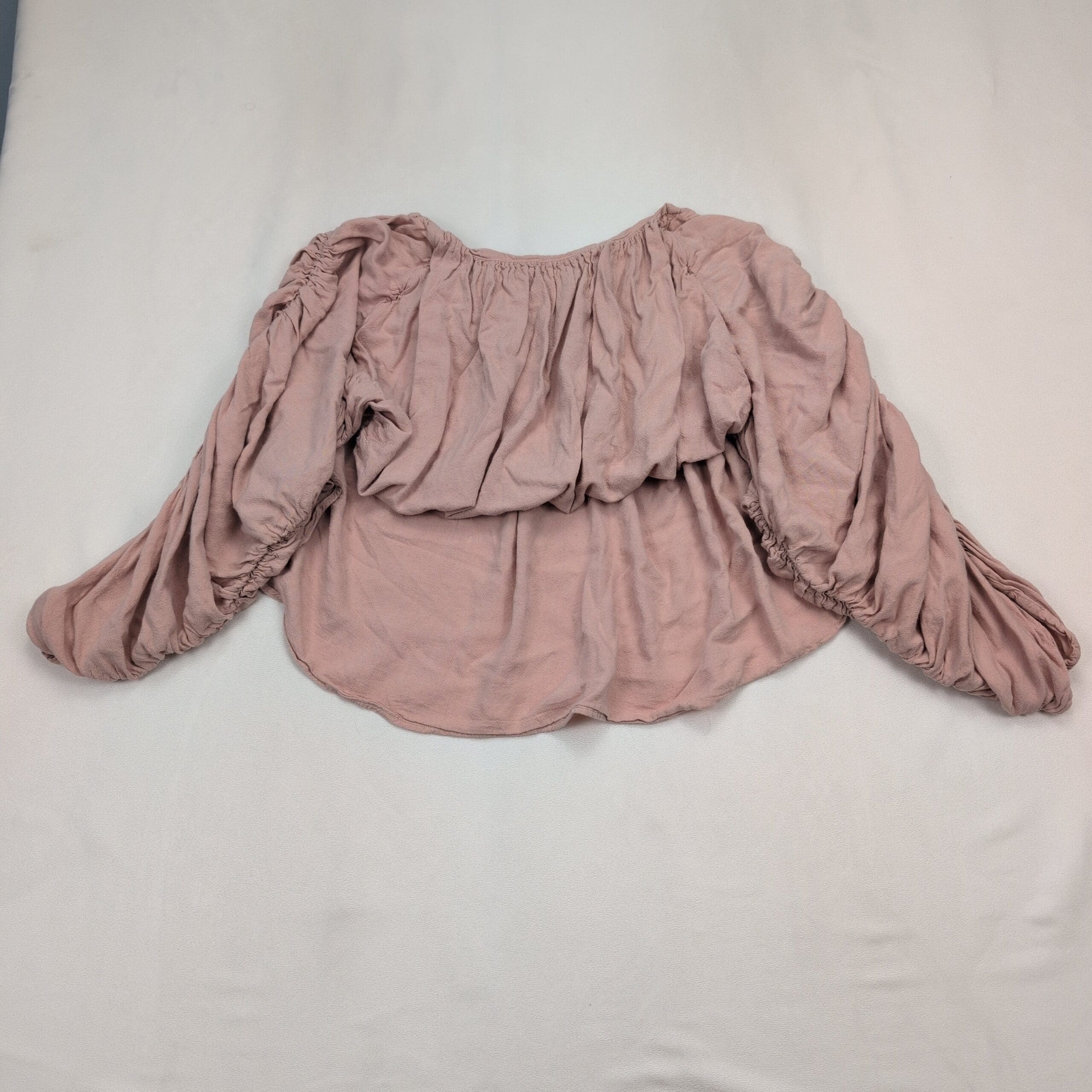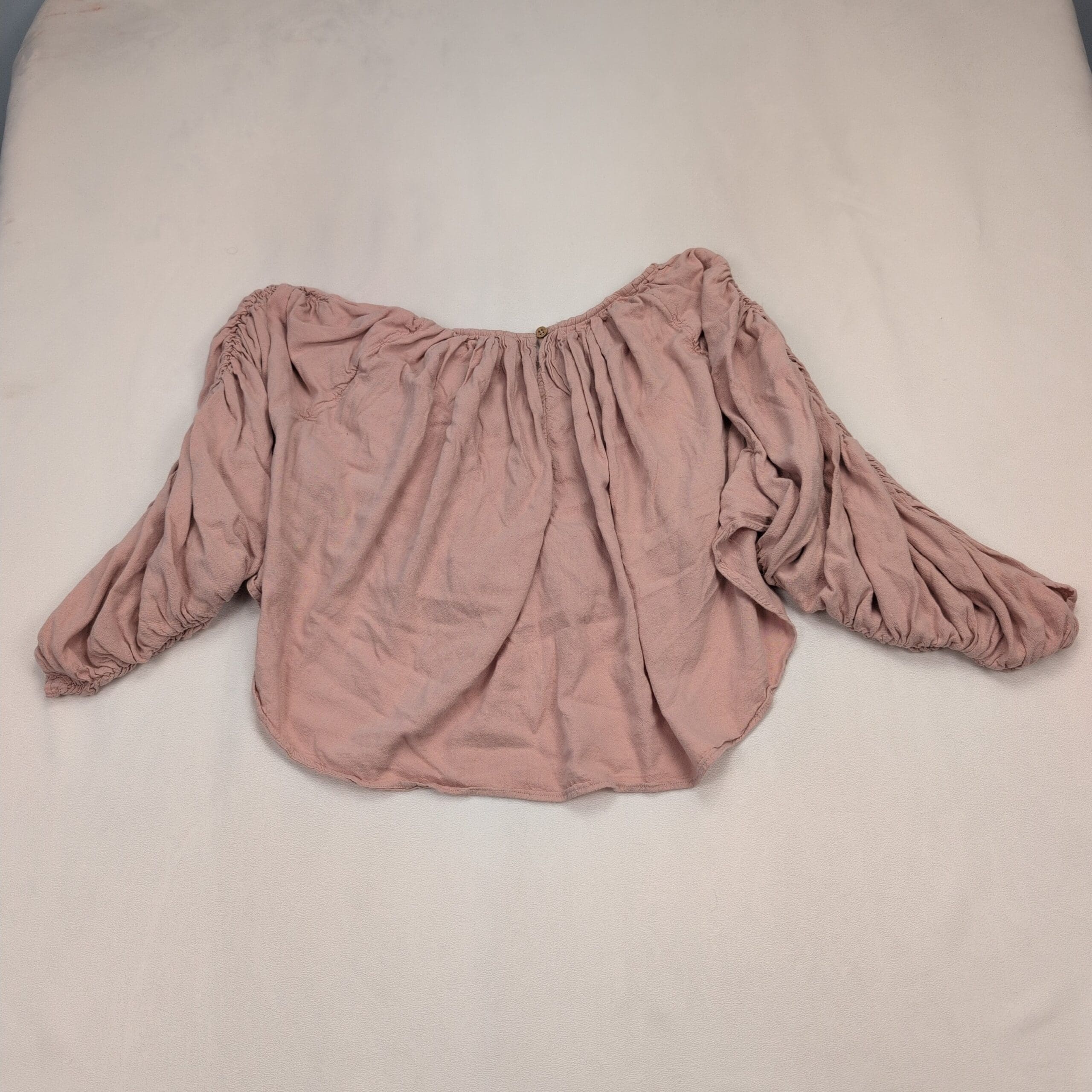 Free People off-shoulder peasant blouse in dusty rose/pale pink. Size S (women’s). Features an elasticized neckline for off-shoulder styling, a relaxed cropped body with soft drape, and voluminous ruched long sleeves with gathered detail and elastic cuffs. Excellent used condition — free of major rips, tears, stains, or flaws; typical light wear and wrinkling from storage may be present. See photos for color and condition.