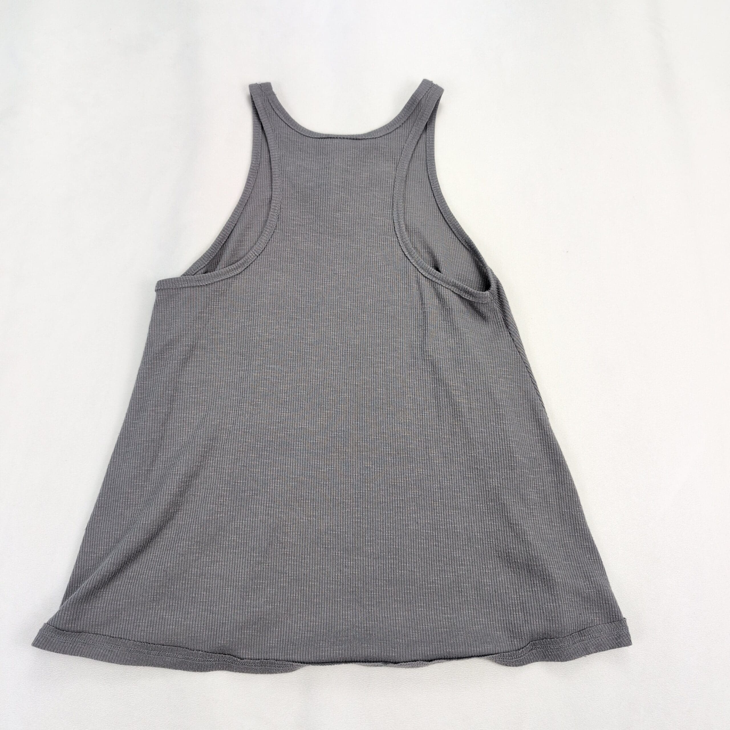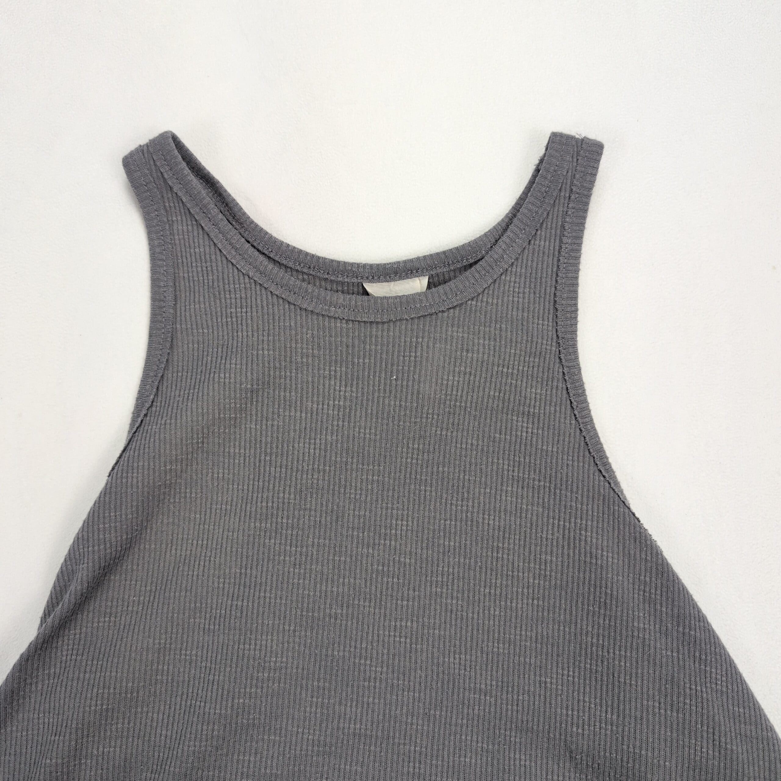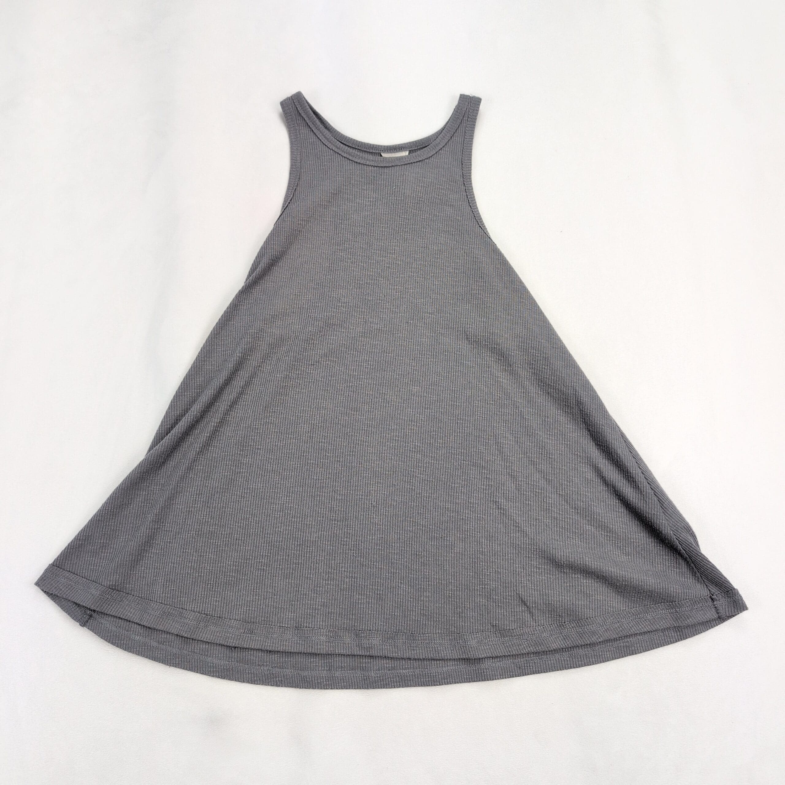 Free People ribbed tank top in soft gray, size S. High neckline with slim straps and an A-line, swing silhouette that drapes away from the body for a breezy, flattering fit. Lightweight stretch ribbed knit—perfect for layering or wearing solo for a casual, boho look. Excellent used condition: free of rips, stains, and major flaws; shows only light, typical wear consistent with gentle use.
