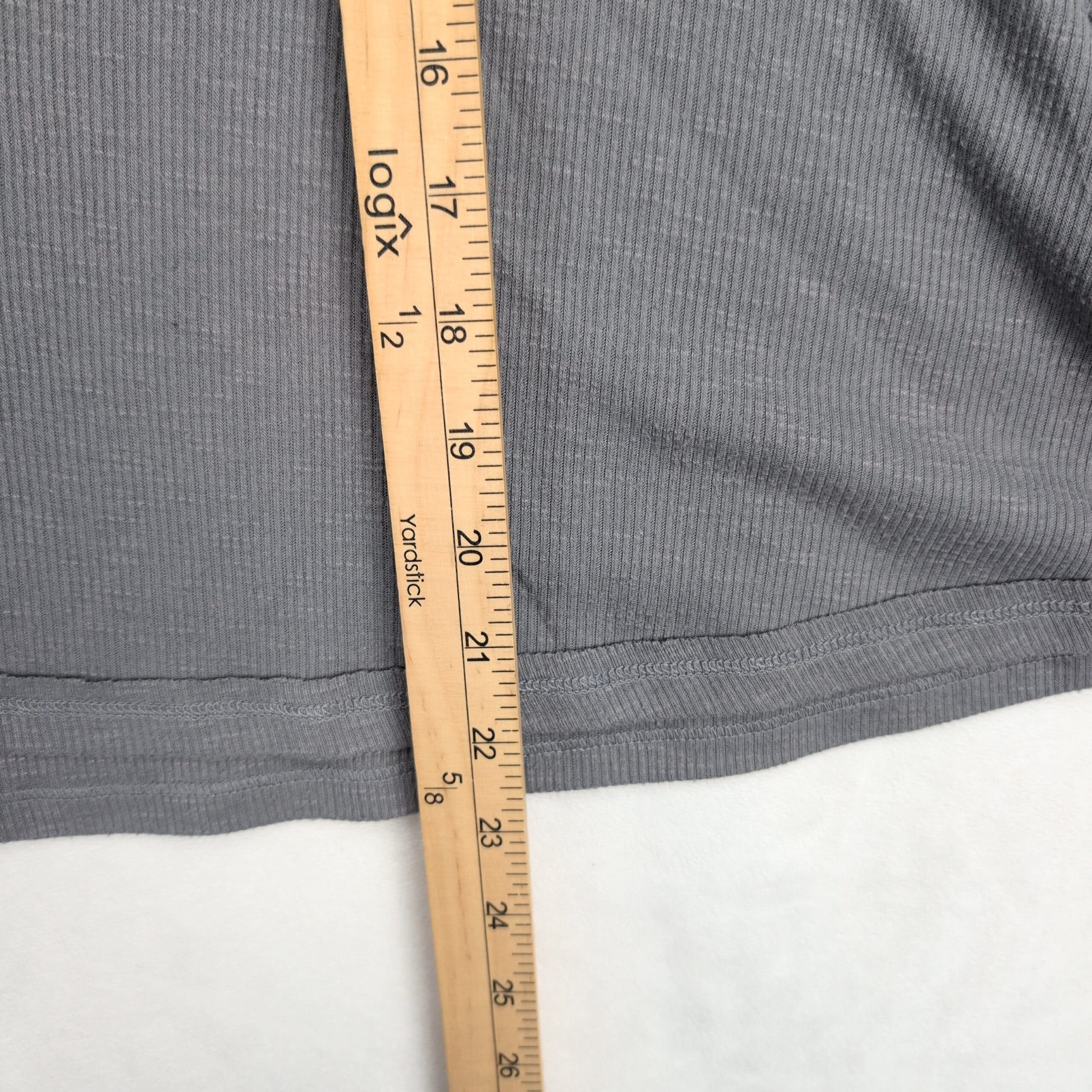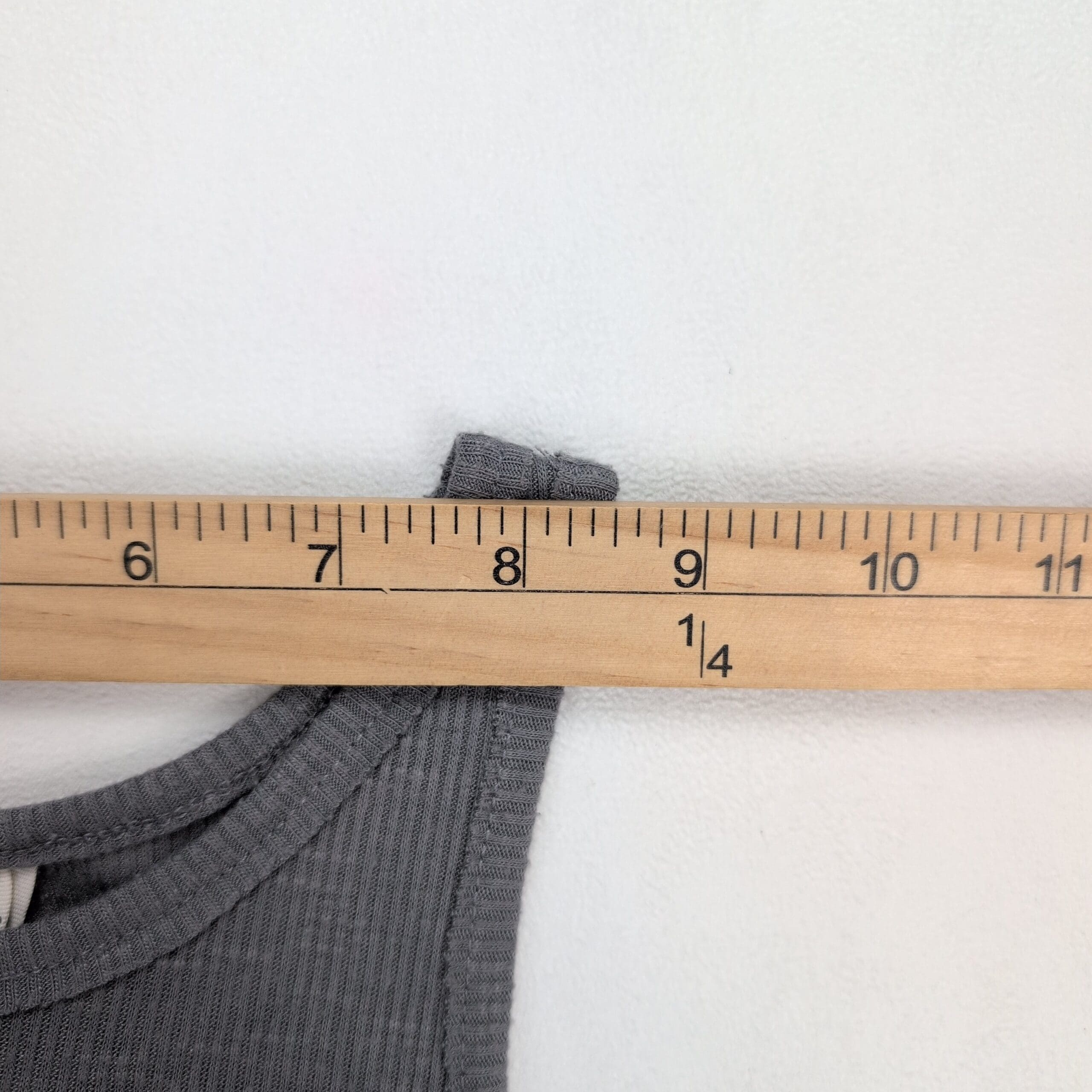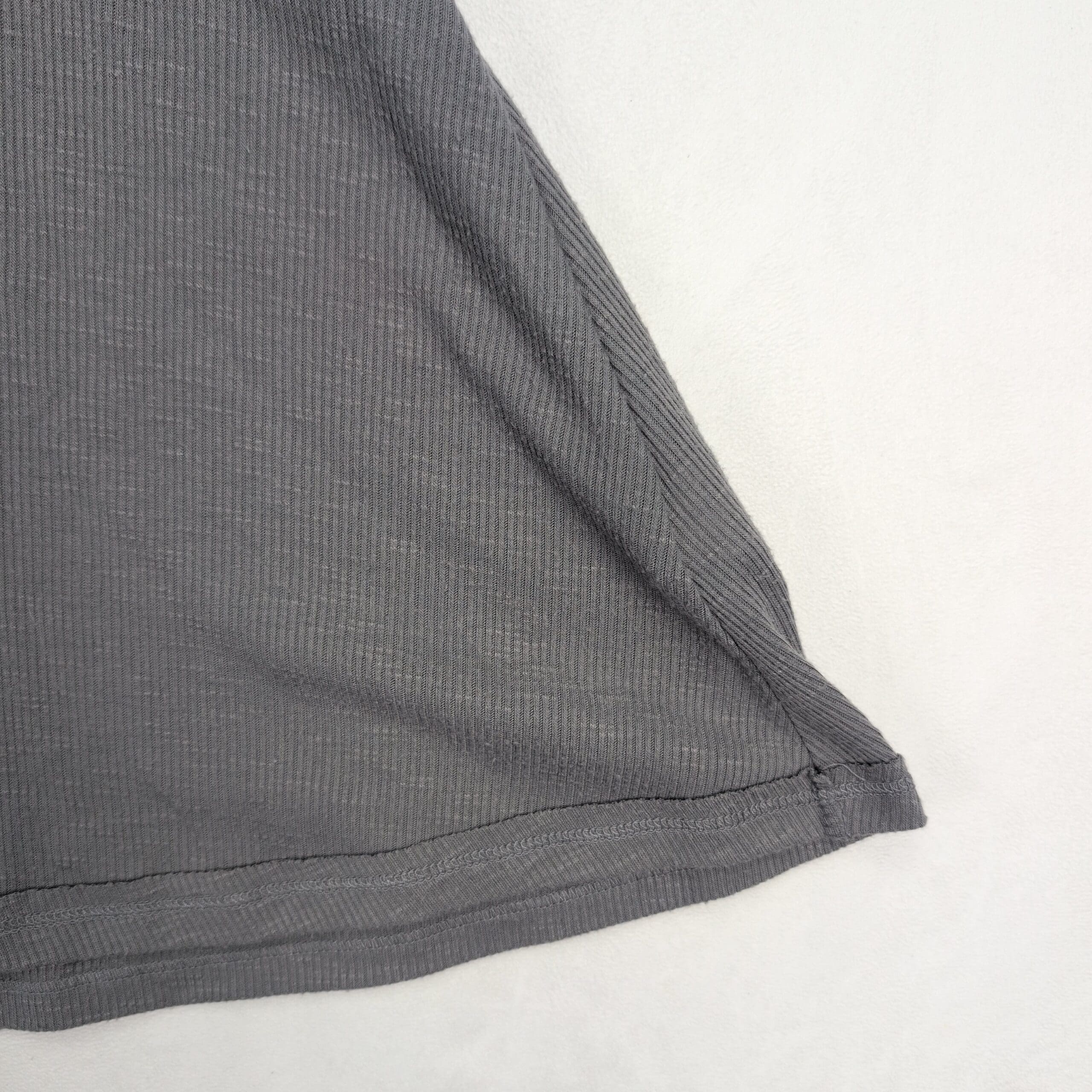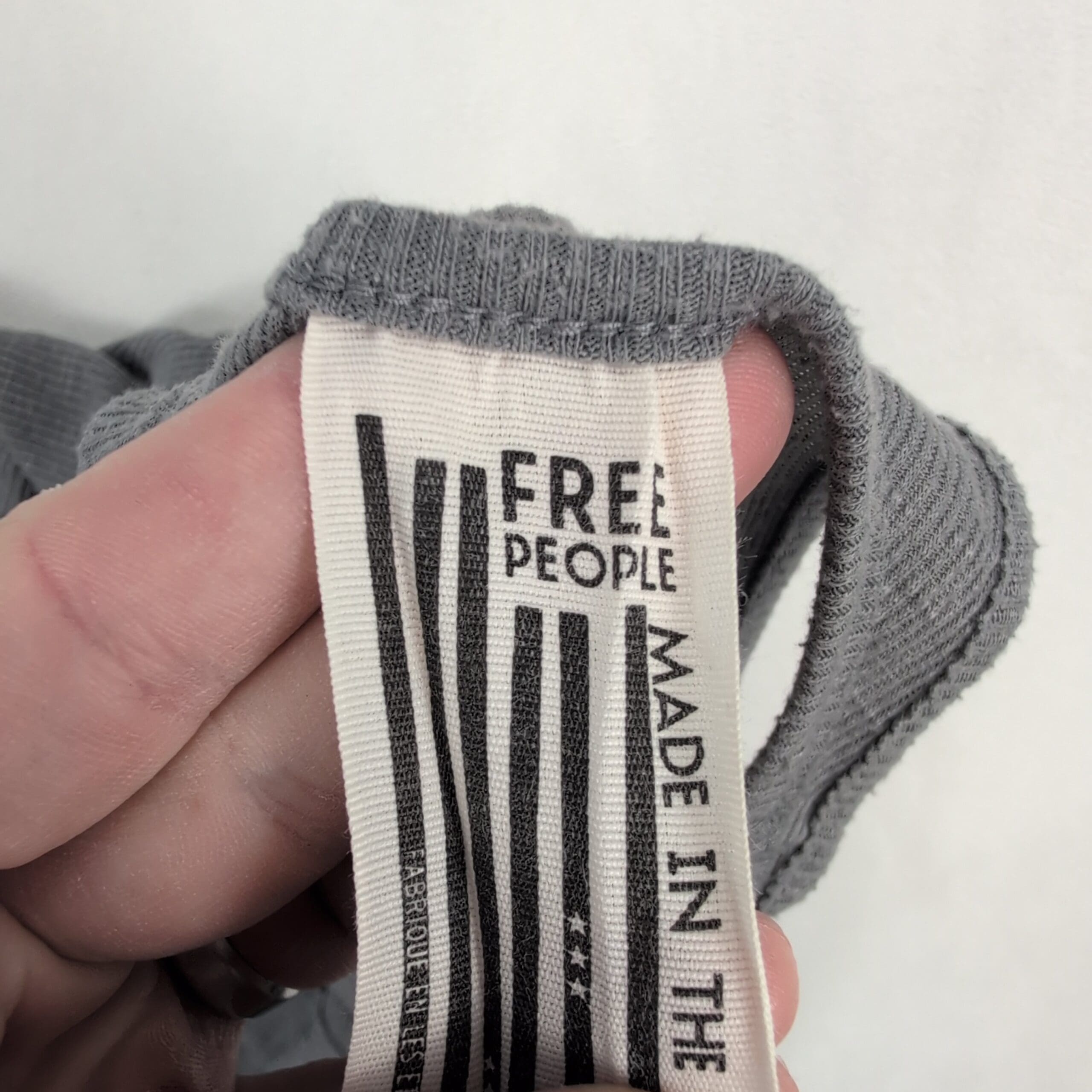 Free People ribbed tank top in soft gray, size S. High neckline with slim straps and an A-line, swing silhouette that drapes away from the body for a breezy, flattering fit. Lightweight stretch ribbed knit—perfect for layering or wearing solo for a casual, boho look. Excellent used condition: free of rips, stains, and major flaws; shows only light, typical wear consistent with gentle use.