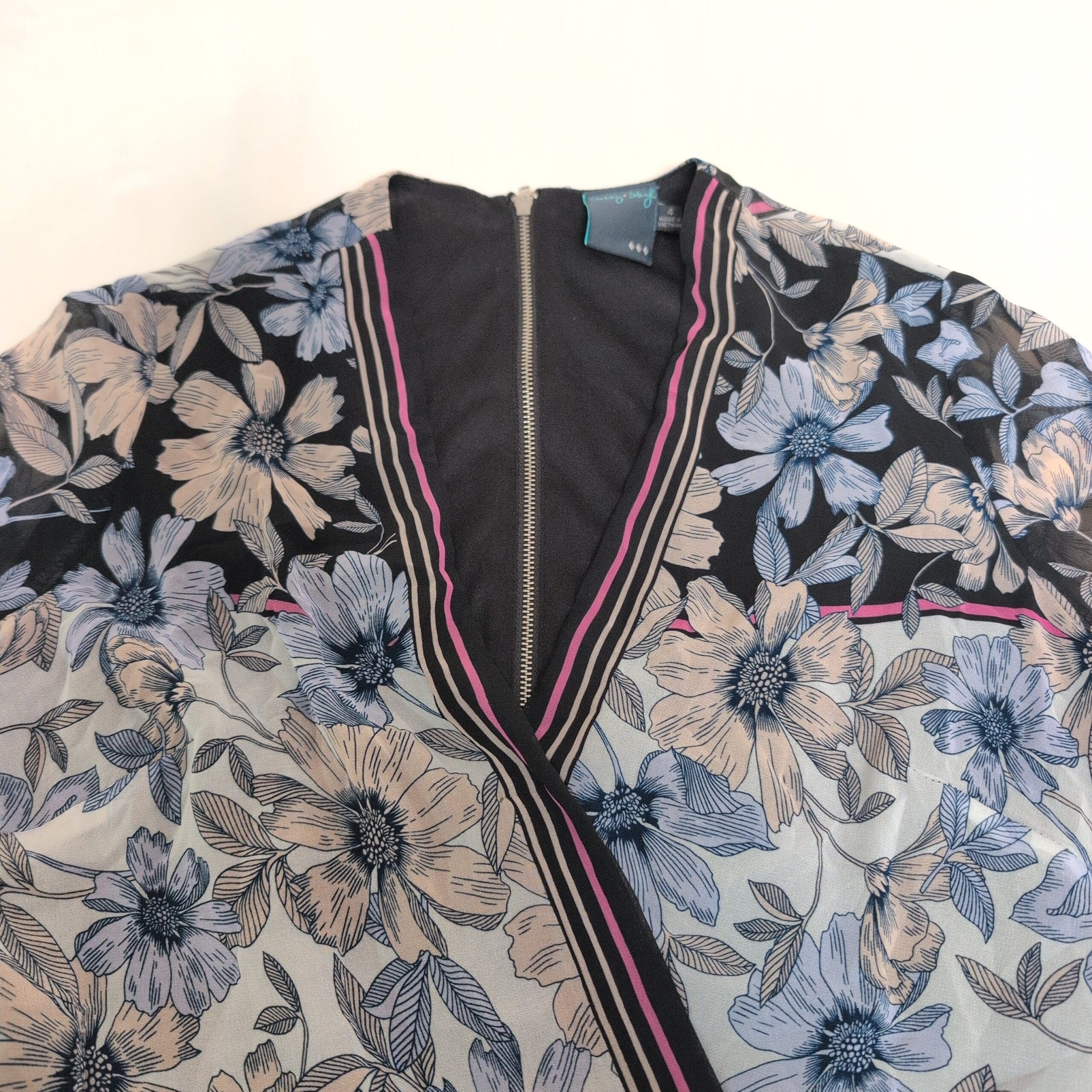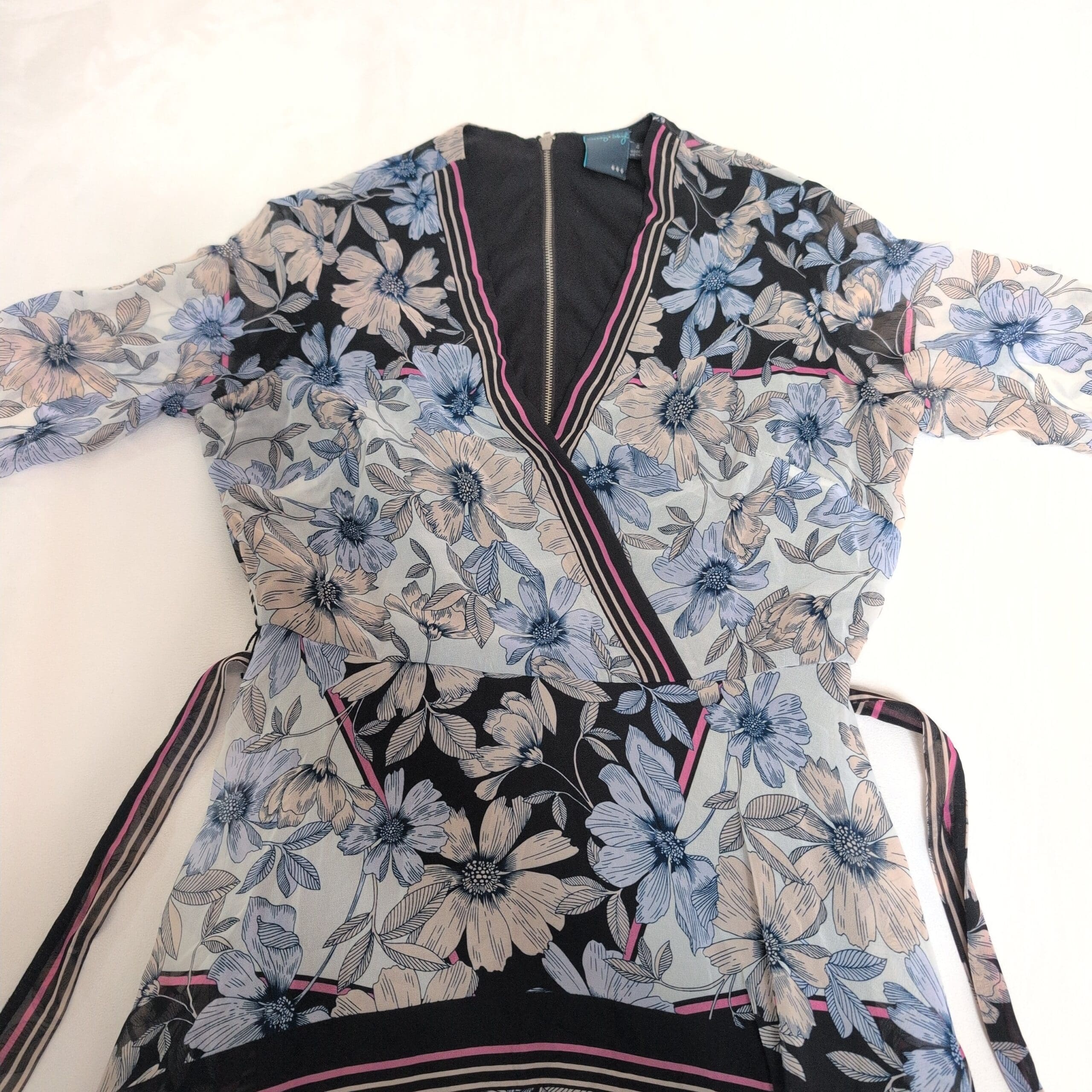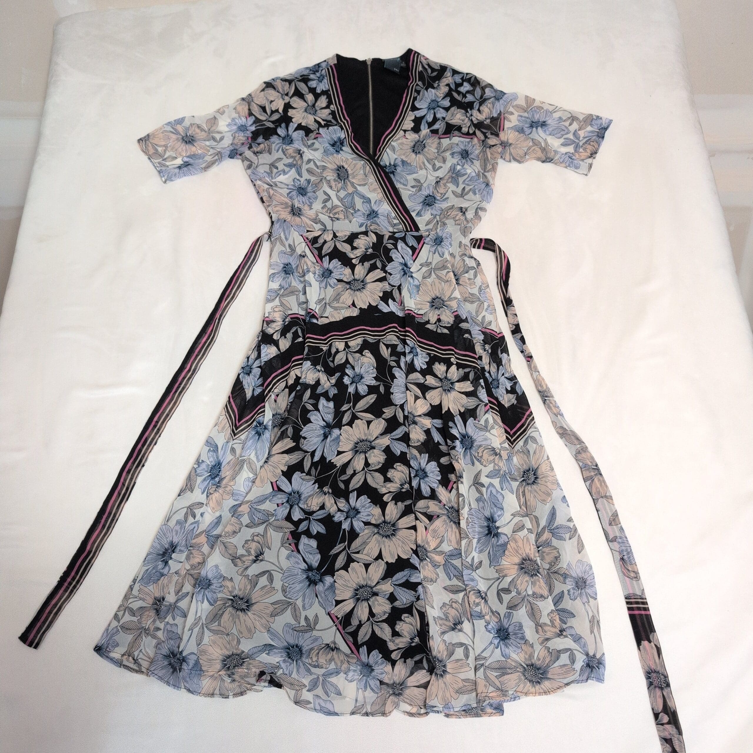 Beautiful Gabby Style women’s midi wrap dress in size 4. Features a V-neck wrap front with long self-tie waist ties that create a flattering, adjustable silhouette. Lightweight, flowing fabric with a blue and soft-pink floral print on contrasting panels and short sleeves — a versatile piece for day or evening. Gently used and free of major rips, tears, stains, or flaws; typical light wear may be present, please review photos for details.