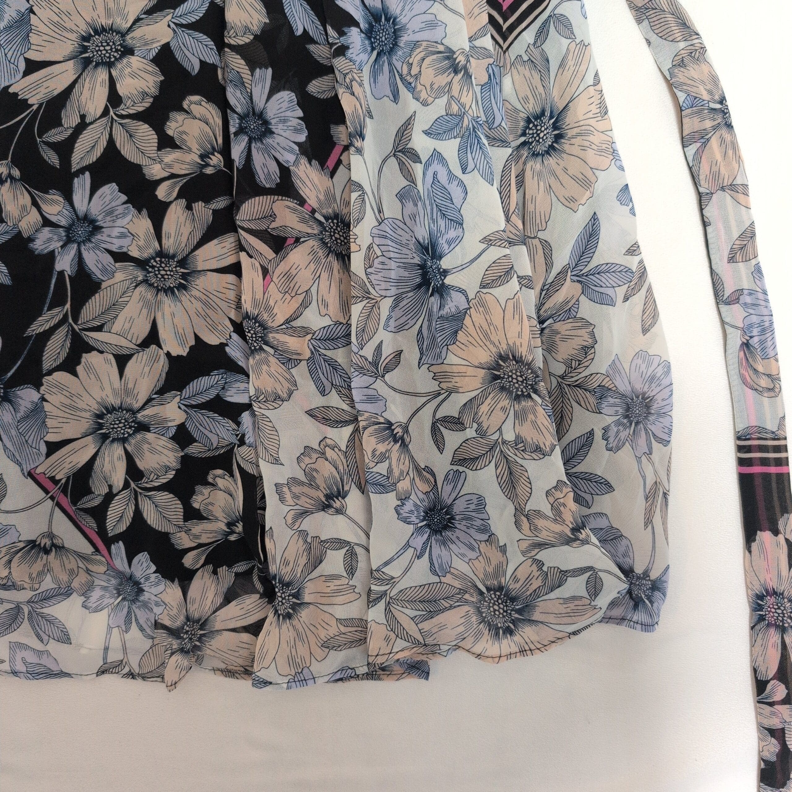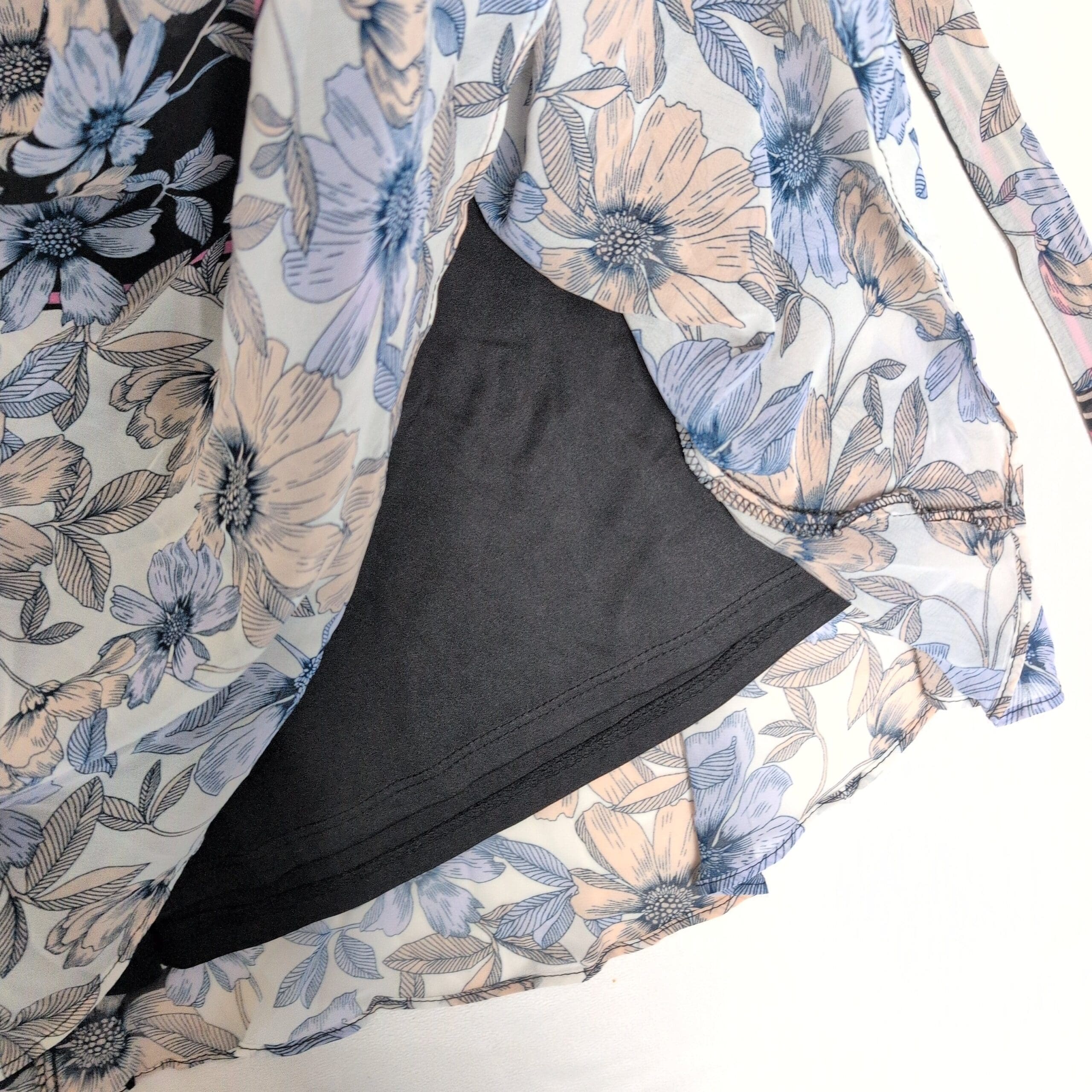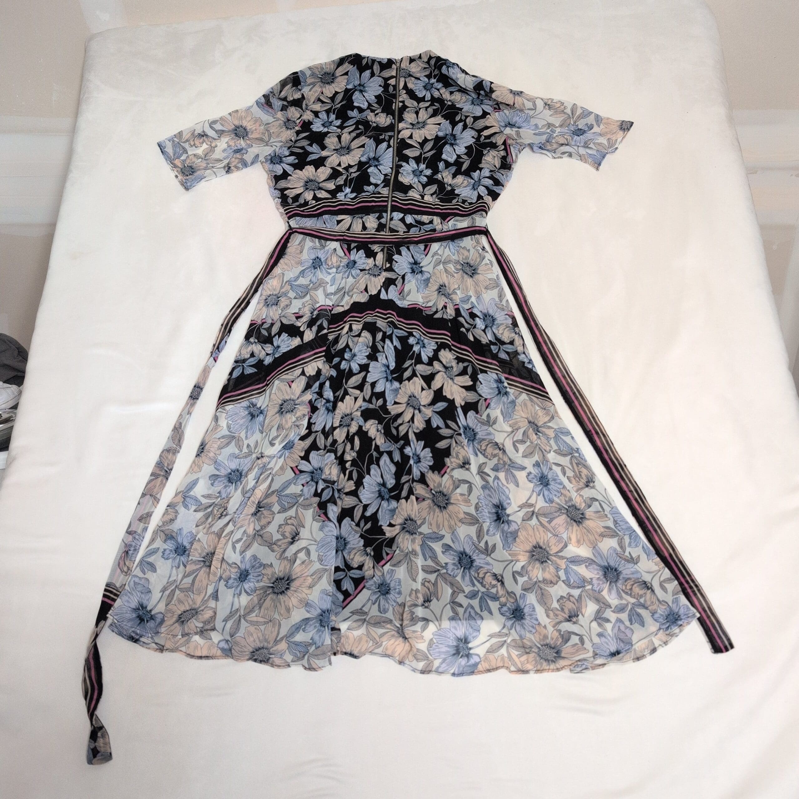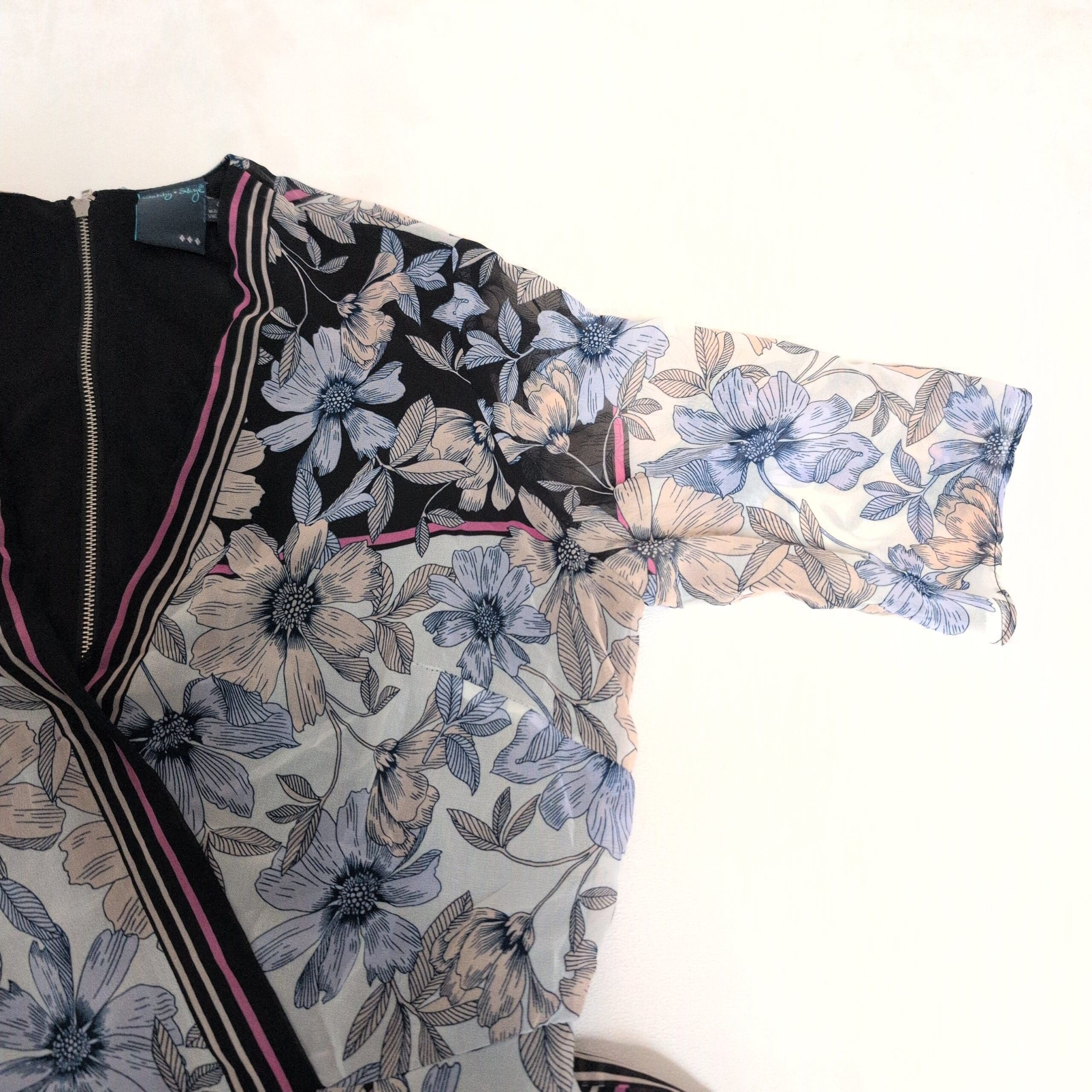 Beautiful Gabby Style women’s midi wrap dress in size 4. Features a V-neck wrap front with long self-tie waist ties that create a flattering, adjustable silhouette. Lightweight, flowing fabric with a blue and soft-pink floral print on contrasting panels and short sleeves — a versatile piece for day or evening. Gently used and free of major rips, tears, stains, or flaws; typical light wear may be present, please review photos for details.