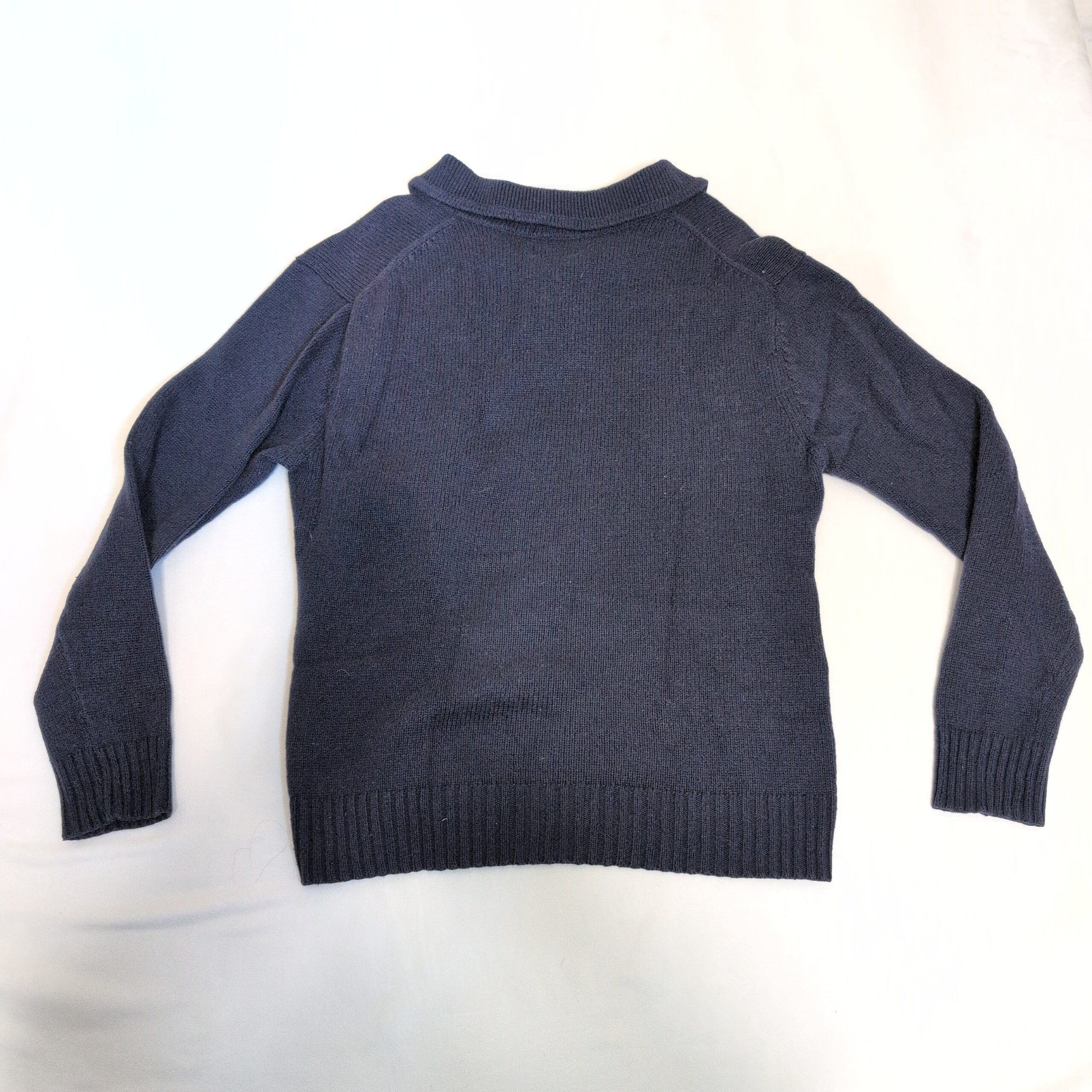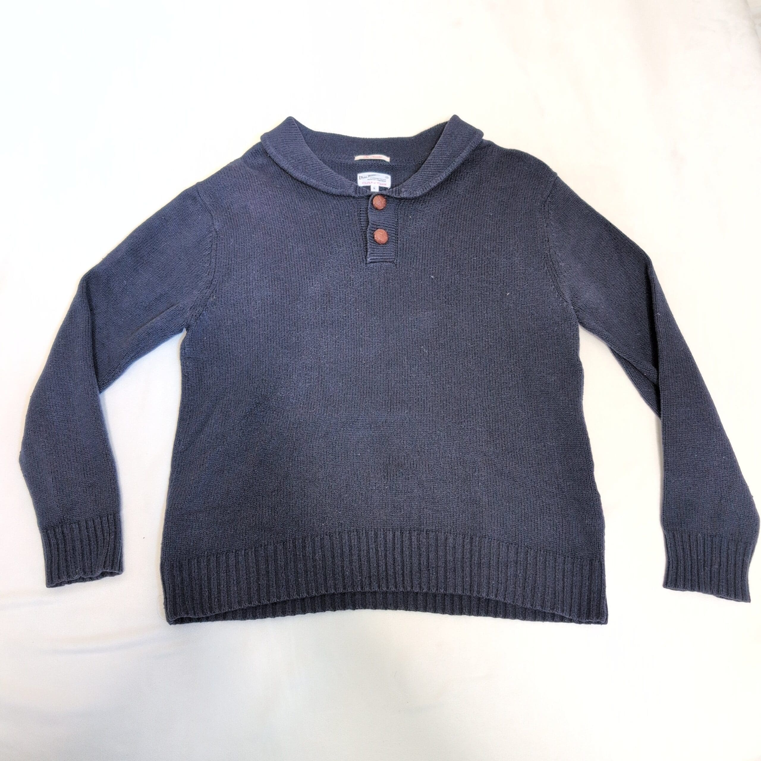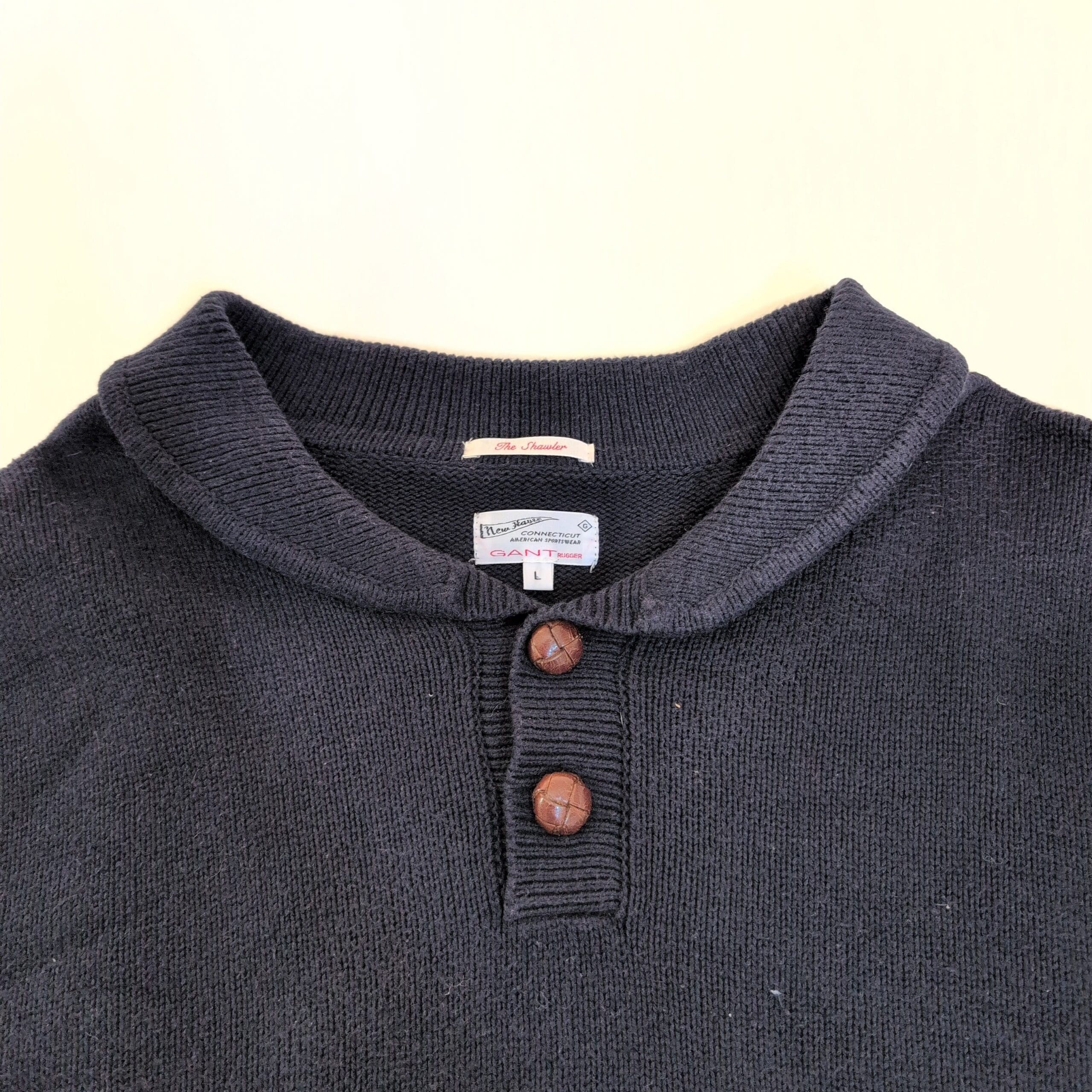 Classic Gant Rugger women’s sweater in deep navy, size L. Features a scooped shawl-style collar with two wooden buttons, long sleeves, ribbed cuffs and hem, and a relaxed crew/scoop silhouette — perfect for layering in cooler weather. Fabric content not provided on the tag. Gently used with light signs of wear consistent with normal use; please review photos for condition details.