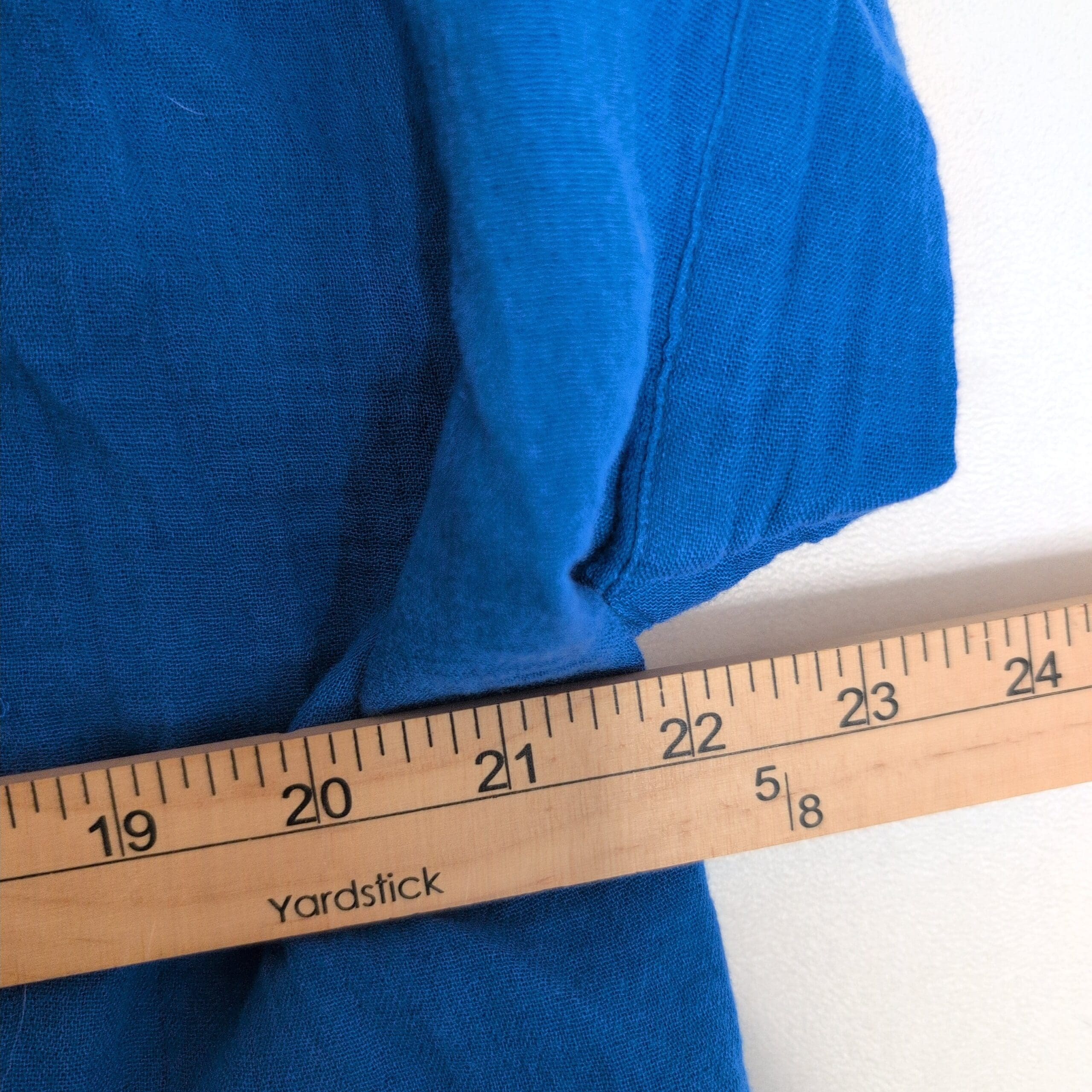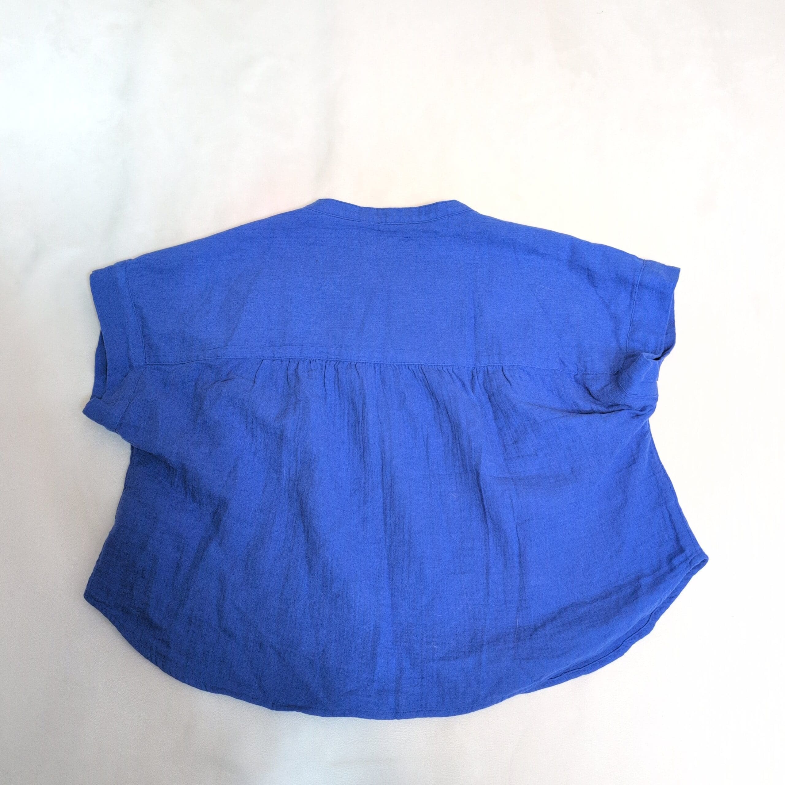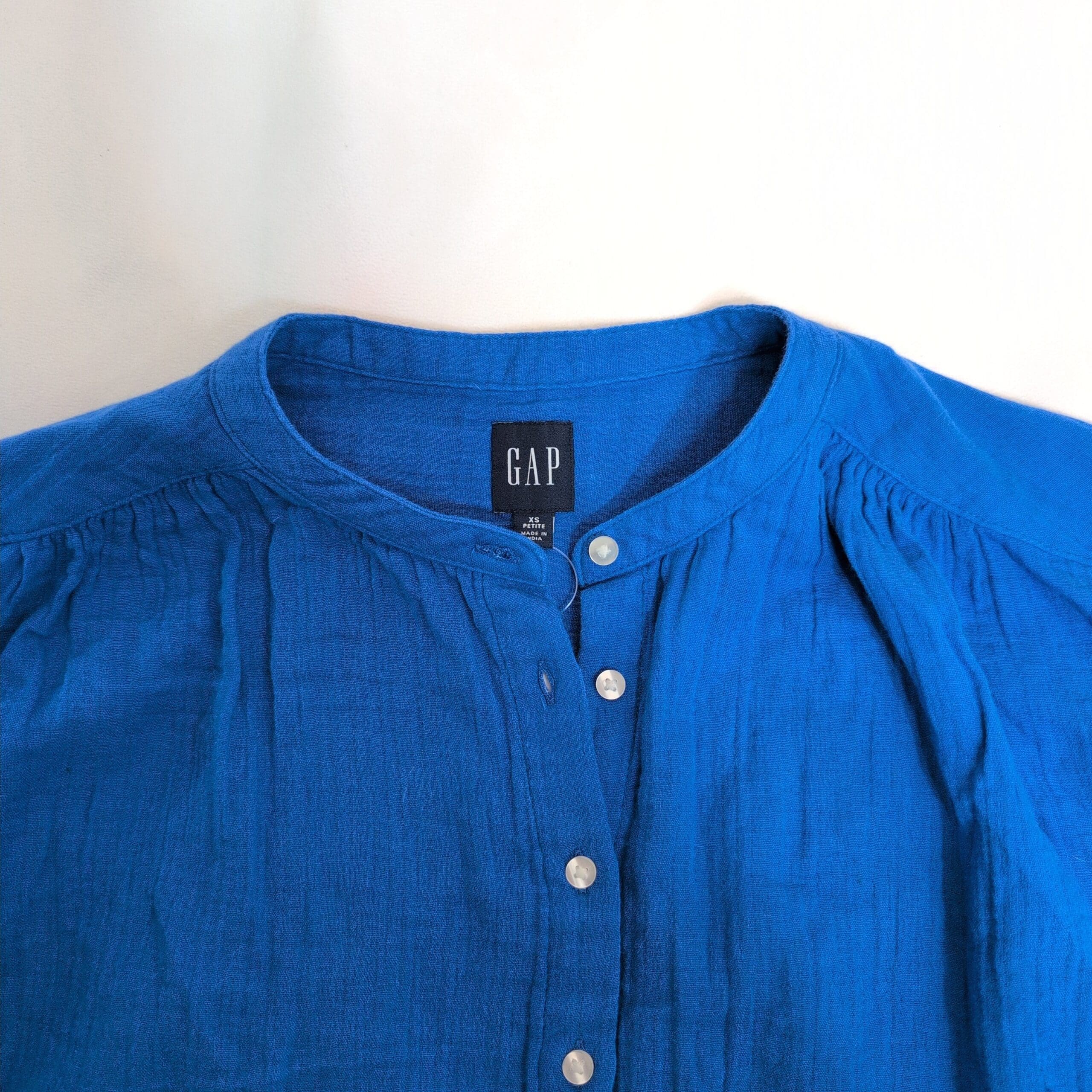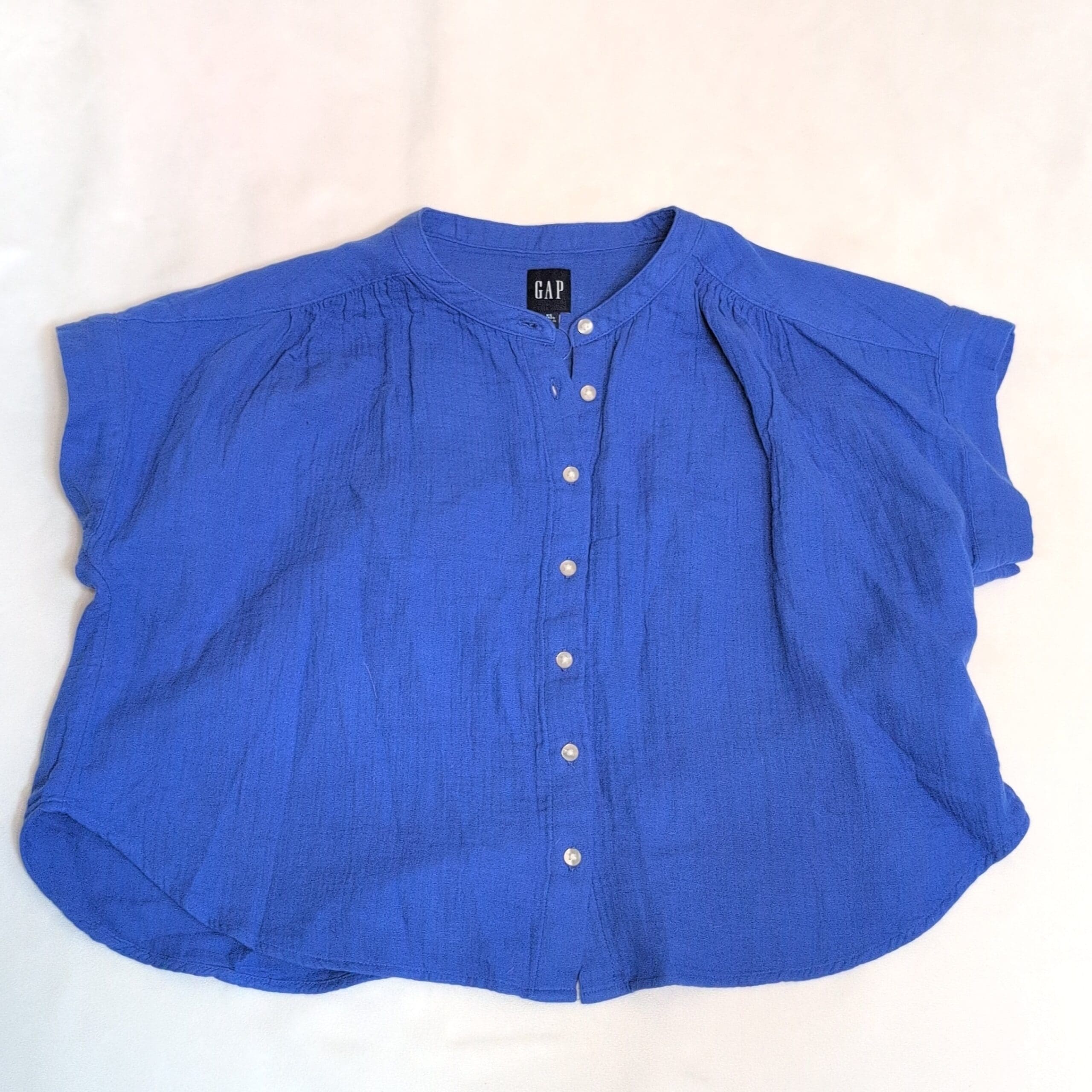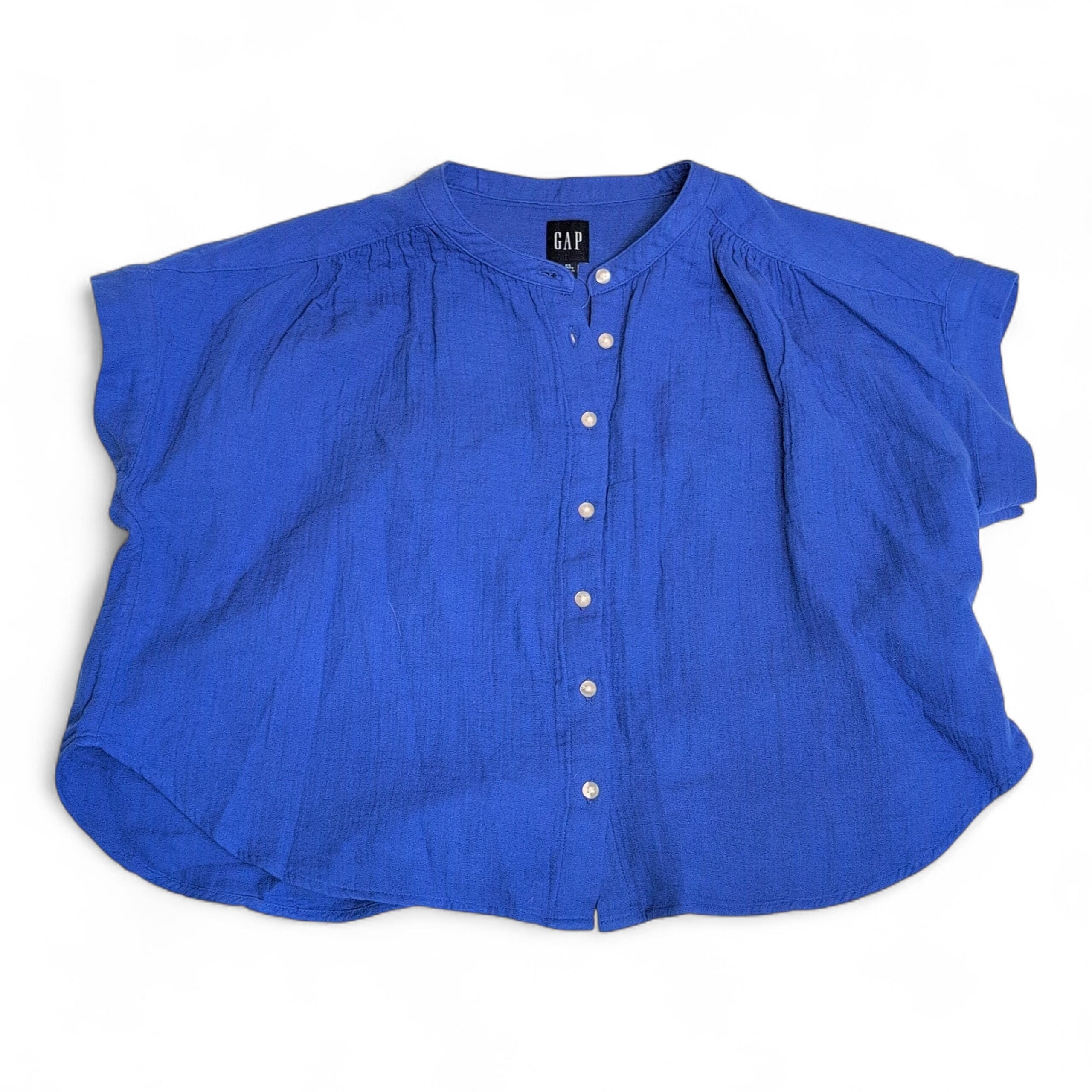 Gap blue button-front blouse in size XS. Features a band collar, short dolman sleeves, gathered yoke at the shoulders, pearl-style buttons down the front, and a relaxed curved hem for an easy, casual fit. Gently used and free of major rips, tears, stains, or flaws; typical light wear may be present. MSRP originally listed at $50 (new with tags).