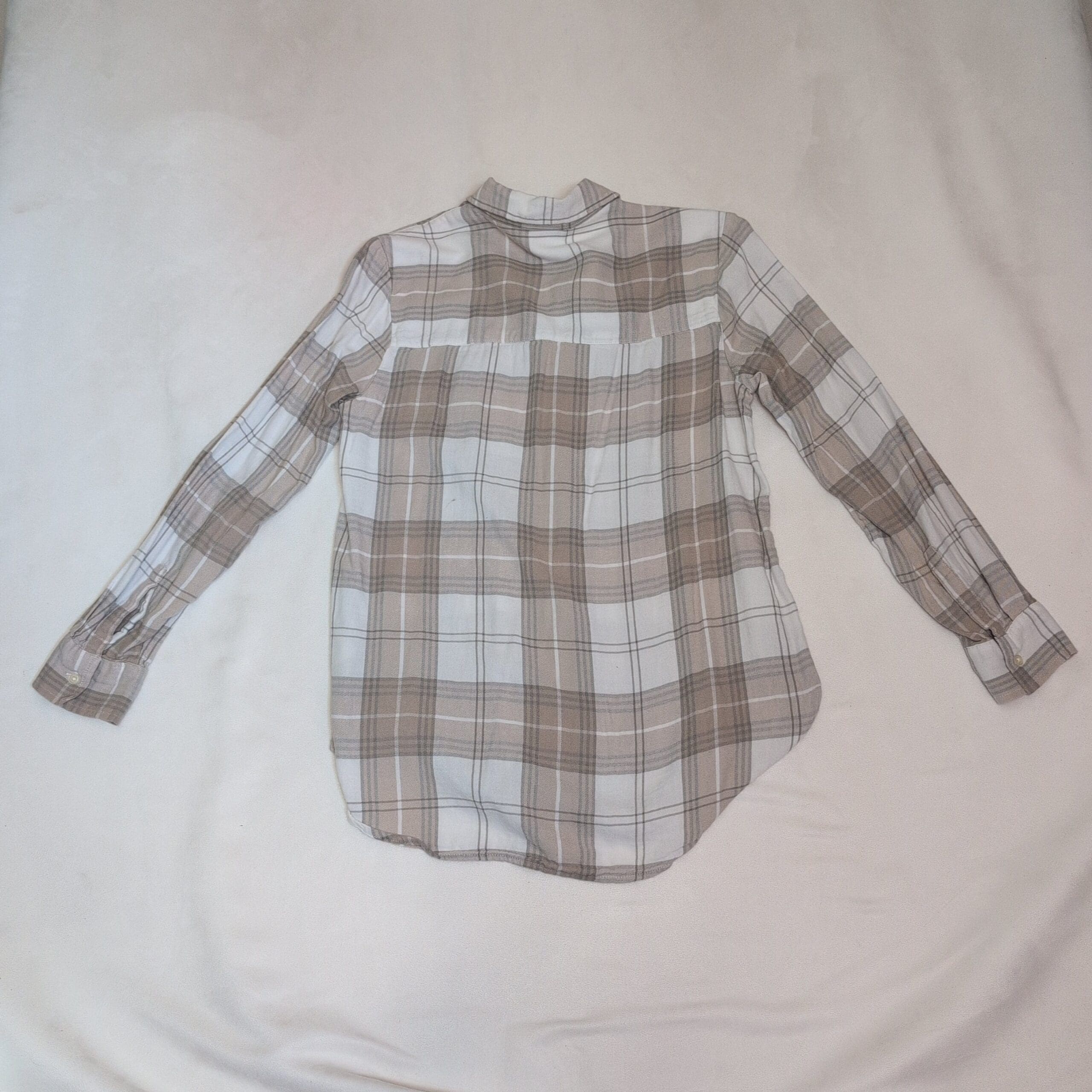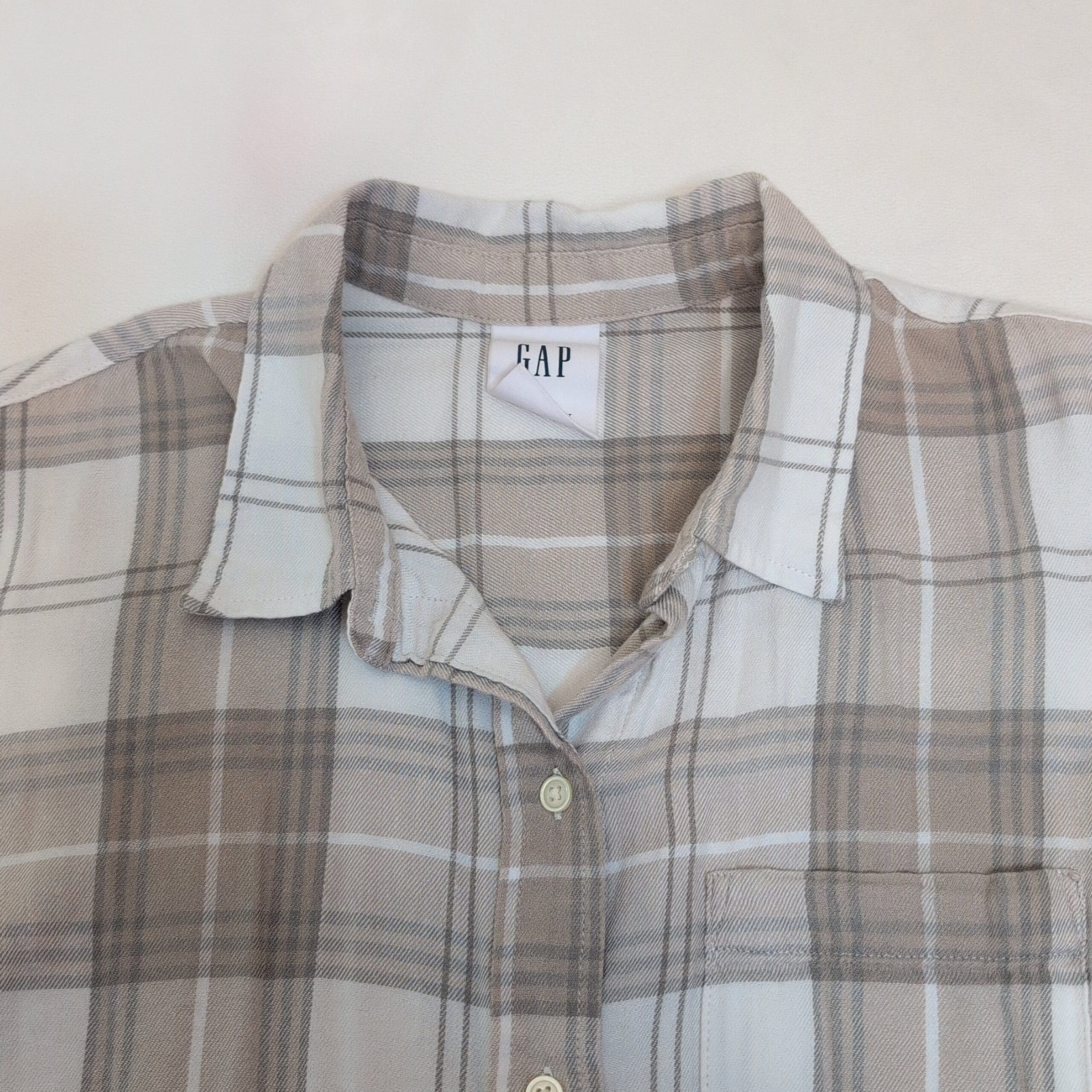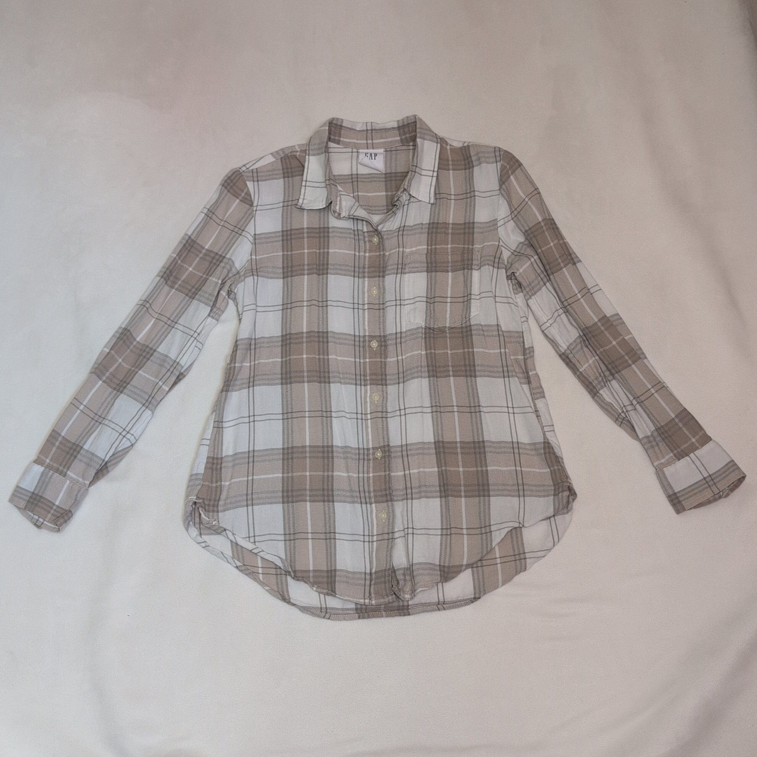 Classic Gap men’s long-sleeve button-down in a neutral tan and white plaid. Size S (standard). Features a single chest pocket, button cuffs, and a slightly curved hem for a relaxed, casual fit. Lightweight and soft — great for layering or everyday wear.