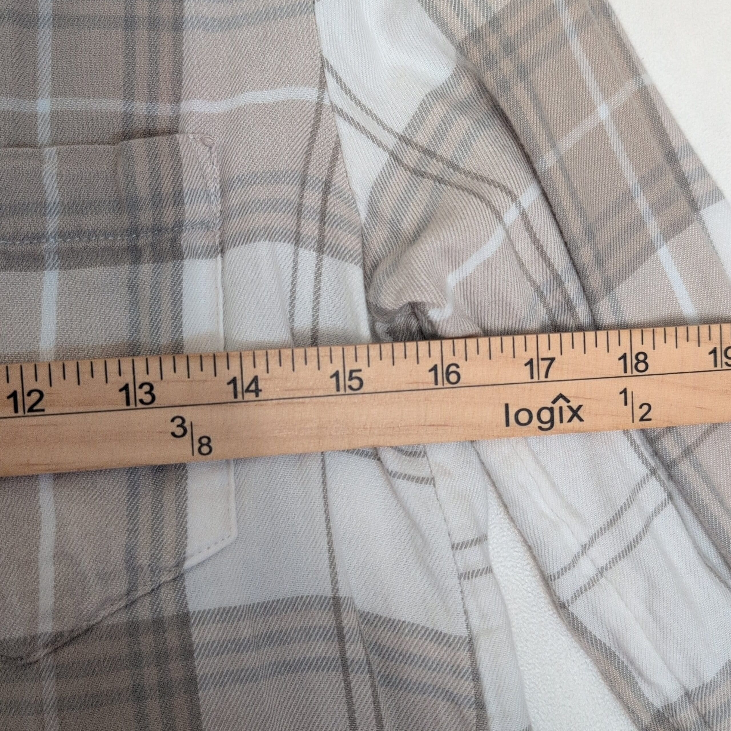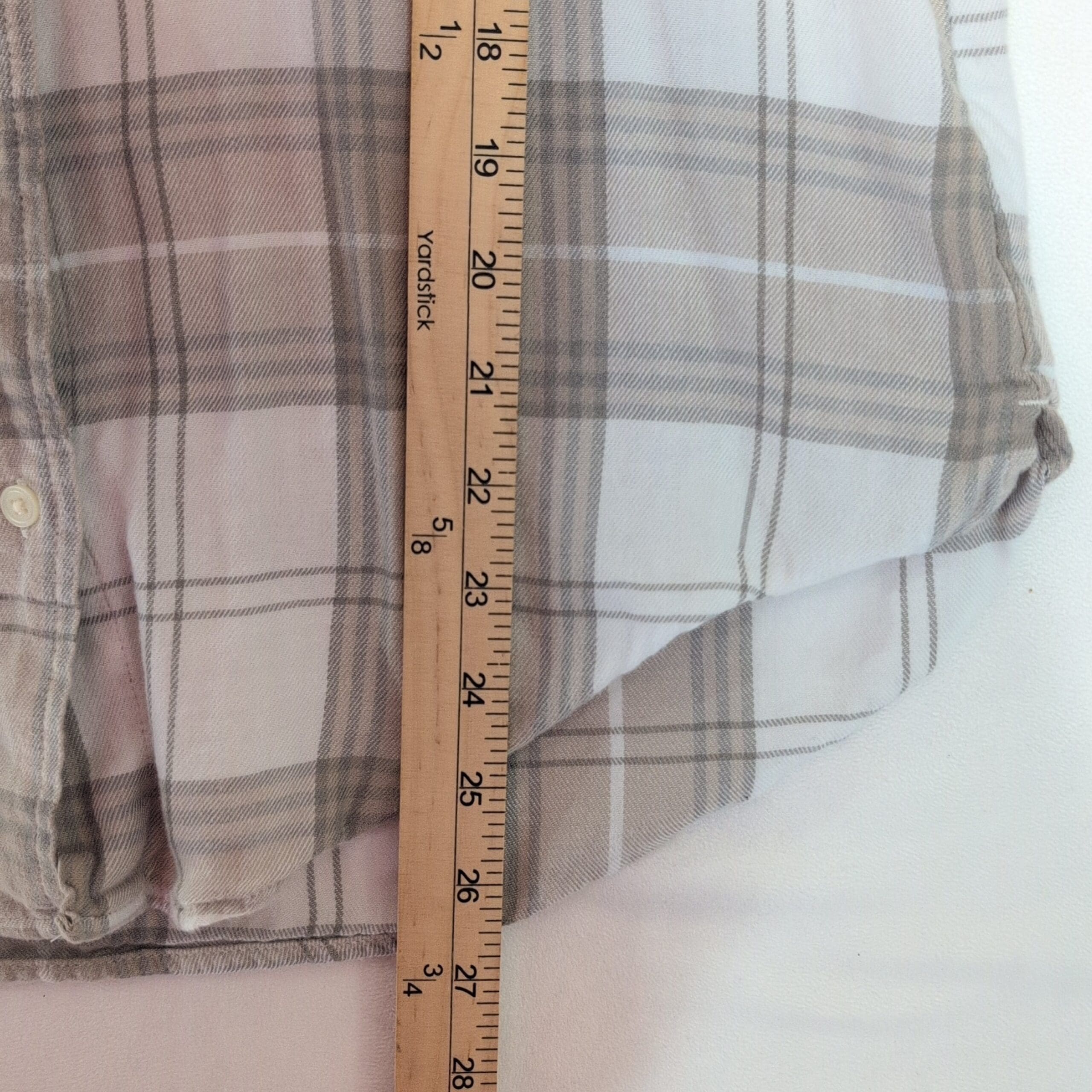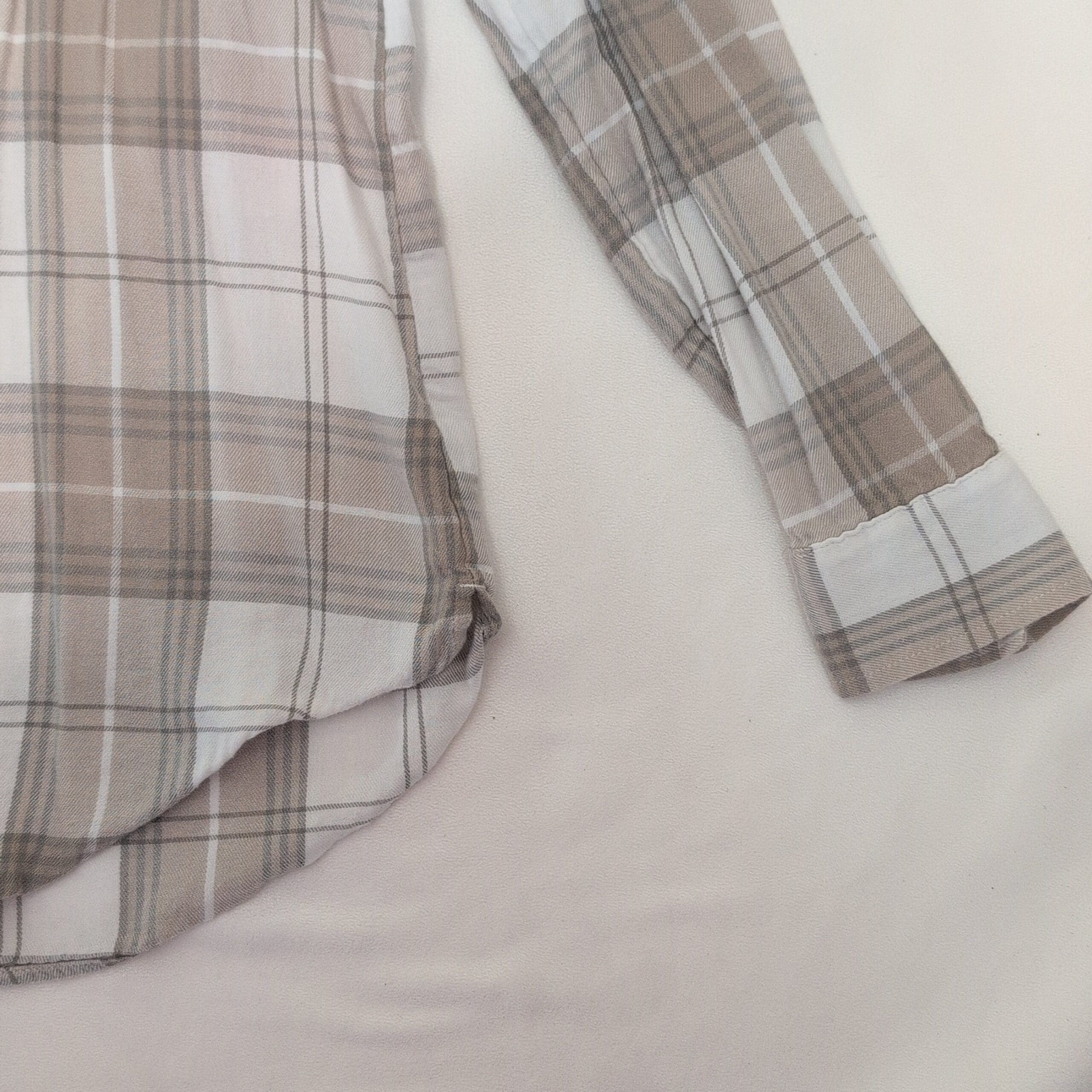 Classic Gap men’s long-sleeve button-down in a neutral tan and white plaid. Size S (standard). Features a single chest pocket, button cuffs, and a slightly curved hem for a relaxed, casual fit. Lightweight and soft — great for layering or everyday wear.
